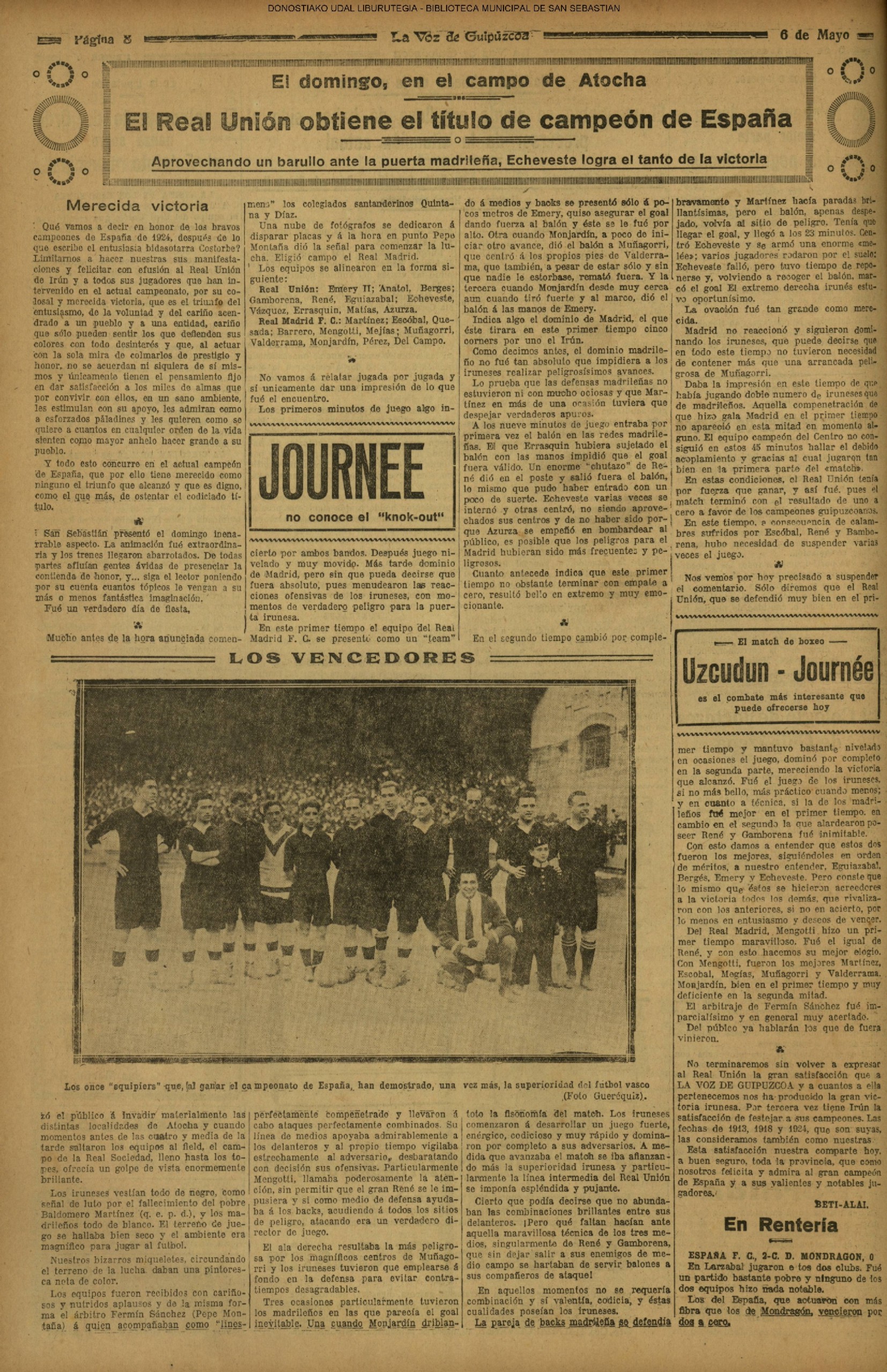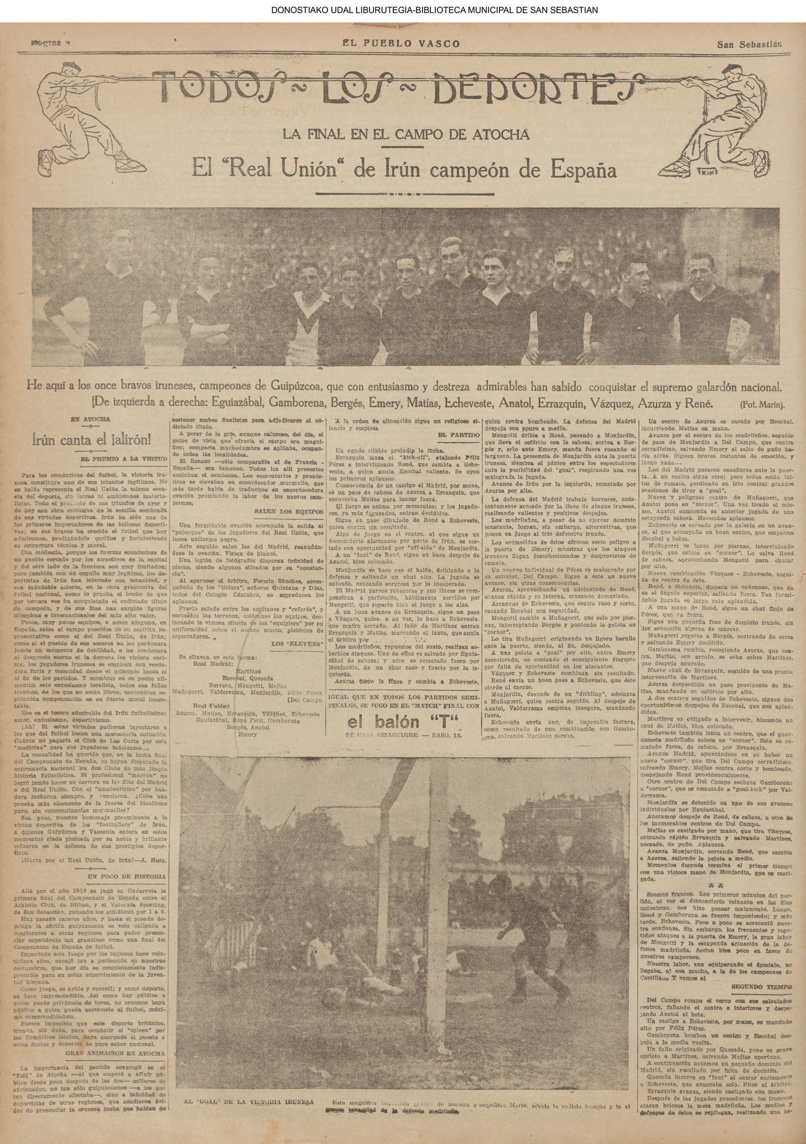 # Final de la Copa de España de fútbol entre el Real Unión, de Irún, (1) el Real Madrid (0) en Atocha. El gol de la victoria lo marcó Echeveste.(La Voz de Guipúzcoa)(El Pueblo Vasco /EPV/EPV)