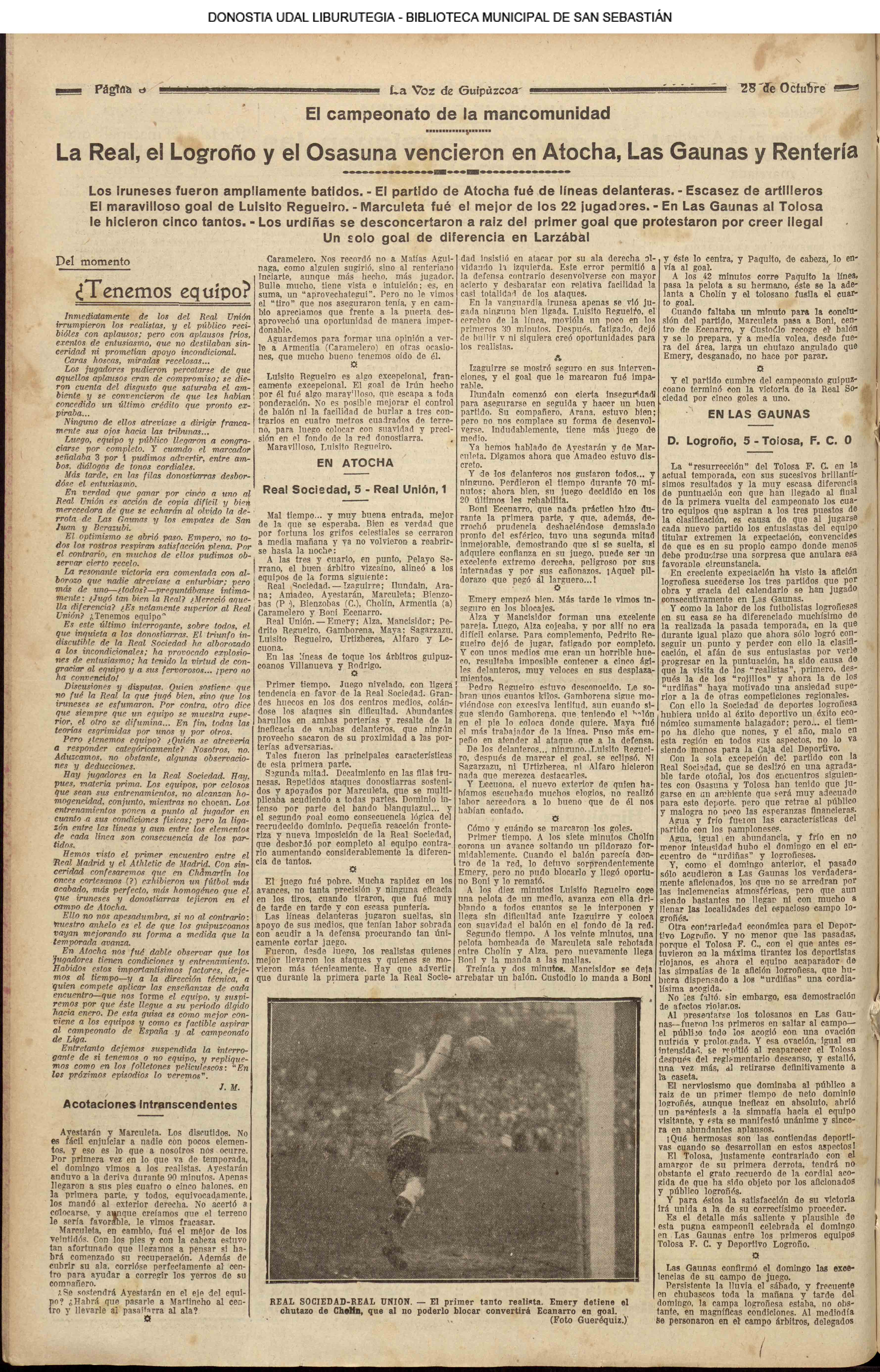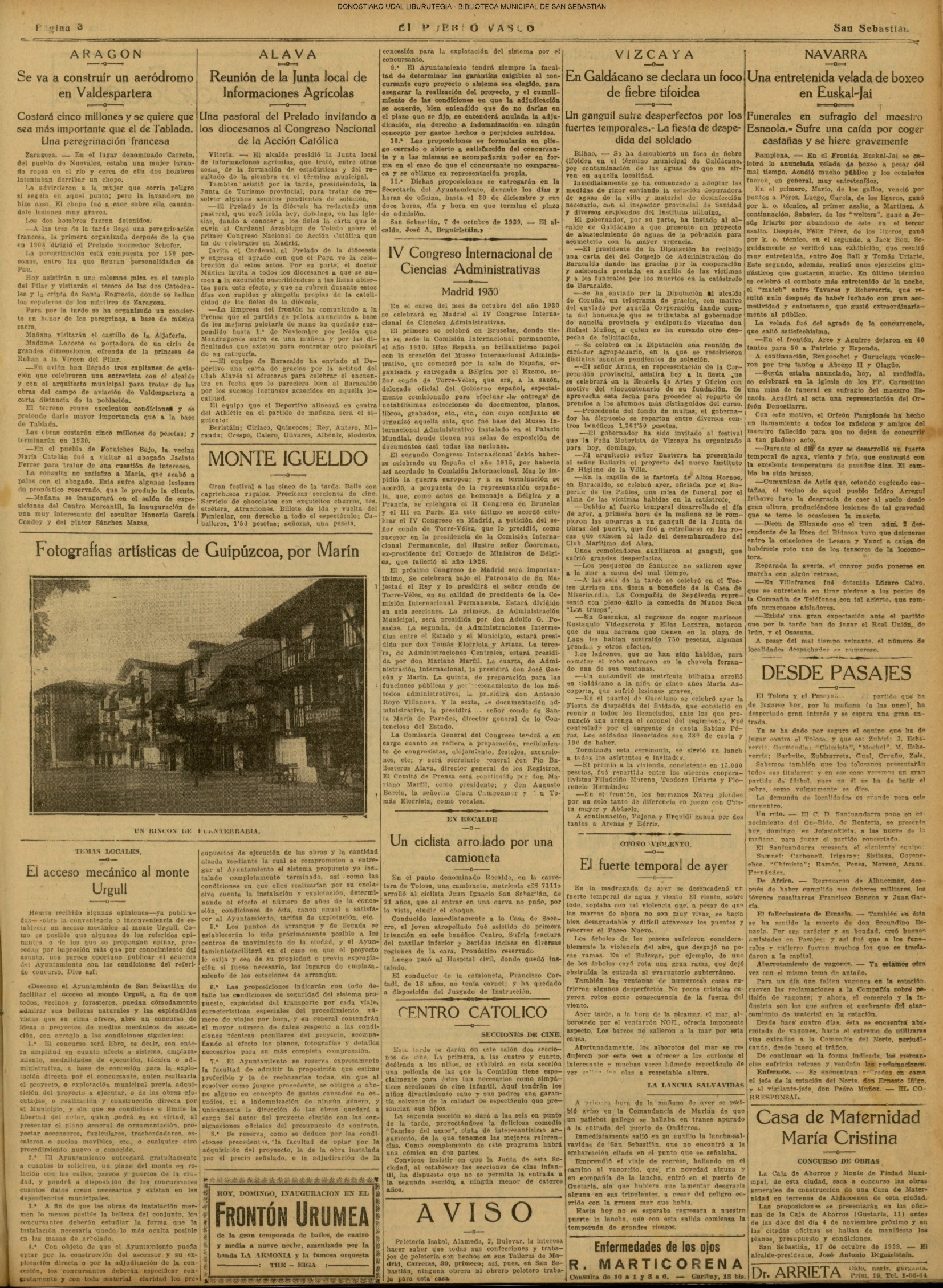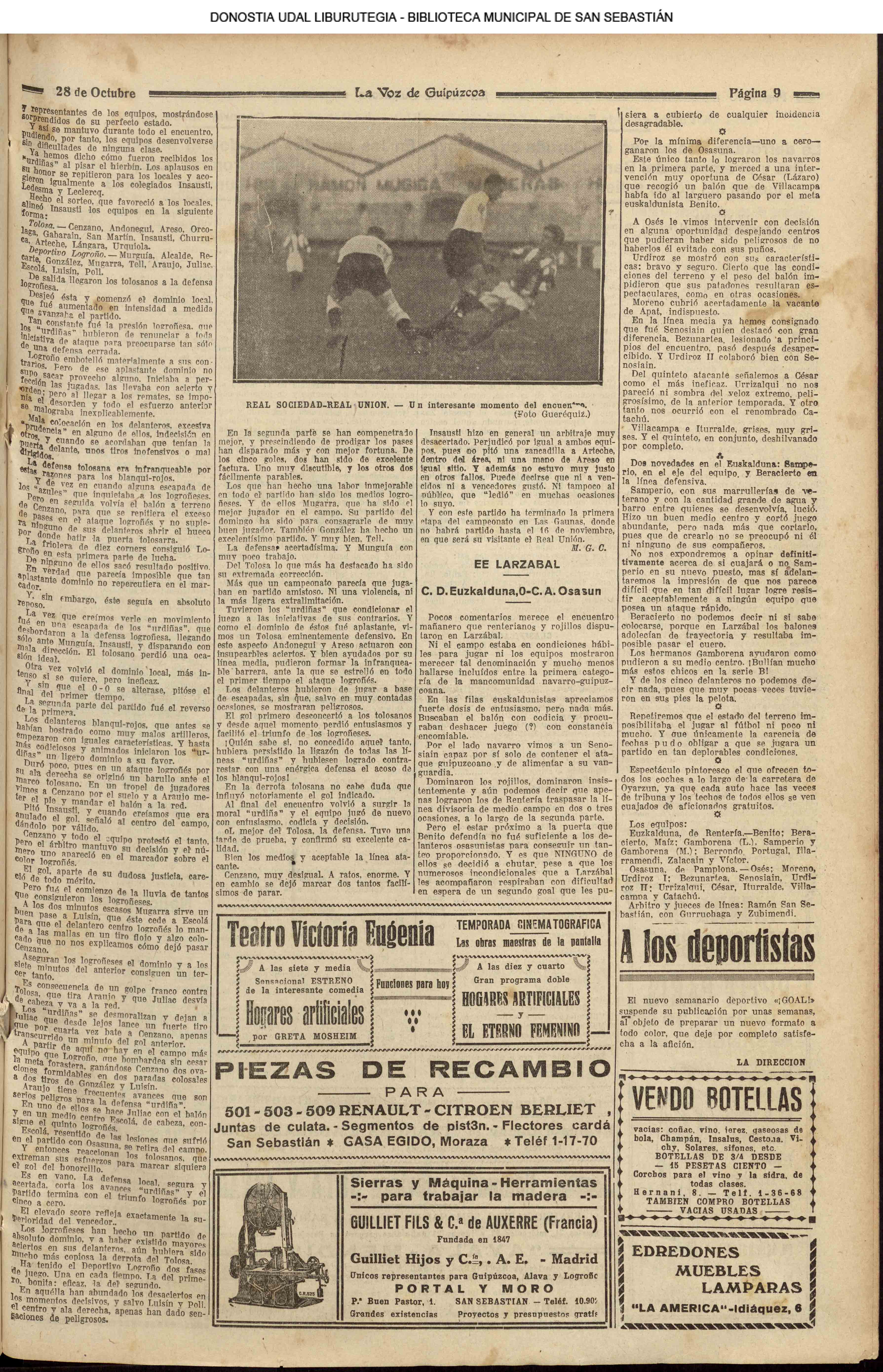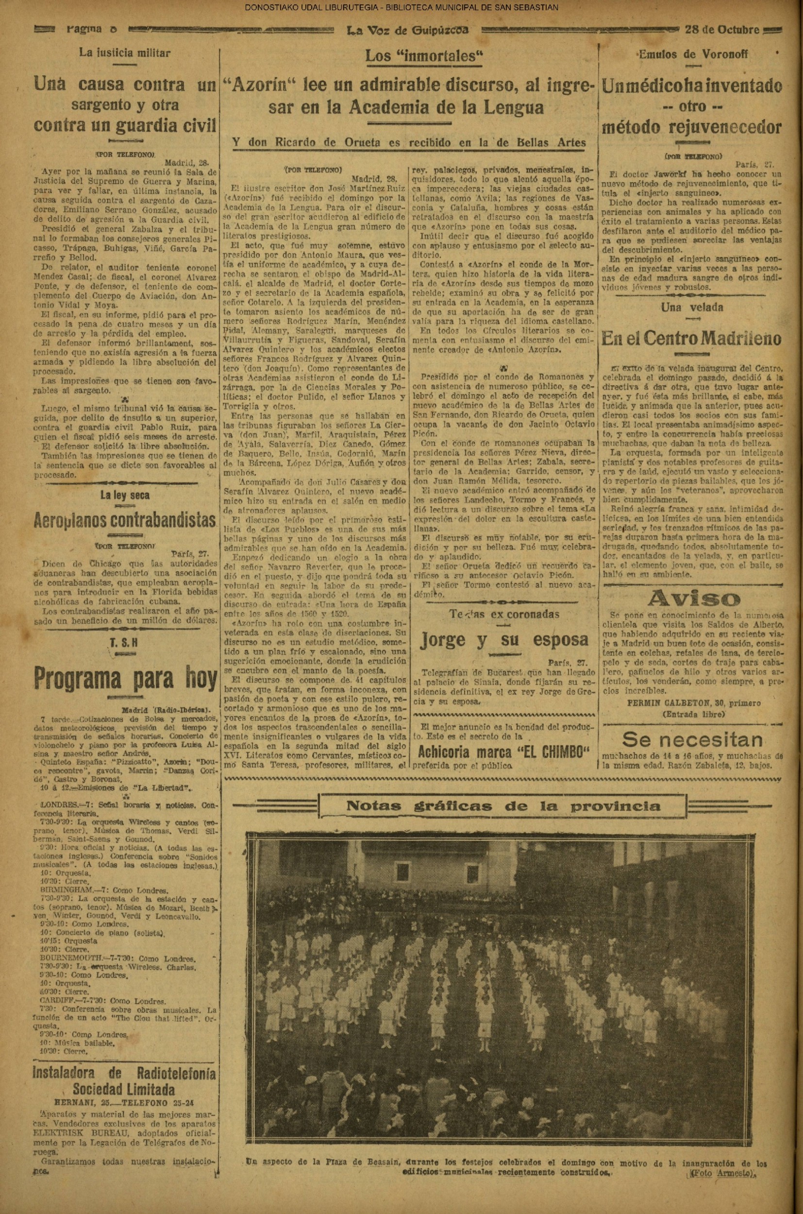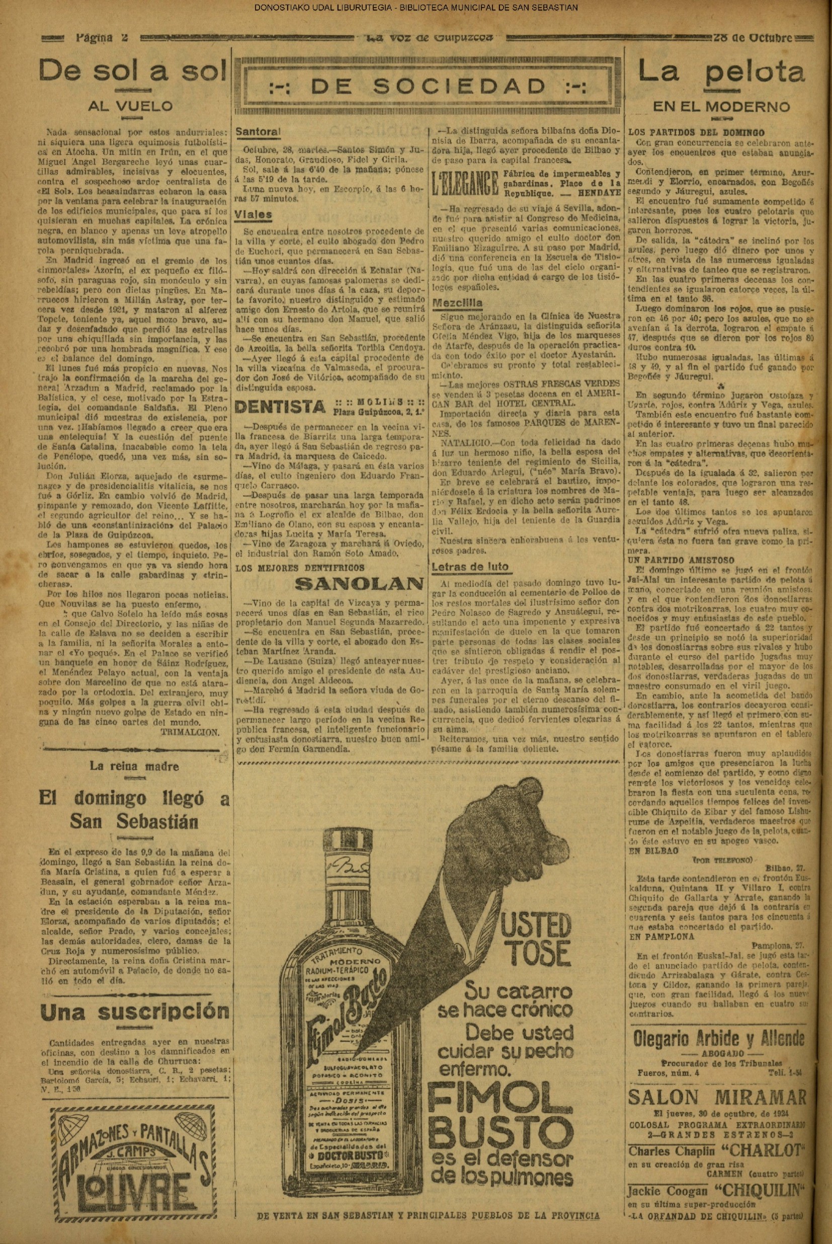 1924 - DE SOL A SOL (DOMINGO)(Nada sensacional por estos andurriales: ni siquiera una ligera equimosis futbolística en Atocha. Un mitin en Irún, en el que Miguel Angel Bergareche leyó unas cuartillas admirables, incisivas y elocuentes, contra el sospechoso ardor centralista de "El Sol". Los beasaindarras echaron la casa por la ventana para celebrar la inauguración de los edificios municipales, que para sí los quisieran en muchas capitales. La crónica negra, en blanco y apenas un leve atropello automovilista, sin más víctima que una farola perniquebrada.....) # Llega a San Sebastián la Reina madre