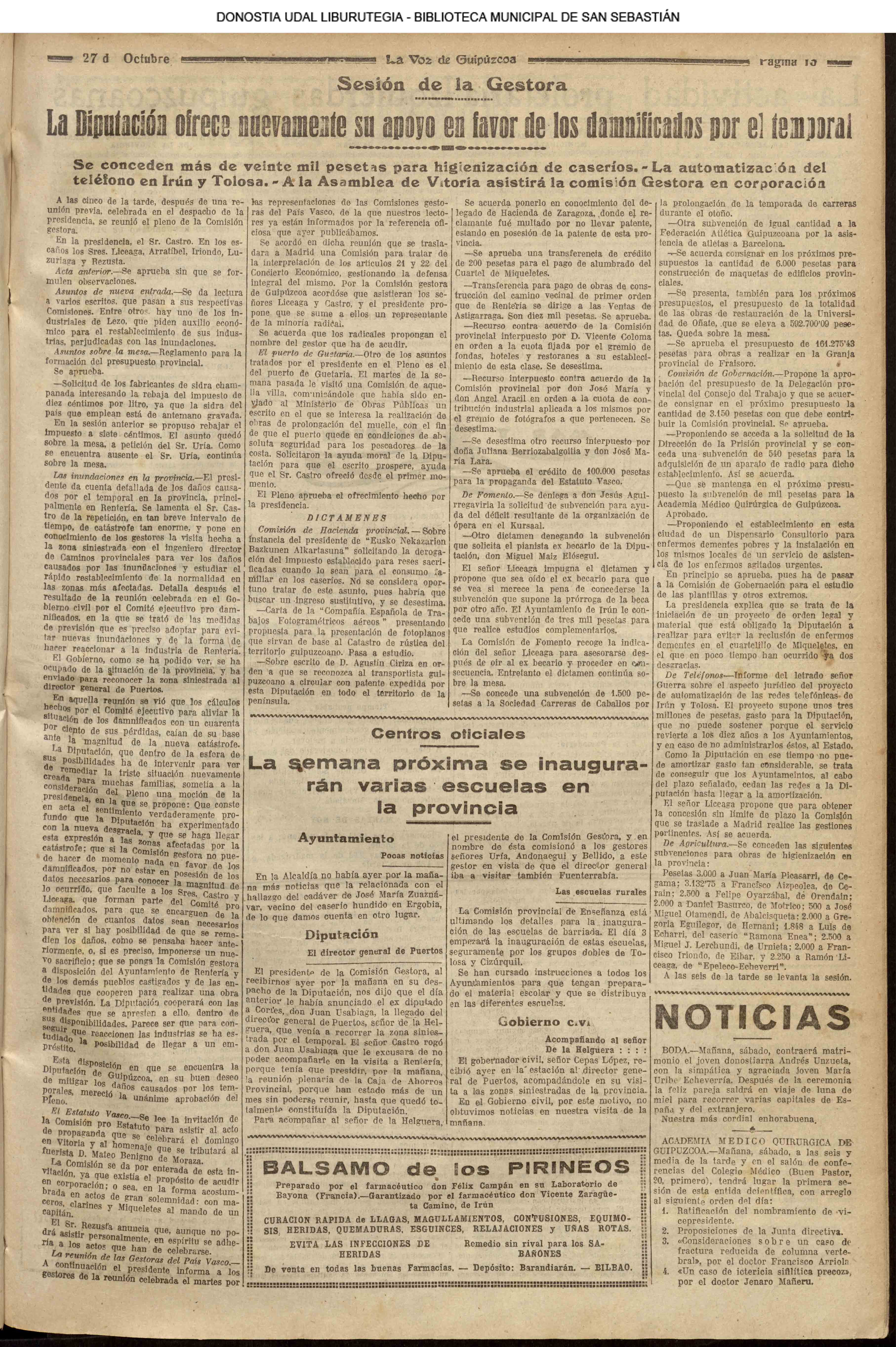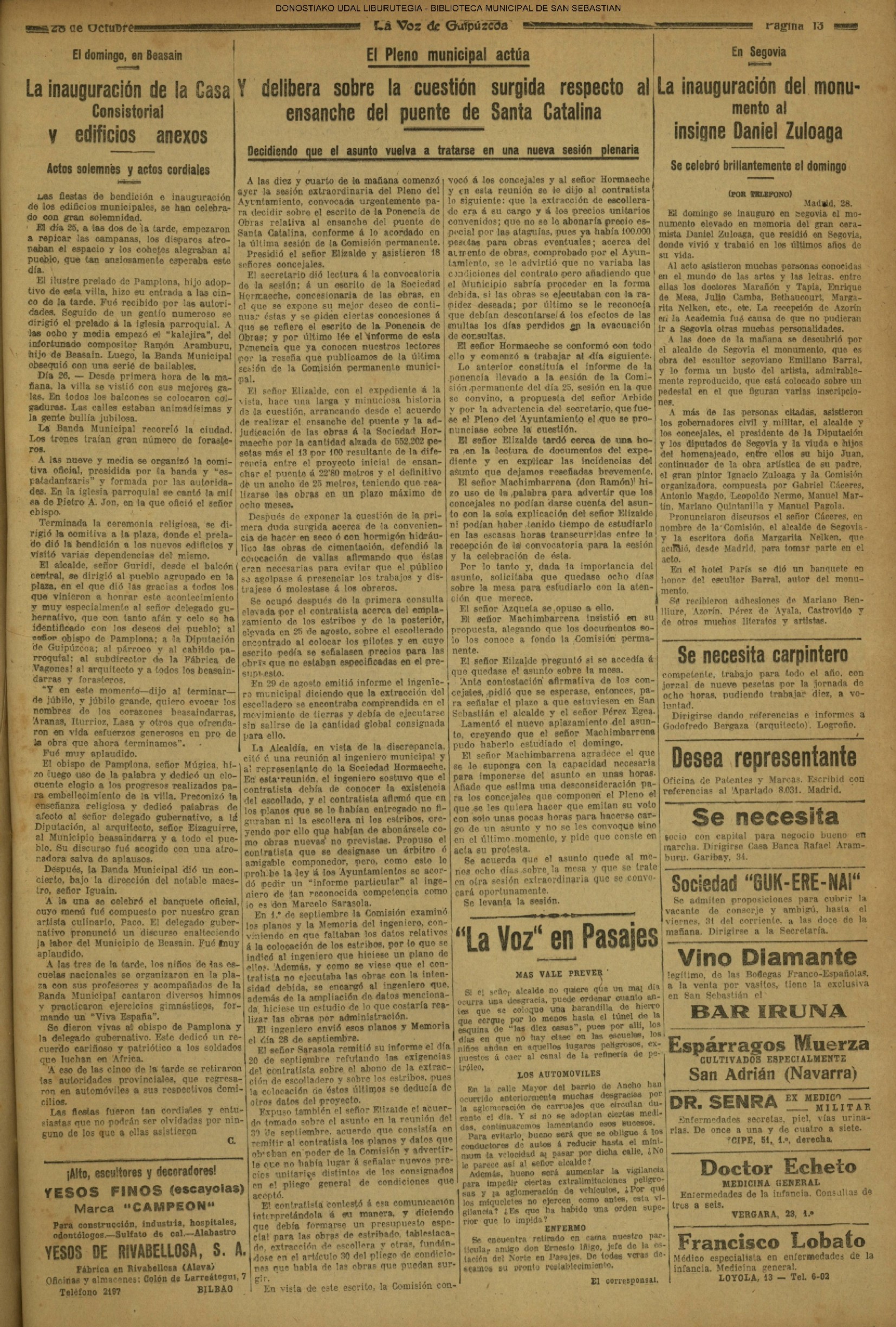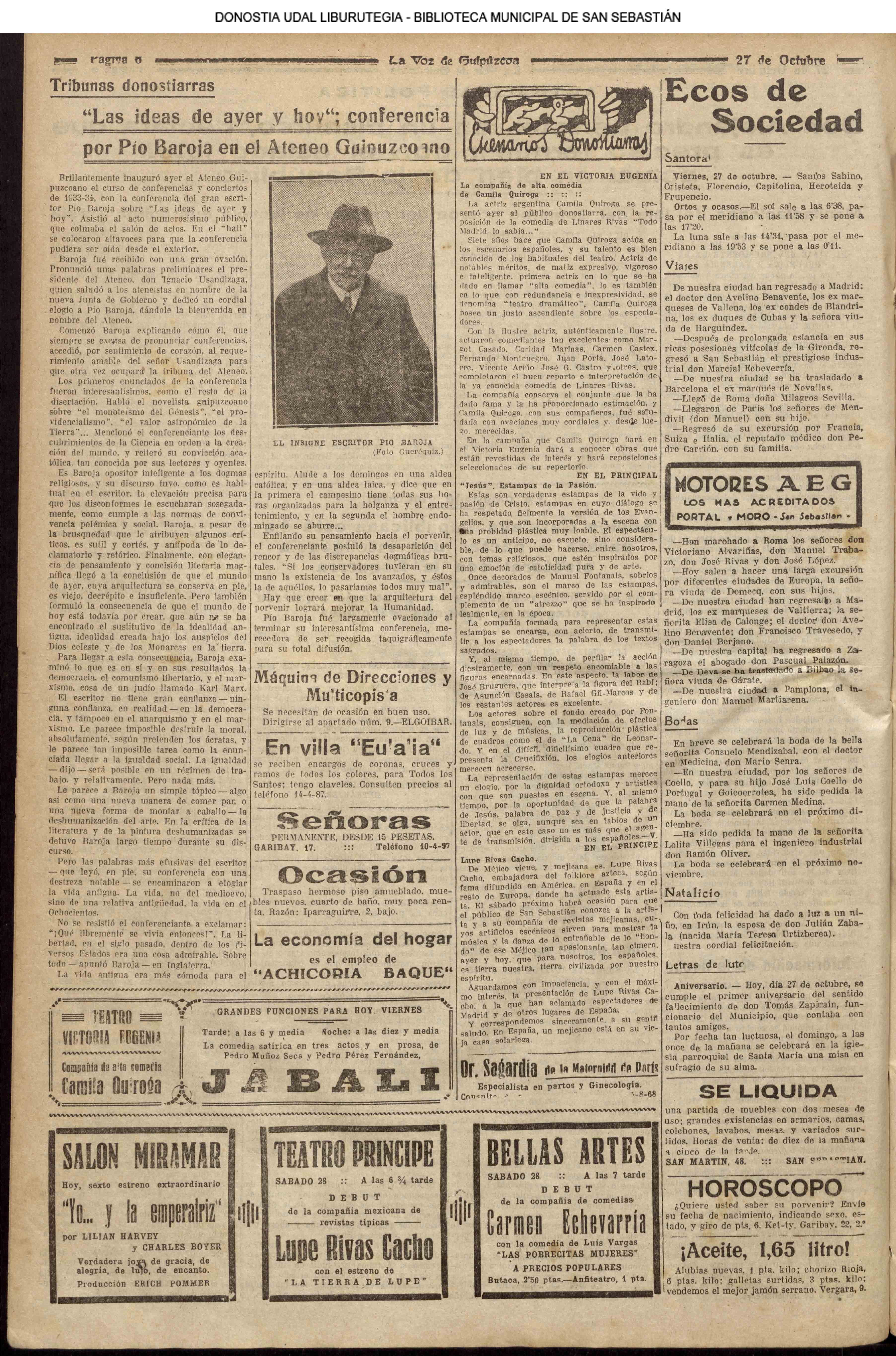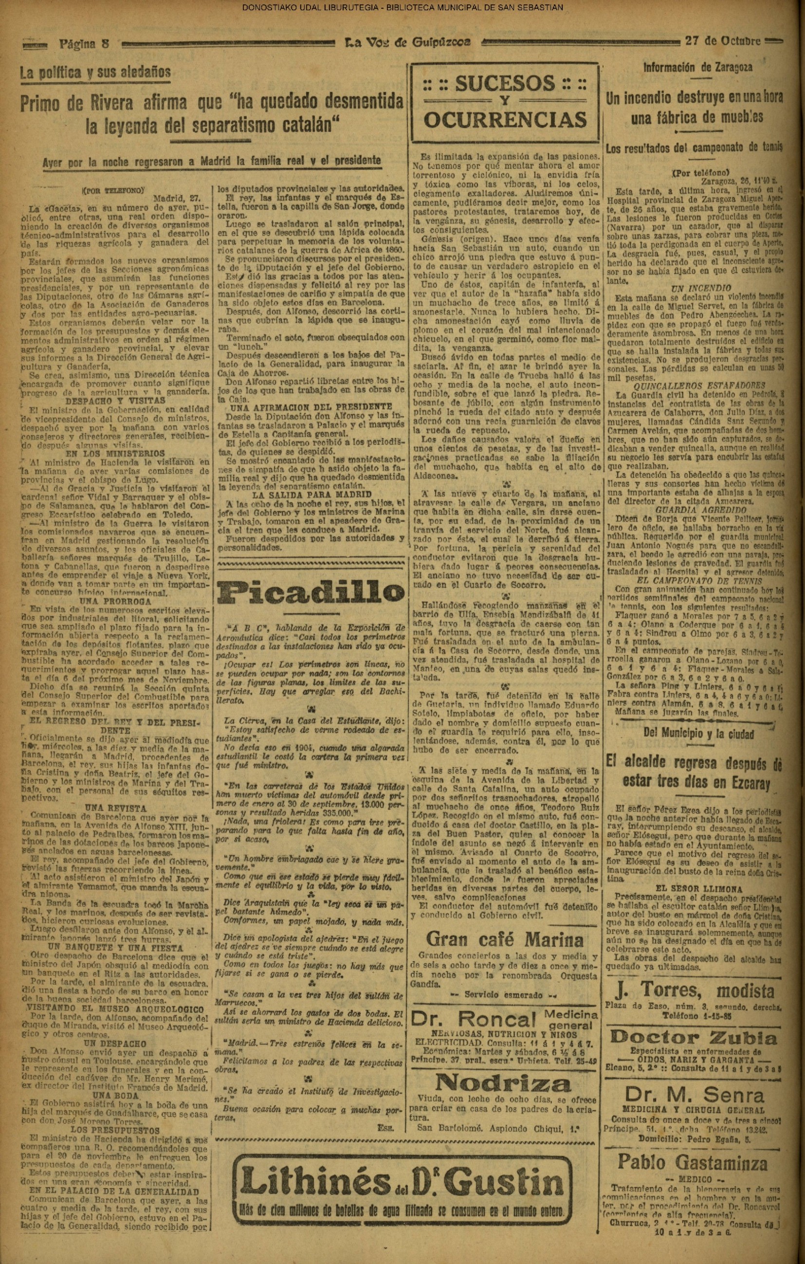 1924 - DE SOL A SOL (DOMINGO)(Nada sensacional por estos andurriales: ni siquiera una ligera equimosis futbolística en Atocha. Un mitin en Irún, en el que Miguel Angel Bergareche leyó unas cuartillas admirables, incisivas y elocuentes, contra el sospechoso ardor centralista de "El Sol". Los beasaindarras echaron la casa por la ventana para celebrar la inauguración de los edificios municipales, que para sí los quisieran en muchas capitales. La crónica negra, en blanco y apenas un leve atropello automovilista, sin más víctima que una farola perniquebrada.....) # Llega a San Sebastián la Reina madre