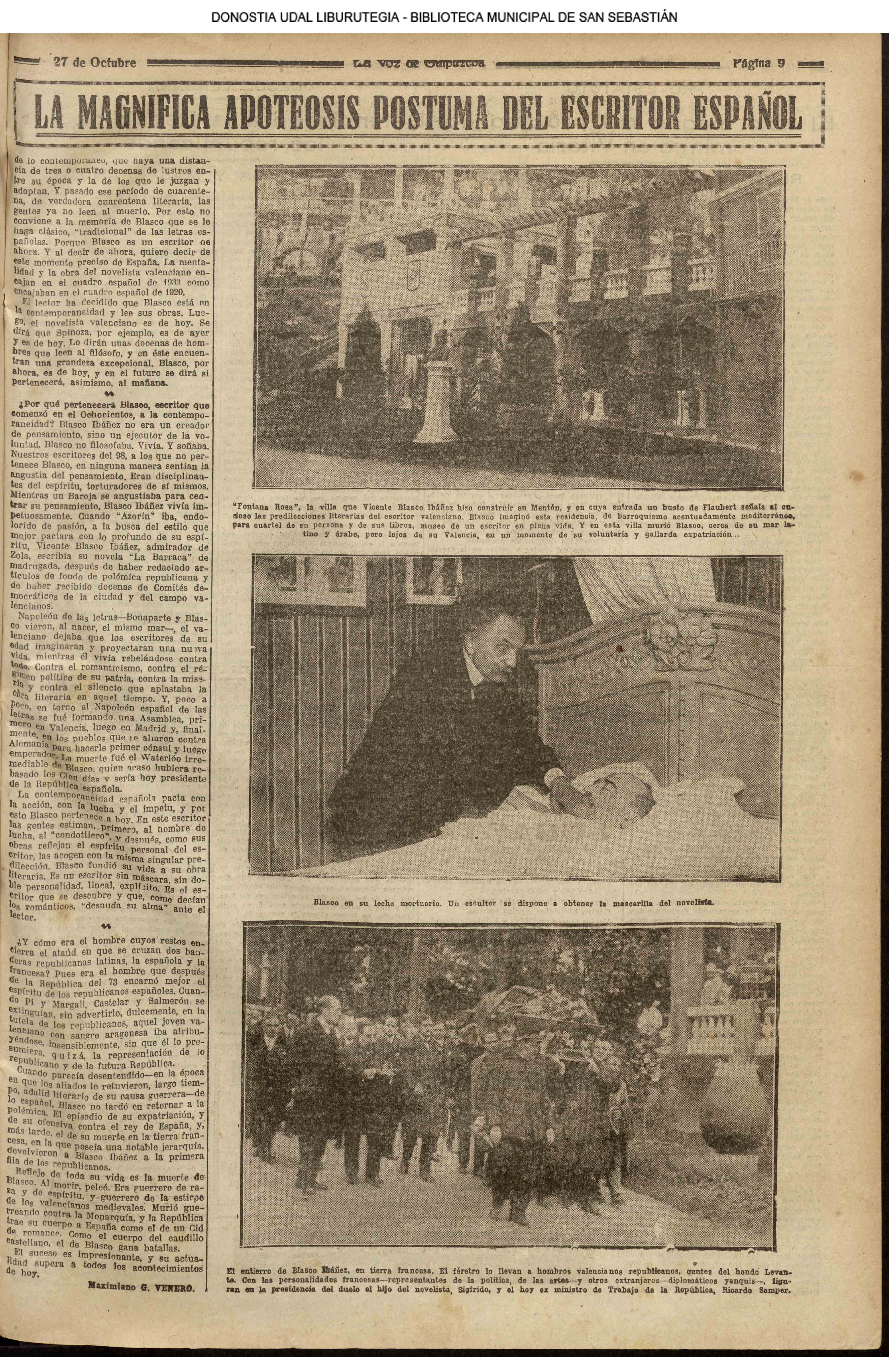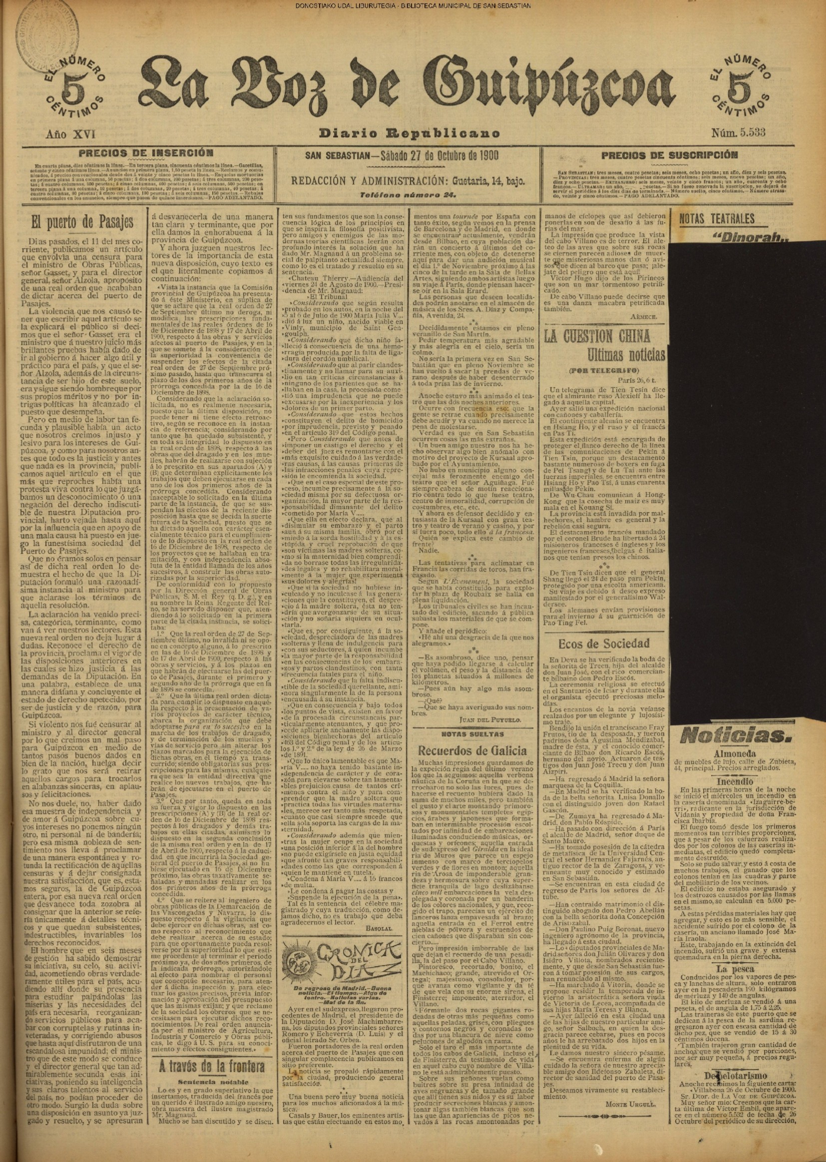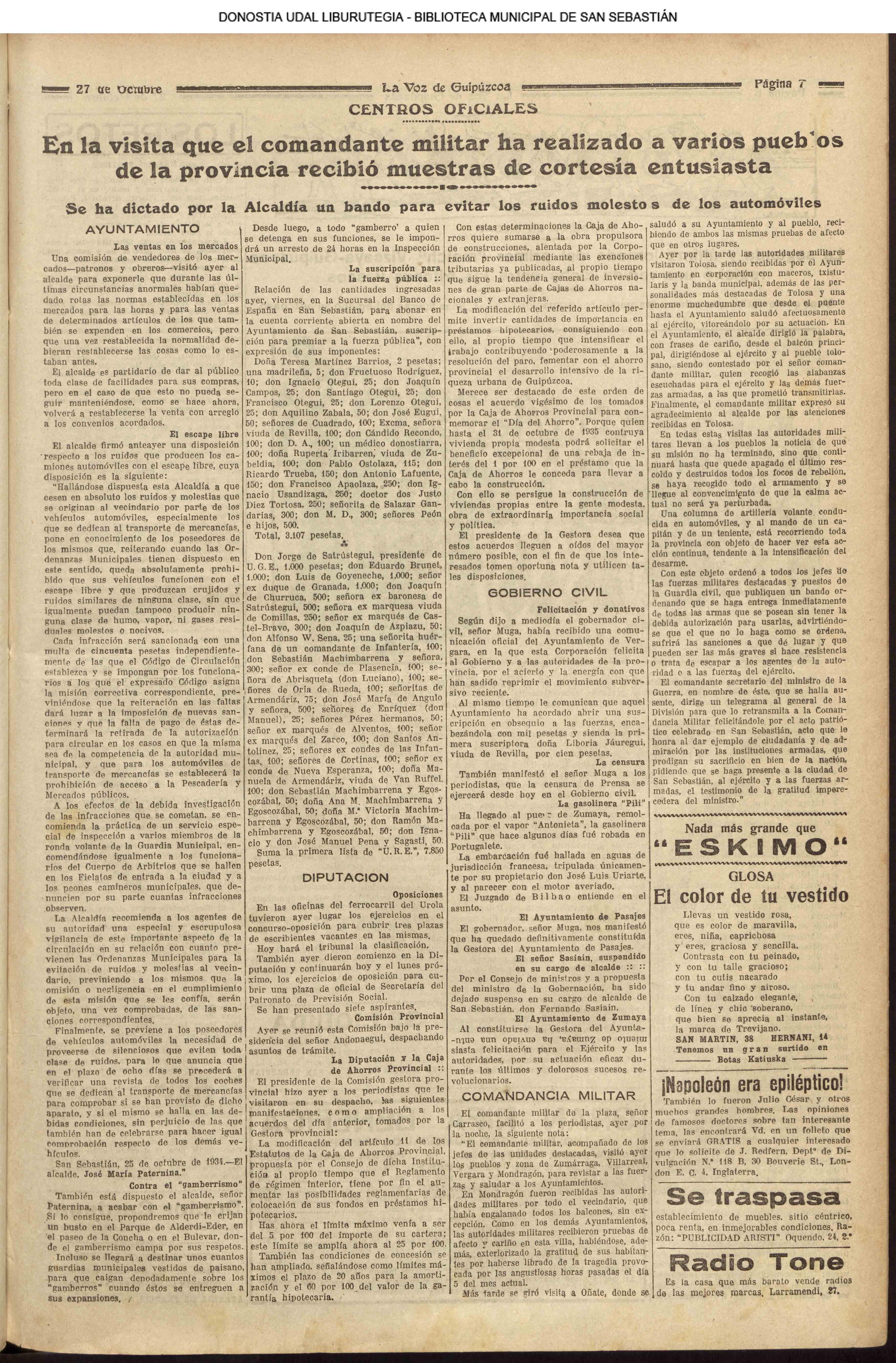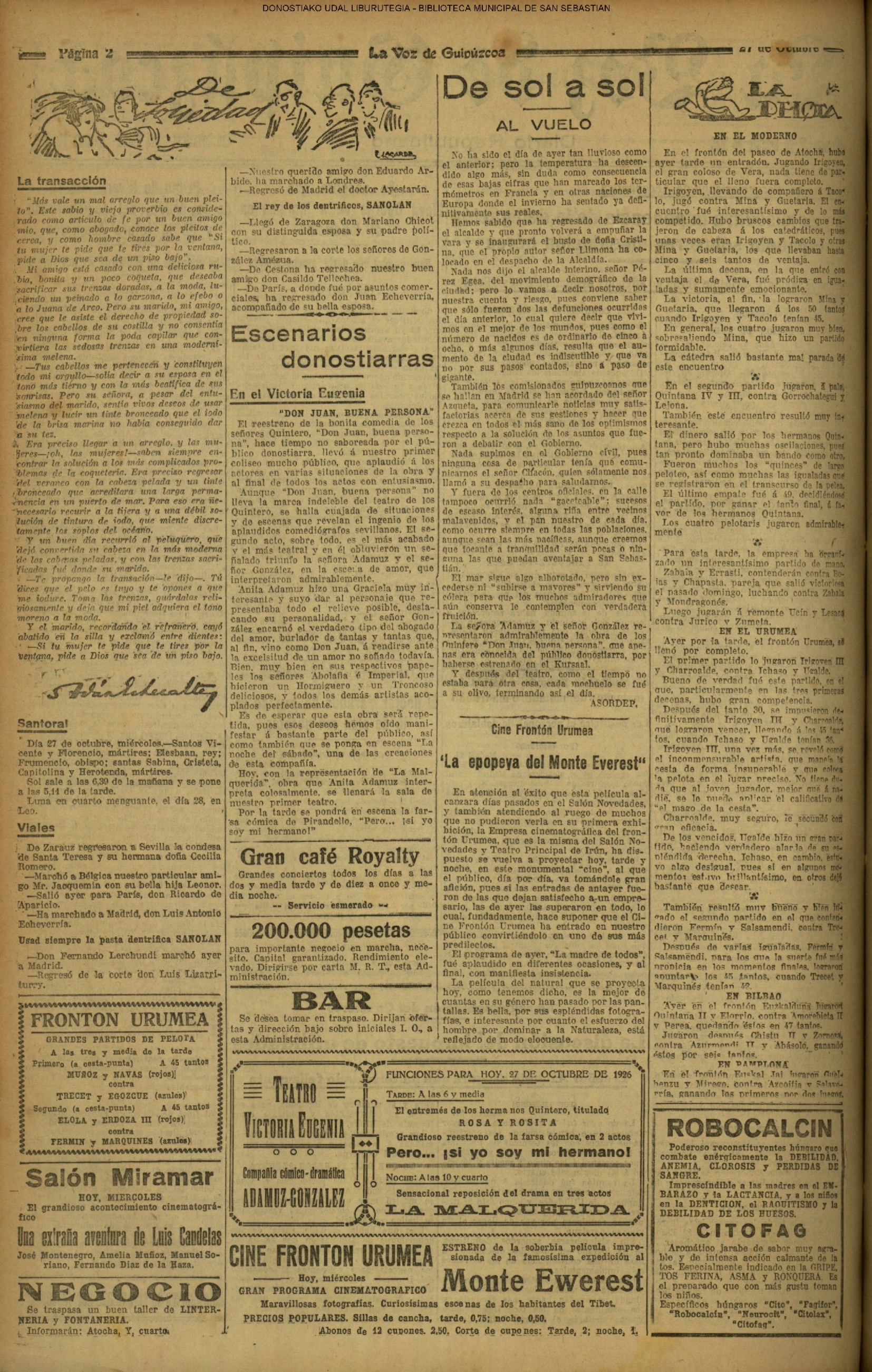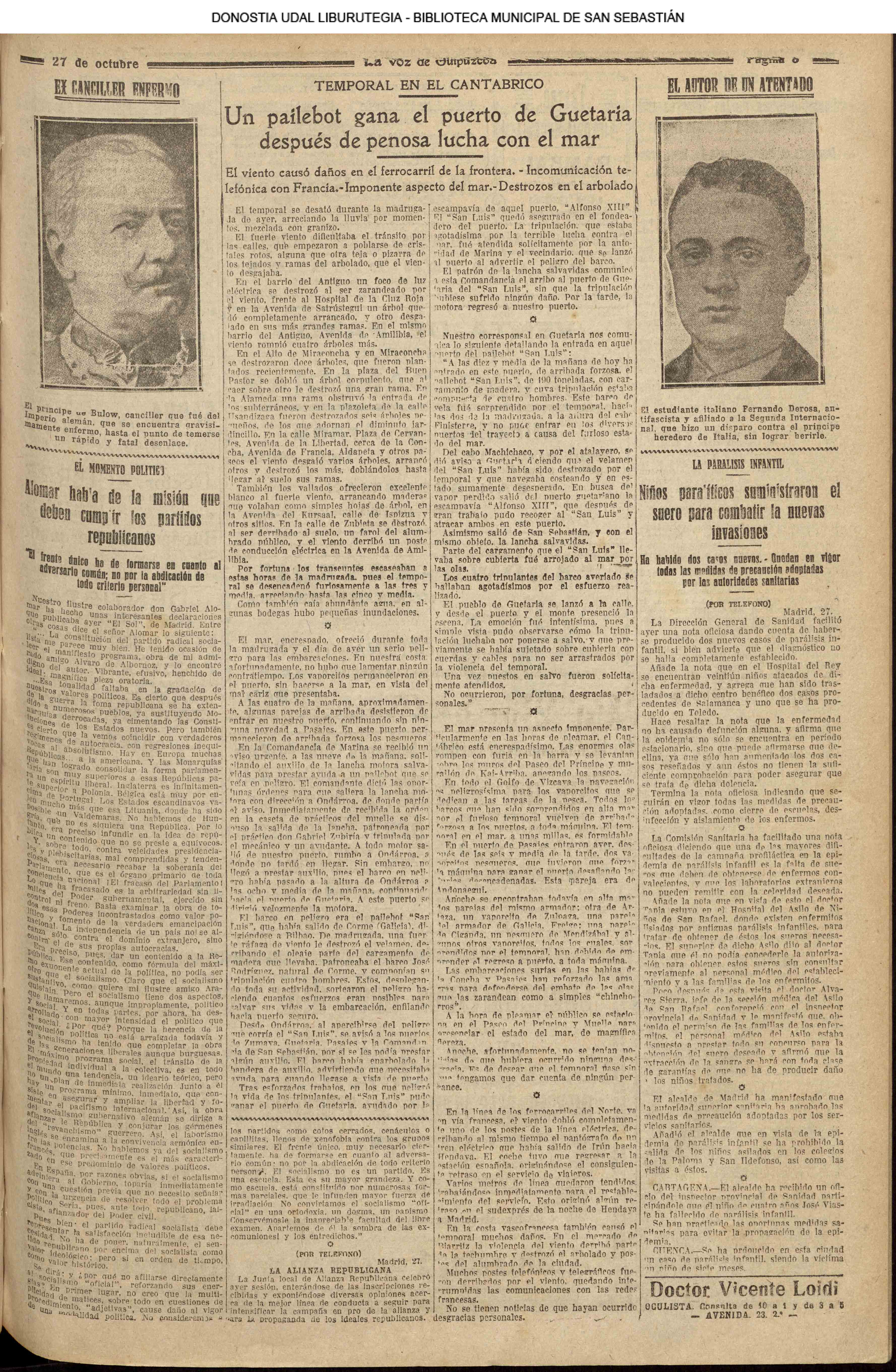1924 - DE SOL A SOL (DOMINGO)(Nada sensacional por estos andurriales: ni siquiera una ligera equimosis futbolística en Atocha. Un mitin en Irún, en el que Miguel Angel Bergareche leyó unas cuartillas admirables, incisivas y elocuentes, contra el sospechoso ardor centralista de "El Sol". Los beasaindarras echaron la casa por la ventana para celebrar la inauguración de los edificios municipales, que para sí los quisieran en muchas capitales. La crónica negra, en blanco y apenas un leve atropello automovilista, sin más víctima que una farola perniquebrada.....) # Llega a San Sebastián la Reina madre