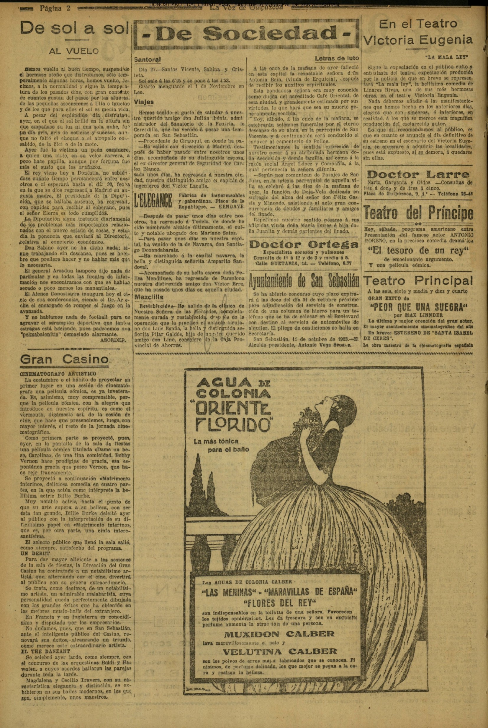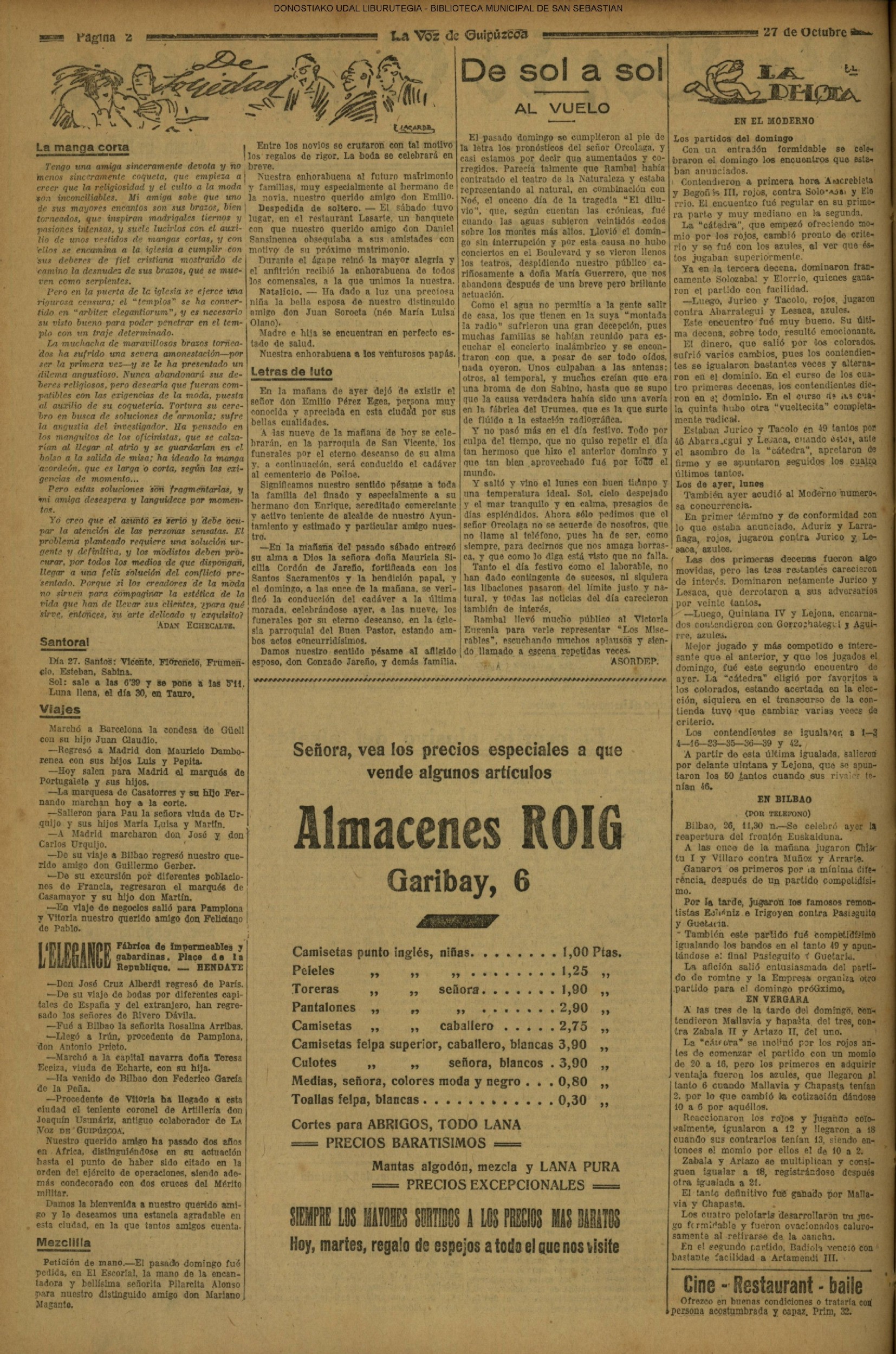 1923 - DE SOL A SOL (VIERNES)- (Hemos vuelto al buen tiempo, suspendido el hermoso otoño que disfrutamos, sólo temporalmente algunas horas, hemos vuelto, decimos, a la normalidad y sigue la temperatura de los pasados días, con gran contento de cuantos gustan del paseo por las afueras, de las pequeñas ascensiones a Ulía o Iguelao y de los que para ellos el sol es media vida......) (La Voz de Guipuzcoa)(El Pueblo Vasco)(El Pais Vasco)(La Constancia)) |