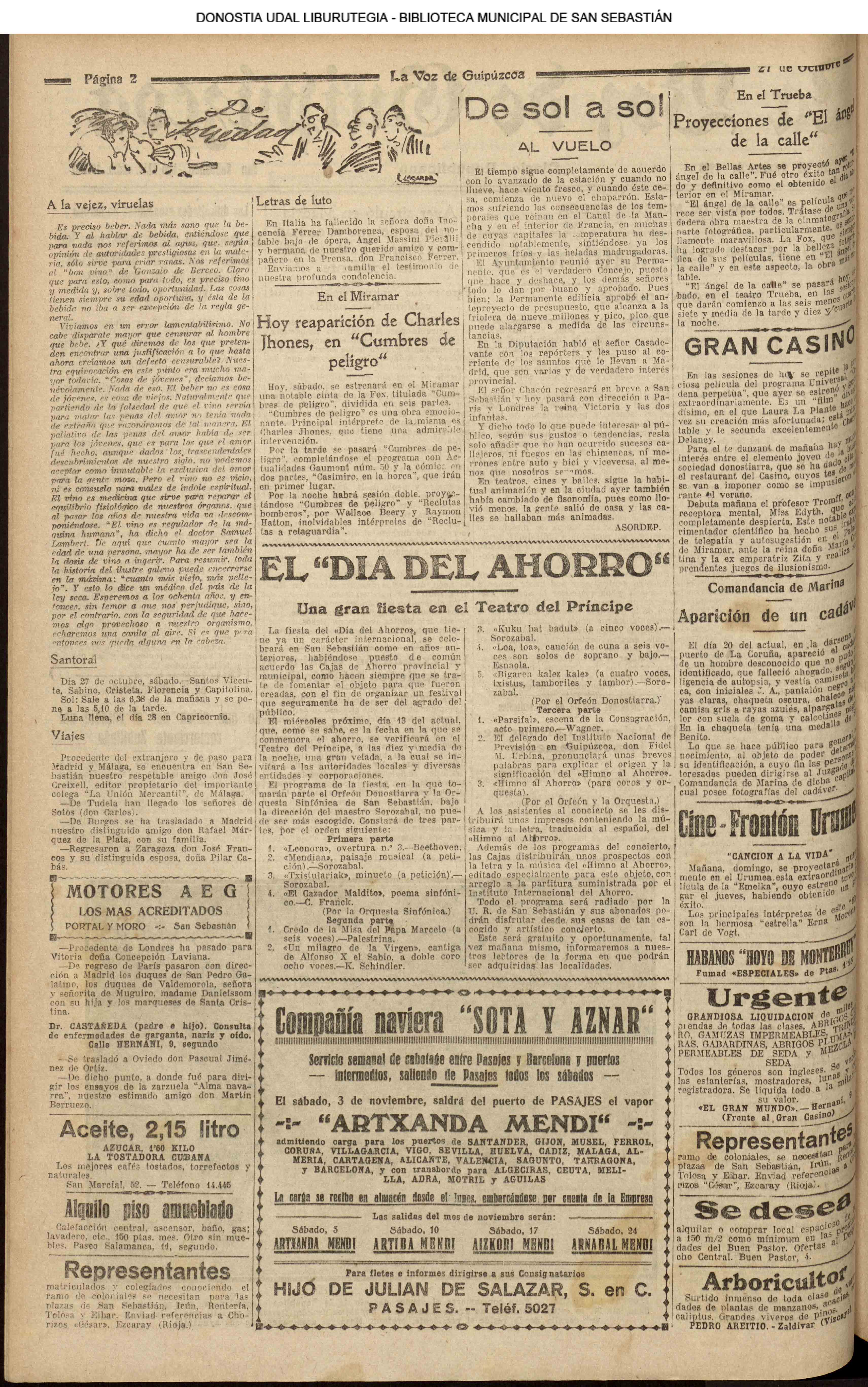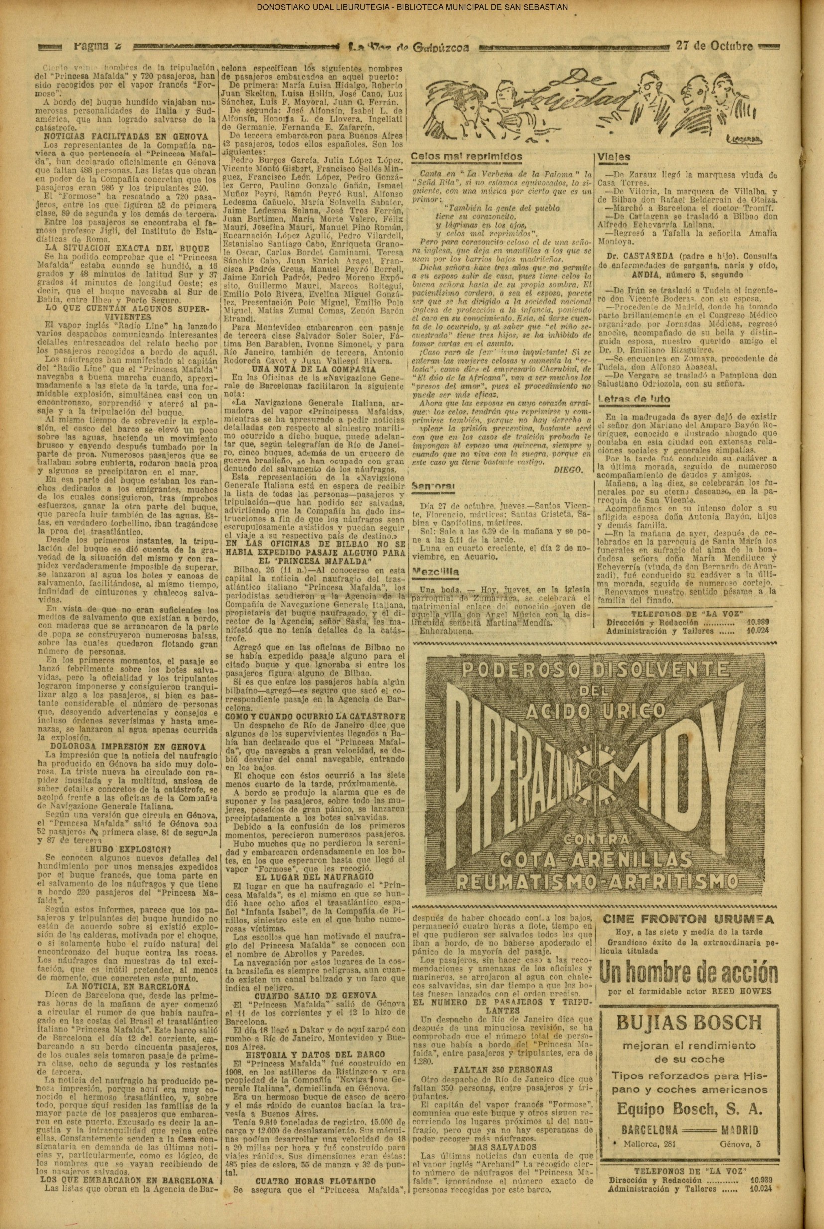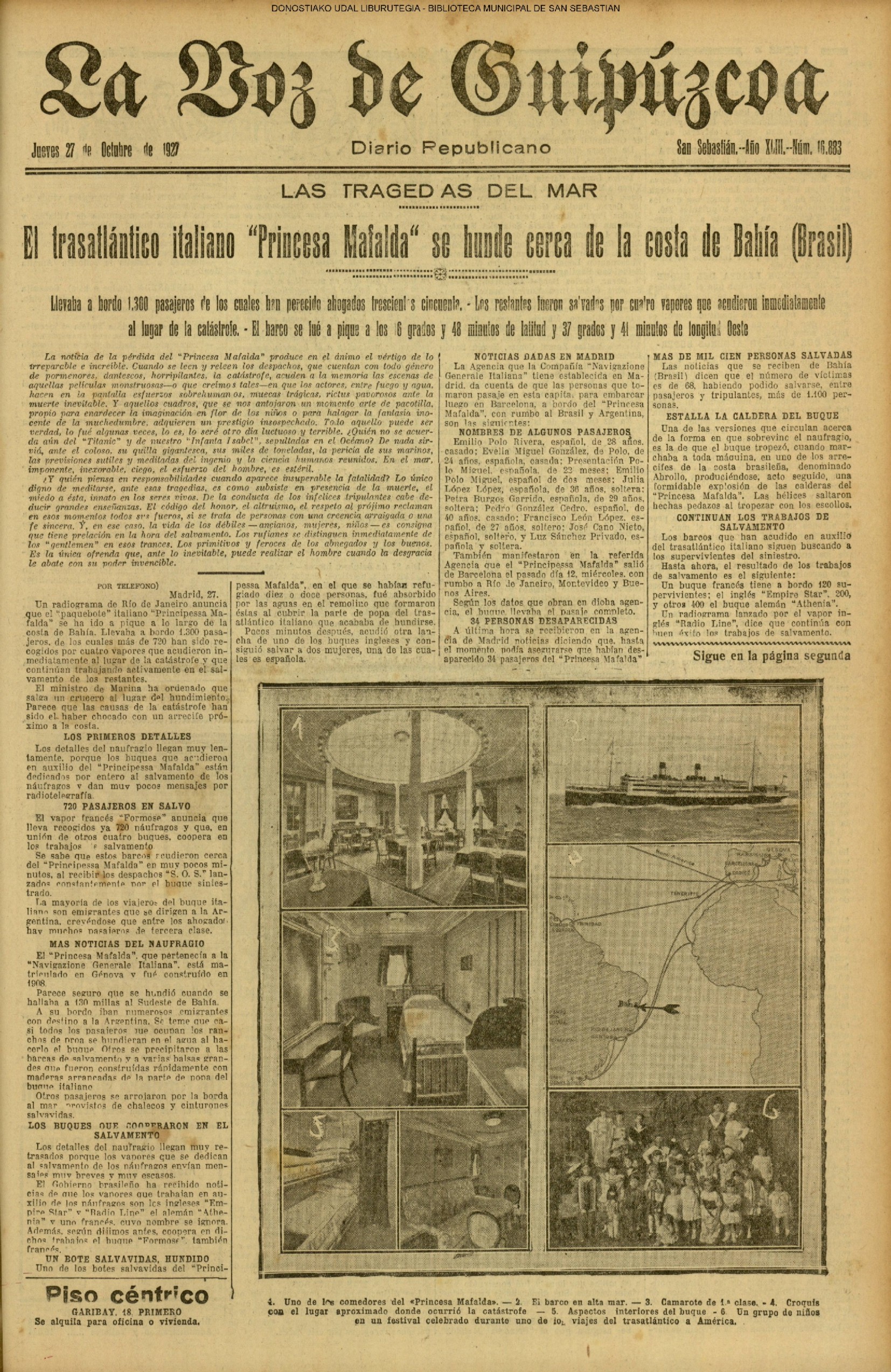 1927 - DE SOL A SOL (MIERCOLES)(Gracias a San Martín, o a quien le corres-pondan, le serán dadas por el veranillo que nos envía y que disfrulamos muy a gusto, pues en verdad que días como los que lle-vahos pasando entran pocos en la balanza otoñal......) # LAS TRAGEDIAS DEL MAR - El trasatlántico italiano "Princesa Mafalda" se hunde cerca de la costa de Bahía (Brasil) (La Voz de Guipuzcoa/cont)(El Pueblo Vasco)(El Pais Vasco)(La Constancia) |