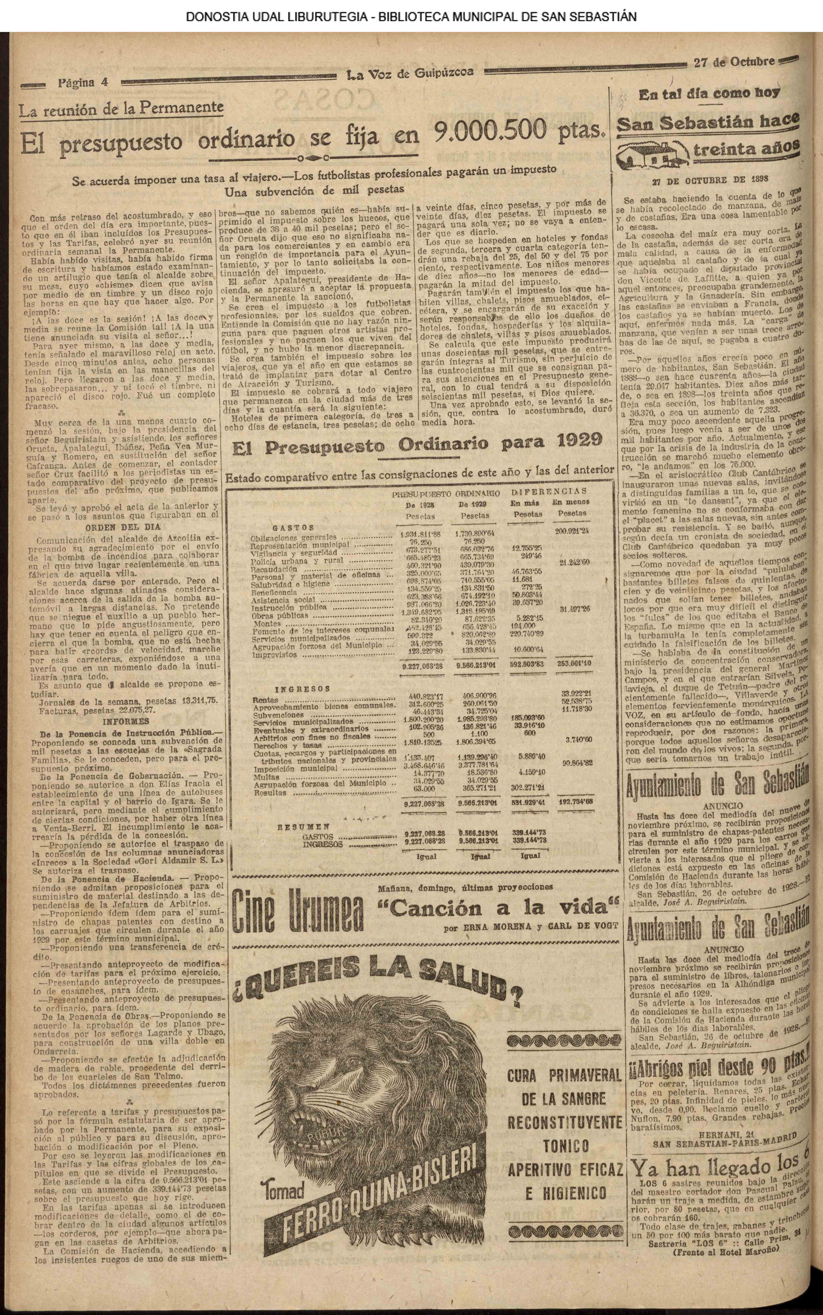 .- El presupuesto ordinario se fija en 9.000.500 ptasSe acuerda imponer una tasa al viajero. Los futbolistas profesionales pagarán un impuesto Una subvención de mil pesetas (La Voz de Guipúzcoa)(El Pueblo Vasco)(El Pais Vasco)(La Constancia)