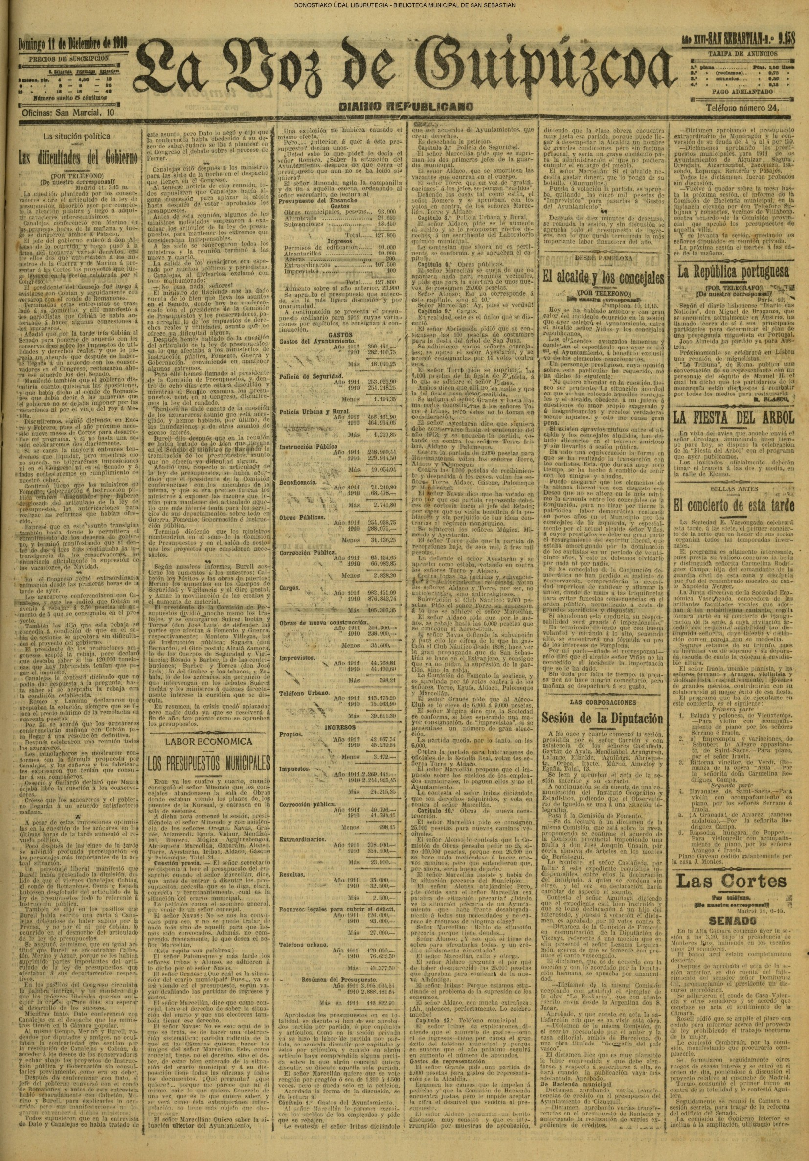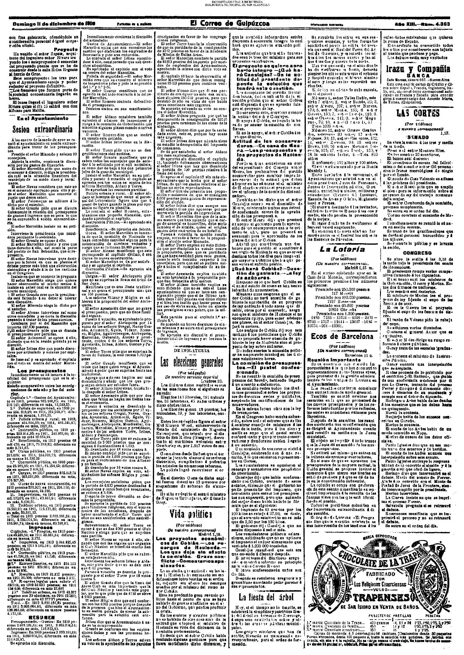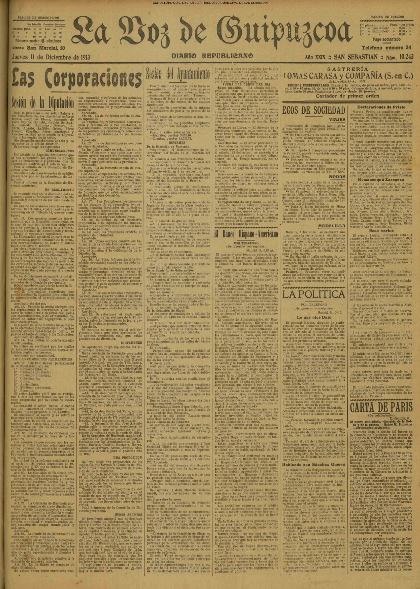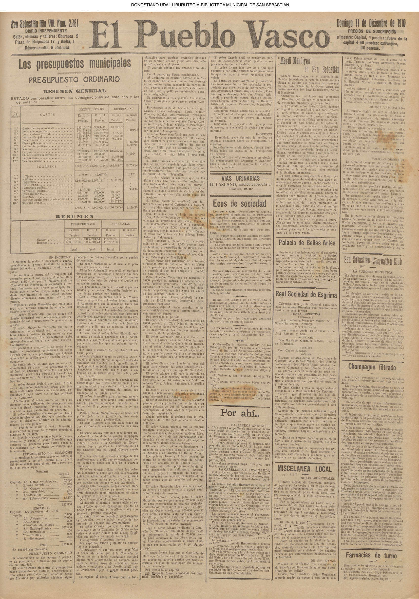 (1905)(D) TERRIBLE DESGRACIA - VICTIMAS DEL TRANVIA (La Voz de Guipúzcoa)(El Correo de Guipuzcoa/cont)(La Constancia) (1910) PLENO MUNICIPAL - PRESUPUESTOS MUNICIPALES (La Voz de Guipúzcoa)(El Pueblo Vasco)(El Correo de Guipuzcoa)(La Constancia) (1913) SESIÓN DE LA DIPUTACIÓN - SESIÓN MUNICIPAL D. Francisco Avalos es nombrado interventor del fielato de la Estación del Norte. (La Voz de Guipúzcoa)(El Pueblo Vasco)(El Correo de Guipuzcoa)(La Constancia) (1915) PLENO MUNICIPAL (La Voz de Guipúzcoa) # CONFLICTO.- El asunto de la venta de leche (La Voz de Guipúzcoa) (1920) PLENO MUNICIPAL (La Voz de Guipúzcoa) (1923) Matrimonial enlace de dos hermanos de familia conocidísima de la Parte Vieja: D. Sebastián y Rosalía Idarreta. El primero, con Filo Arrieta. La segunda, con D. Arturo Arámburu, notable pelotari. (San Vicente). (1925) (1926) La tejera de Eguía se estremeció de horror al ver caer en una de sus máquinas trituradoras a uno de los obreros que la alimentaban, José Iturrioz Amarategui, natural de Irún. (1928) Fallece D. Miguel Berriatúa y Sanahuja, fundador y propietario del Frontón Urumea. (1930) (1935 ) PLENO MUNICIPAL (La Voz de Guipúzcoa)(El Pueblo Vasco)(El Día)(La Constancia)(El Diario Vasco) (1936) GUERRA CIVIL (EL DIARIO VASCO)(LA VOZ DE ESPAÑA)(UNIDAD) (1937) GUERRA CIVIL (EL DIARIO VASCO)(LA VOZ DE ESPAÑA)(UNIDAD) (1938) GUERRA CIVIL (EL DIARIO VASCO)(LA VOZ DE ESPAÑA)(UNIDAD) (1939)