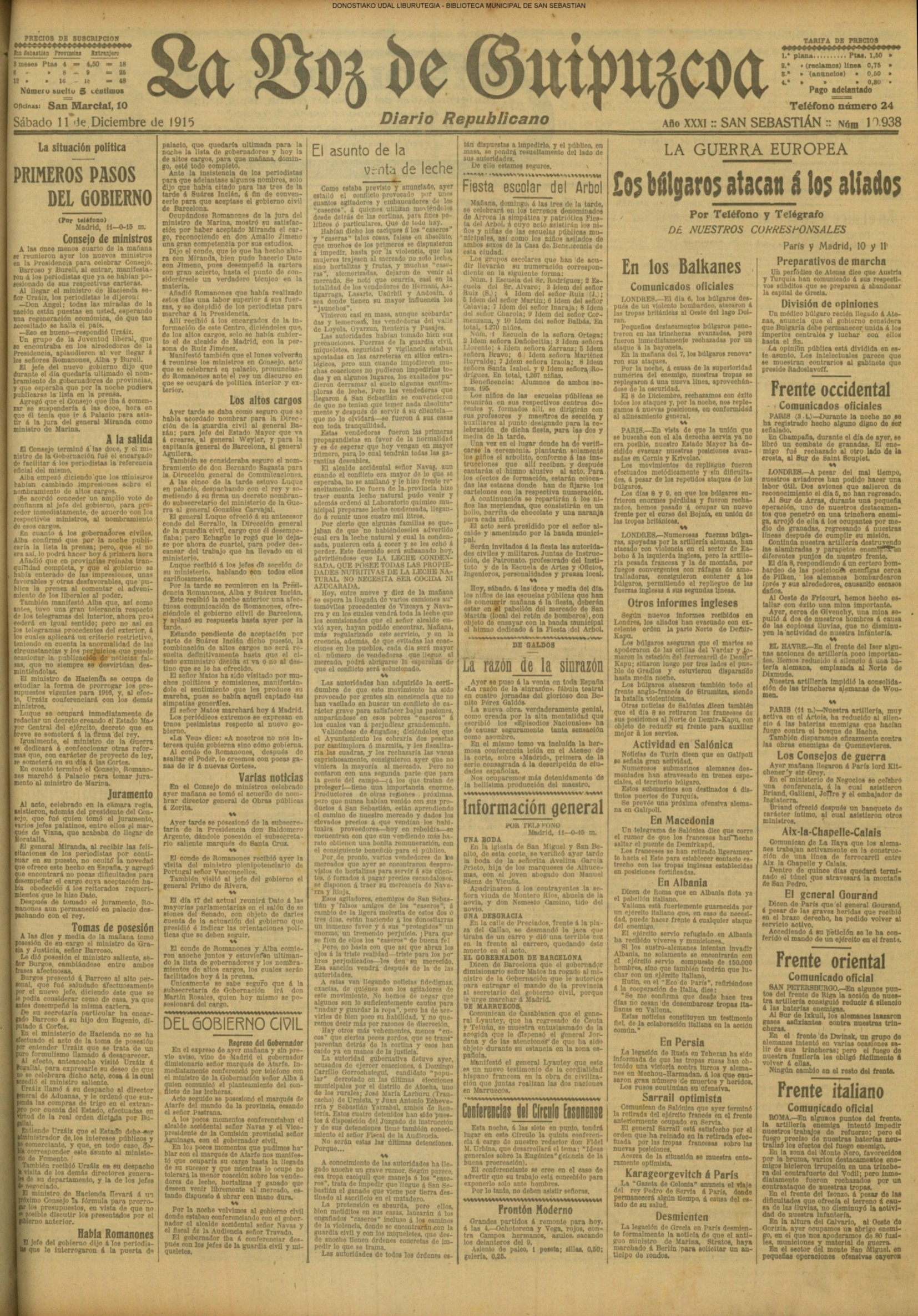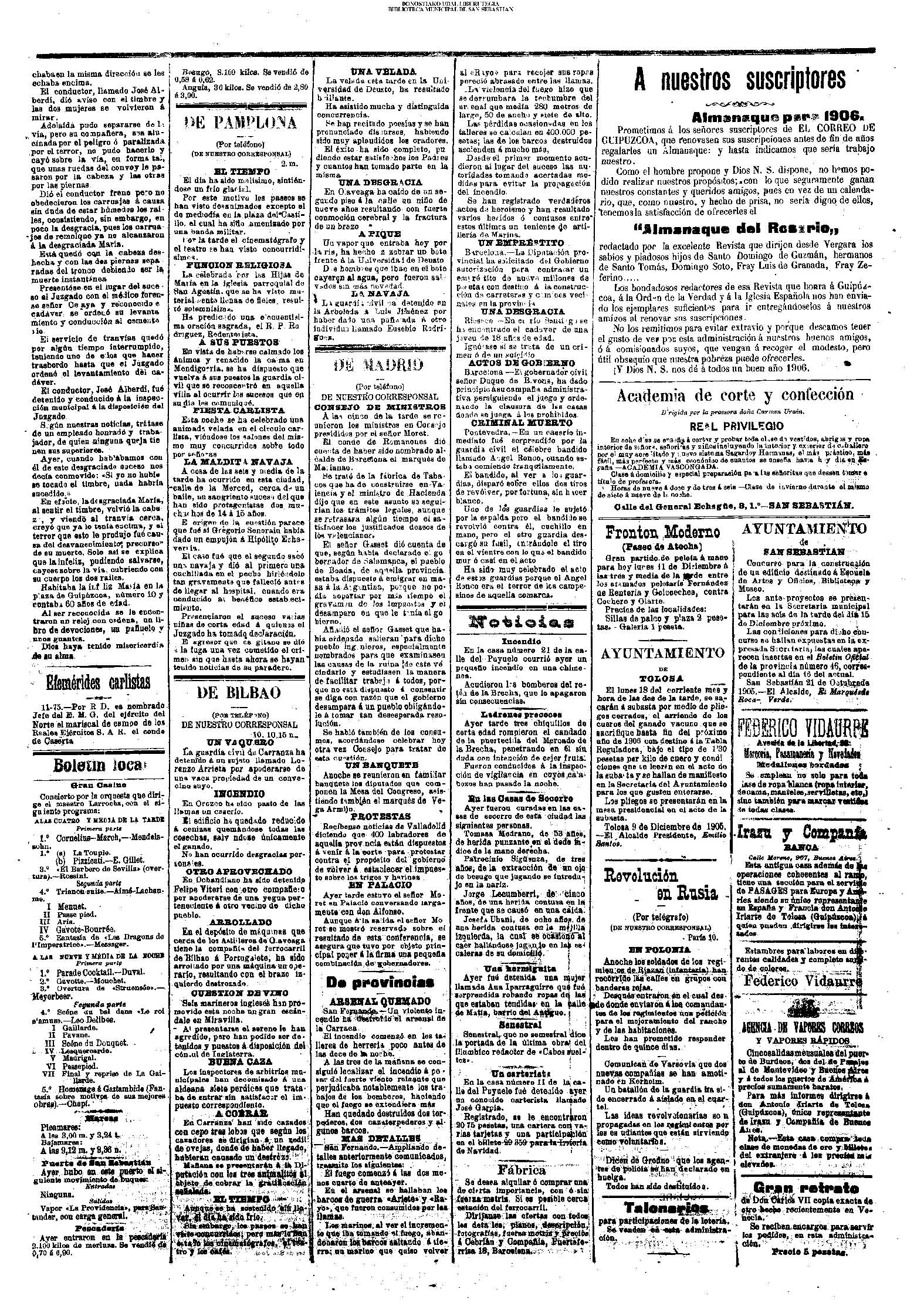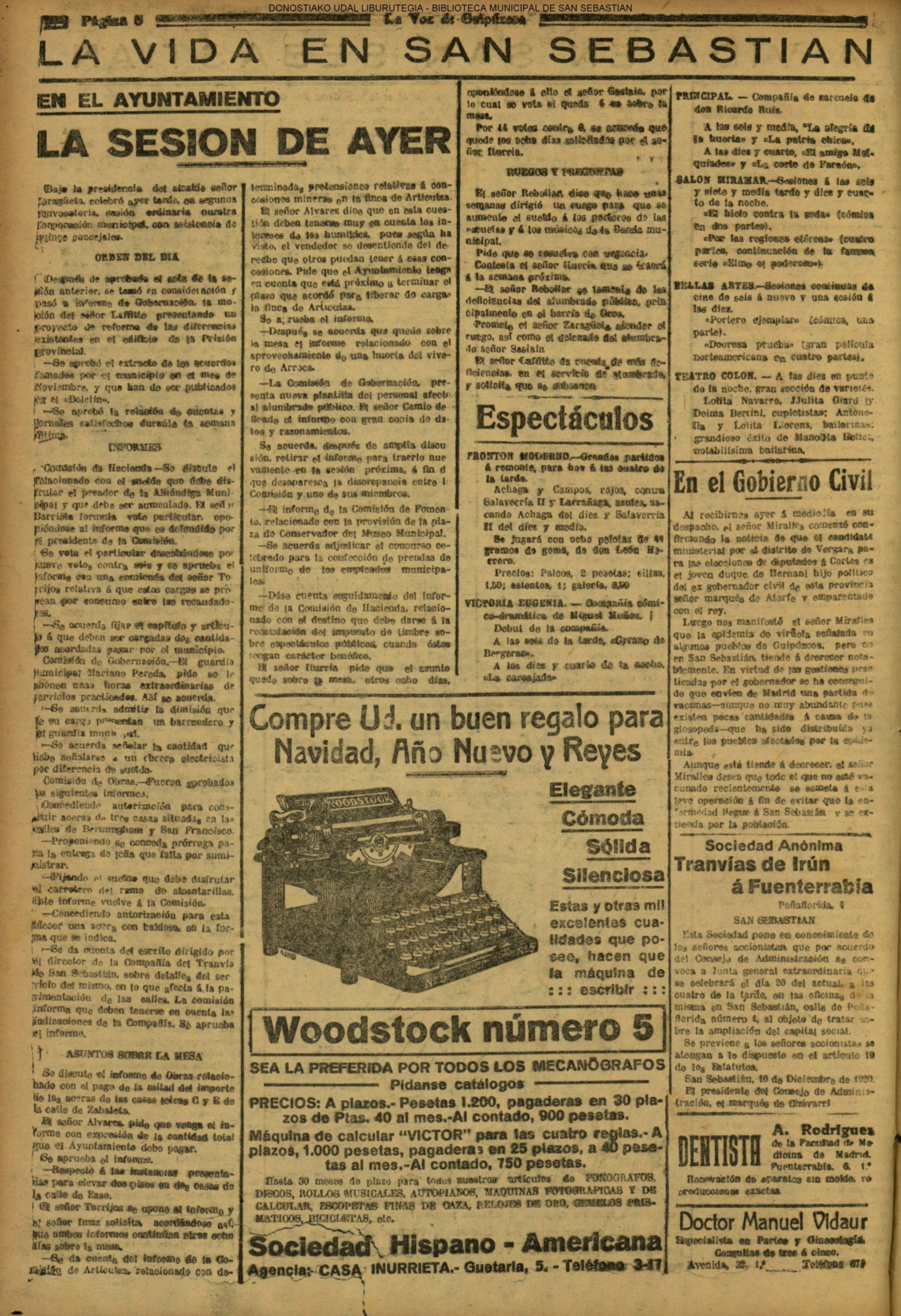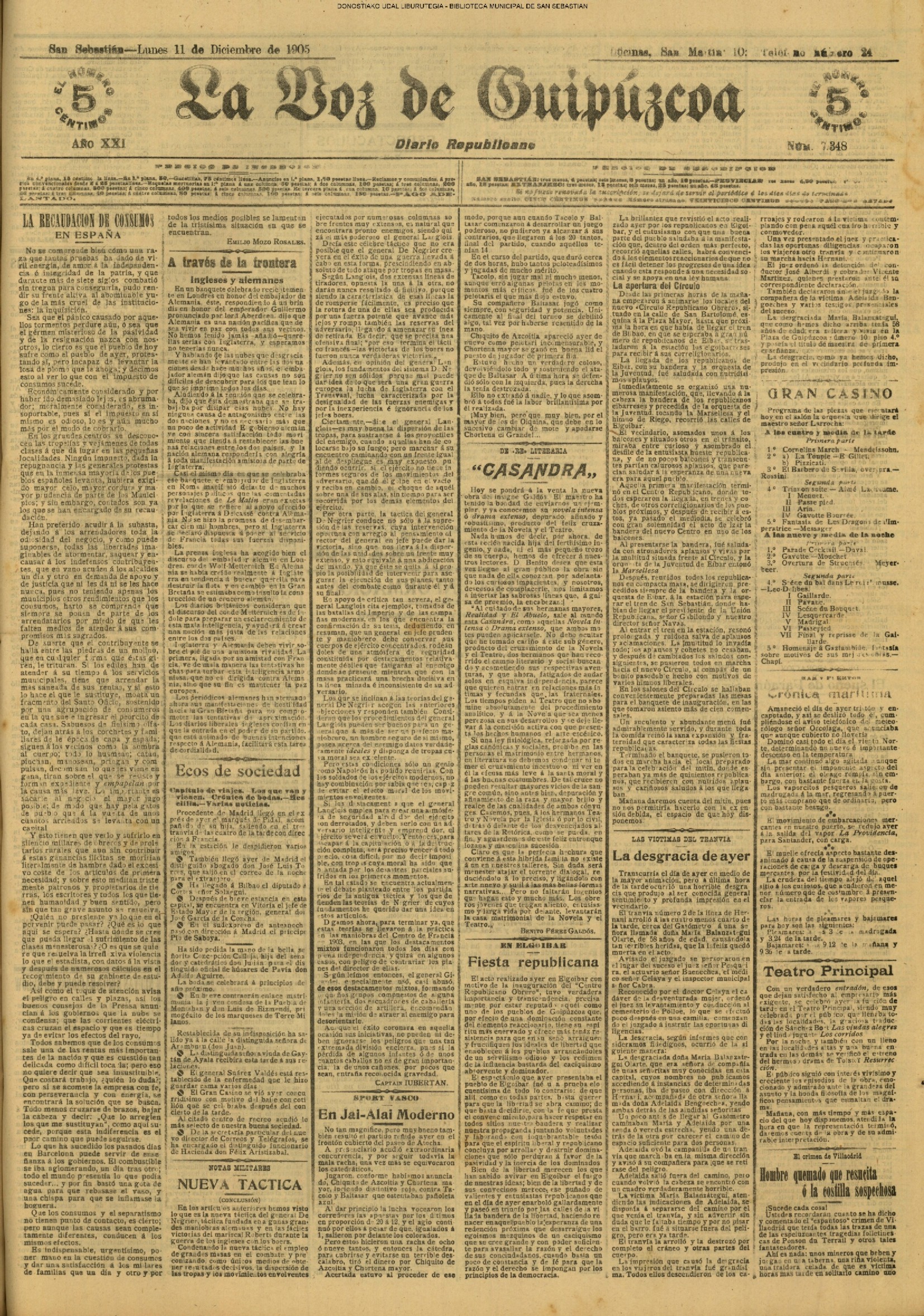(1905)(D) TERRIBLE DESGRACIA - VICTIMAS DEL TRANVIA (La Voz de Guipúzcoa)(El Correo de Guipuzcoa/cont)(La Constancia) (1910) PLENO MUNICIPAL - PRESUPUESTOS MUNICIPALES (La Voz de Guipúzcoa)(El Pueblo Vasco)(El Correo de Guipuzcoa)(La Constancia) (1913) SESIÓN DE LA DIPUTACIÓN - SESIÓN MUNICIPAL D. Francisco Avalos es nombrado interventor del fielato de la Estación del Norte. (La Voz de Guipúzcoa)(El Pueblo Vasco)(El Correo de Guipuzcoa)(La Constancia) (1915) PLENO MUNICIPAL (La Voz de Guipúzcoa) # CONFLICTO.- El asunto de la venta de leche (La Voz de Guipúzcoa) (1920) PLENO MUNICIPAL (La Voz de Guipúzcoa) (1923) Matrimonial enlace de dos hermanos de familia conocidísima de la Parte Vieja: D. Sebastián y Rosalía Idarreta. El primero, con Filo Arrieta. La segunda, con D. Arturo Arámburu, notable pelotari. (San Vicente). (1925) (1926) La tejera de Eguía se estremeció de horror al ver caer en una de sus máquinas trituradoras a uno de los obreros que la alimentaban, José Iturrioz Amarategui, natural de Irún. (1928) Fallece D. Miguel Berriatúa y Sanahuja, fundador y propietario del Frontón Urumea. (1930) (1935 ) PLENO MUNICIPAL (La Voz de Guipúzcoa)(El Pueblo Vasco)(El Día)(La Constancia)(El Diario Vasco) (1936) GUERRA CIVIL (EL DIARIO VASCO)(LA VOZ DE ESPAÑA)(UNIDAD) (1937) GUERRA CIVIL (EL DIARIO VASCO)(LA VOZ DE ESPAÑA)(UNIDAD) (1938) GUERRA CIVIL (EL DIARIO VASCO)(LA VOZ DE ESPAÑA)(UNIDAD) (1939)