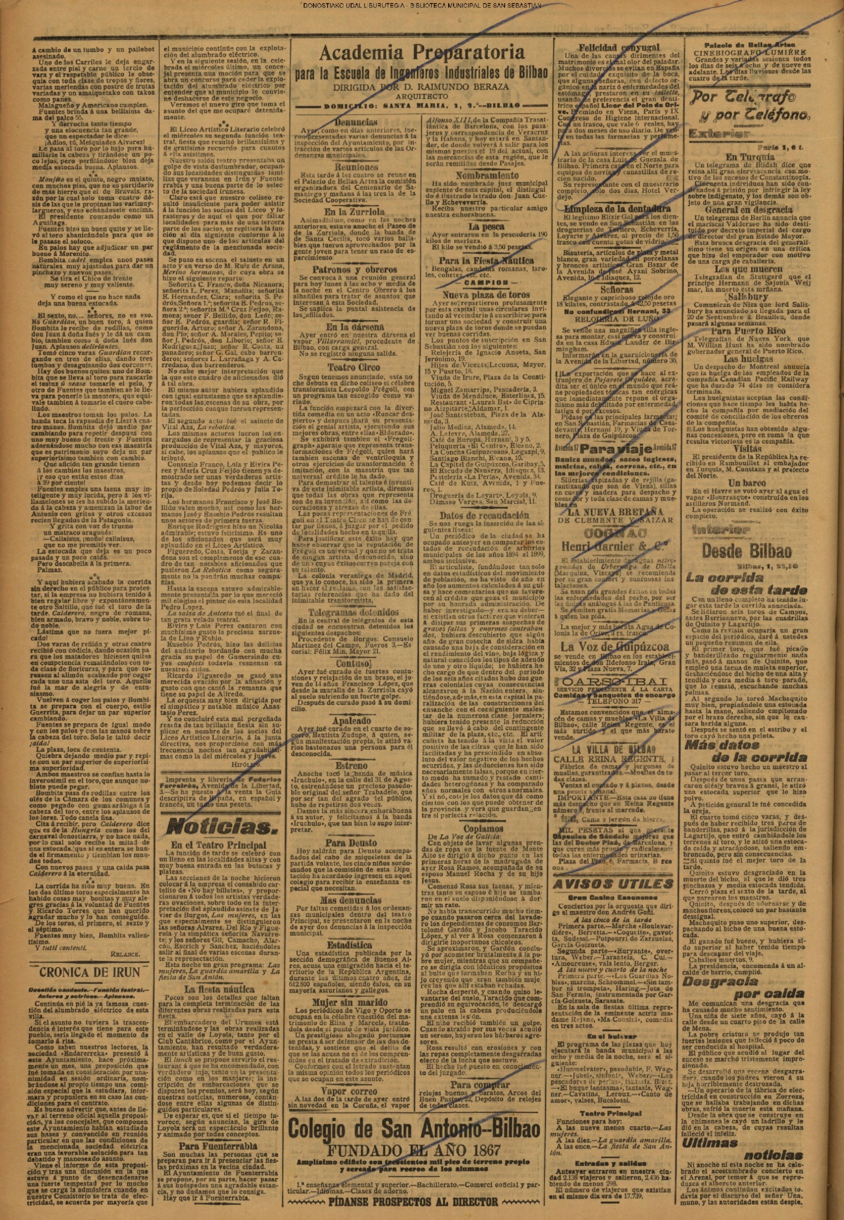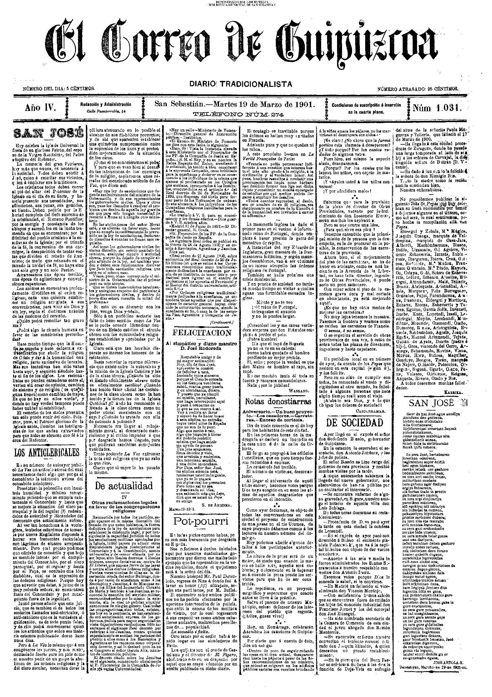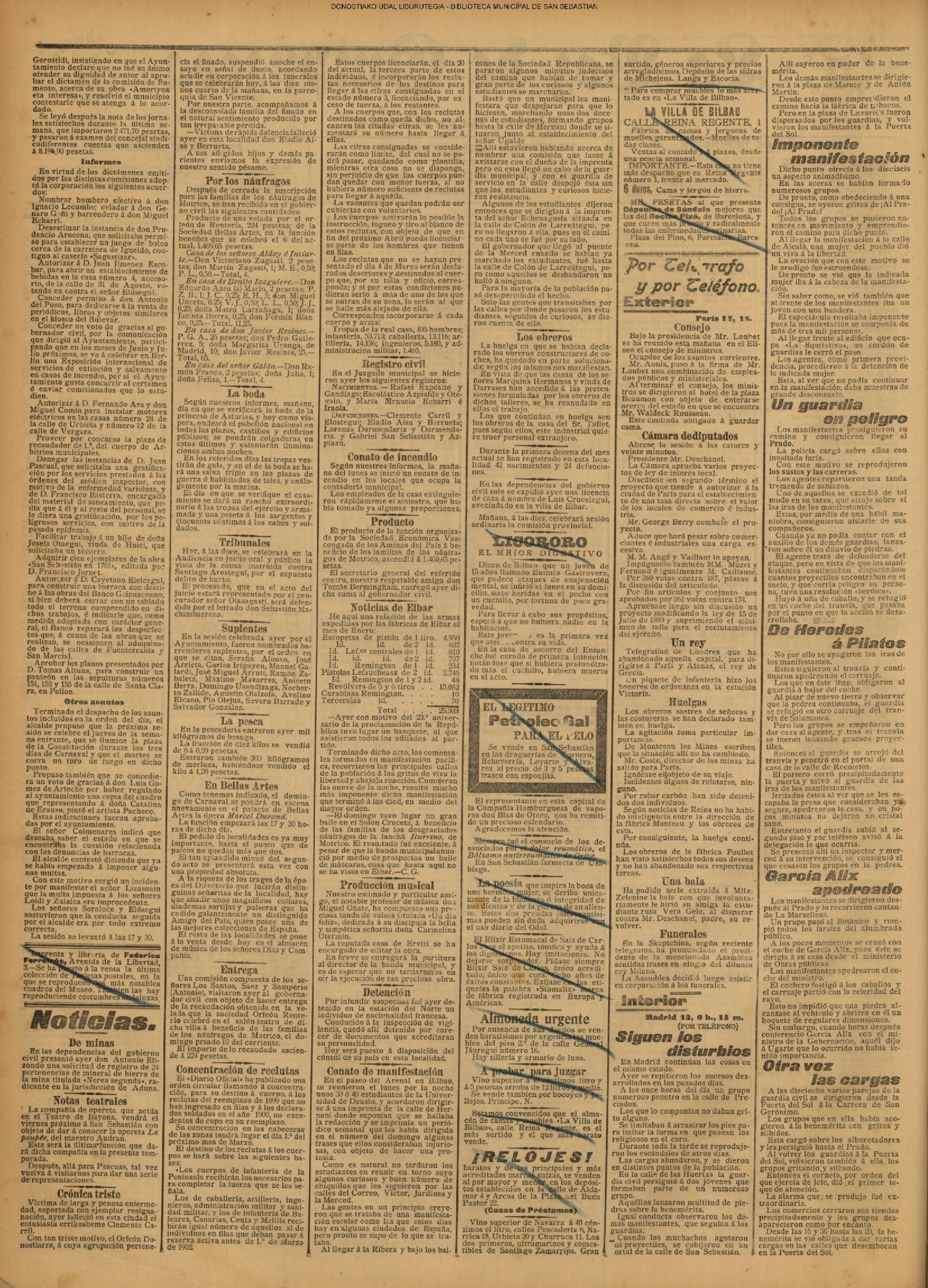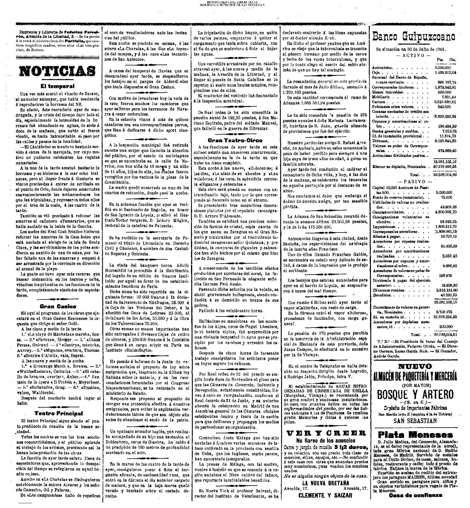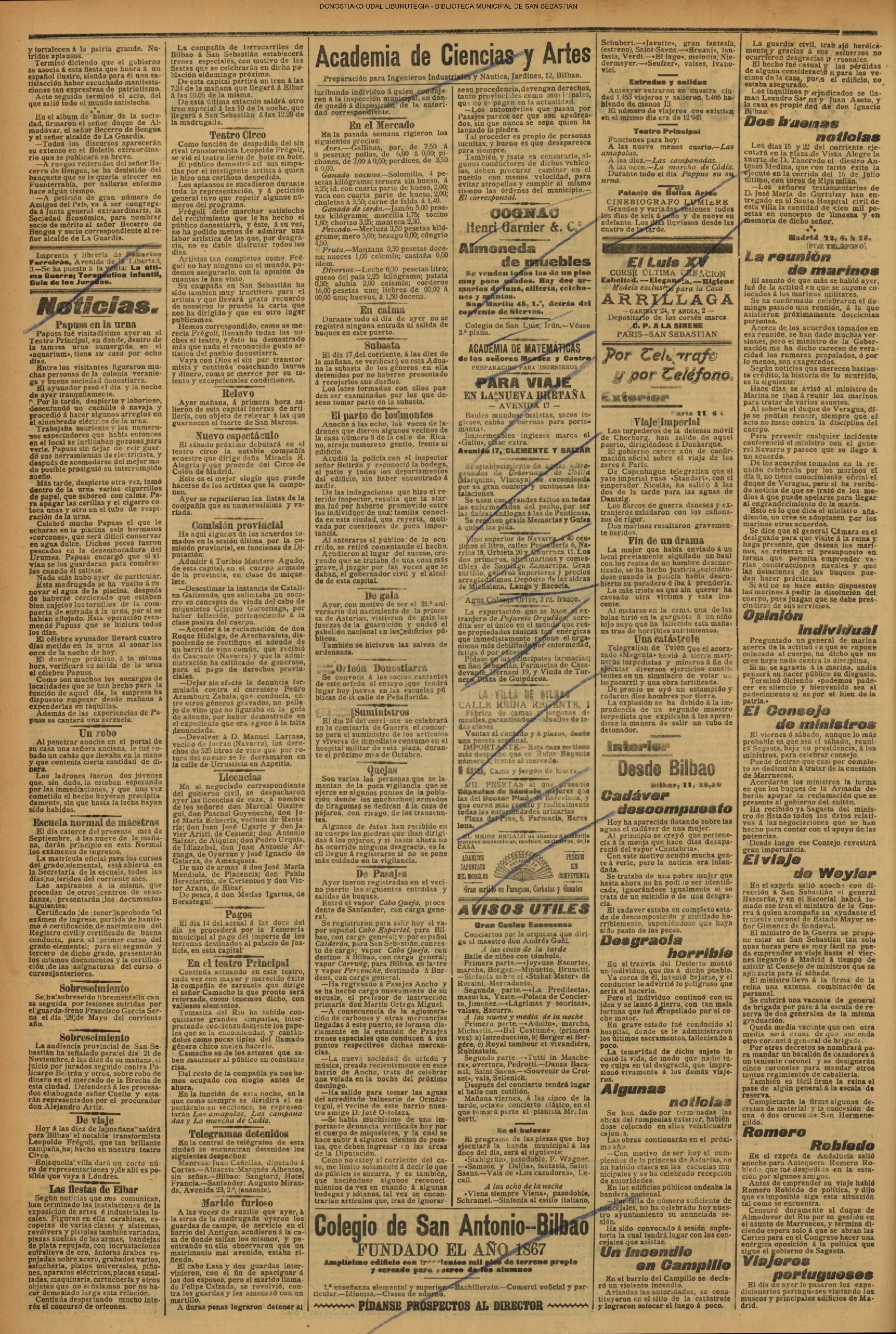 .- Nuevo Asilo de San José. En el magnifico paseo de los Fueros se está levantando el nuevo y hermoso Asilo en terrenos cedidos por el excelentísimo Ayuntamiento a la Junta de Señoras presidida por doña Desideria Petit Jean, viuda de Elosegui, que en unión de las demás señoras, y luchando con muchos inconvenientes, gracias a su constancia y amor å lacaridad, consiguieron fundar un asilo para niños pobres, que admirablemente administrado, llegó á la mayor perfección. Pero haciase demasiado reducido para las presentes necesidades el local que ocupaban, y solicitaron del excelentísimo Ayuntamiento la concesión de otro terreno más amplio, y nuestro ilustre municipio, como no podía menos, tratándose de señoras que tantos sacrificios han hecho por la doliente humanidad, el dió terreno indicado en el que van á levantar un magnífico edificio en el que quedarán satisfechas todas las necesidades y las aspiraciones propias para un establecimiento mentado según los adelantos del día. Felicitamos a las señoras que componen la referida Junta, y rogamos à Dios les conceda muchos años de salud para que con la misma solicitud y empeño puedan dedicarse á los muchos trabajos que tienen que emprender para ver coronada su obra de recibir las bendiciones de Dios y de los pobres. .- El observatorio del Mendizorrotz Gran Casino El Banco Guipuzcoano El Palacio de Justicia Notable progreso Súplica Felicitaciones