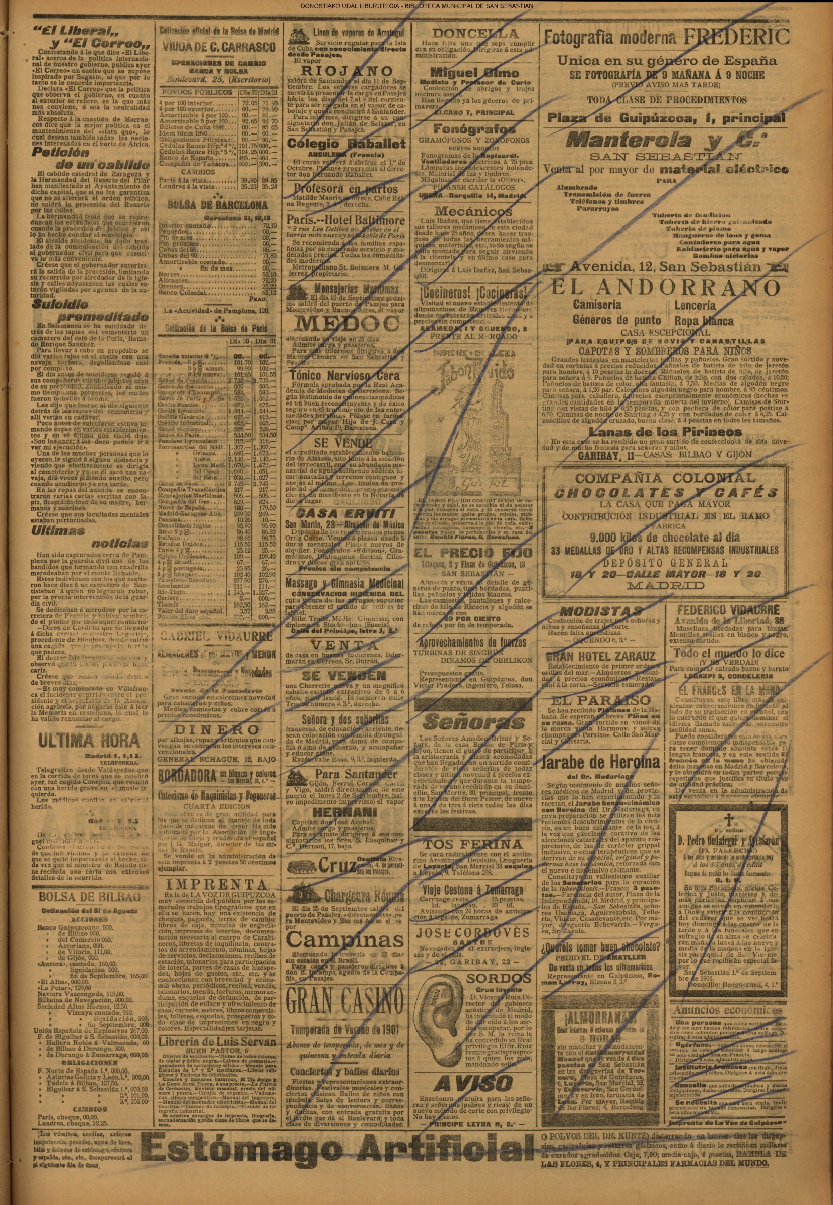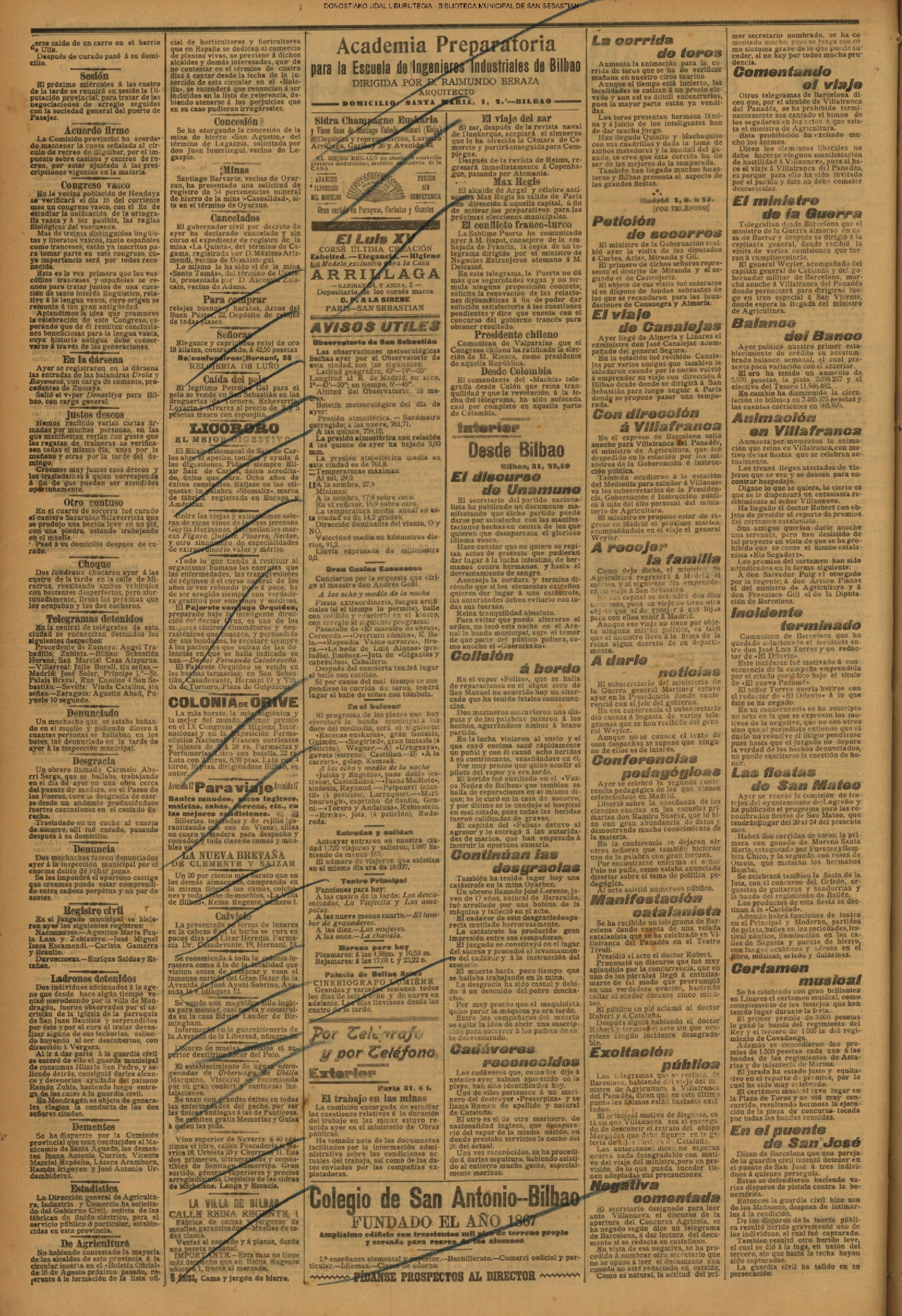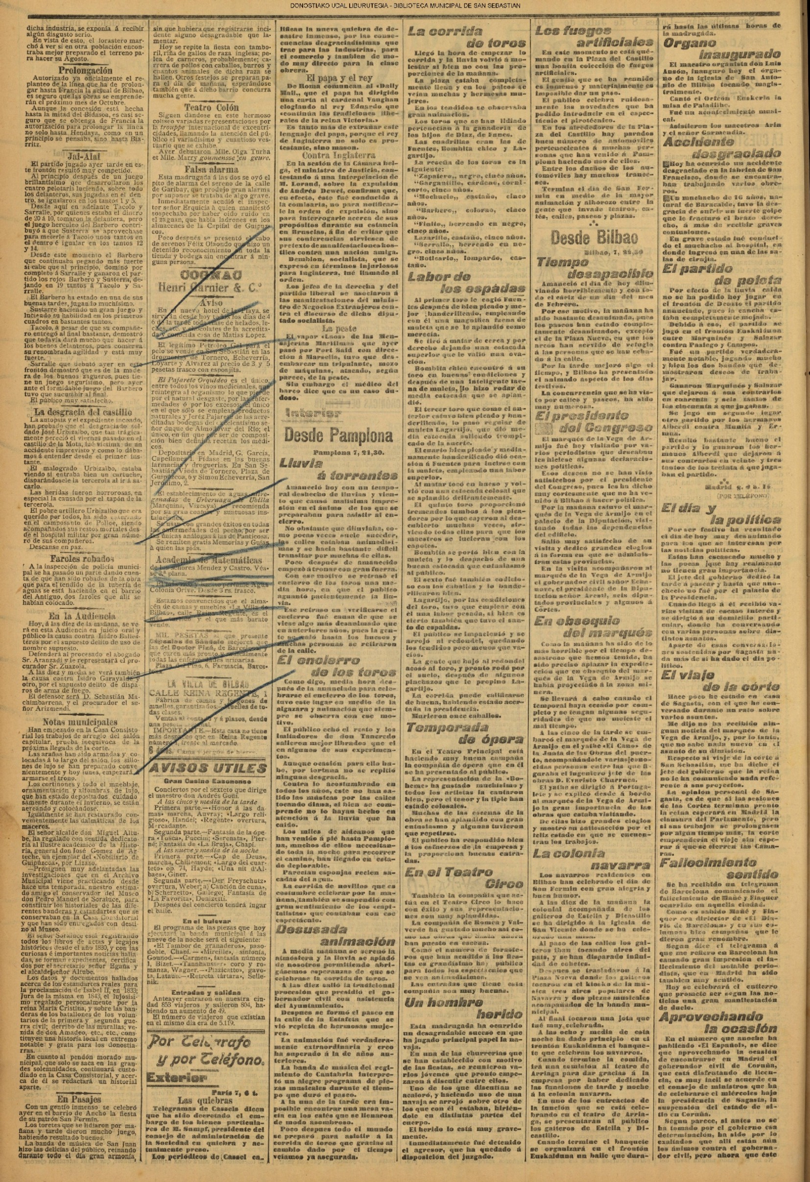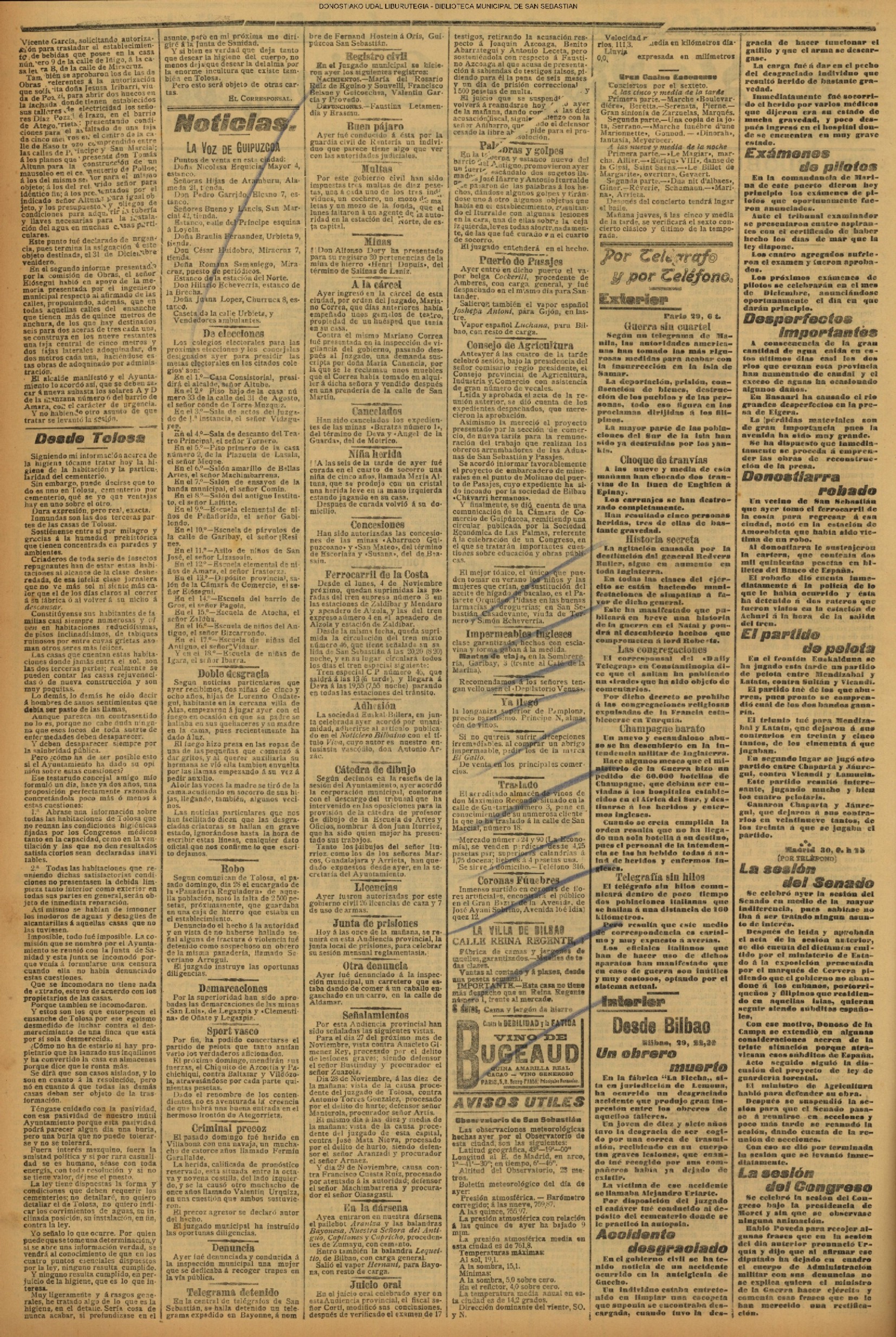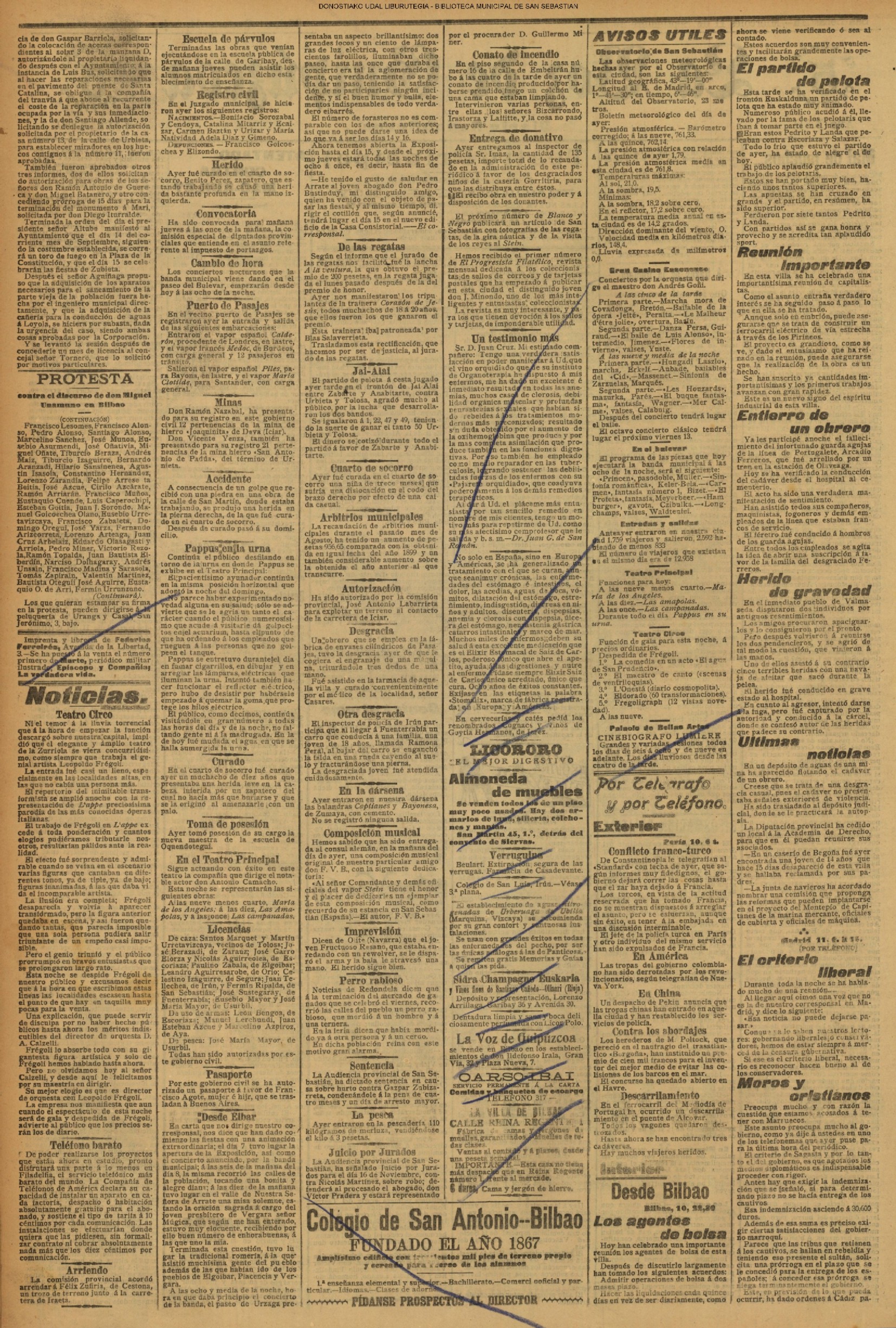 .- Nuevo Asilo de San José. En el magnifico paseo de los Fueros se está levantando el nuevo y hermoso Asilo en terrenos cedidos por el excelentísimo Ayuntamiento a la Junta de Señoras presidida por doña Desideria Petit Jean, viuda de Elosegui, que en unión de las demás señoras, y luchando con muchos inconvenientes, gracias a su constancia y amor å lacaridad, consiguieron fundar un asilo para niños pobres, que admirablemente administrado, llegó á la mayor perfección. Pero haciase demasiado reducido para las presentes necesidades el local que ocupaban, y solicitaron del excelentísimo Ayuntamiento la concesión de otro terreno más amplio, y nuestro ilustre municipio, como no podía menos, tratándose de señoras que tantos sacrificios han hecho por la doliente humanidad, el dió terreno indicado en el que van á levantar un magnífico edificio en el que quedarán satisfechas todas las necesidades y las aspiraciones propias para un establecimiento mentado según los adelantos del día. Felicitamos a las señoras que componen la referida Junta, y rogamos à Dios les conceda muchos años de salud para que con la misma solicitud y empeño puedan dedicarse á los muchos trabajos que tienen que emprender para ver coronada su obra de recibir las bendiciones de Dios y de los pobres. .- El observatorio del Mendizorrotz Gran Casino El Banco Guipuzcoano El Palacio de Justicia Notable progreso Súplica Felicitaciones