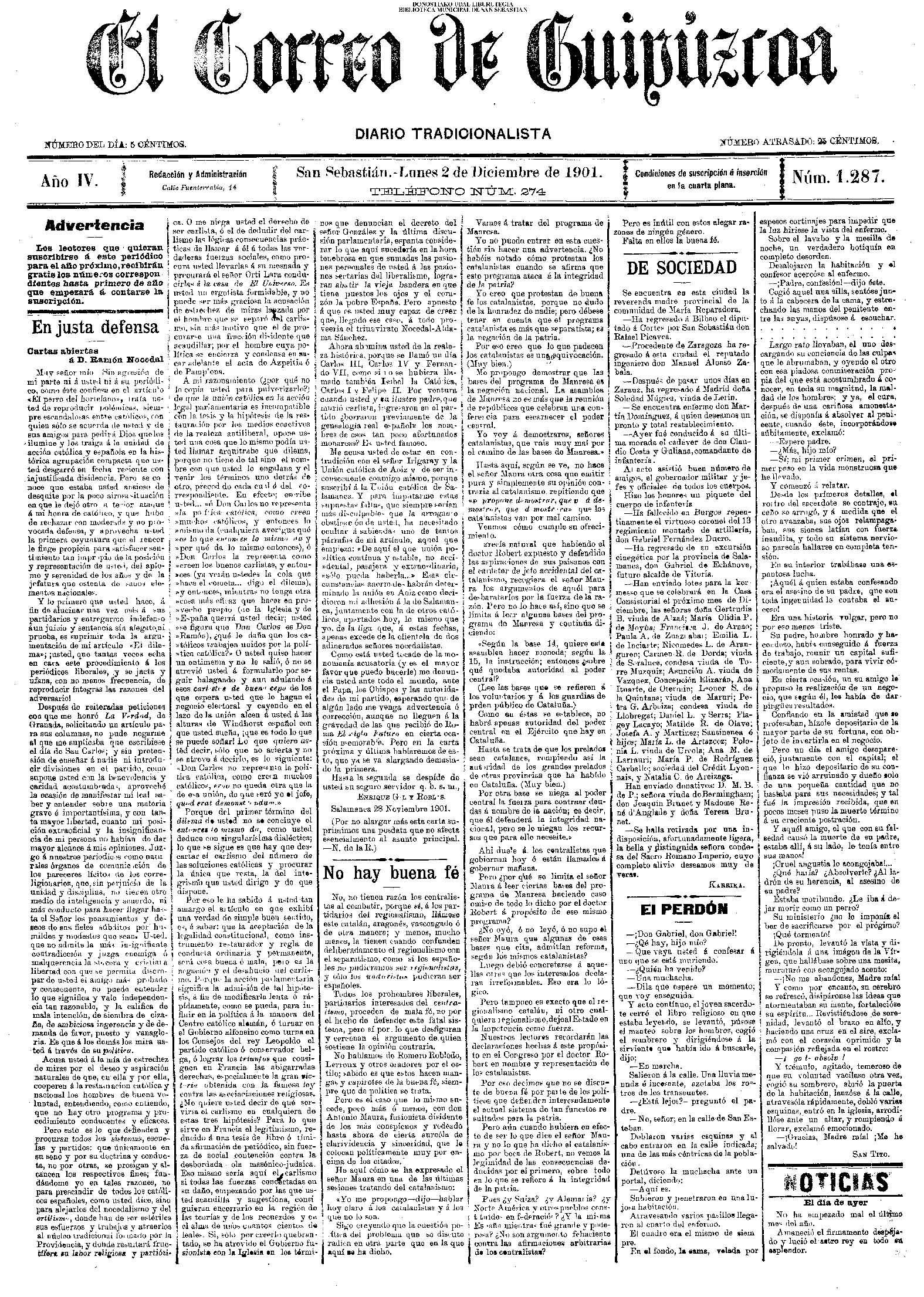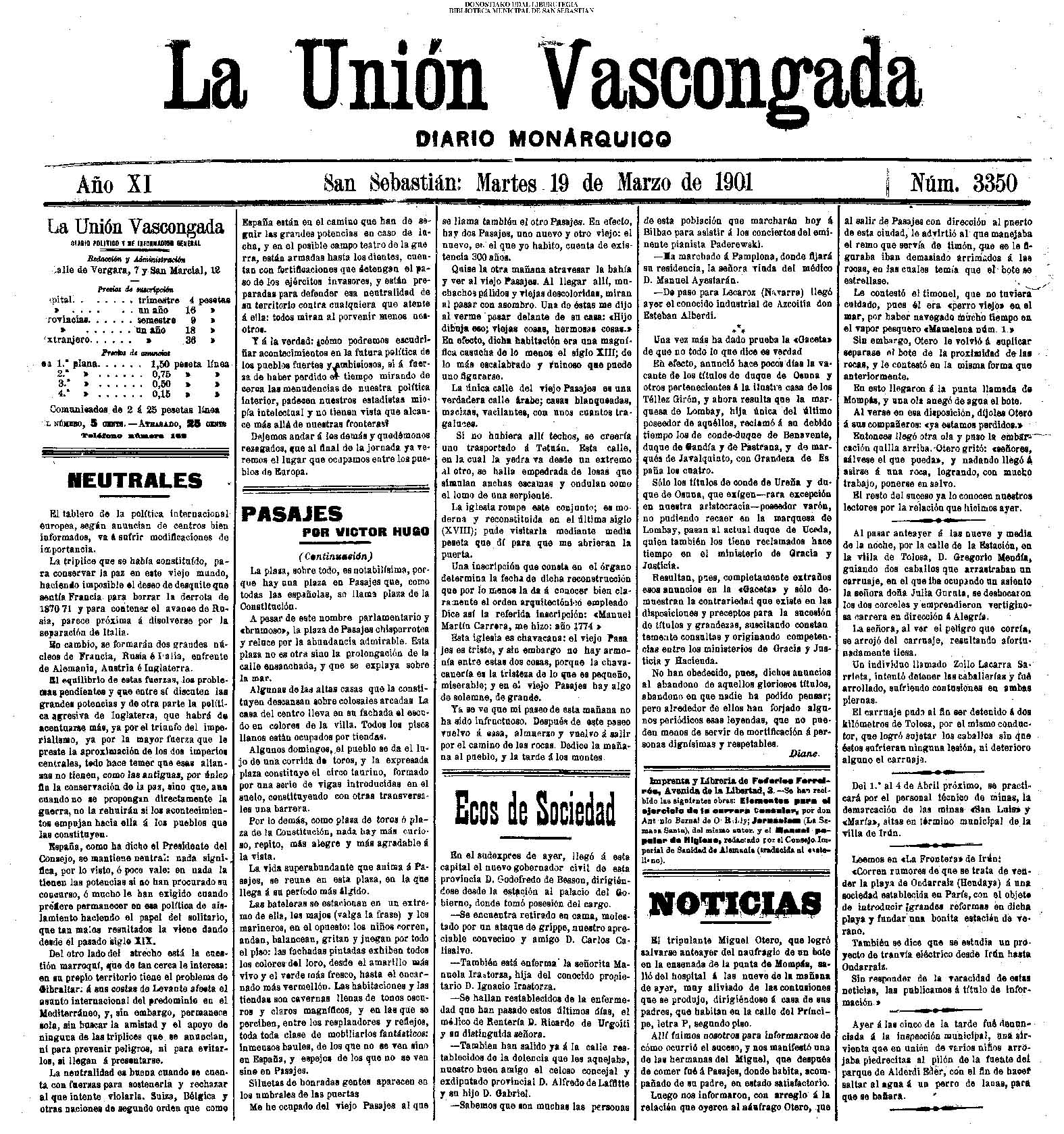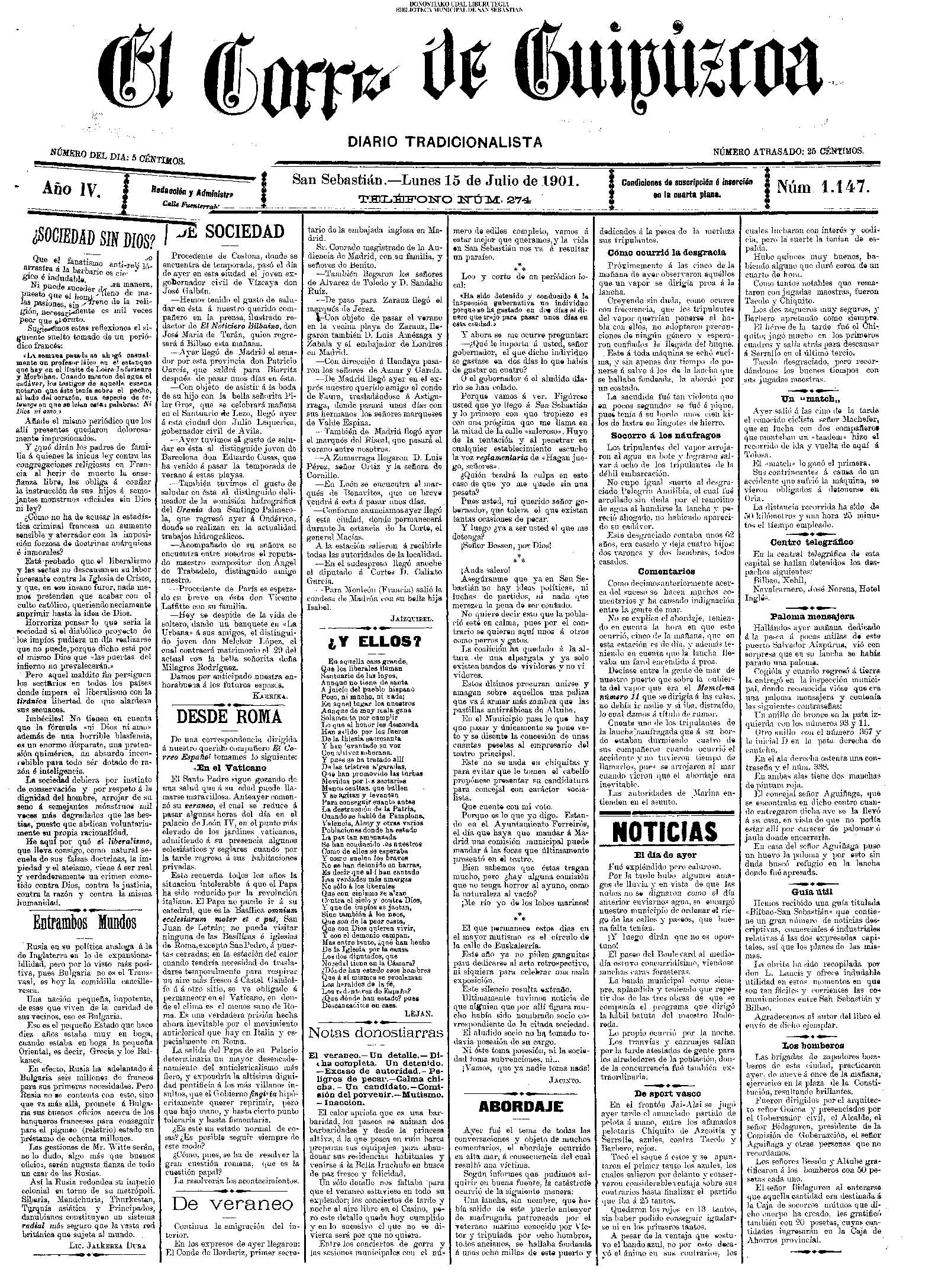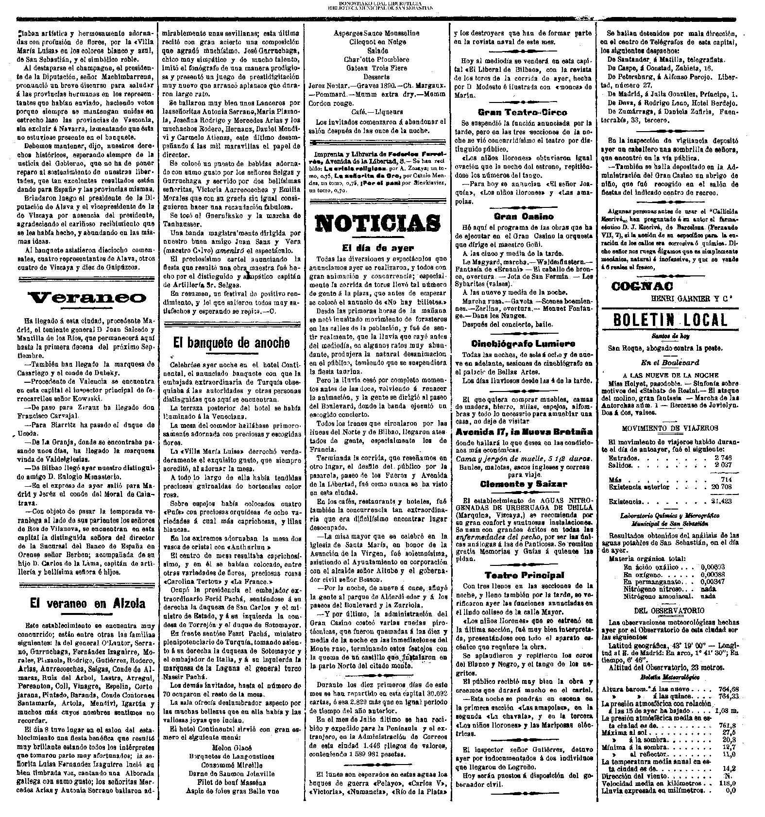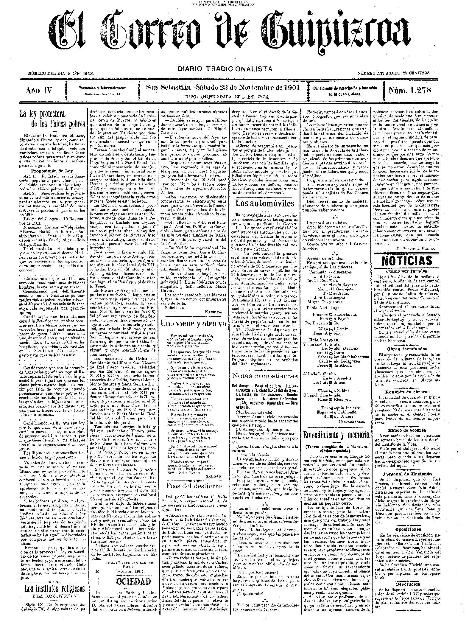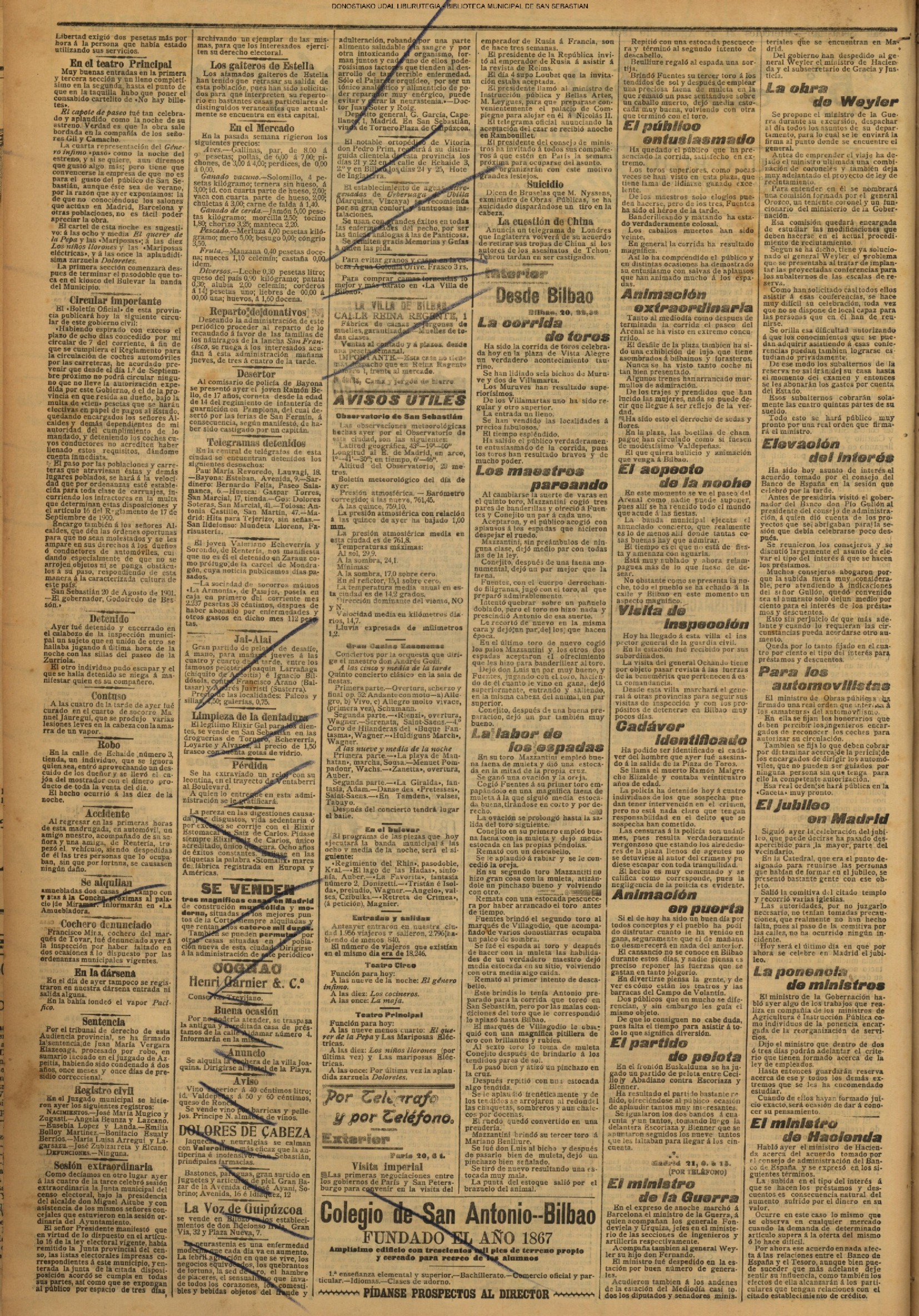 .- Nuevo Asilo de San José. En el magnifico paseo de los Fueros se está levantando el nuevo y hermoso Asilo en terrenos cedidos por el excelentísimo Ayuntamiento a la Junta de Señoras presidida por doña Desideria Petit Jean, viuda de Elosegui, que en unión de las demás señoras, y luchando con muchos inconvenientes, gracias a su constancia y amor å lacaridad, consiguieron fundar un asilo para niños pobres, que admirablemente administrado, llegó á la mayor perfección. Pero haciase demasiado reducido para las presentes necesidades el local que ocupaban, y solicitaron del excelentísimo Ayuntamiento la concesión de otro terreno más amplio, y nuestro ilustre municipio, como no podía menos, tratándose de señoras que tantos sacrificios han hecho por la doliente humanidad, el dió terreno indicado en el que van á levantar un magnífico edificio en el que quedarán satisfechas todas las necesidades y las aspiraciones propias para un establecimiento mentado según los adelantos del día. Felicitamos a las señoras que componen la referida Junta, y rogamos à Dios les conceda muchos años de salud para que con la misma solicitud y empeño puedan dedicarse á los muchos trabajos que tienen que emprender para ver coronada su obra de recibir las bendiciones de Dios y de los pobres. .- El observatorio del Mendizorrotz Gran Casino El Banco Guipuzcoano El Palacio de Justicia Notable progreso Súplica Felicitaciones