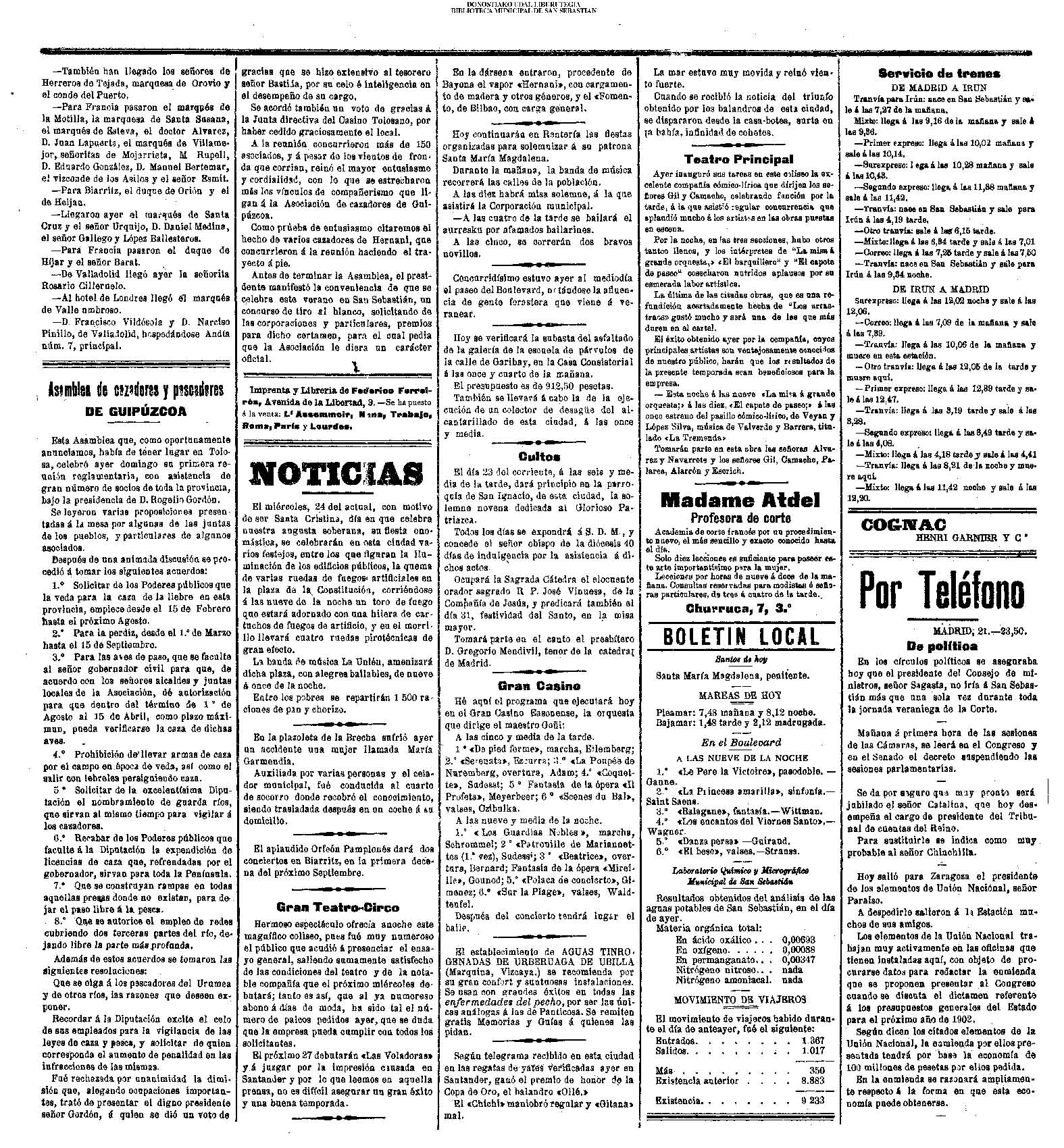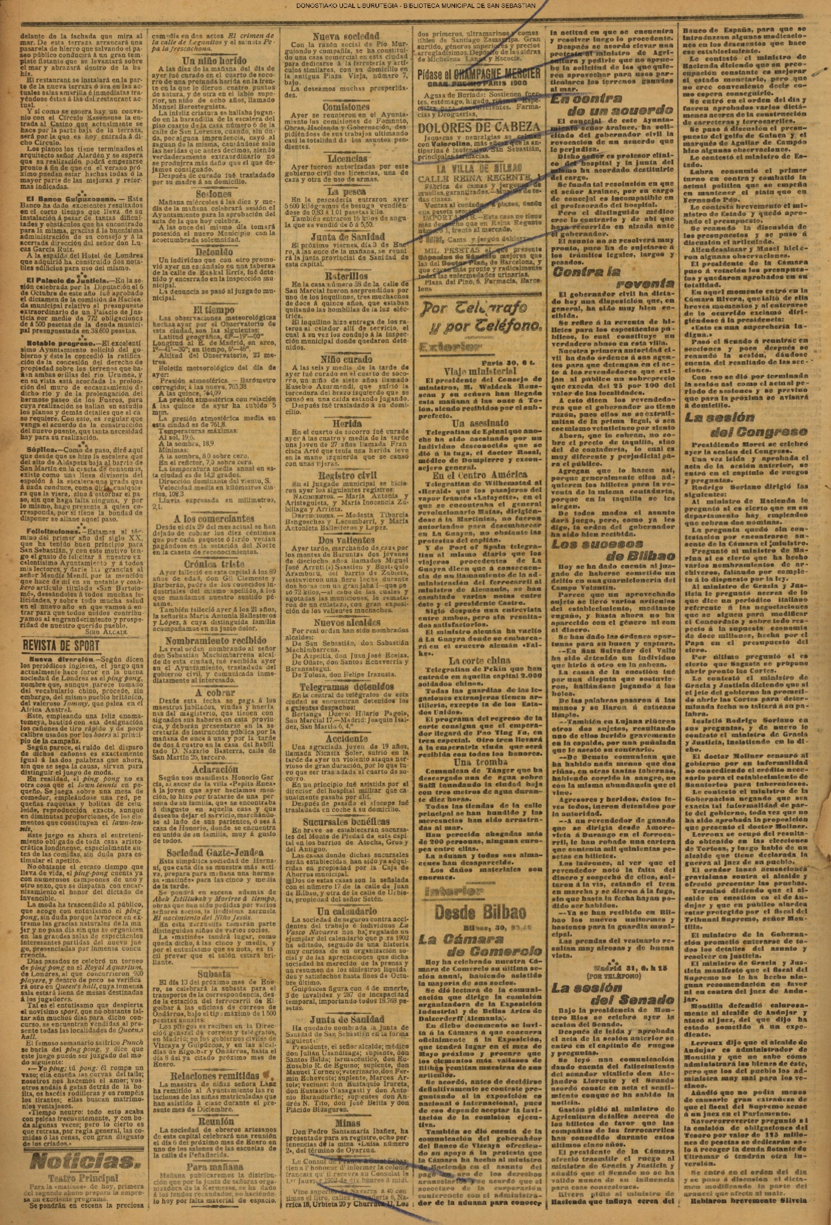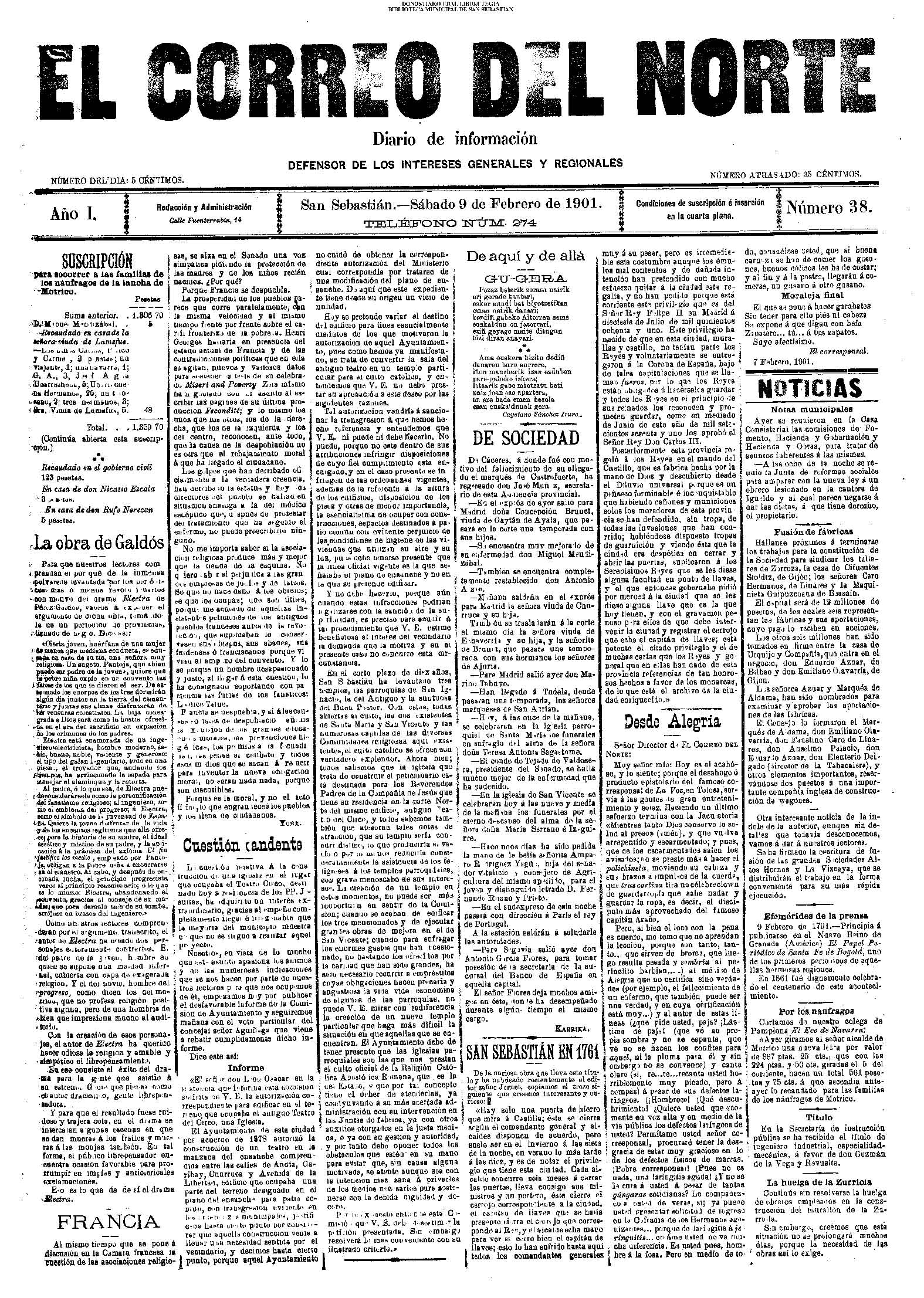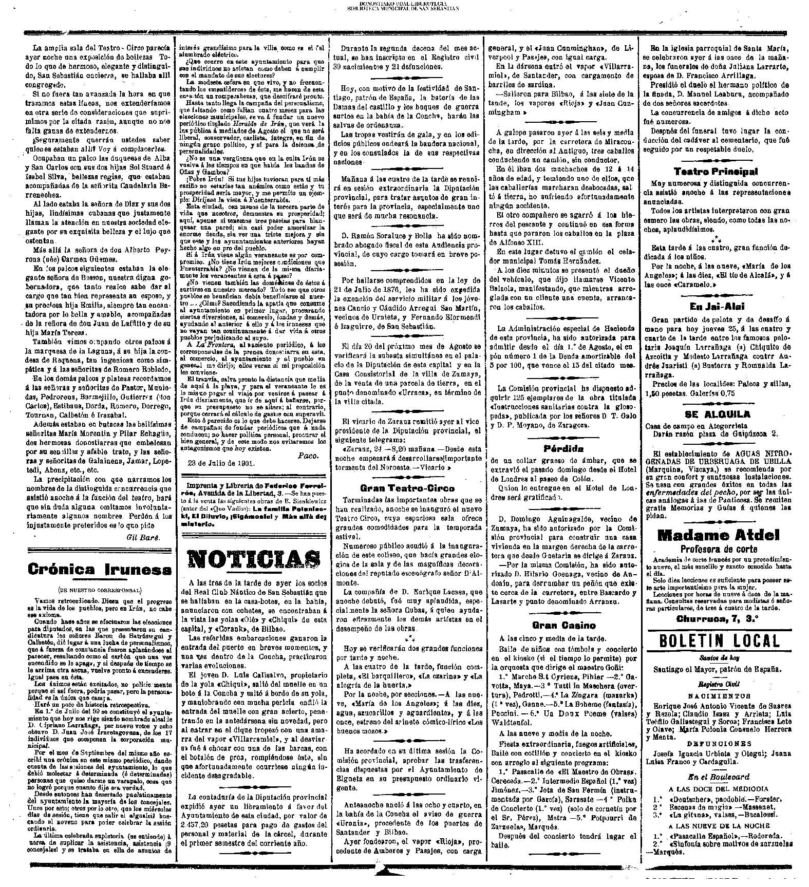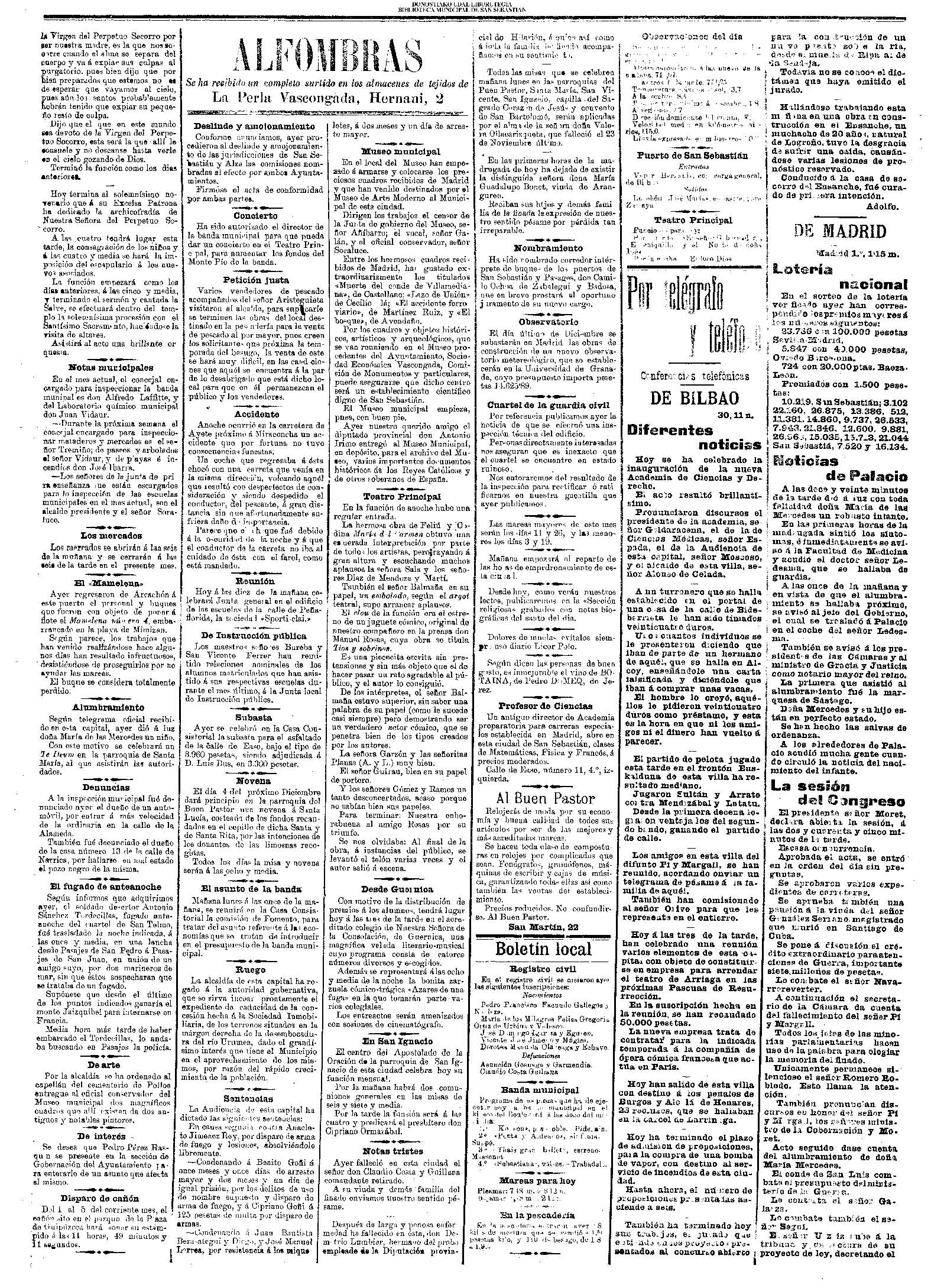 .- Nuevo Asilo de San José. En el magnifico paseo de los Fueros se está levantando el nuevo y hermoso Asilo en terrenos cedidos por el excelentísimo Ayuntamiento a la Junta de Señoras presidida por doña Desideria Petit Jean, viuda de Elosegui, que en unión de las demás señoras, y luchando con muchos inconvenientes, gracias a su constancia y amor å lacaridad, consiguieron fundar un asilo para niños pobres, que admirablemente administrado, llegó á la mayor perfección. Pero haciase demasiado reducido para las presentes necesidades el local que ocupaban, y solicitaron del excelentísimo Ayuntamiento la concesión de otro terreno más amplio, y nuestro ilustre municipio, como no podía menos, tratándose de señoras que tantos sacrificios han hecho por la doliente humanidad, el dió terreno indicado en el que van á levantar un magnífico edificio en el que quedarán satisfechas todas las necesidades y las aspiraciones propias para un establecimiento mentado según los adelantos del día. Felicitamos a las señoras que componen la referida Junta, y rogamos à Dios les conceda muchos años de salud para que con la misma solicitud y empeño puedan dedicarse á los muchos trabajos que tienen que emprender para ver coronada su obra de recibir las bendiciones de Dios y de los pobres. .- El observatorio del Mendizorrotz Gran Casino El Banco Guipuzcoano El Palacio de Justicia Notable progreso Súplica Felicitaciones