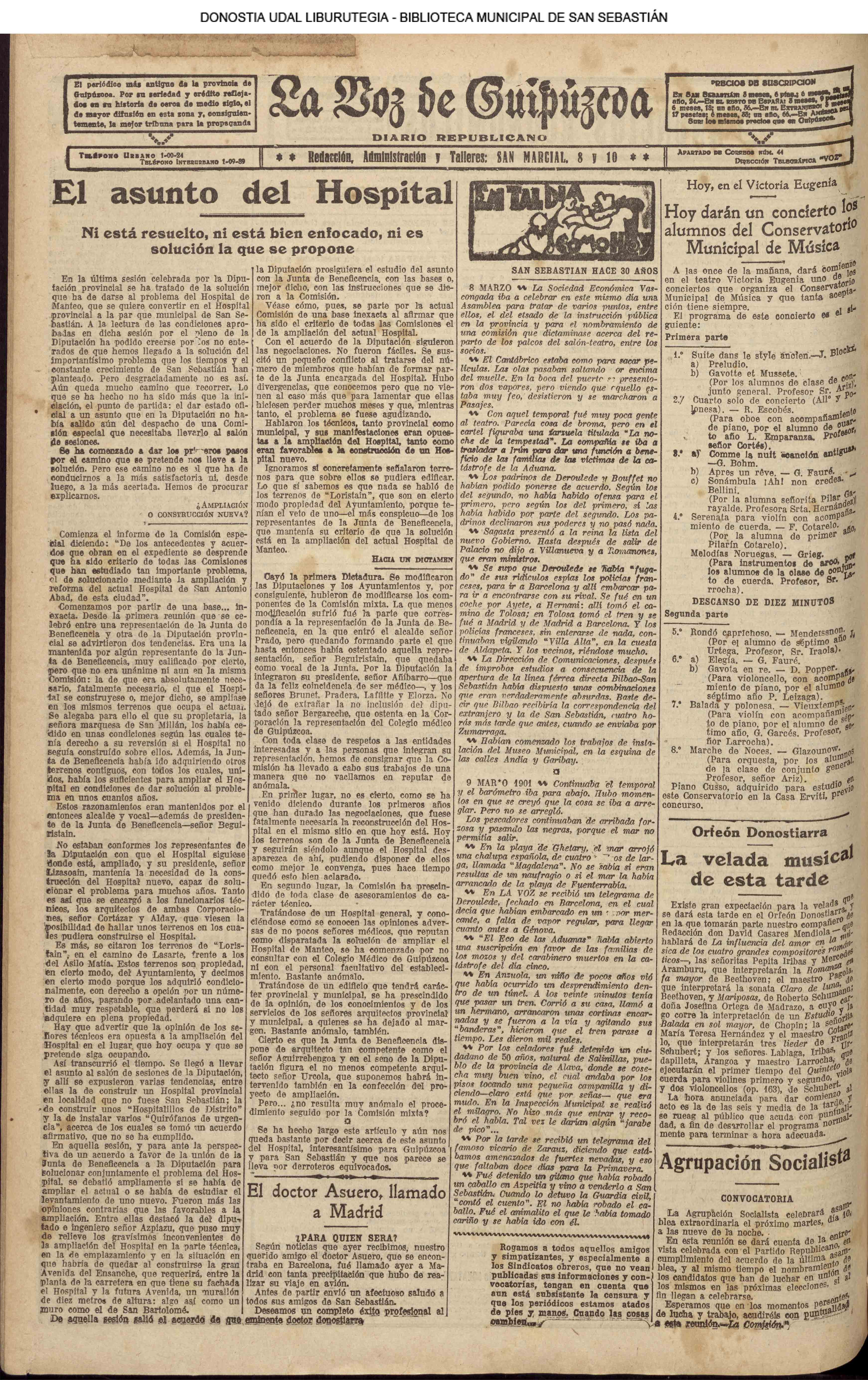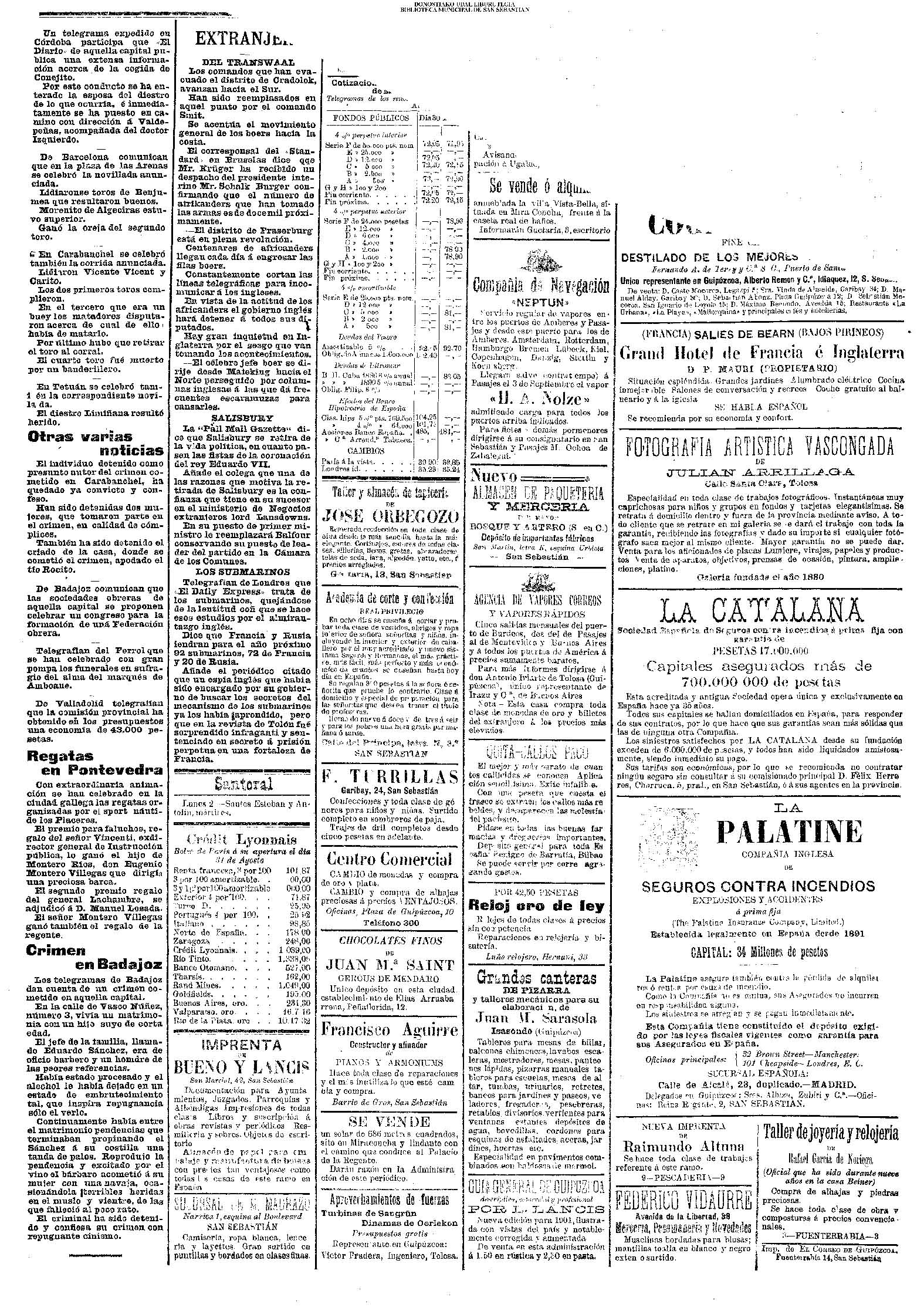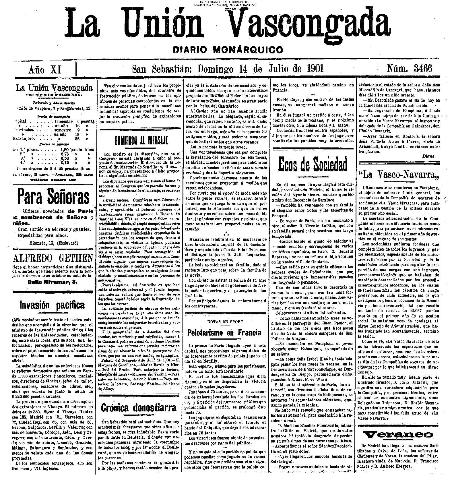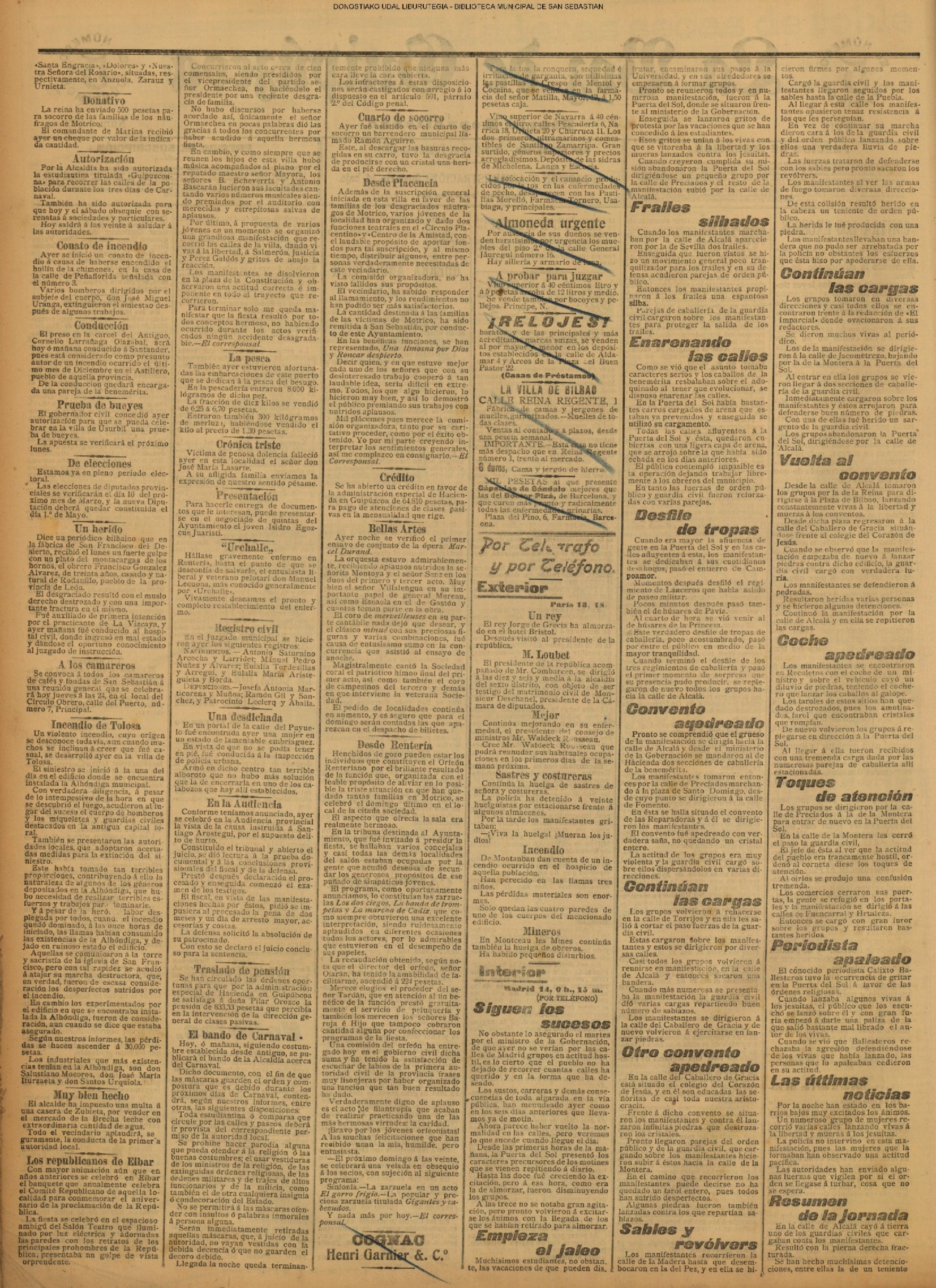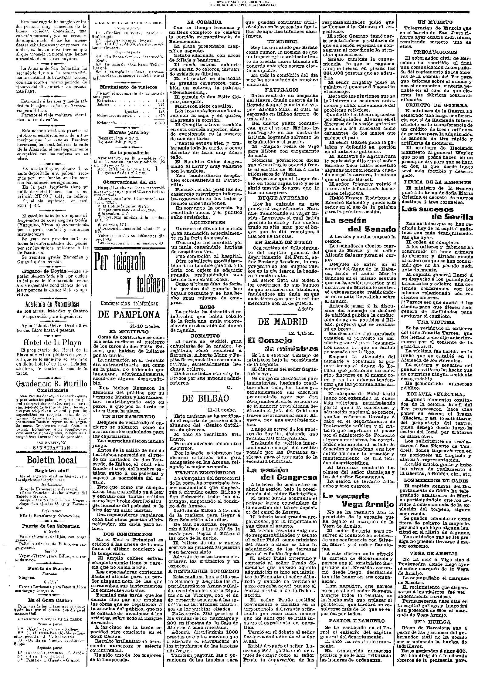 .- Nuevo Asilo de San José. En el magnifico paseo de los Fueros se está levantando el nuevo y hermoso Asilo en terrenos cedidos por el excelentísimo Ayuntamiento a la Junta de Señoras presidida por doña Desideria Petit Jean, viuda de Elosegui, que en unión de las demás señoras, y luchando con muchos inconvenientes, gracias a su constancia y amor å lacaridad, consiguieron fundar un asilo para niños pobres, que admirablemente administrado, llegó á la mayor perfección. Pero haciase demasiado reducido para las presentes necesidades el local que ocupaban, y solicitaron del excelentísimo Ayuntamiento la concesión de otro terreno más amplio, y nuestro ilustre municipio, como no podía menos, tratándose de señoras que tantos sacrificios han hecho por la doliente humanidad, el dió terreno indicado en el que van á levantar un magnífico edificio en el que quedarán satisfechas todas las necesidades y las aspiraciones propias para un establecimiento mentado según los adelantos del día. Felicitamos a las señoras que componen la referida Junta, y rogamos à Dios les conceda muchos años de salud para que con la misma solicitud y empeño puedan dedicarse á los muchos trabajos que tienen que emprender para ver coronada su obra de recibir las bendiciones de Dios y de los pobres. .- El observatorio del Mendizorrotz Gran Casino El Banco Guipuzcoano El Palacio de Justicia Notable progreso Súplica Felicitaciones