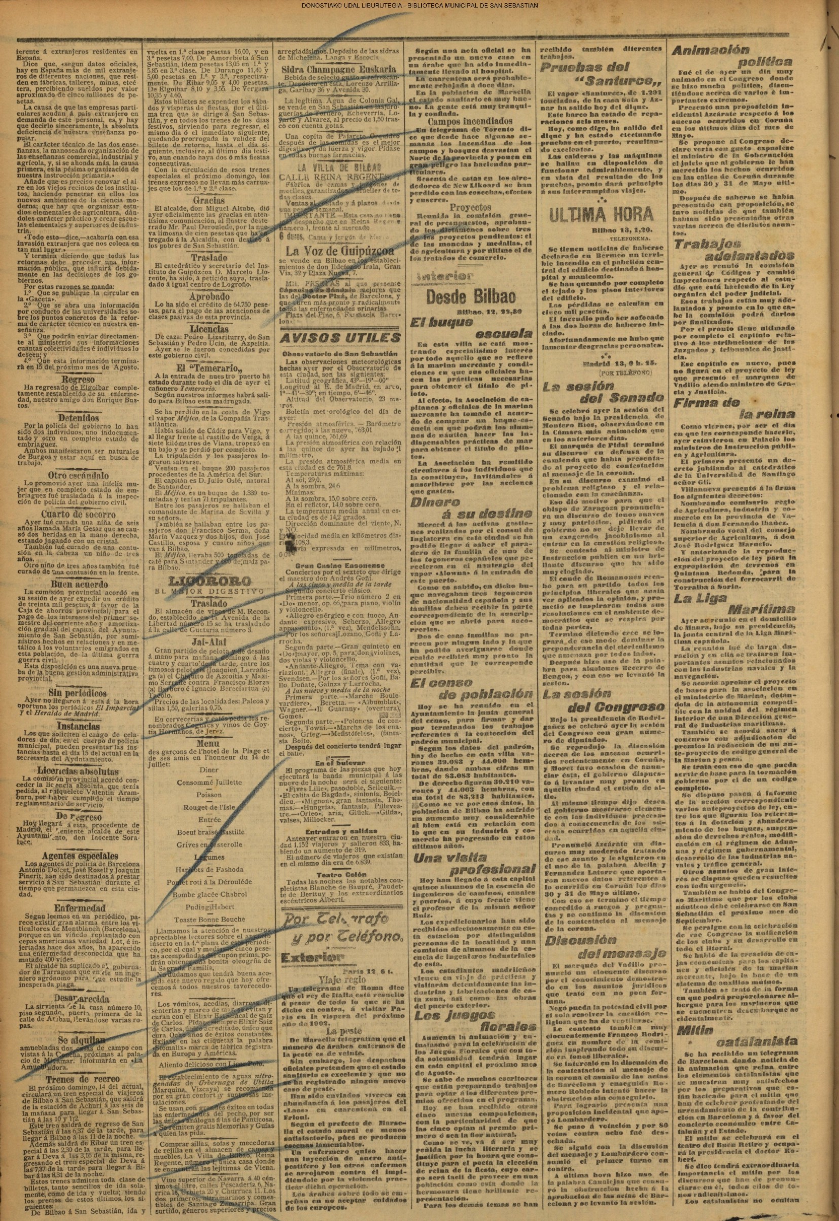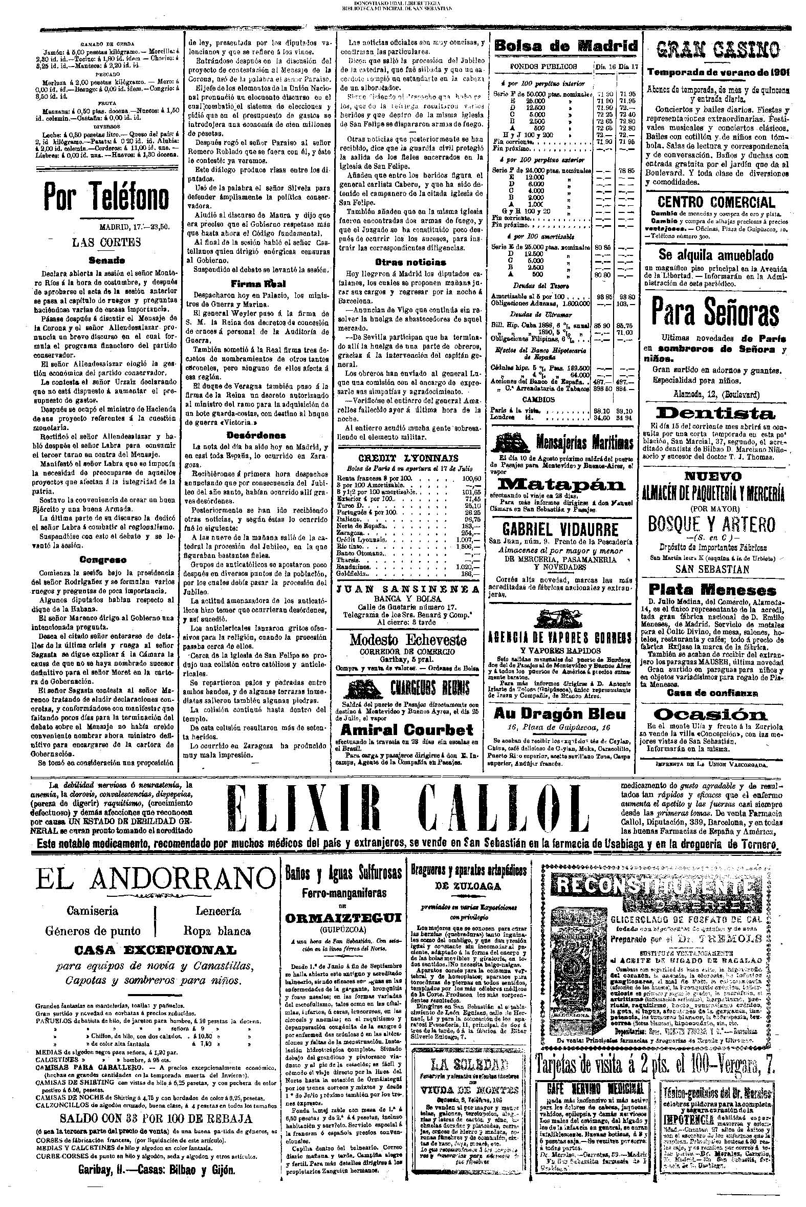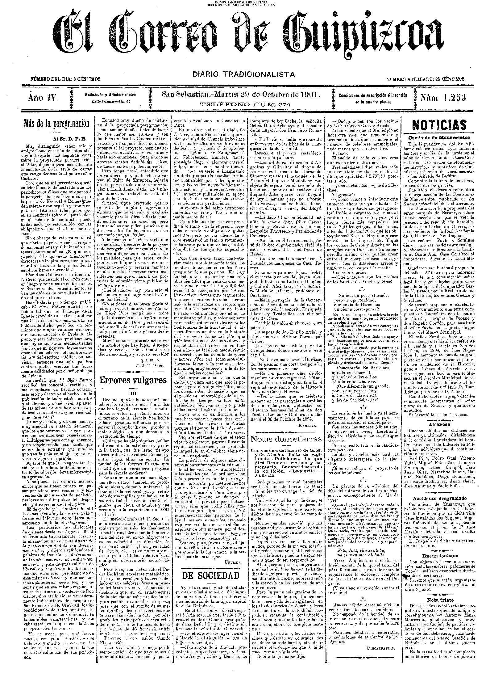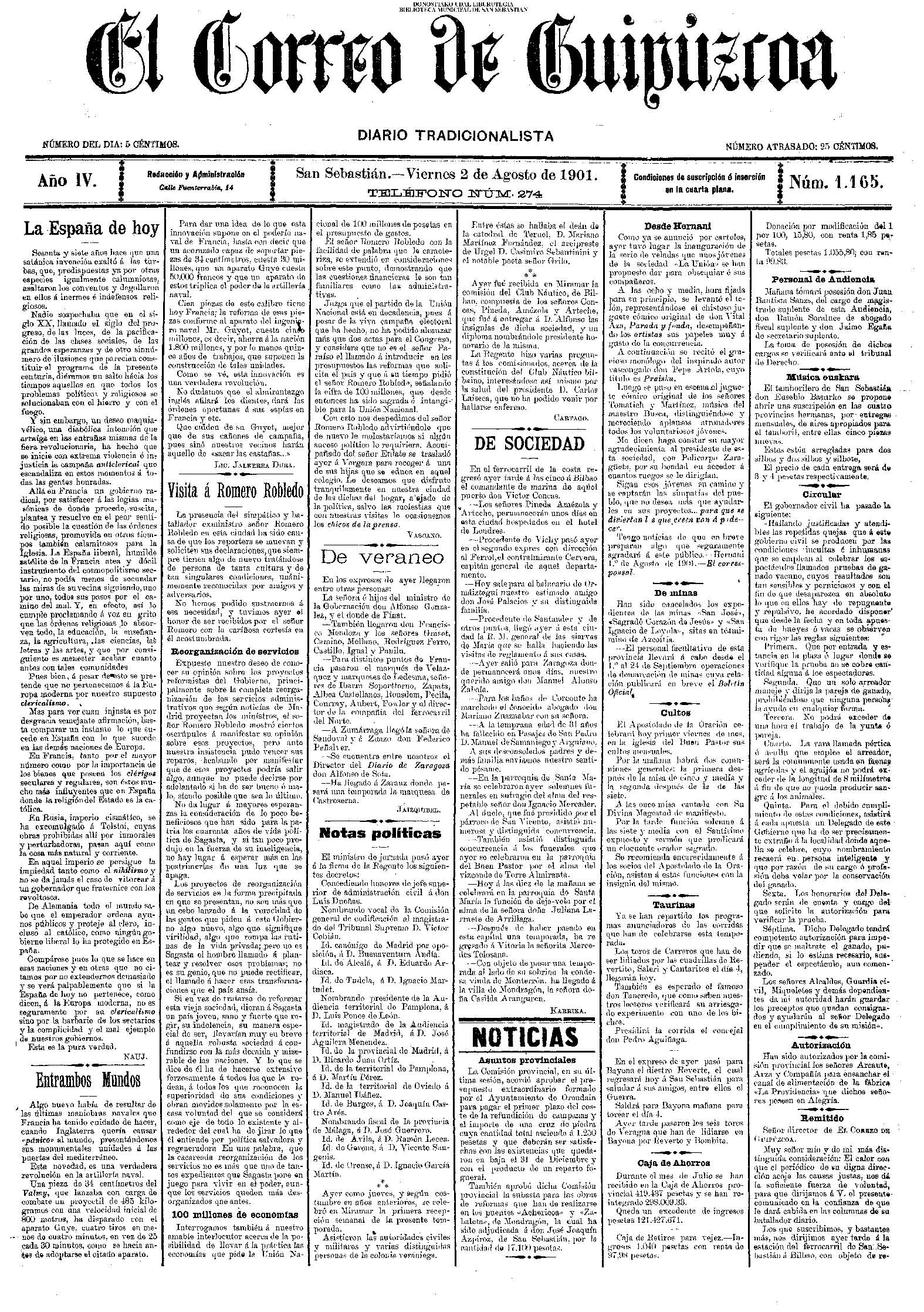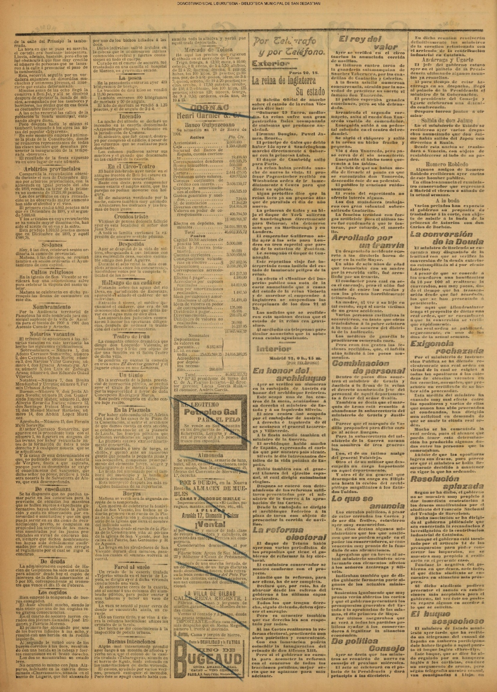 .- Nuevo Asilo de San José. En el magnifico paseo de los Fueros se está levantando el nuevo y hermoso Asilo en terrenos cedidos por el excelentísimo Ayuntamiento a la Junta de Señoras presidida por doña Desideria Petit Jean, viuda de Elosegui, que en unión de las demás señoras, y luchando con muchos inconvenientes, gracias a su constancia y amor å lacaridad, consiguieron fundar un asilo para niños pobres, que admirablemente administrado, llegó á la mayor perfección. Pero haciase demasiado reducido para las presentes necesidades el local que ocupaban, y solicitaron del excelentísimo Ayuntamiento la concesión de otro terreno más amplio, y nuestro ilustre municipio, como no podía menos, tratándose de señoras que tantos sacrificios han hecho por la doliente humanidad, el dió terreno indicado en el que van á levantar un magnífico edificio en el que quedarán satisfechas todas las necesidades y las aspiraciones propias para un establecimiento mentado según los adelantos del día. Felicitamos a las señoras que componen la referida Junta, y rogamos à Dios les conceda muchos años de salud para que con la misma solicitud y empeño puedan dedicarse á los muchos trabajos que tienen que emprender para ver coronada su obra de recibir las bendiciones de Dios y de los pobres. .- El observatorio del Mendizorrotz Gran Casino El Banco Guipuzcoano El Palacio de Justicia Notable progreso Súplica Felicitaciones