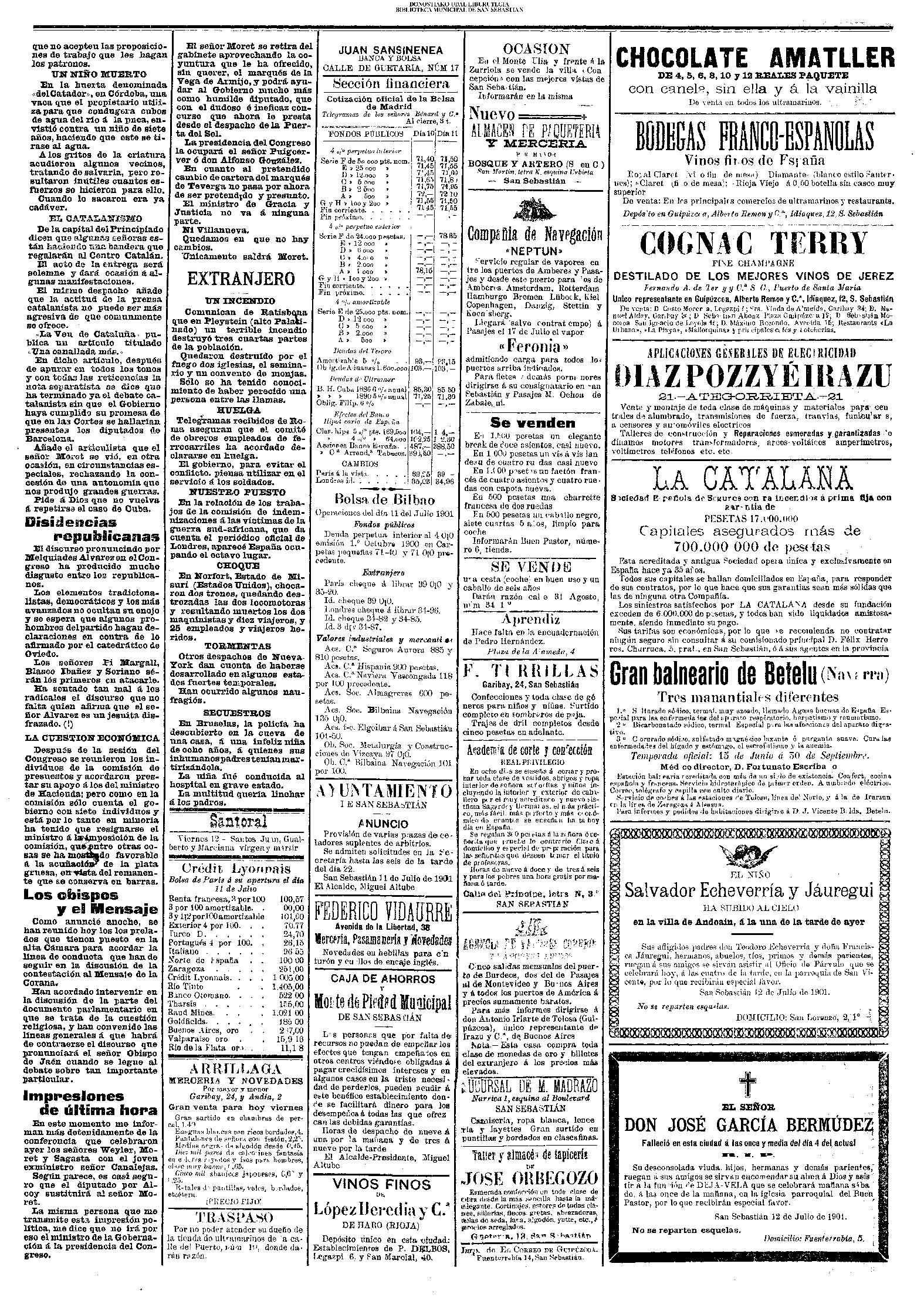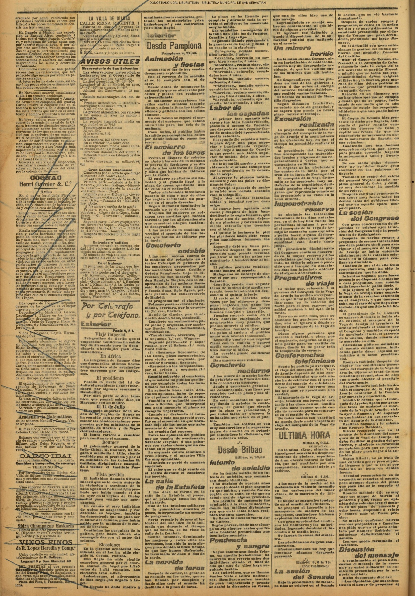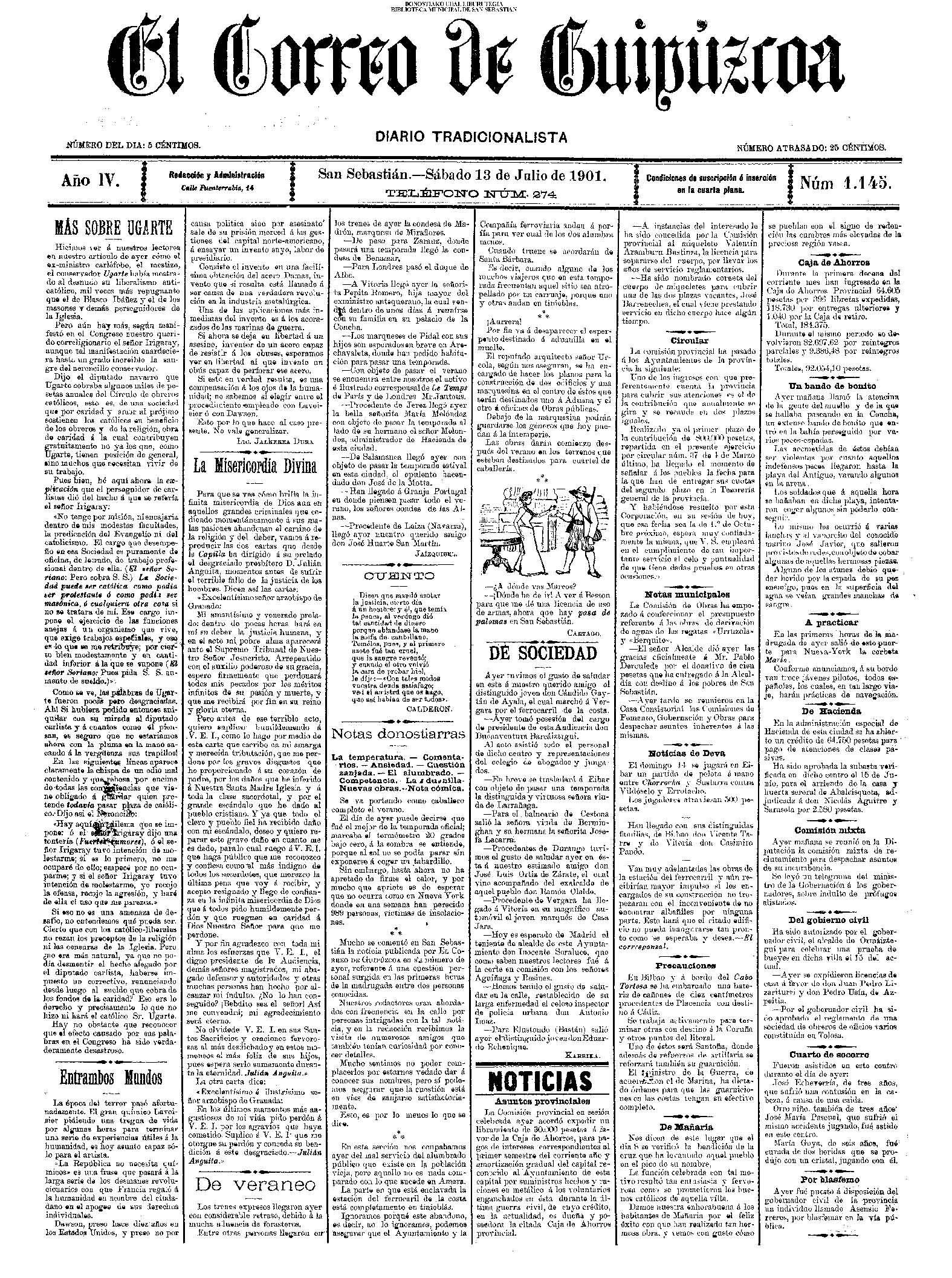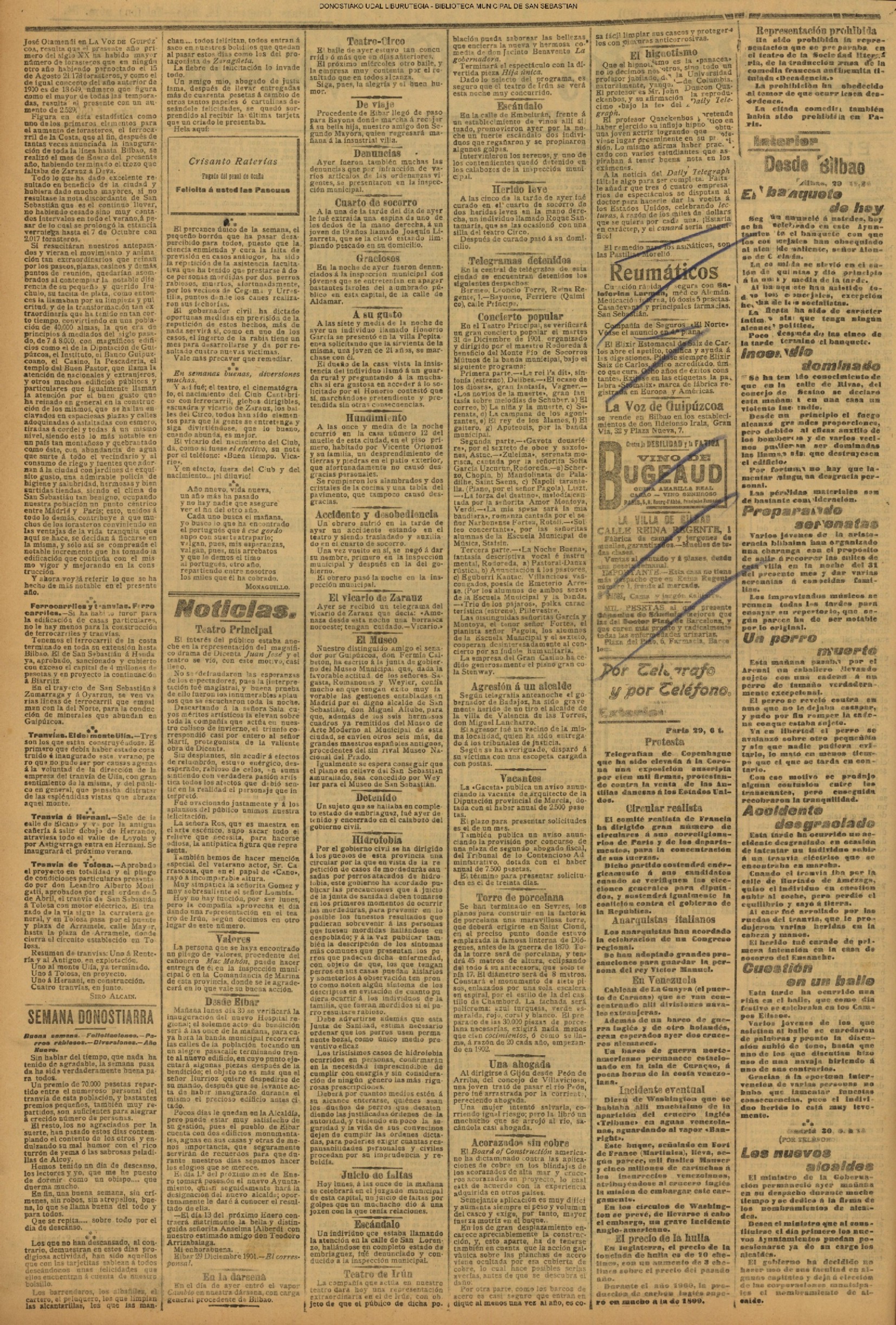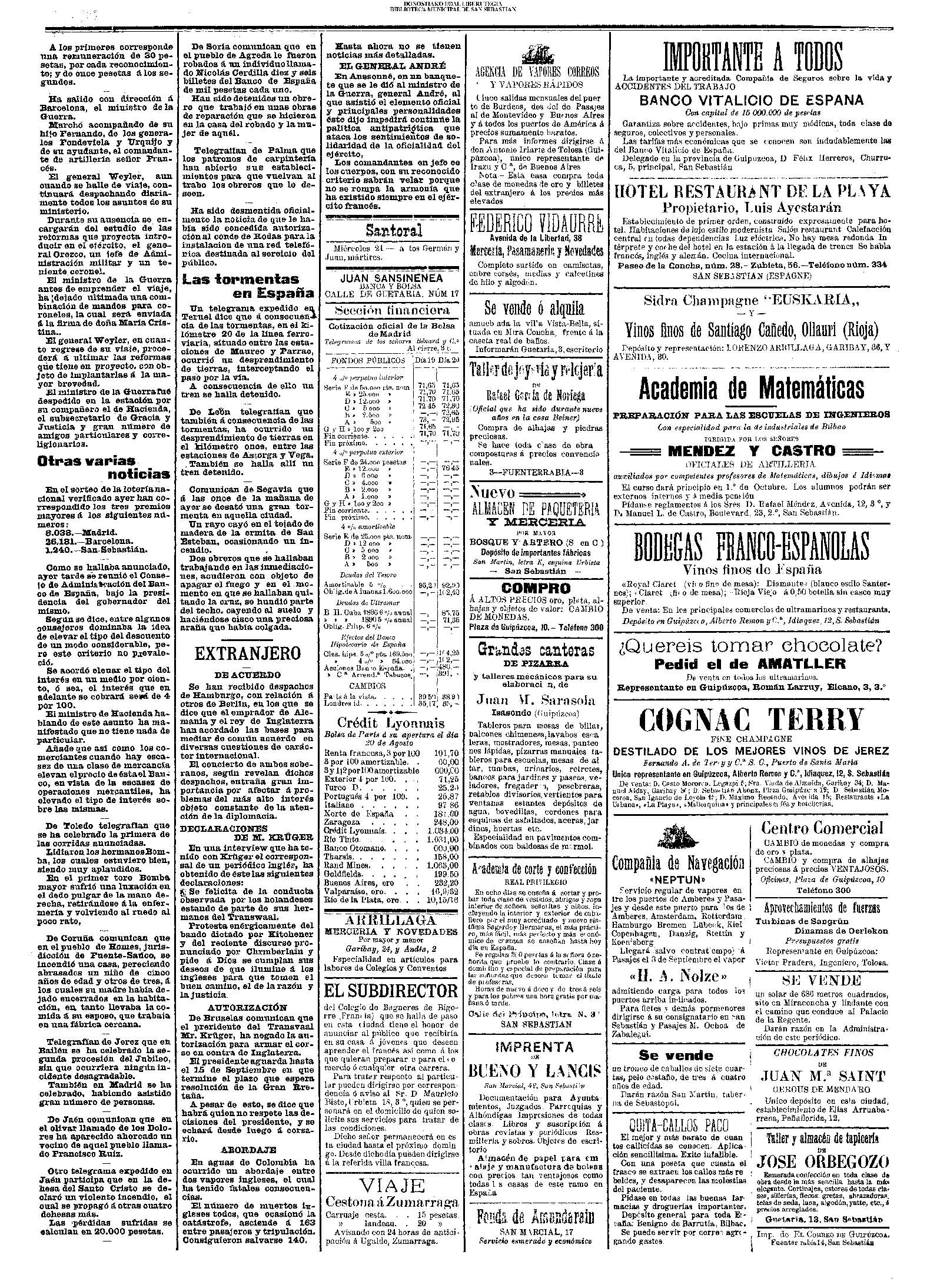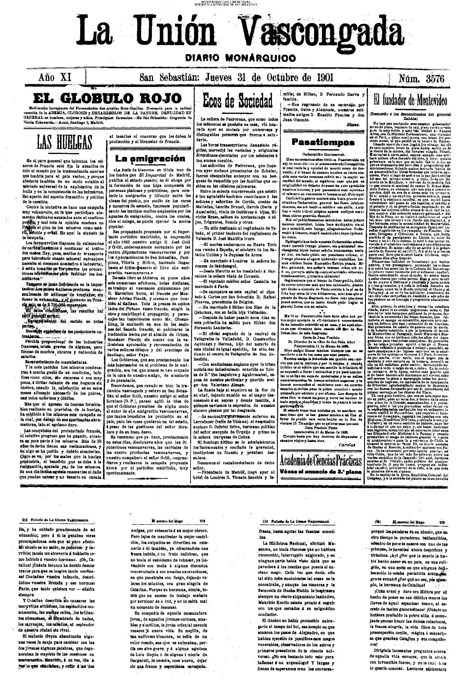 .- Nuevo Asilo de San José. En el magnifico paseo de los Fueros se está levantando el nuevo y hermoso Asilo en terrenos cedidos por el excelentísimo Ayuntamiento a la Junta de Señoras presidida por doña Desideria Petit Jean, viuda de Elosegui, que en unión de las demás señoras, y luchando con muchos inconvenientes, gracias a su constancia y amor å lacaridad, consiguieron fundar un asilo para niños pobres, que admirablemente administrado, llegó á la mayor perfección. Pero haciase demasiado reducido para las presentes necesidades el local que ocupaban, y solicitaron del excelentísimo Ayuntamiento la concesión de otro terreno más amplio, y nuestro ilustre municipio, como no podía menos, tratándose de señoras que tantos sacrificios han hecho por la doliente humanidad, el dió terreno indicado en el que van á levantar un magnífico edificio en el que quedarán satisfechas todas las necesidades y las aspiraciones propias para un establecimiento mentado según los adelantos del día. Felicitamos a las señoras que componen la referida Junta, y rogamos à Dios les conceda muchos años de salud para que con la misma solicitud y empeño puedan dedicarse á los muchos trabajos que tienen que emprender para ver coronada su obra de recibir las bendiciones de Dios y de los pobres. .- El observatorio del Mendizorrotz Gran Casino El Banco Guipuzcoano El Palacio de Justicia Notable progreso Súplica Felicitaciones