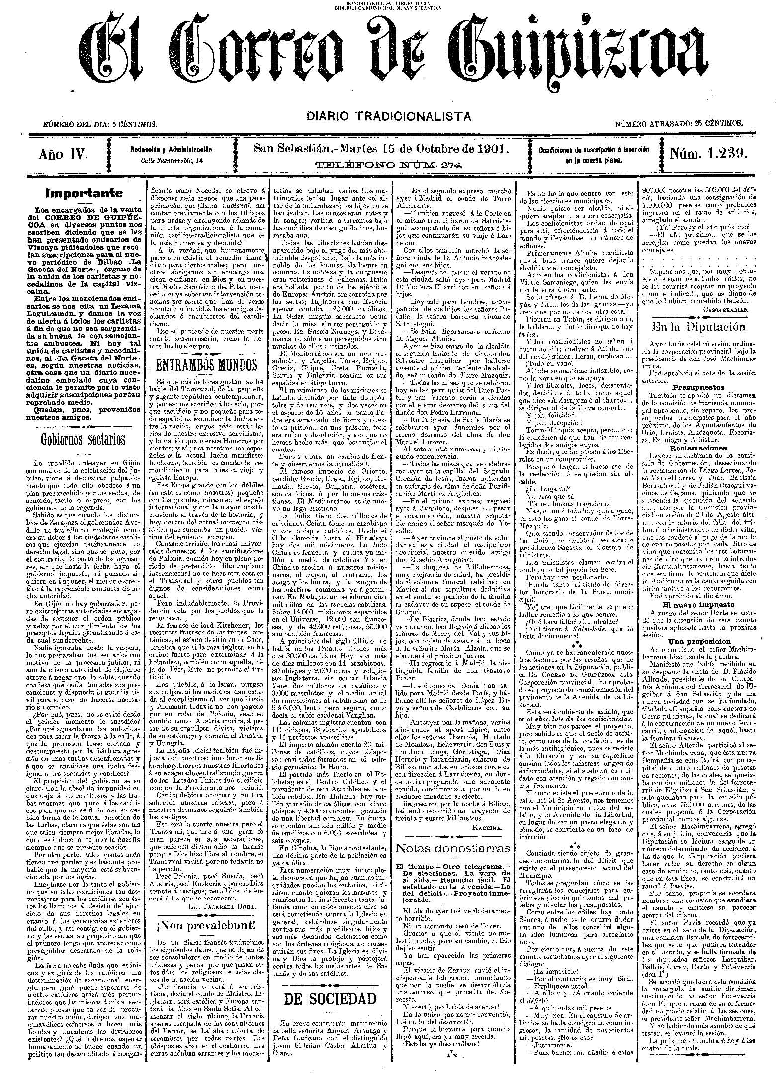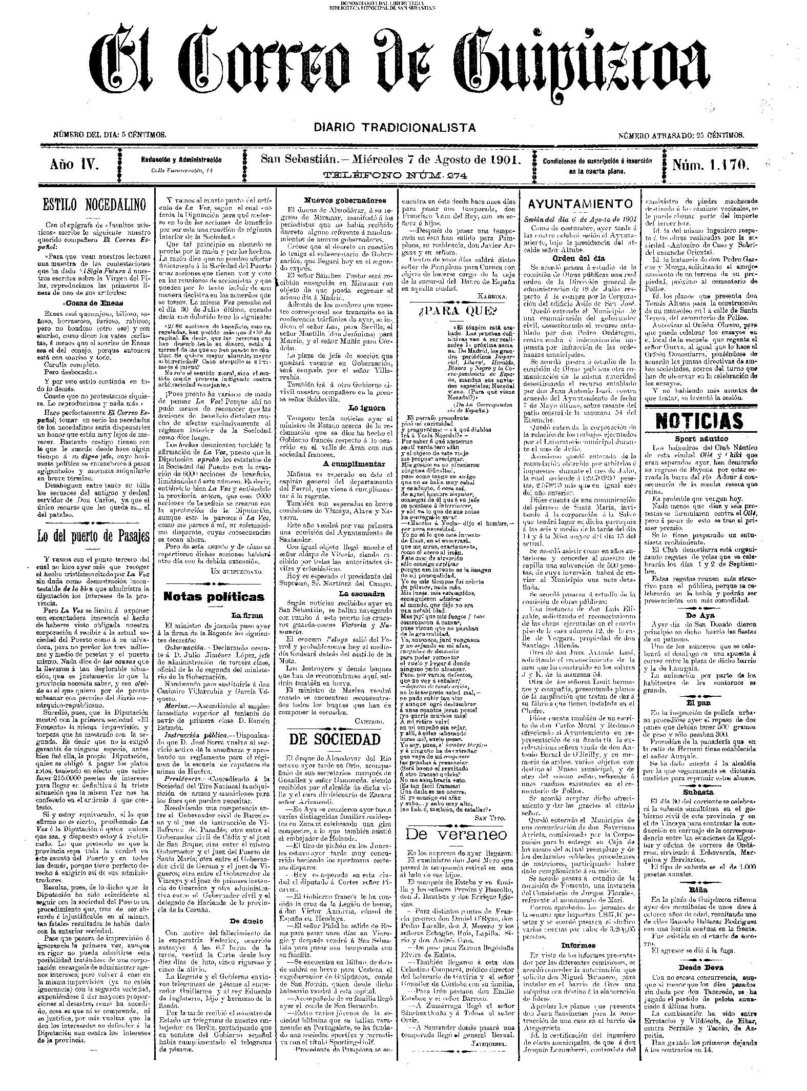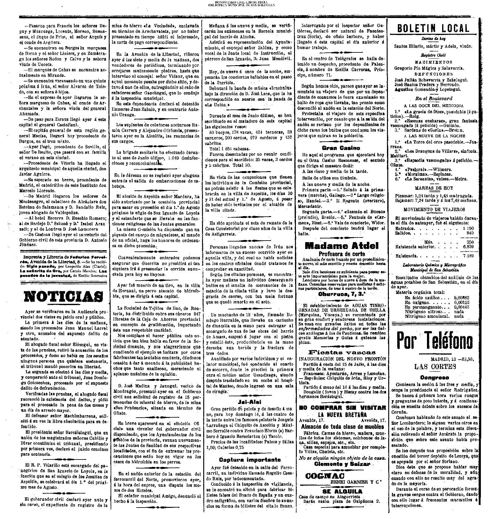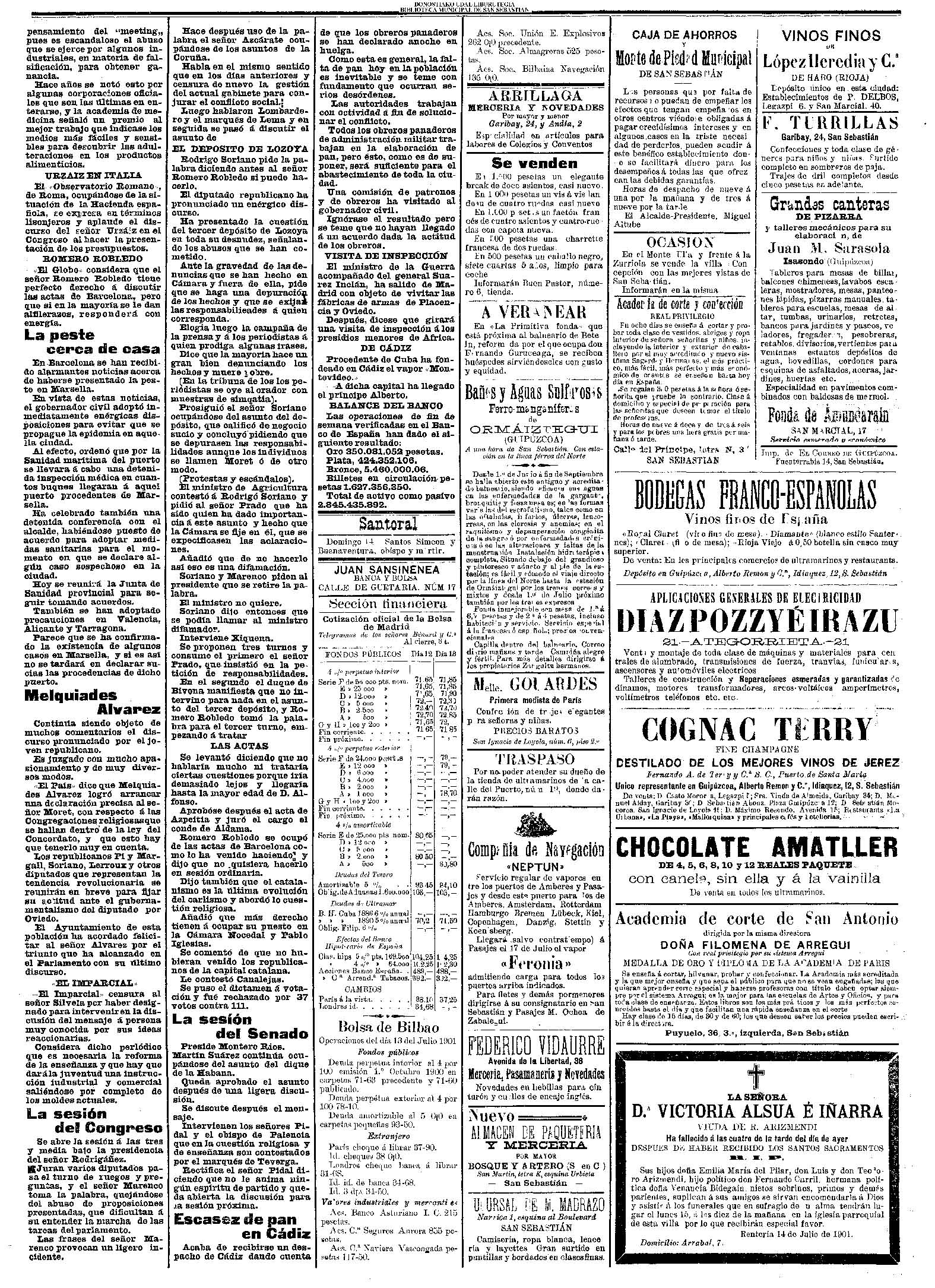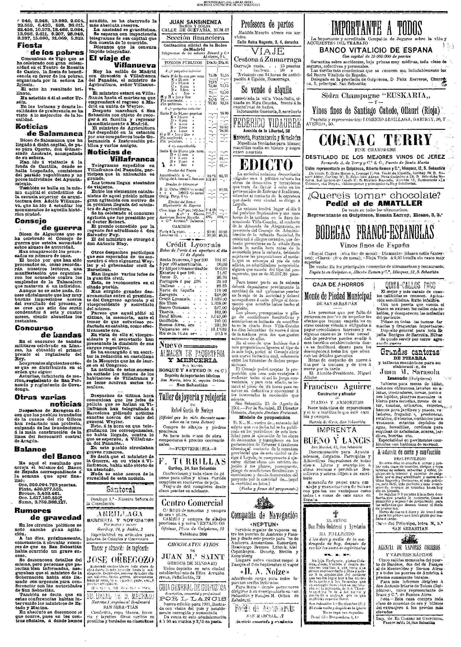 .- Nuevo Asilo de San José. En el magnifico paseo de los Fueros se está levantando el nuevo y hermoso Asilo en terrenos cedidos por el excelentísimo Ayuntamiento a la Junta de Señoras presidida por doña Desideria Petit Jean, viuda de Elosegui, que en unión de las demás señoras, y luchando con muchos inconvenientes, gracias a su constancia y amor å lacaridad, consiguieron fundar un asilo para niños pobres, que admirablemente administrado, llegó á la mayor perfección. Pero haciase demasiado reducido para las presentes necesidades el local que ocupaban, y solicitaron del excelentísimo Ayuntamiento la concesión de otro terreno más amplio, y nuestro ilustre municipio, como no podía menos, tratándose de señoras que tantos sacrificios han hecho por la doliente humanidad, el dió terreno indicado en el que van á levantar un magnífico edificio en el que quedarán satisfechas todas las necesidades y las aspiraciones propias para un establecimiento mentado según los adelantos del día. Felicitamos a las señoras que componen la referida Junta, y rogamos à Dios les conceda muchos años de salud para que con la misma solicitud y empeño puedan dedicarse á los muchos trabajos que tienen que emprender para ver coronada su obra de recibir las bendiciones de Dios y de los pobres. .- El observatorio del Mendizorrotz Gran Casino El Banco Guipuzcoano El Palacio de Justicia Notable progreso Súplica Felicitaciones