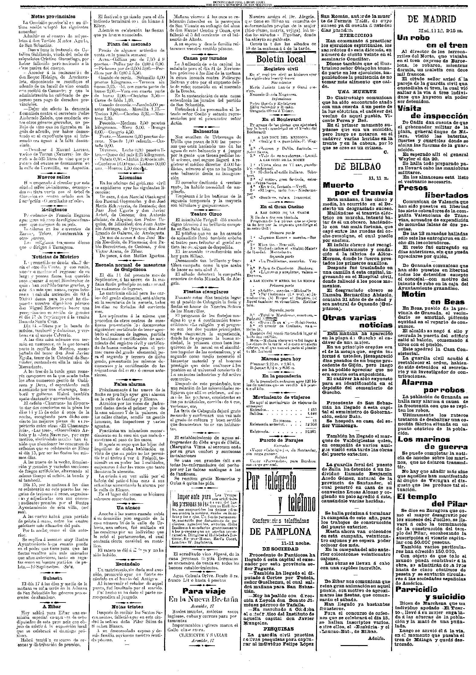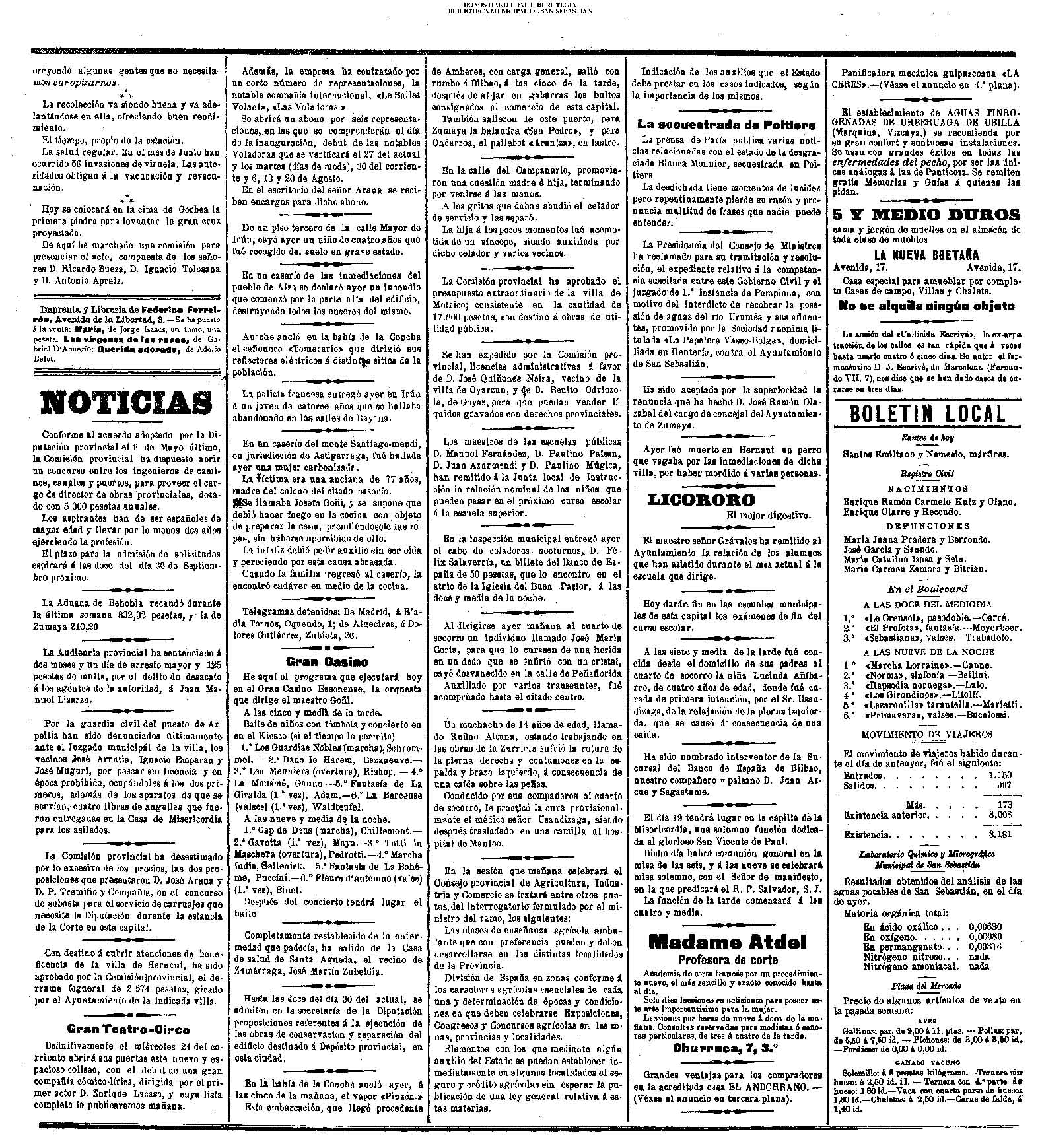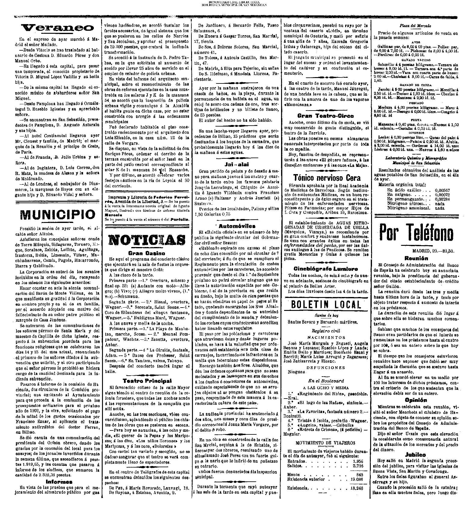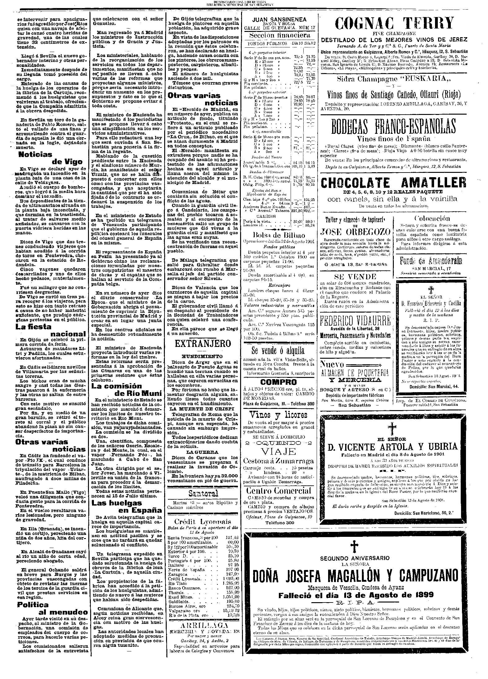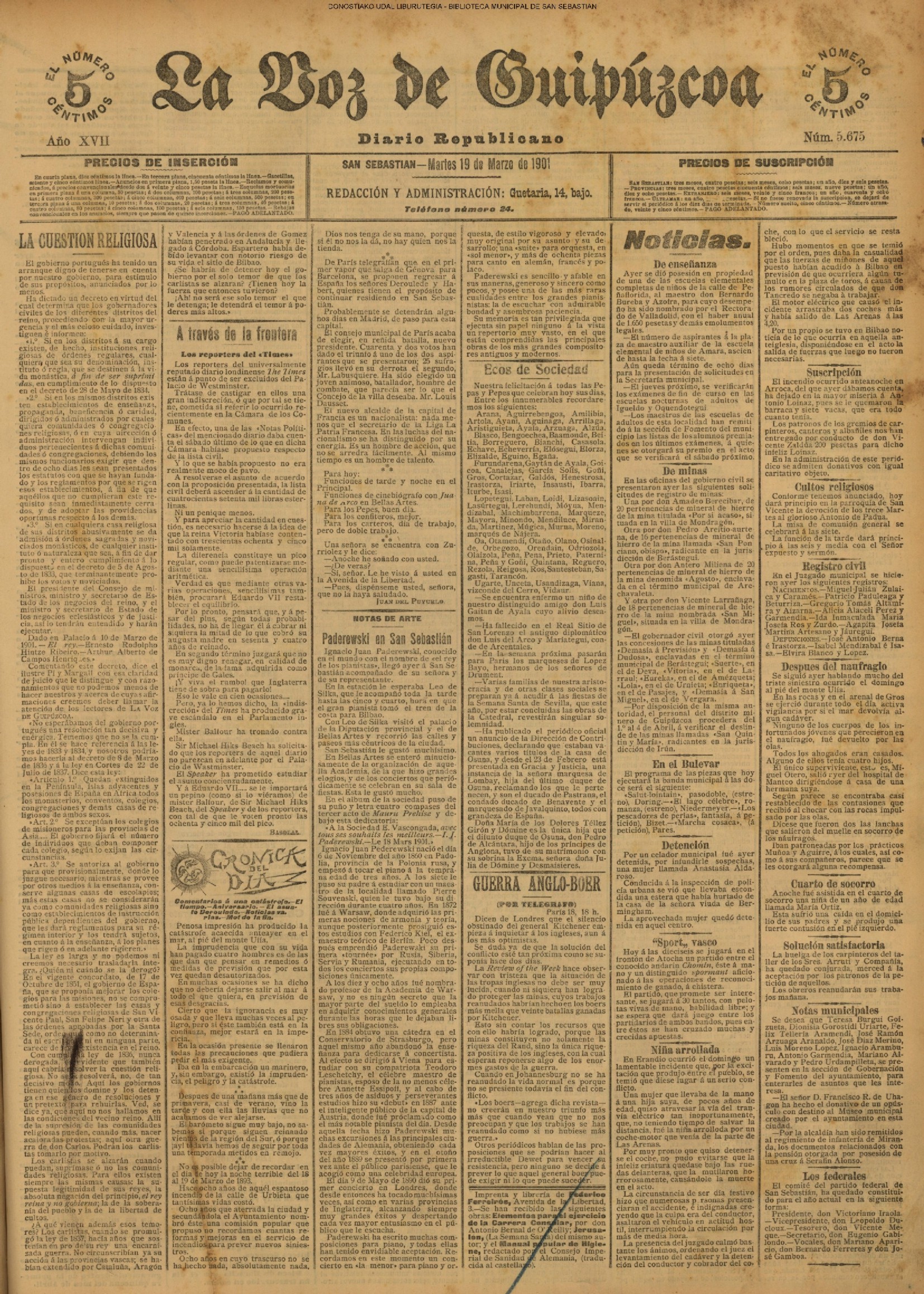 .- Nuevo Asilo de San José. En el magnifico paseo de los Fueros se está levantando el nuevo y hermoso Asilo en terrenos cedidos por el excelentísimo Ayuntamiento a la Junta de Señoras presidida por doña Desideria Petit Jean, viuda de Elosegui, que en unión de las demás señoras, y luchando con muchos inconvenientes, gracias a su constancia y amor å lacaridad, consiguieron fundar un asilo para niños pobres, que admirablemente administrado, llegó á la mayor perfección. Pero haciase demasiado reducido para las presentes necesidades el local que ocupaban, y solicitaron del excelentísimo Ayuntamiento la concesión de otro terreno más amplio, y nuestro ilustre municipio, como no podía menos, tratándose de señoras que tantos sacrificios han hecho por la doliente humanidad, el dió terreno indicado en el que van á levantar un magnífico edificio en el que quedarán satisfechas todas las necesidades y las aspiraciones propias para un establecimiento mentado según los adelantos del día. Felicitamos a las señoras que componen la referida Junta, y rogamos à Dios les conceda muchos años de salud para que con la misma solicitud y empeño puedan dedicarse á los muchos trabajos que tienen que emprender para ver coronada su obra de recibir las bendiciones de Dios y de los pobres. .- El observatorio del Mendizorrotz Gran Casino El Banco Guipuzcoano El Palacio de Justicia Notable progreso Súplica Felicitaciones