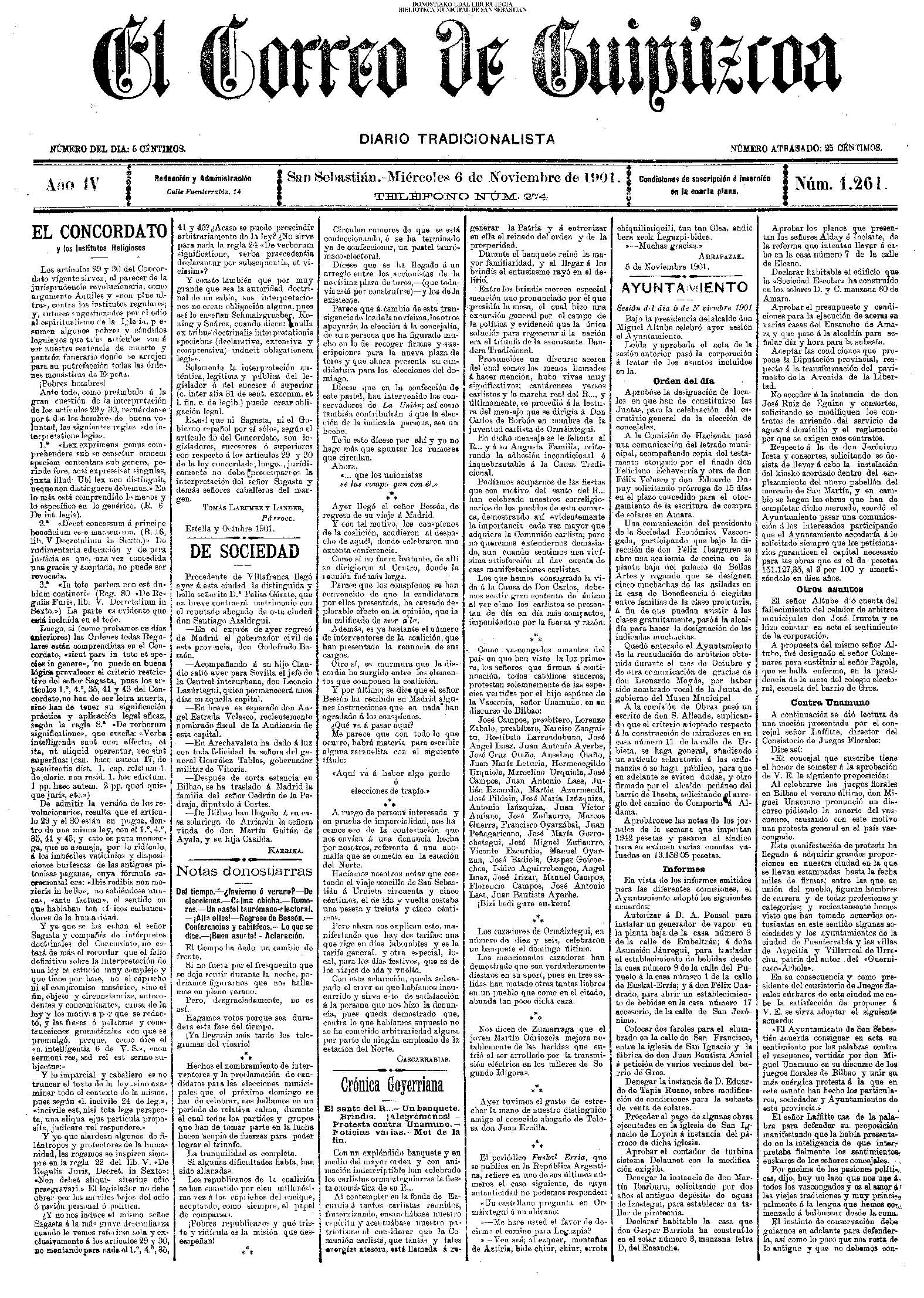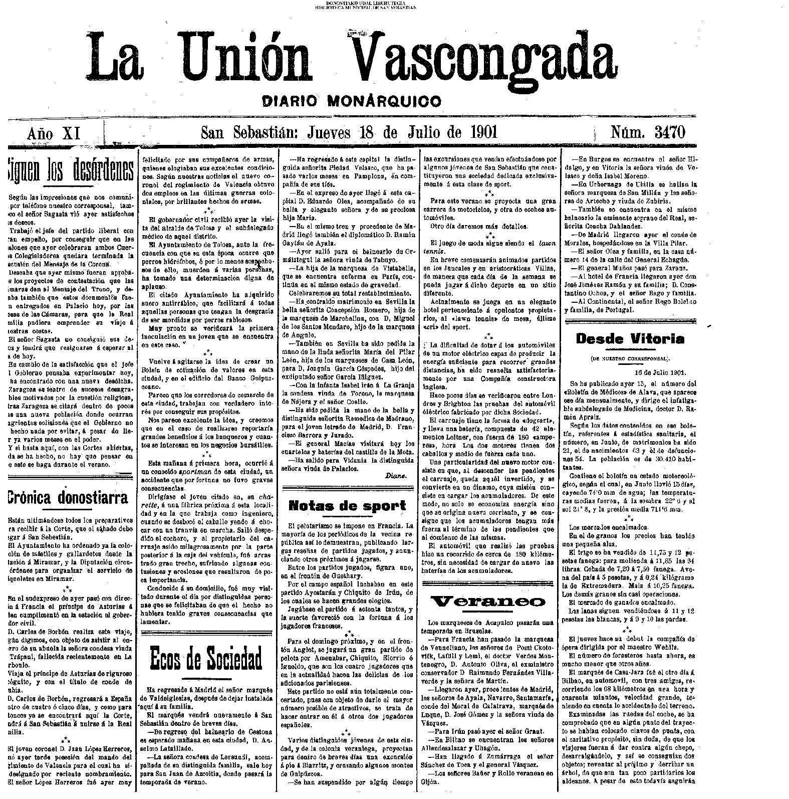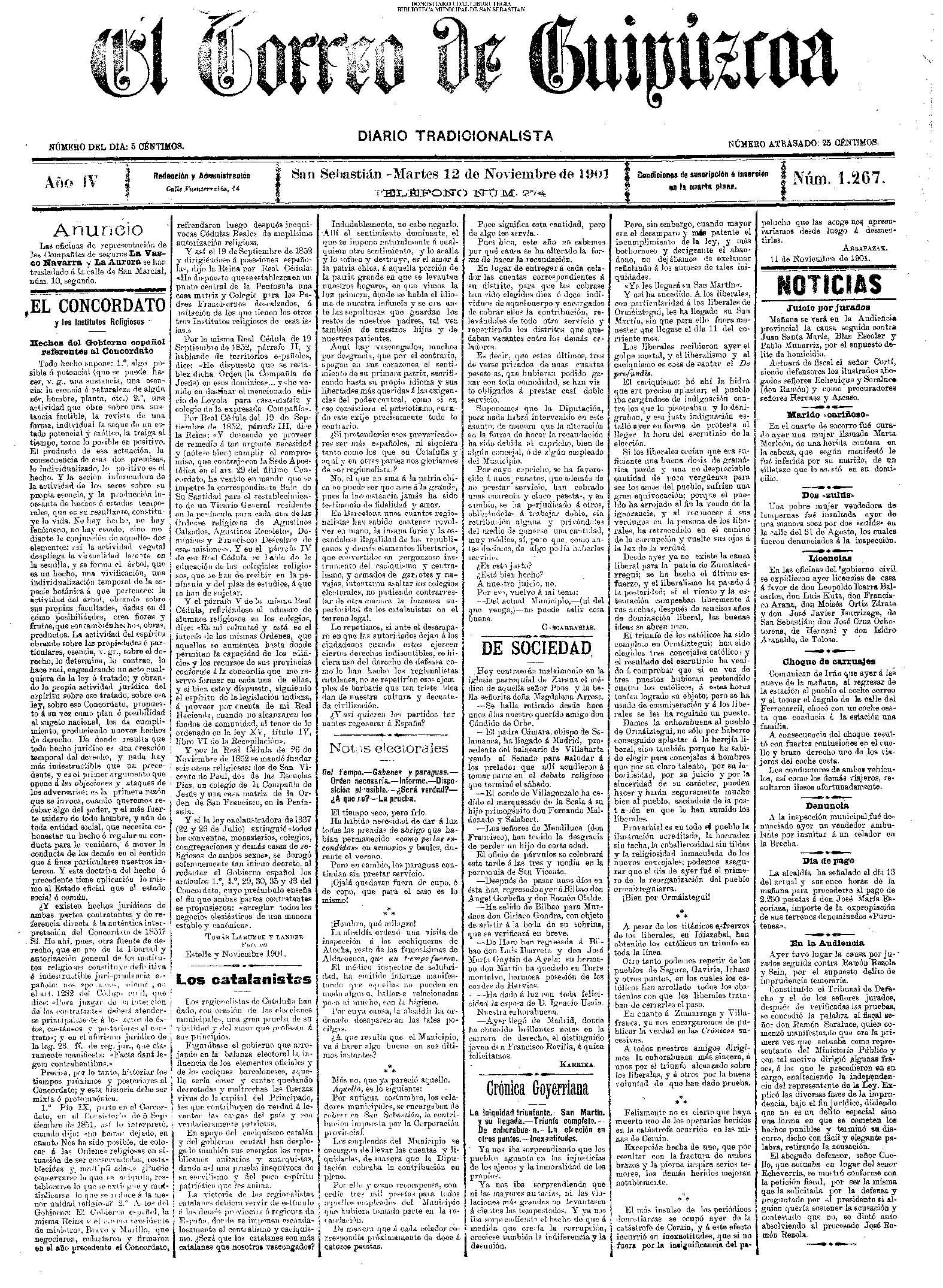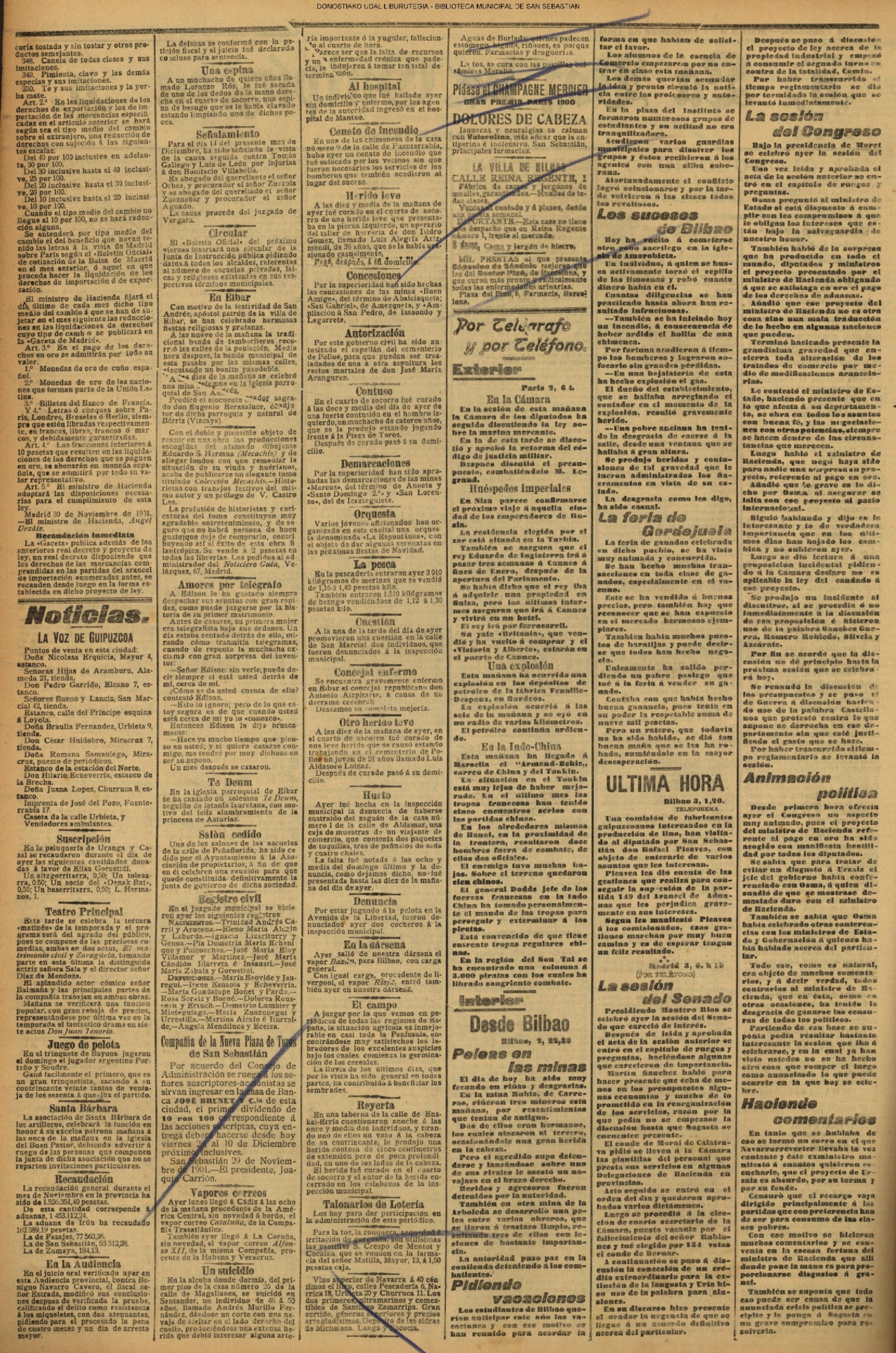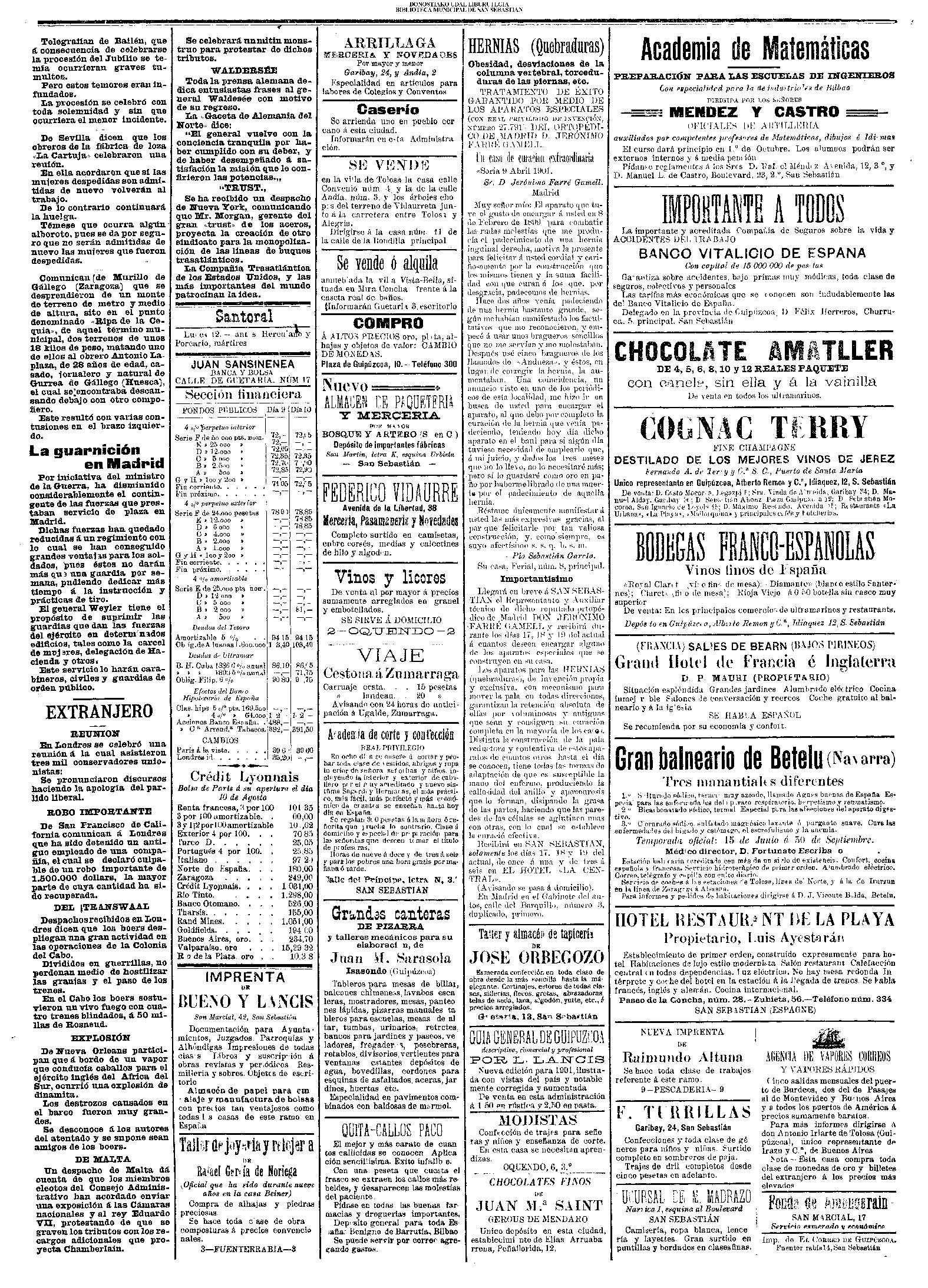 .- Nuevo Asilo de San José. En el magnifico paseo de los Fueros se está levantando el nuevo y hermoso Asilo en terrenos cedidos por el excelentísimo Ayuntamiento a la Junta de Señoras presidida por doña Desideria Petit Jean, viuda de Elosegui, que en unión de las demás señoras, y luchando con muchos inconvenientes, gracias a su constancia y amor å lacaridad, consiguieron fundar un asilo para niños pobres, que admirablemente administrado, llegó á la mayor perfección. Pero haciase demasiado reducido para las presentes necesidades el local que ocupaban, y solicitaron del excelentísimo Ayuntamiento la concesión de otro terreno más amplio, y nuestro ilustre municipio, como no podía menos, tratándose de señoras que tantos sacrificios han hecho por la doliente humanidad, el dió terreno indicado en el que van á levantar un magnífico edificio en el que quedarán satisfechas todas las necesidades y las aspiraciones propias para un establecimiento mentado según los adelantos del día. Felicitamos a las señoras que componen la referida Junta, y rogamos à Dios les conceda muchos años de salud para que con la misma solicitud y empeño puedan dedicarse á los muchos trabajos que tienen que emprender para ver coronada su obra de recibir las bendiciones de Dios y de los pobres. .- El observatorio del Mendizorrotz Gran Casino El Banco Guipuzcoano El Palacio de Justicia Notable progreso Súplica Felicitaciones