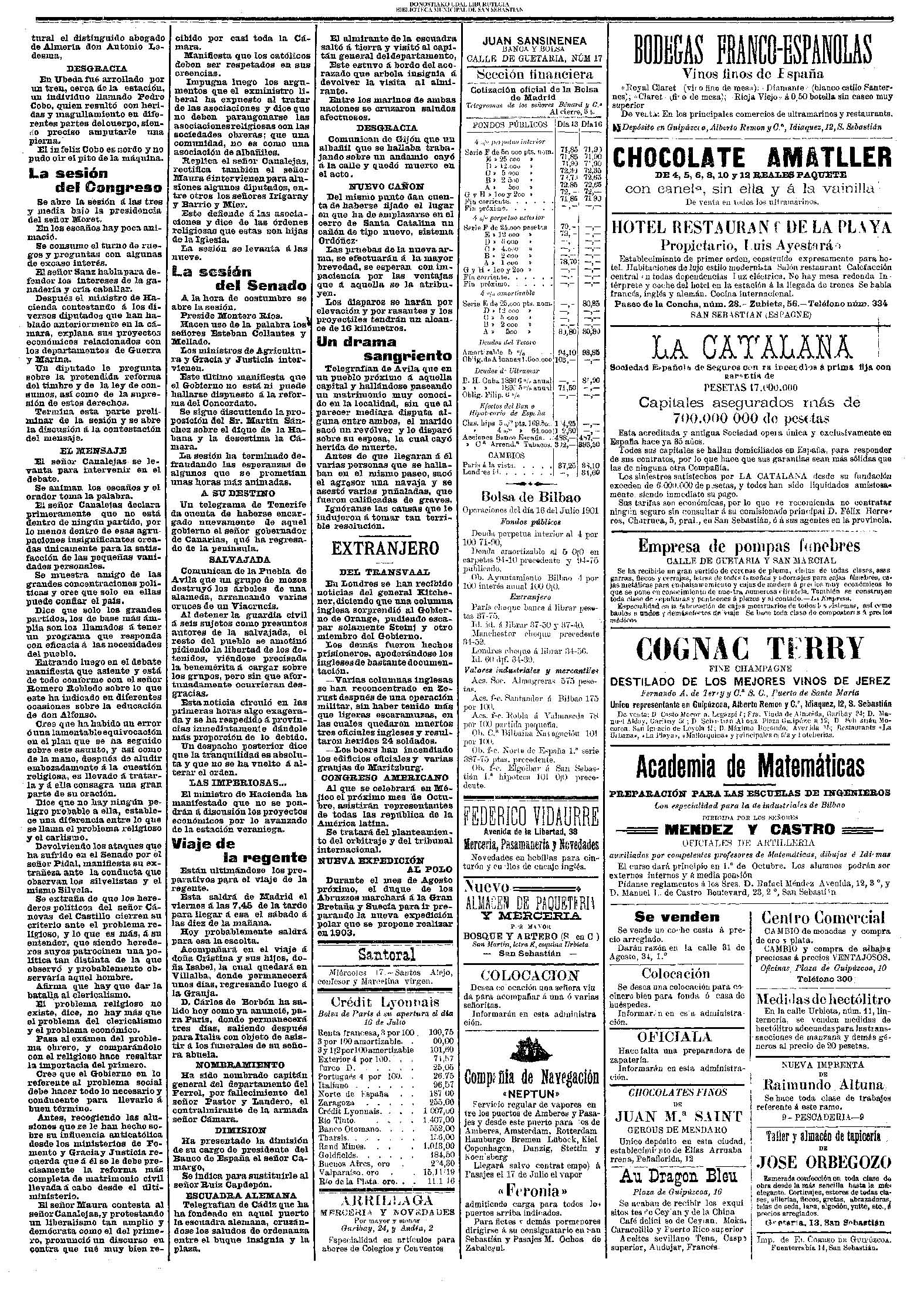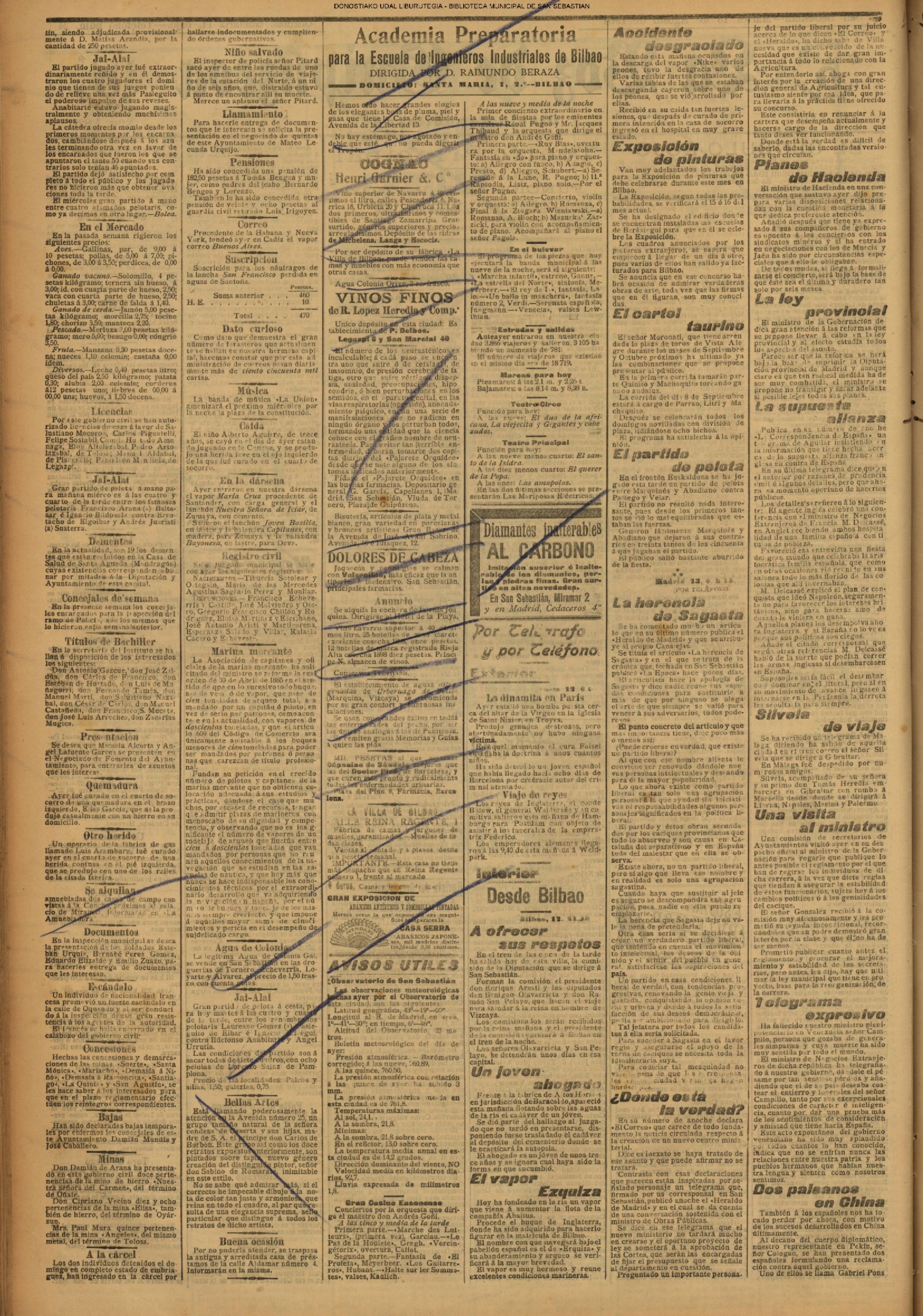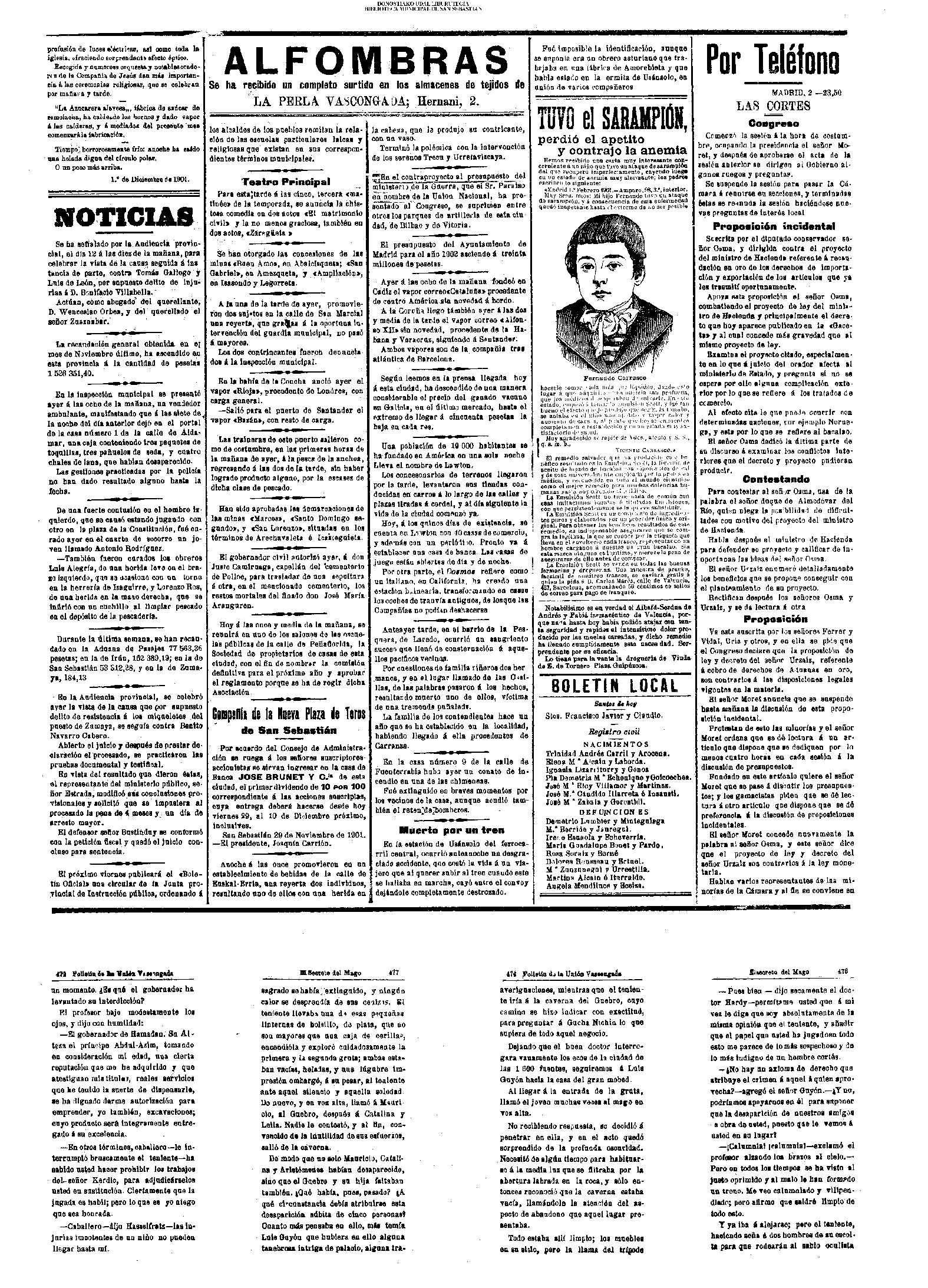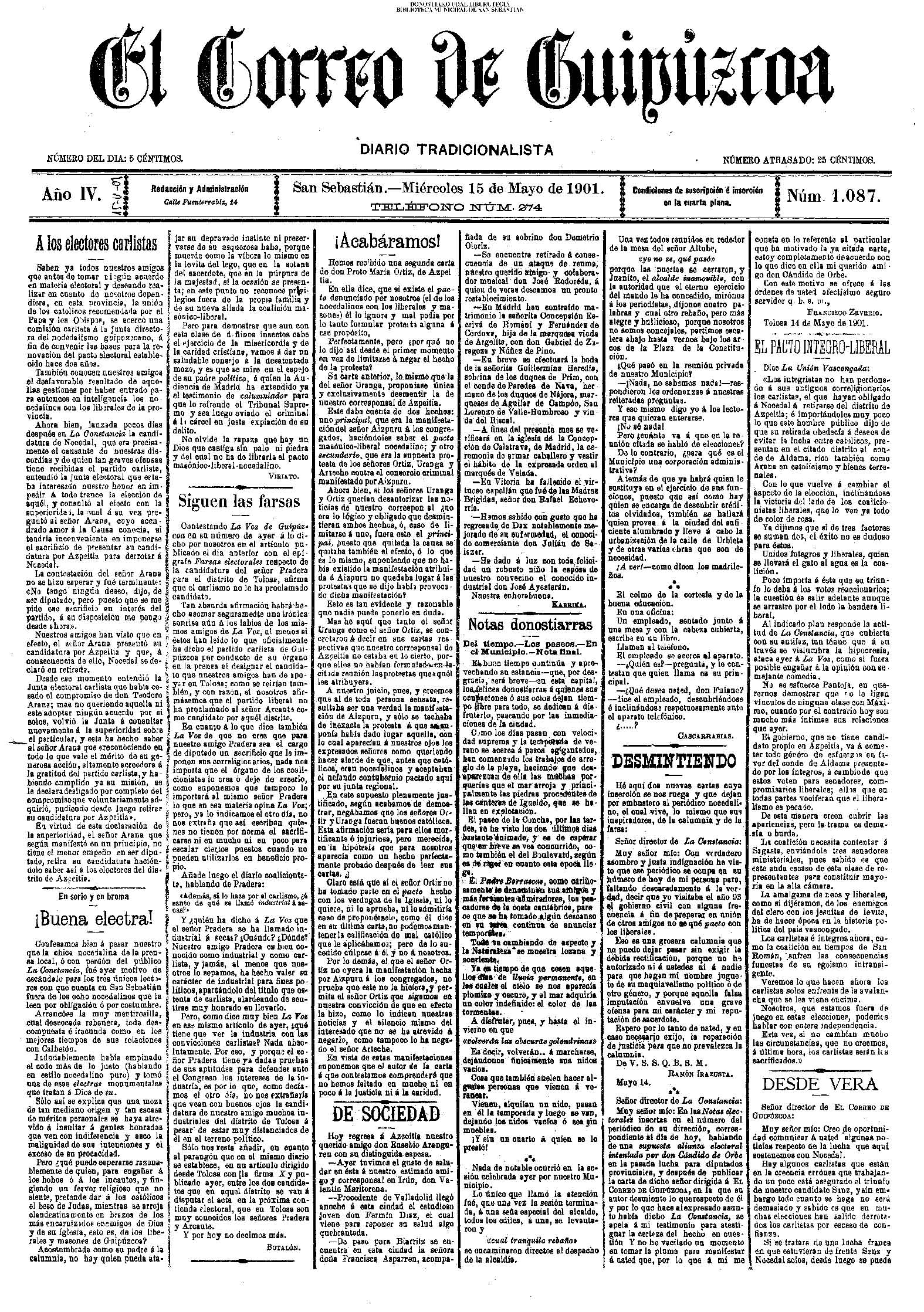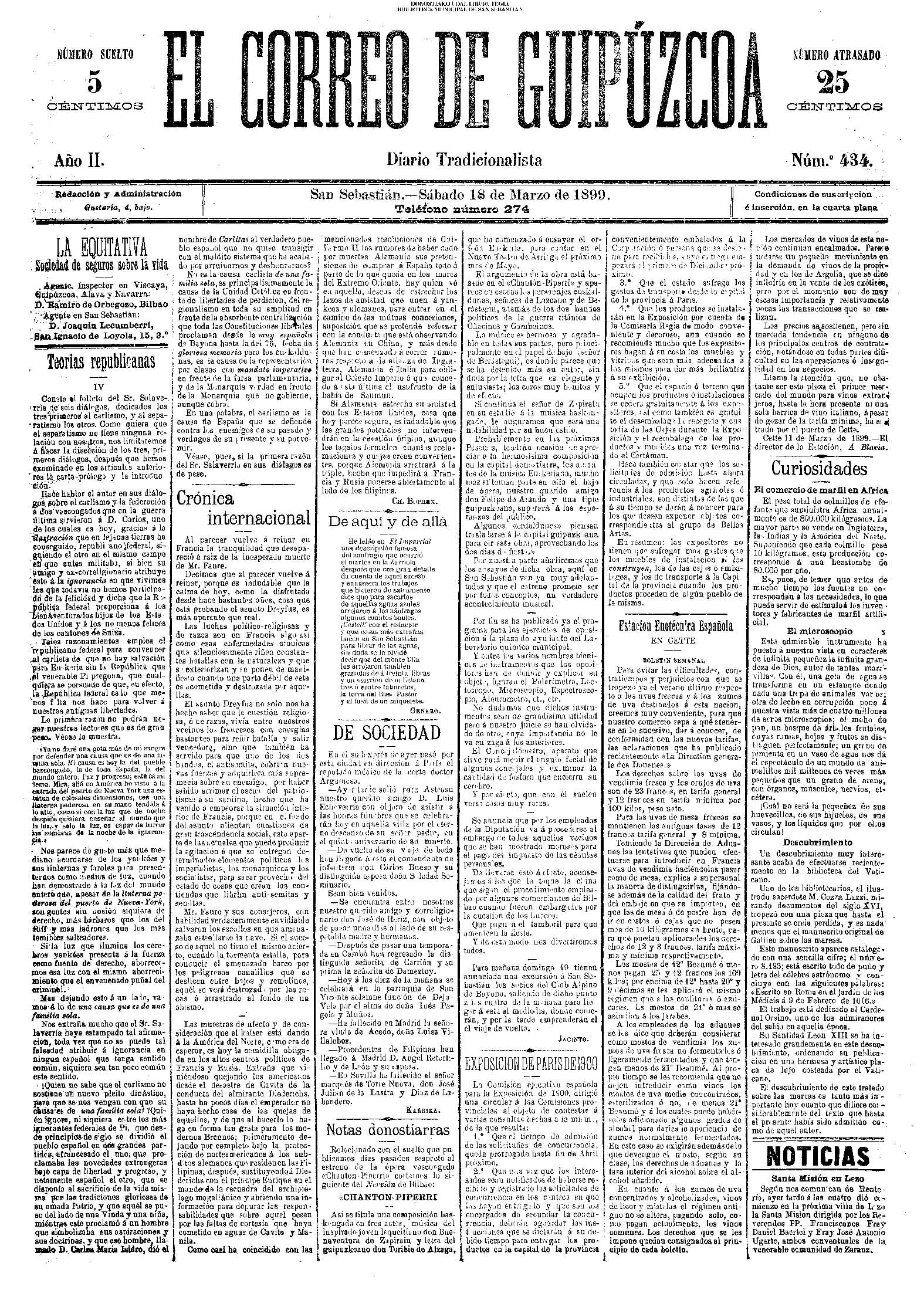 .- Nuevo Asilo de San José. En el magnifico paseo de los Fueros se está levantando el nuevo y hermoso Asilo en terrenos cedidos por el excelentísimo Ayuntamiento a la Junta de Señoras presidida por doña Desideria Petit Jean, viuda de Elosegui, que en unión de las demás señoras, y luchando con muchos inconvenientes, gracias a su constancia y amor å lacaridad, consiguieron fundar un asilo para niños pobres, que admirablemente administrado, llegó á la mayor perfección. Pero haciase demasiado reducido para las presentes necesidades el local que ocupaban, y solicitaron del excelentísimo Ayuntamiento la concesión de otro terreno más amplio, y nuestro ilustre municipio, como no podía menos, tratándose de señoras que tantos sacrificios han hecho por la doliente humanidad, el dió terreno indicado en el que van á levantar un magnífico edificio en el que quedarán satisfechas todas las necesidades y las aspiraciones propias para un establecimiento mentado según los adelantos del día. Felicitamos a las señoras que componen la referida Junta, y rogamos à Dios les conceda muchos años de salud para que con la misma solicitud y empeño puedan dedicarse á los muchos trabajos que tienen que emprender para ver coronada su obra de recibir las bendiciones de Dios y de los pobres. .- El observatorio del Mendizorrotz Gran Casino El Banco Guipuzcoano El Palacio de Justicia Notable progreso Súplica Felicitaciones