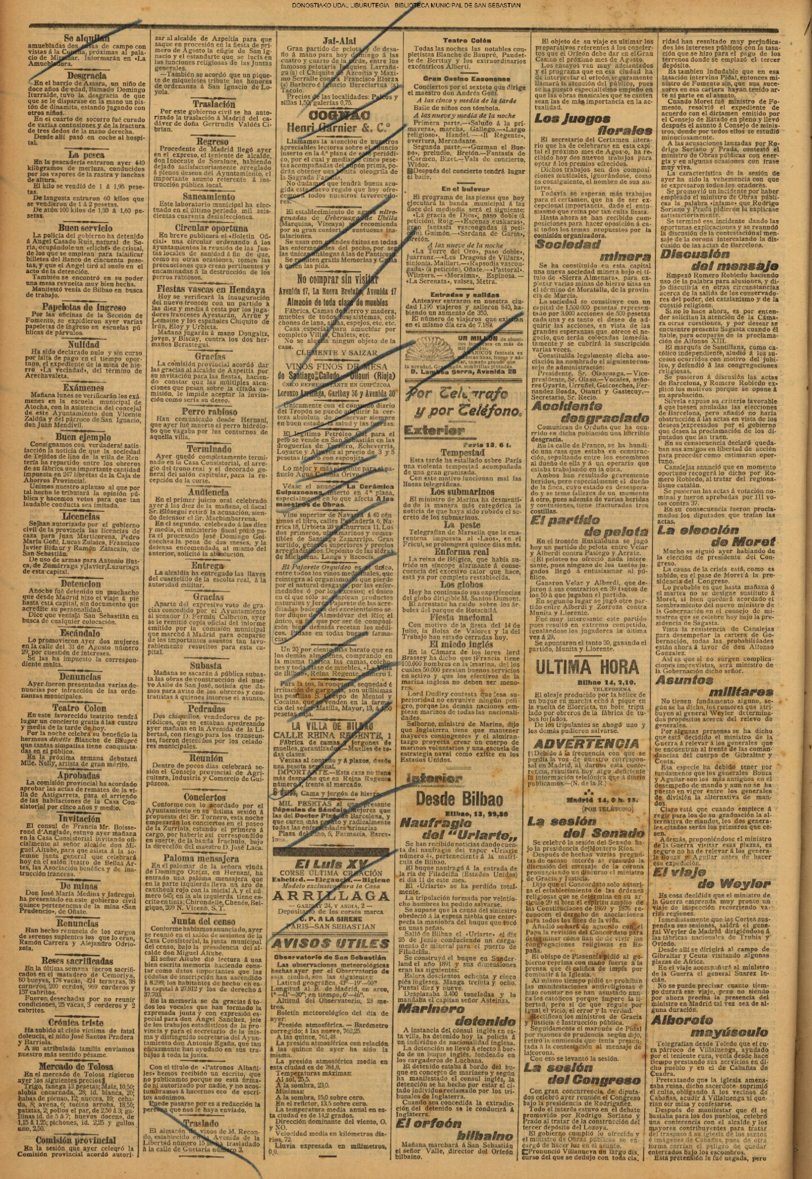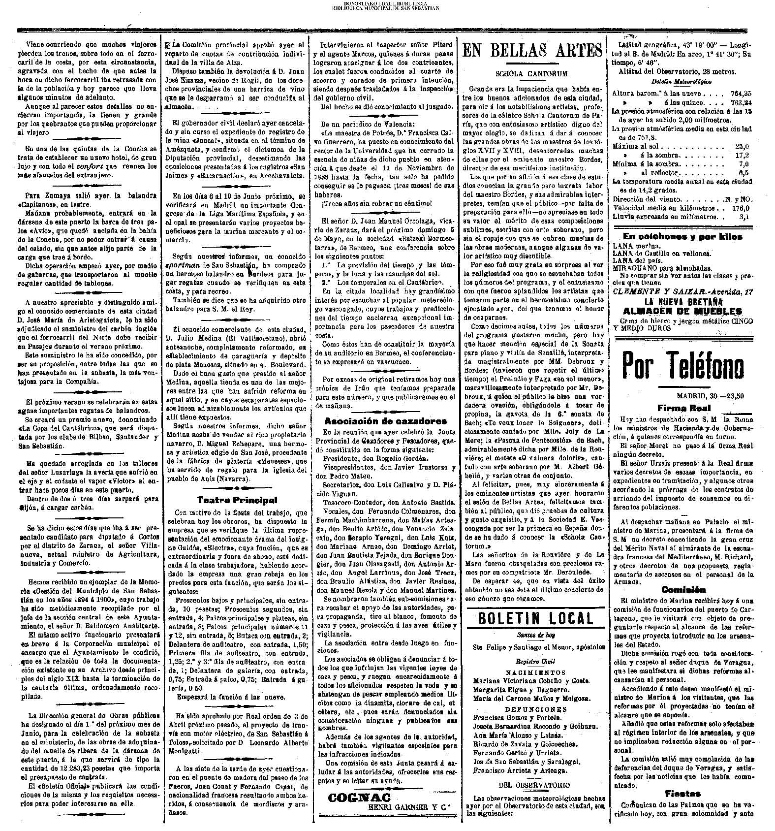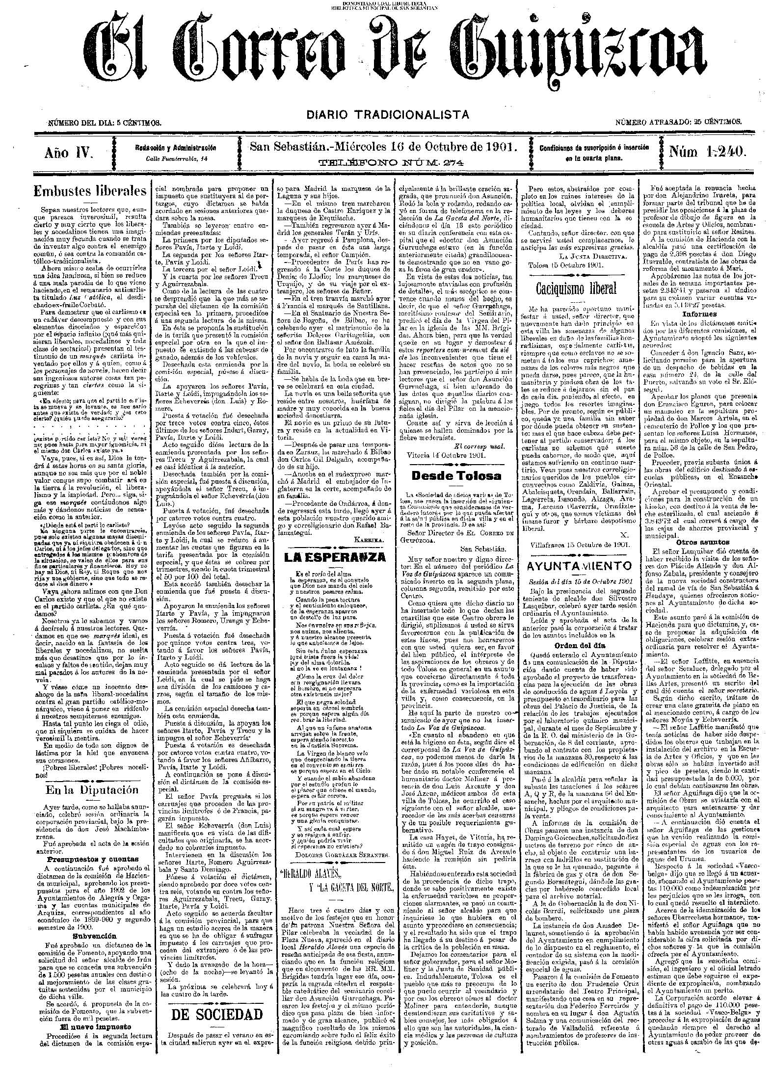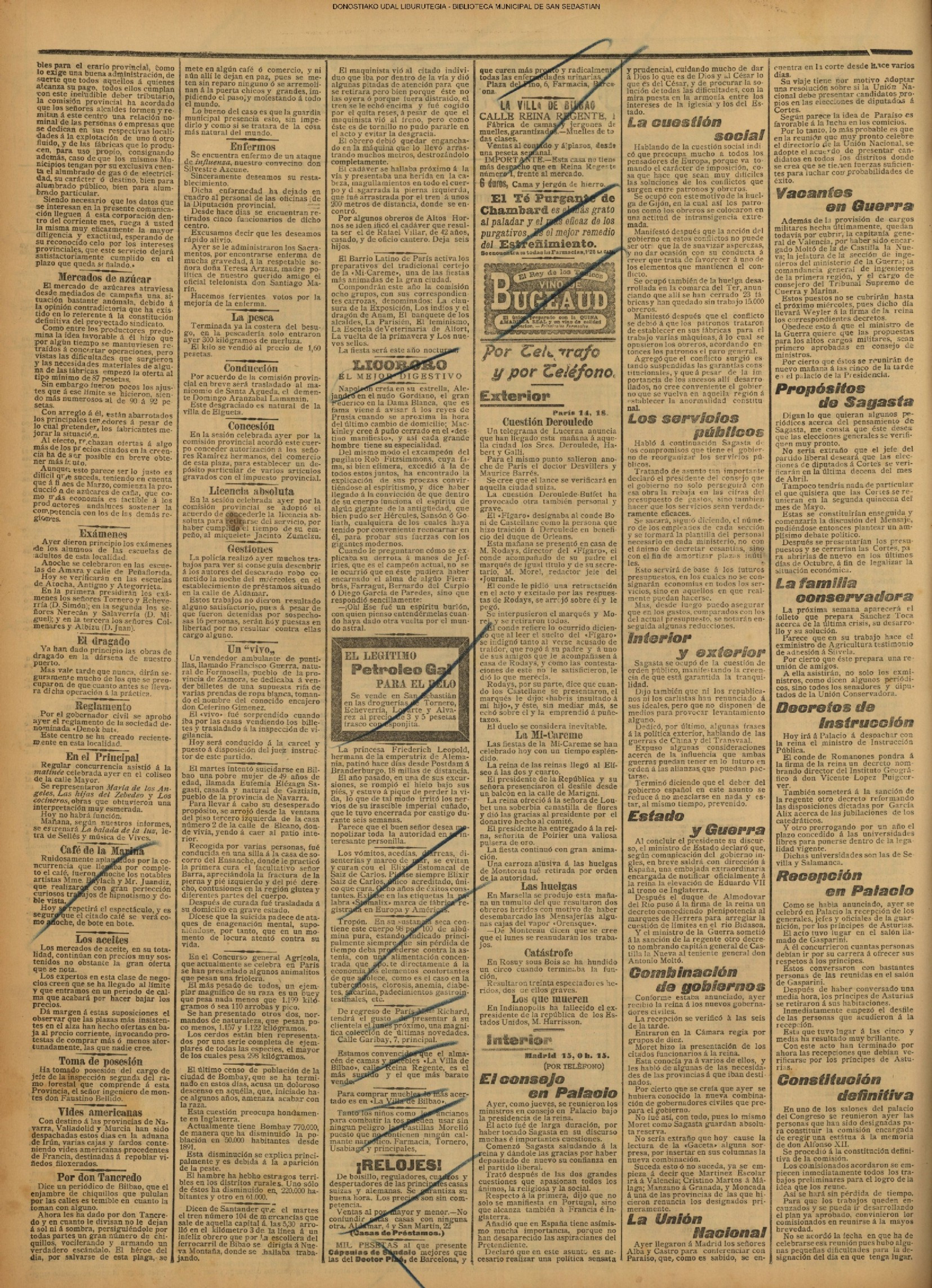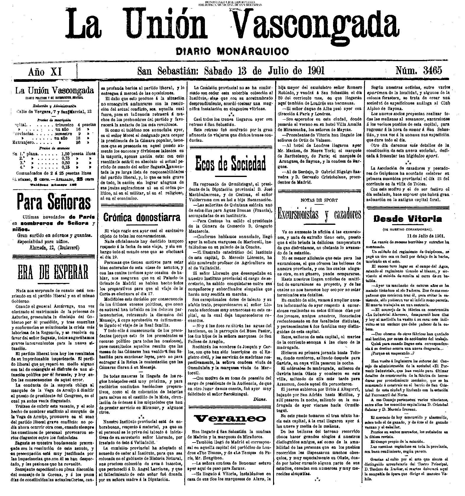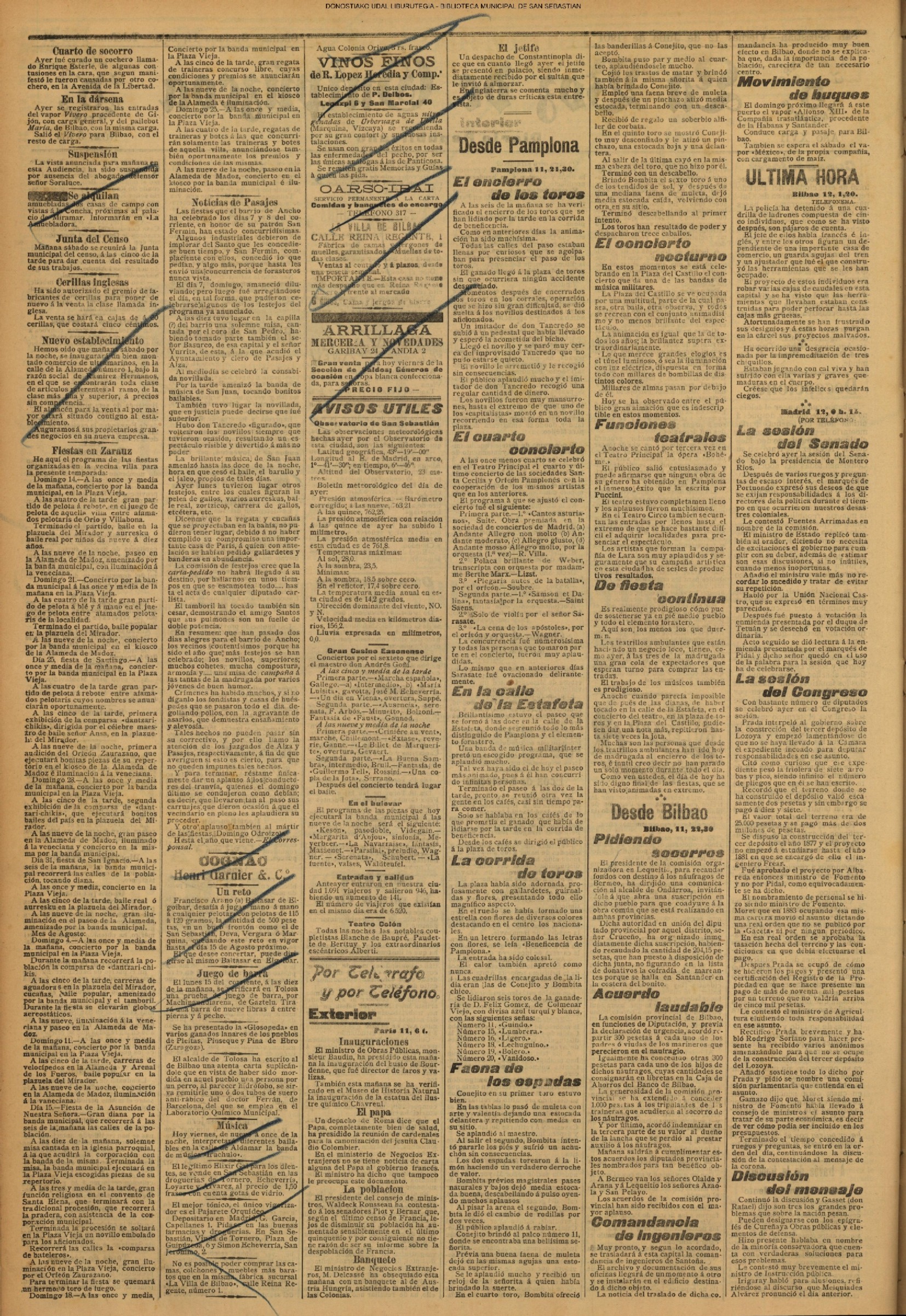 .- Nuevo Asilo de San José. En el magnifico paseo de los Fueros se está levantando el nuevo y hermoso Asilo en terrenos cedidos por el excelentísimo Ayuntamiento a la Junta de Señoras presidida por doña Desideria Petit Jean, viuda de Elosegui, que en unión de las demás señoras, y luchando con muchos inconvenientes, gracias a su constancia y amor å lacaridad, consiguieron fundar un asilo para niños pobres, que admirablemente administrado, llegó á la mayor perfección. Pero haciase demasiado reducido para las presentes necesidades el local que ocupaban, y solicitaron del excelentísimo Ayuntamiento la concesión de otro terreno más amplio, y nuestro ilustre municipio, como no podía menos, tratándose de señoras que tantos sacrificios han hecho por la doliente humanidad, el dió terreno indicado en el que van á levantar un magnífico edificio en el que quedarán satisfechas todas las necesidades y las aspiraciones propias para un establecimiento mentado según los adelantos del día. Felicitamos a las señoras que componen la referida Junta, y rogamos à Dios les conceda muchos años de salud para que con la misma solicitud y empeño puedan dedicarse á los muchos trabajos que tienen que emprender para ver coronada su obra de recibir las bendiciones de Dios y de los pobres. .- El observatorio del Mendizorrotz Gran Casino El Banco Guipuzcoano El Palacio de Justicia Notable progreso Súplica Felicitaciones