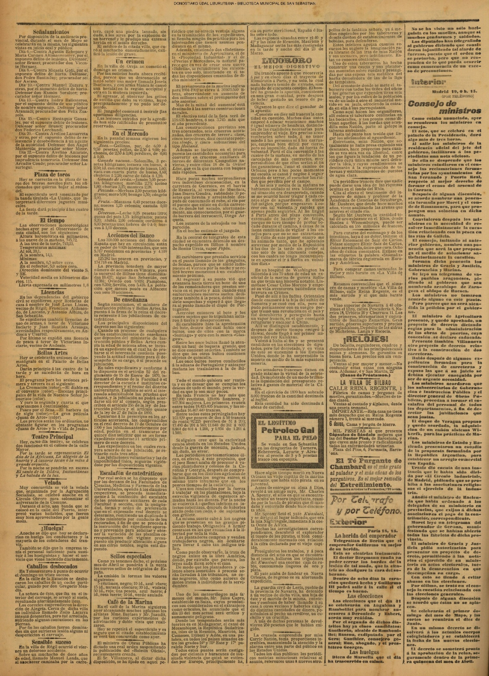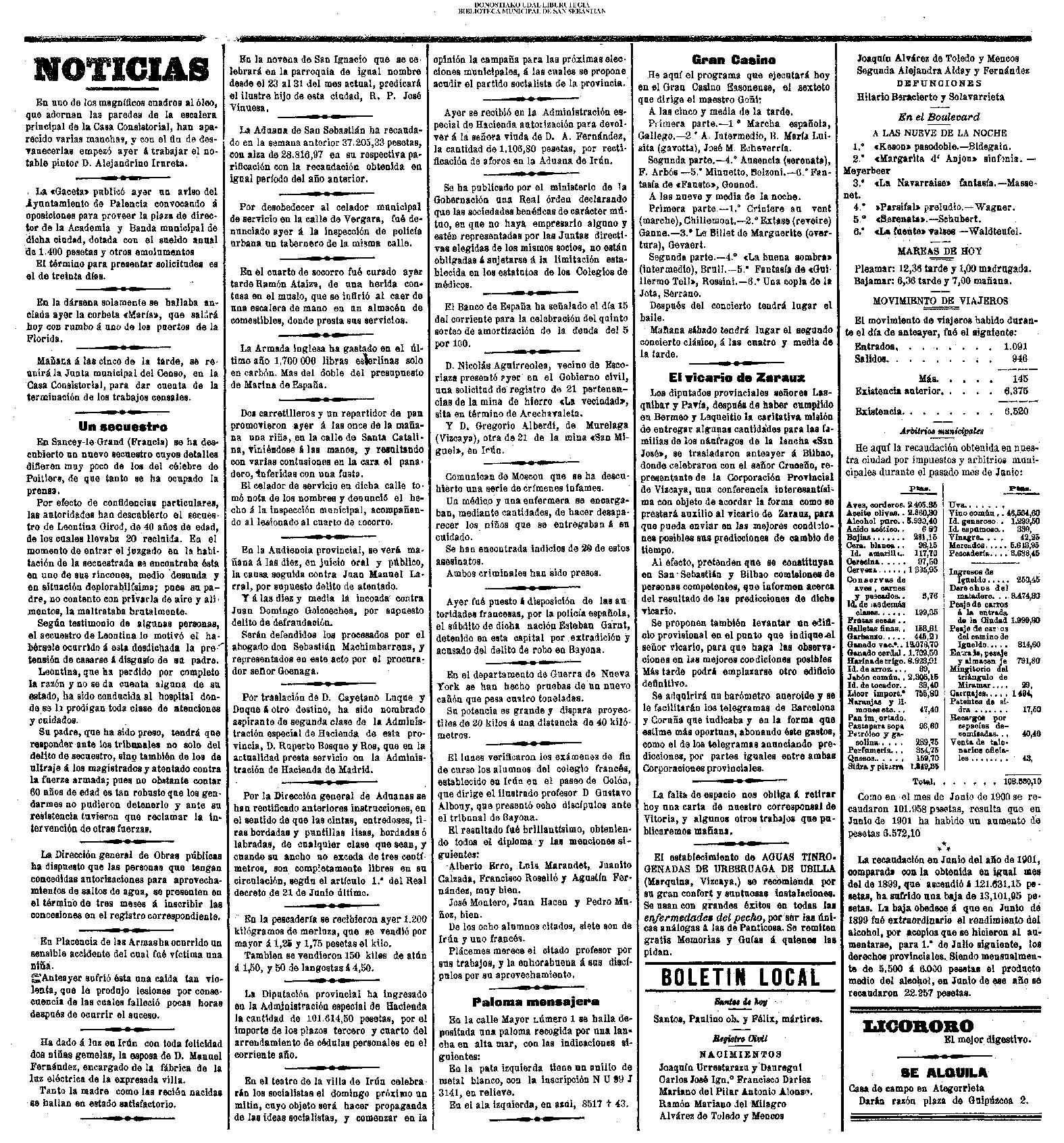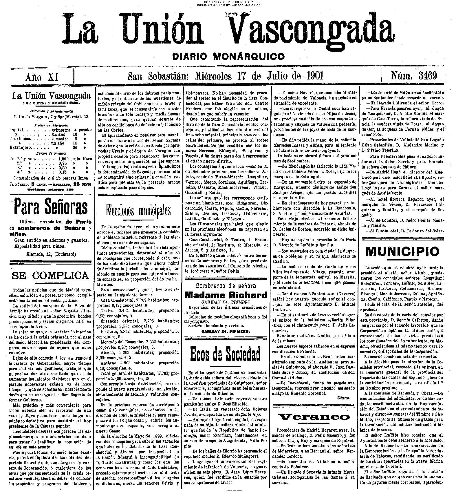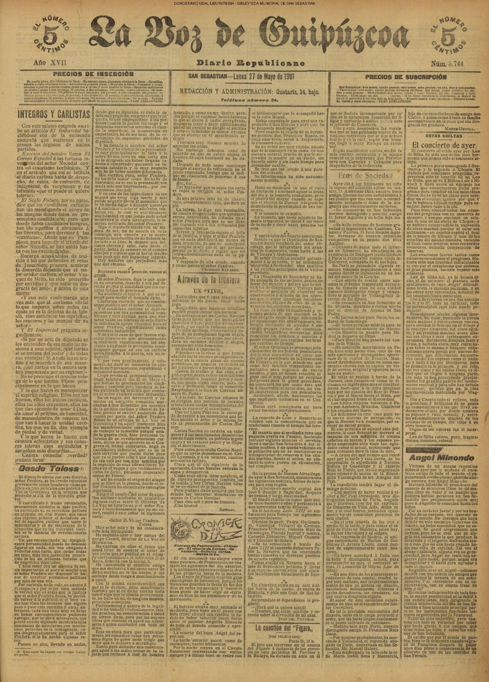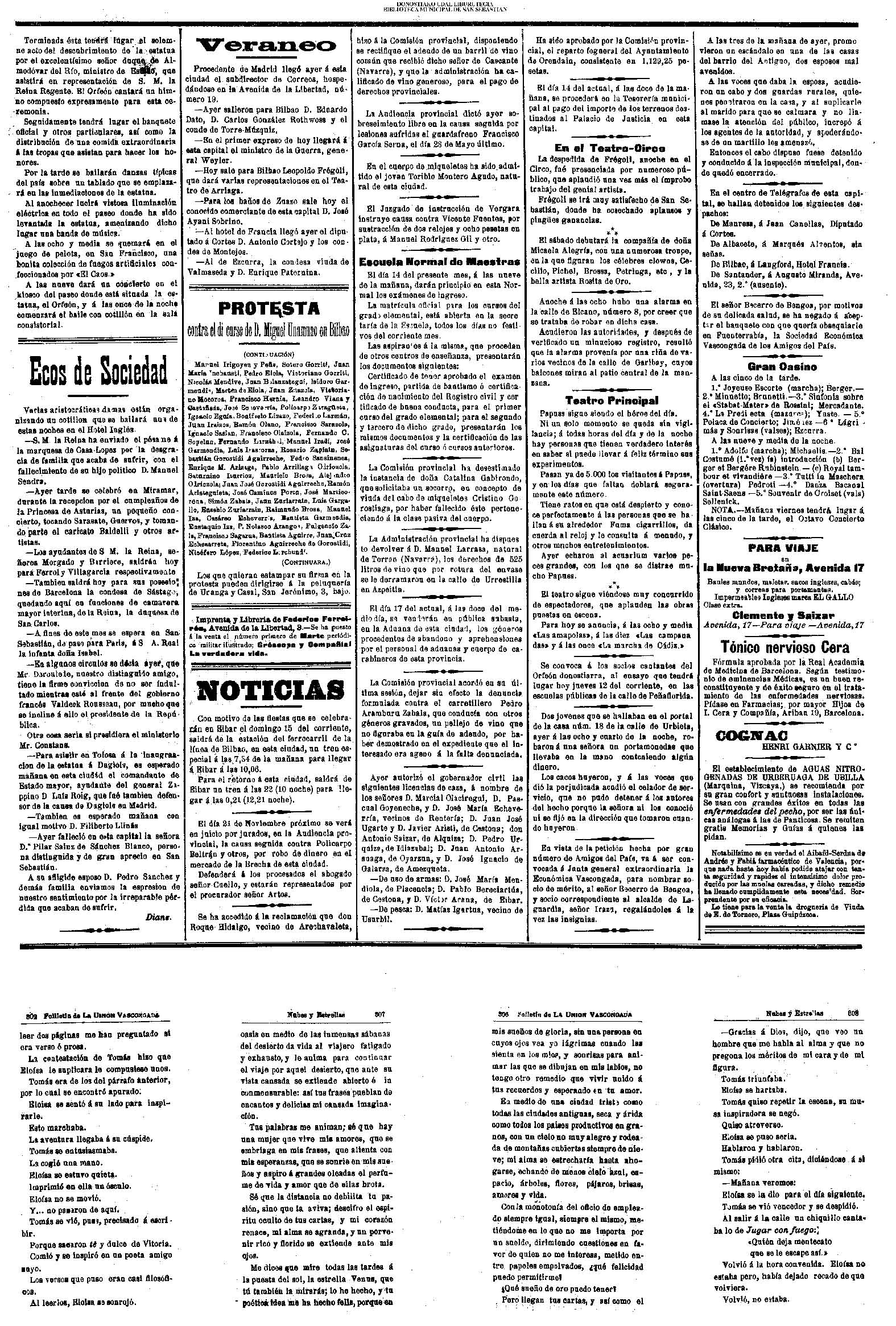 .- Nuevo Asilo de San José. En el magnifico paseo de los Fueros se está levantando el nuevo y hermoso Asilo en terrenos cedidos por el excelentísimo Ayuntamiento a la Junta de Señoras presidida por doña Desideria Petit Jean, viuda de Elosegui, que en unión de las demás señoras, y luchando con muchos inconvenientes, gracias a su constancia y amor å lacaridad, consiguieron fundar un asilo para niños pobres, que admirablemente administrado, llegó á la mayor perfección. Pero haciase demasiado reducido para las presentes necesidades el local que ocupaban, y solicitaron del excelentísimo Ayuntamiento la concesión de otro terreno más amplio, y nuestro ilustre municipio, como no podía menos, tratándose de señoras que tantos sacrificios han hecho por la doliente humanidad, el dió terreno indicado en el que van á levantar un magnífico edificio en el que quedarán satisfechas todas las necesidades y las aspiraciones propias para un establecimiento mentado según los adelantos del día. Felicitamos a las señoras que componen la referida Junta, y rogamos à Dios les conceda muchos años de salud para que con la misma solicitud y empeño puedan dedicarse á los muchos trabajos que tienen que emprender para ver coronada su obra de recibir las bendiciones de Dios y de los pobres. .- El observatorio del Mendizorrotz Gran Casino El Banco Guipuzcoano El Palacio de Justicia Notable progreso Súplica Felicitaciones