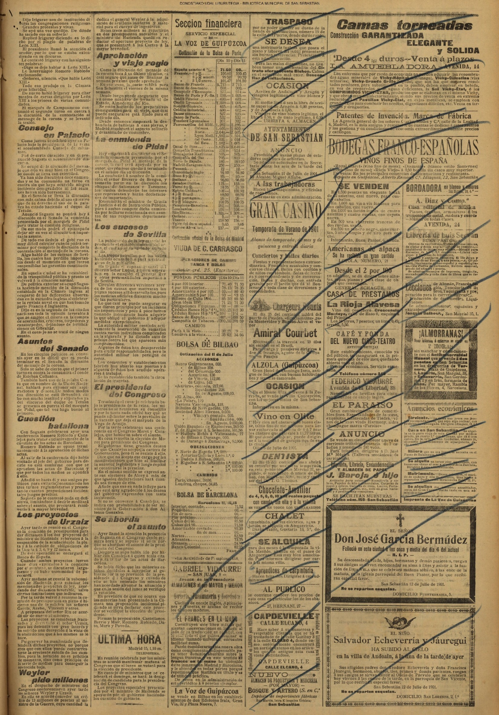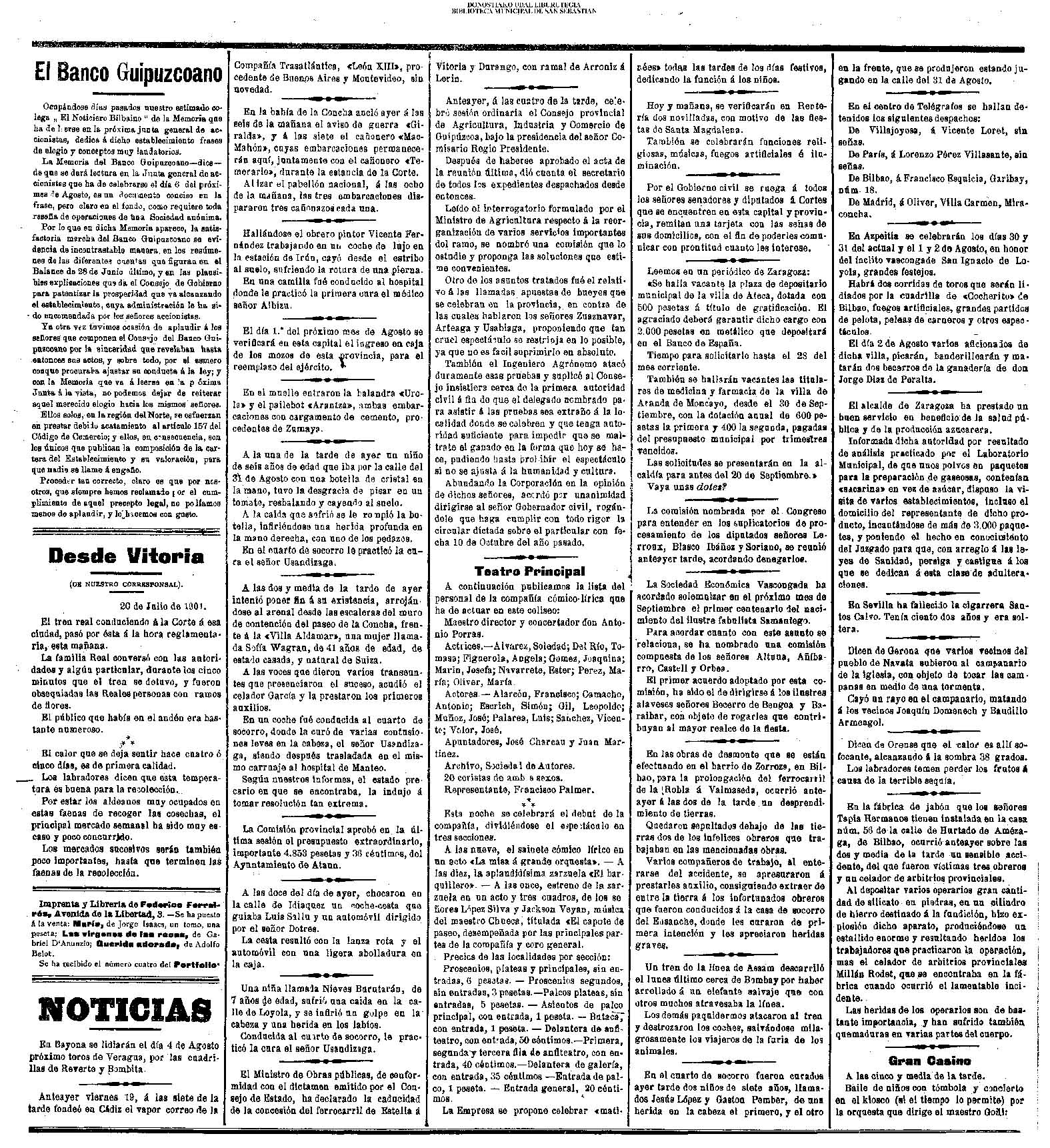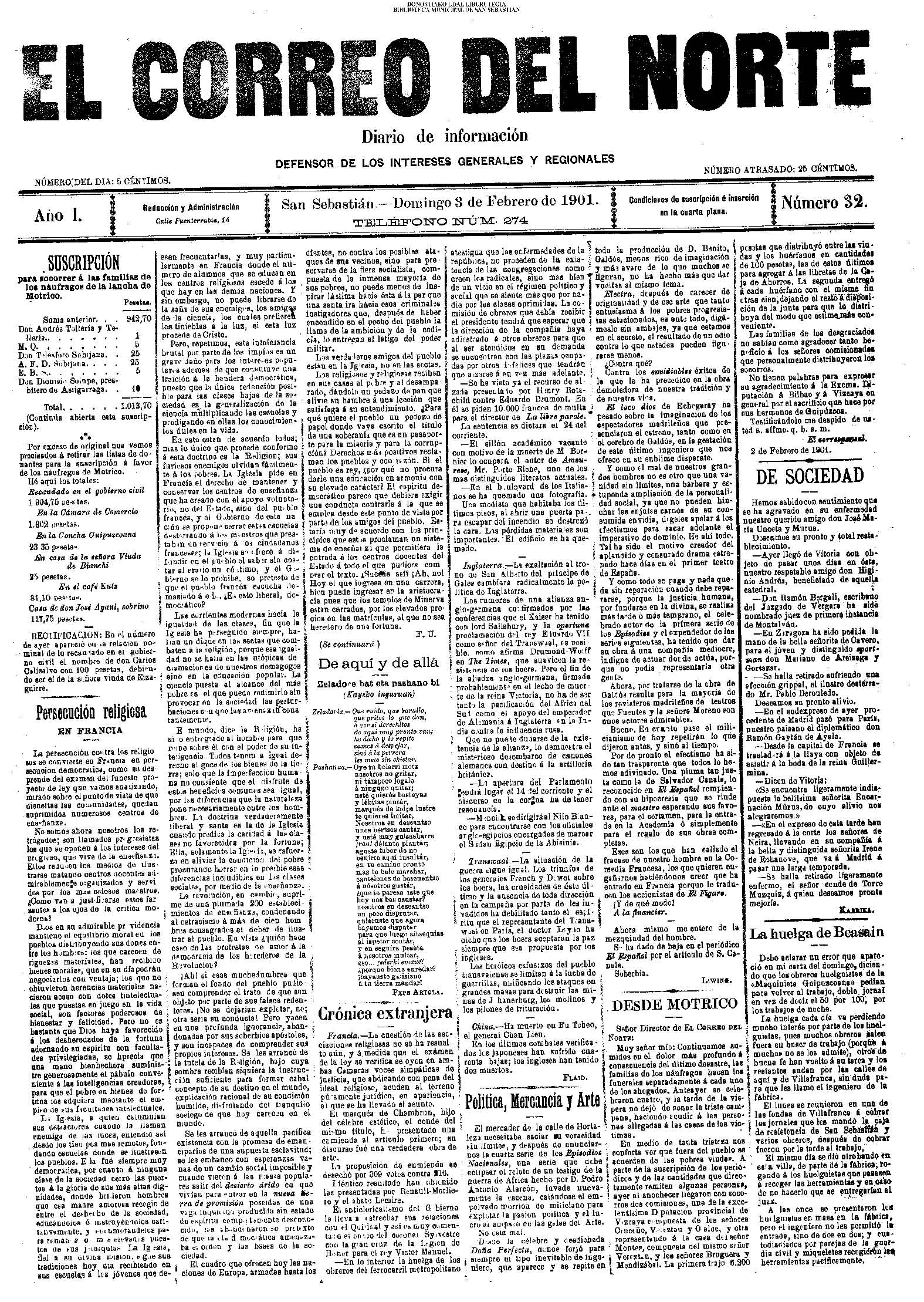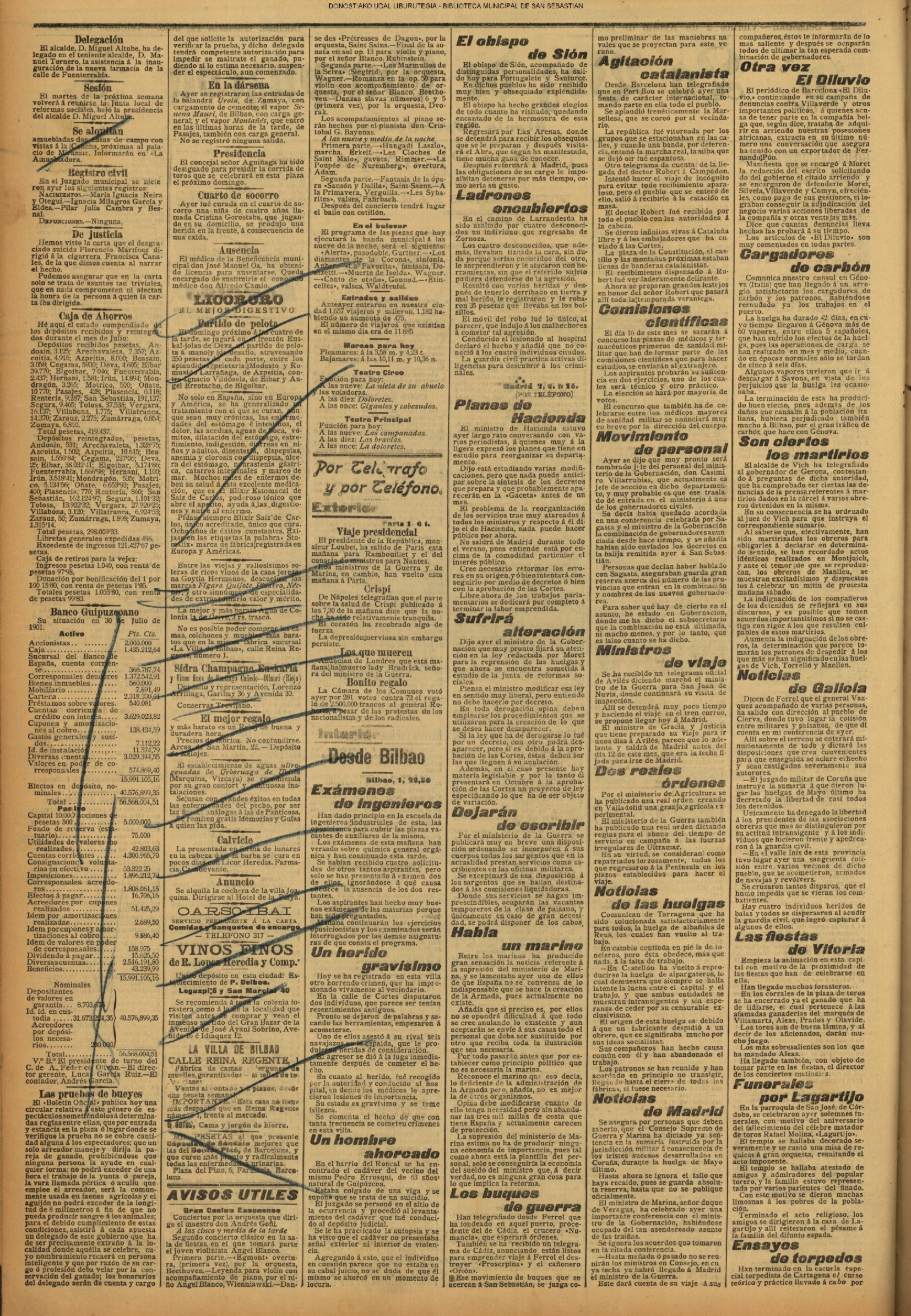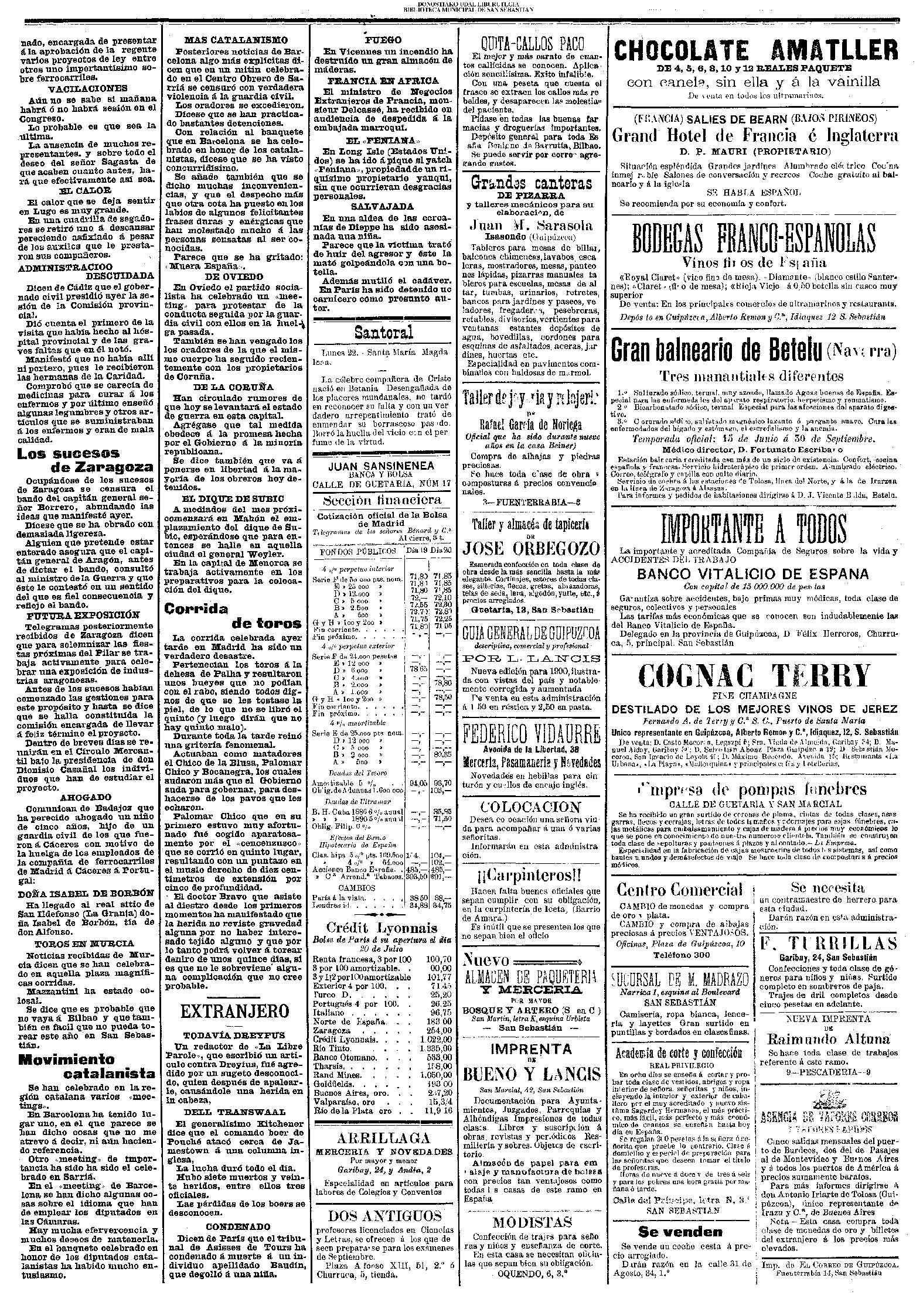 .- Nuevo Asilo de San José. En el magnifico paseo de los Fueros se está levantando el nuevo y hermoso Asilo en terrenos cedidos por el excelentísimo Ayuntamiento a la Junta de Señoras presidida por doña Desideria Petit Jean, viuda de Elosegui, que en unión de las demás señoras, y luchando con muchos inconvenientes, gracias a su constancia y amor å lacaridad, consiguieron fundar un asilo para niños pobres, que admirablemente administrado, llegó á la mayor perfección. Pero haciase demasiado reducido para las presentes necesidades el local que ocupaban, y solicitaron del excelentísimo Ayuntamiento la concesión de otro terreno más amplio, y nuestro ilustre municipio, como no podía menos, tratándose de señoras que tantos sacrificios han hecho por la doliente humanidad, el dió terreno indicado en el que van á levantar un magnífico edificio en el que quedarán satisfechas todas las necesidades y las aspiraciones propias para un establecimiento mentado según los adelantos del día. Felicitamos a las señoras que componen la referida Junta, y rogamos à Dios les conceda muchos años de salud para que con la misma solicitud y empeño puedan dedicarse á los muchos trabajos que tienen que emprender para ver coronada su obra de recibir las bendiciones de Dios y de los pobres. .- El observatorio del Mendizorrotz Gran Casino El Banco Guipuzcoano El Palacio de Justicia Notable progreso Súplica Felicitaciones