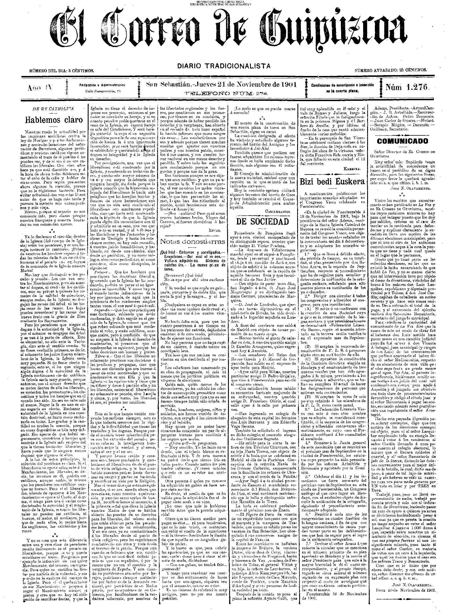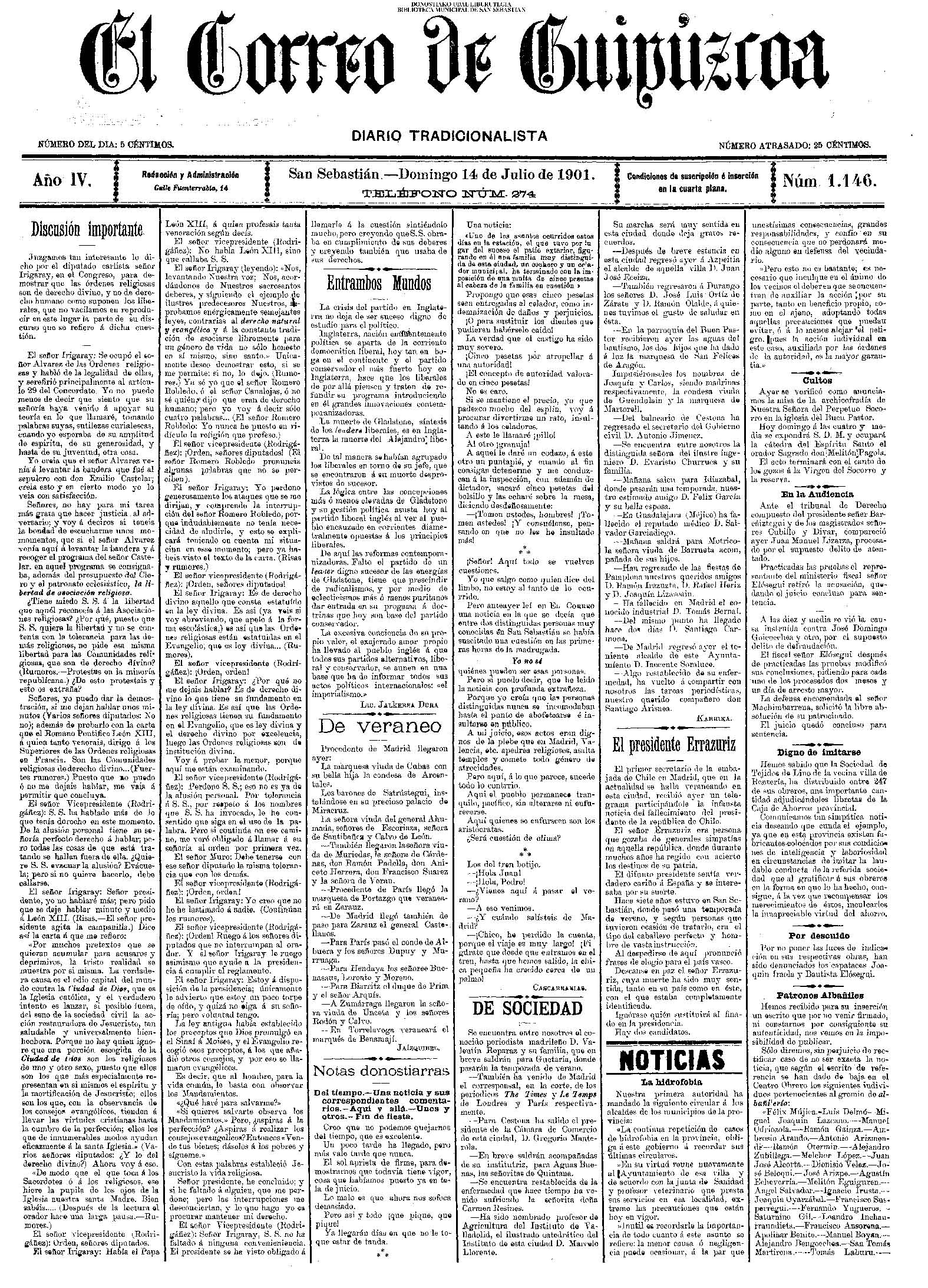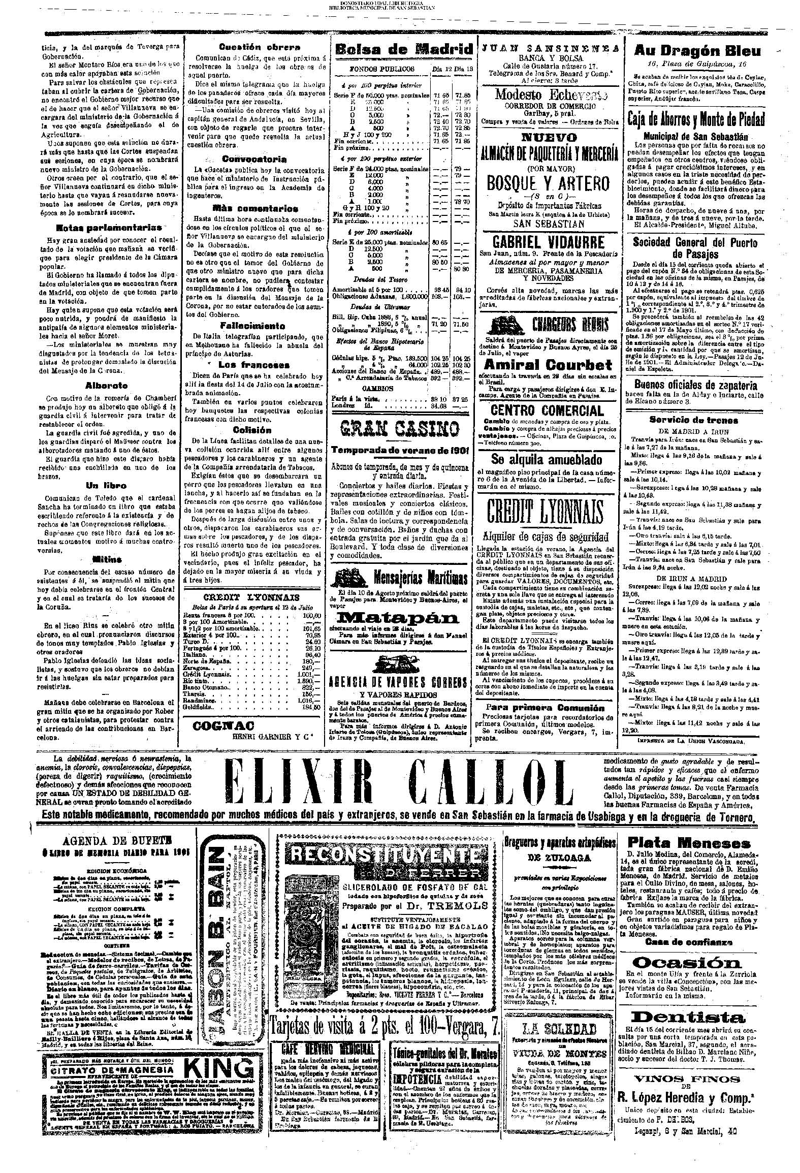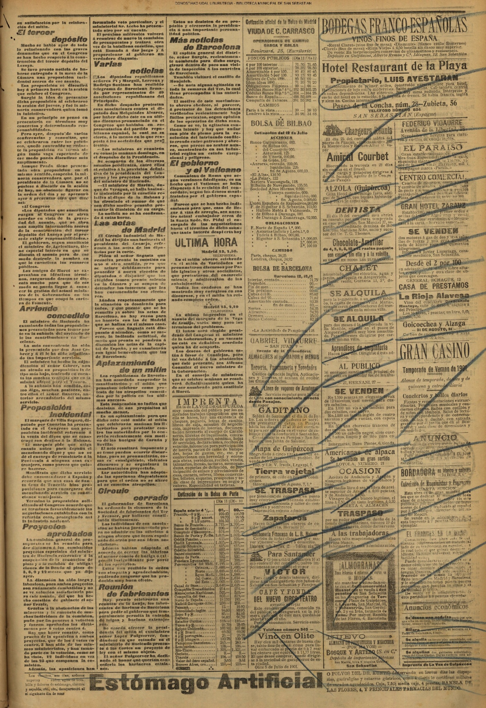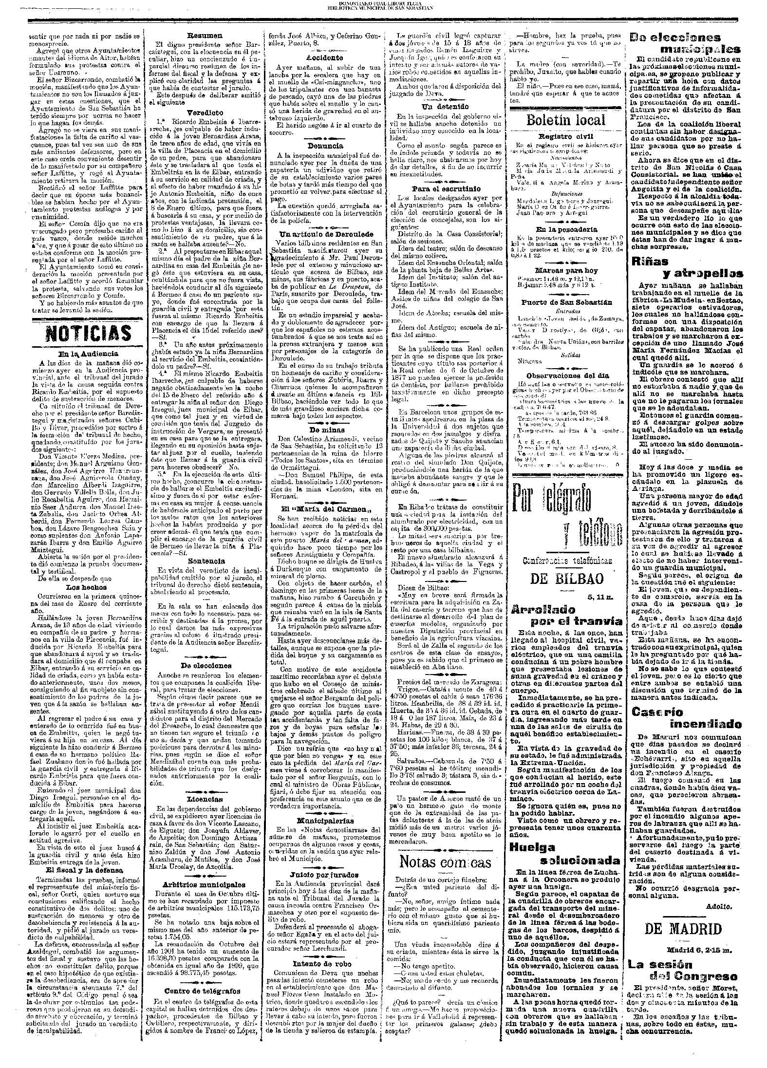.- Nuevo Asilo de San José. En el magnifico paseo de los Fueros se está levantando el nuevo y hermoso Asilo en terrenos cedidos por el excelentísimo Ayuntamiento a la Junta de Señoras presidida por doña Desideria Petit Jean, viuda de Elosegui, que en unión de las demás señoras, y luchando con muchos inconvenientes, gracias a su constancia y amor å lacaridad, consiguieron fundar un asilo para niños pobres, que admirablemente administrado, llegó á la mayor perfección. Pero haciase demasiado reducido para las presentes necesidades el local que ocupaban, y solicitaron del excelentísimo Ayuntamiento la concesión de otro terreno más amplio, y nuestro ilustre municipio, como no podía menos, tratándose de señoras que tantos sacrificios han hecho por la doliente humanidad, el dió terreno indicado en el que van á levantar un magnífico edificio en el que quedarán satisfechas todas las necesidades y las aspiraciones propias para un establecimiento mentado según los adelantos del día. Felicitamos a las señoras que componen la referida Junta, y rogamos à Dios les conceda muchos años de salud para que con la misma solicitud y empeño puedan dedicarse á los muchos trabajos que tienen que emprender para ver coronada su obra de recibir las bendiciones de Dios y de los pobres. .- El observatorio del Mendizorrotz Gran Casino El Banco Guipuzcoano El Palacio de Justicia Notable progreso Súplica Felicitaciones