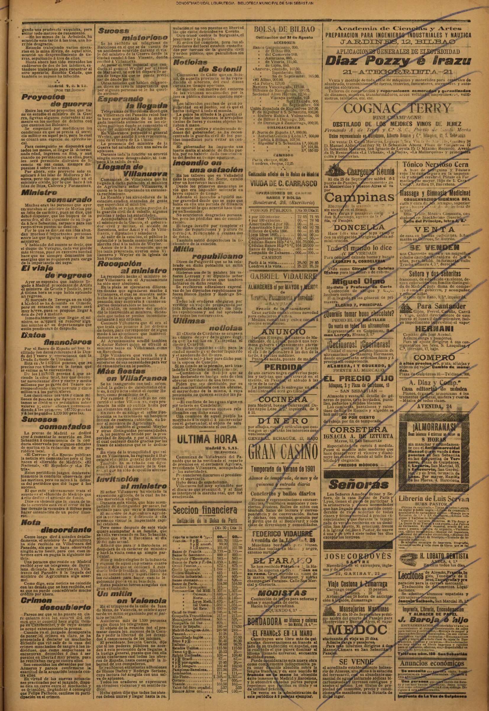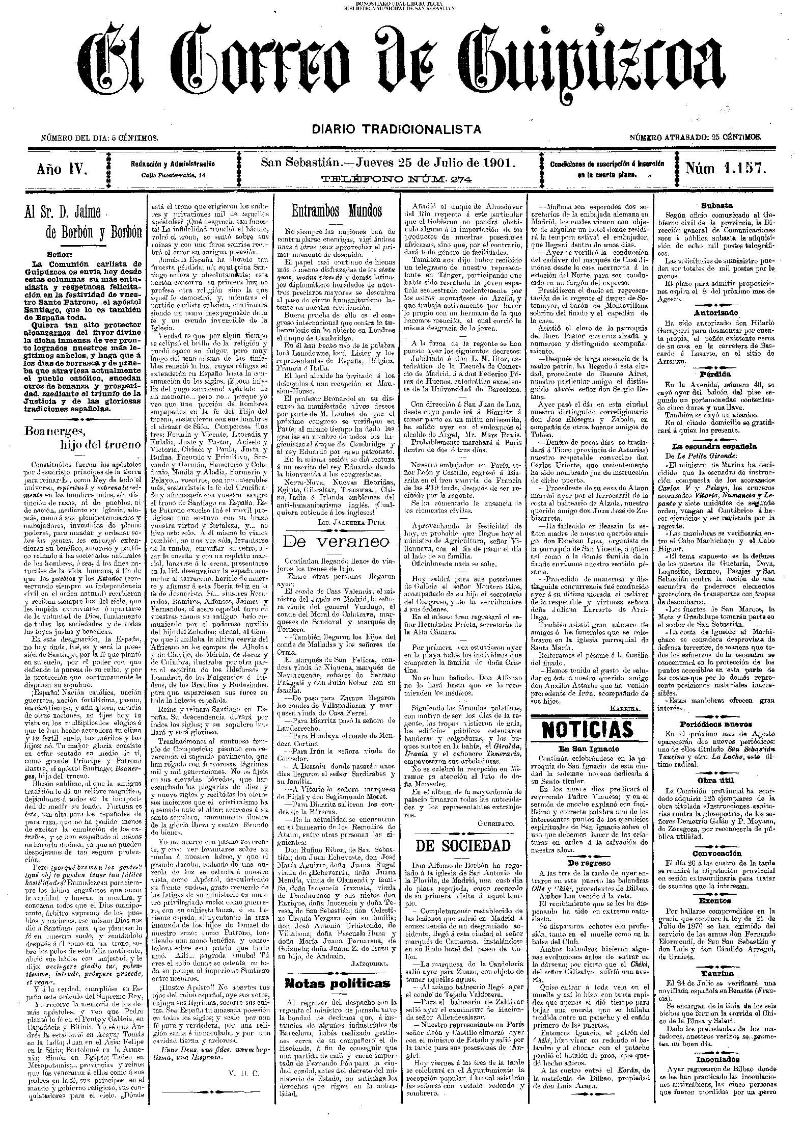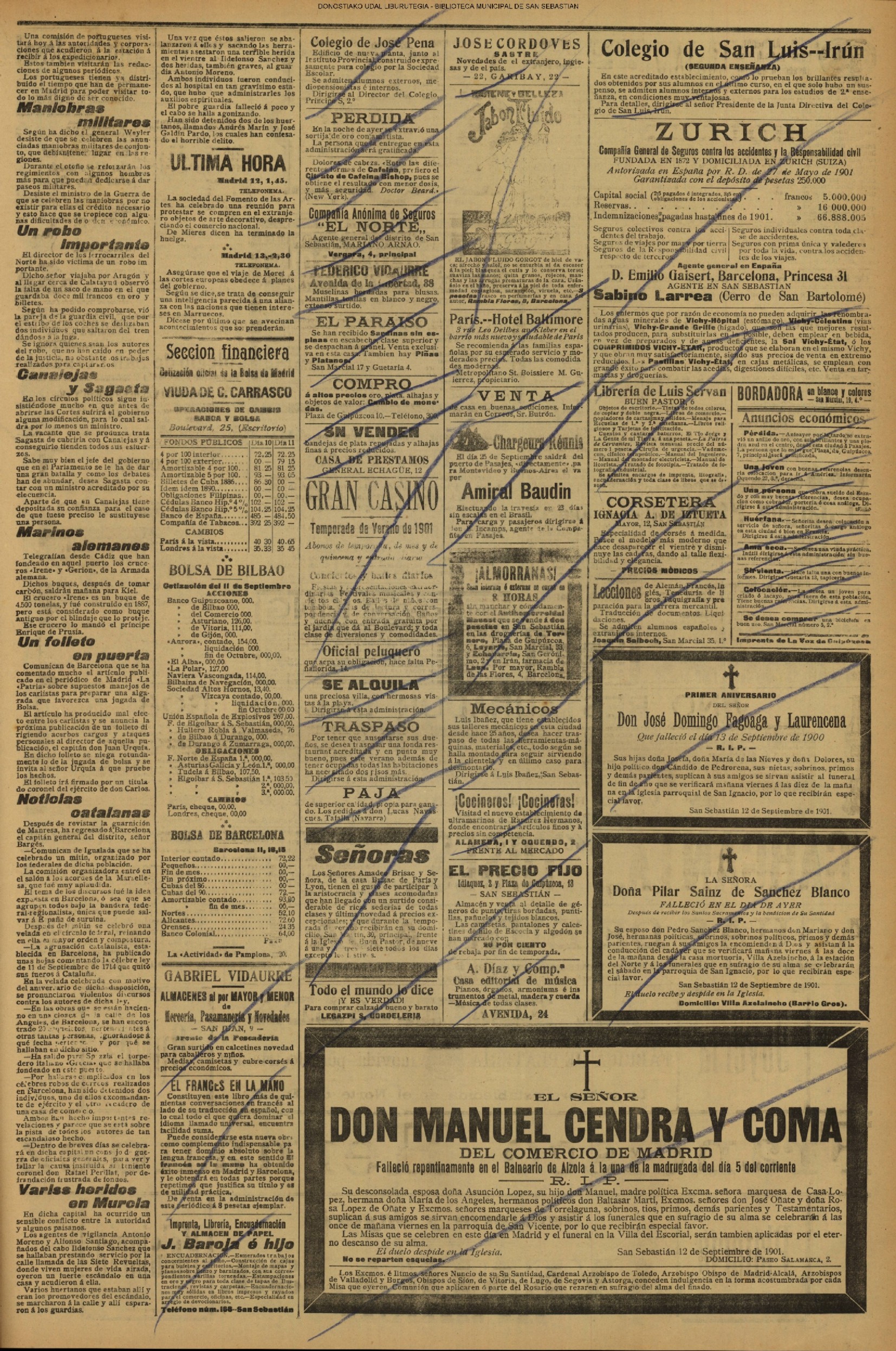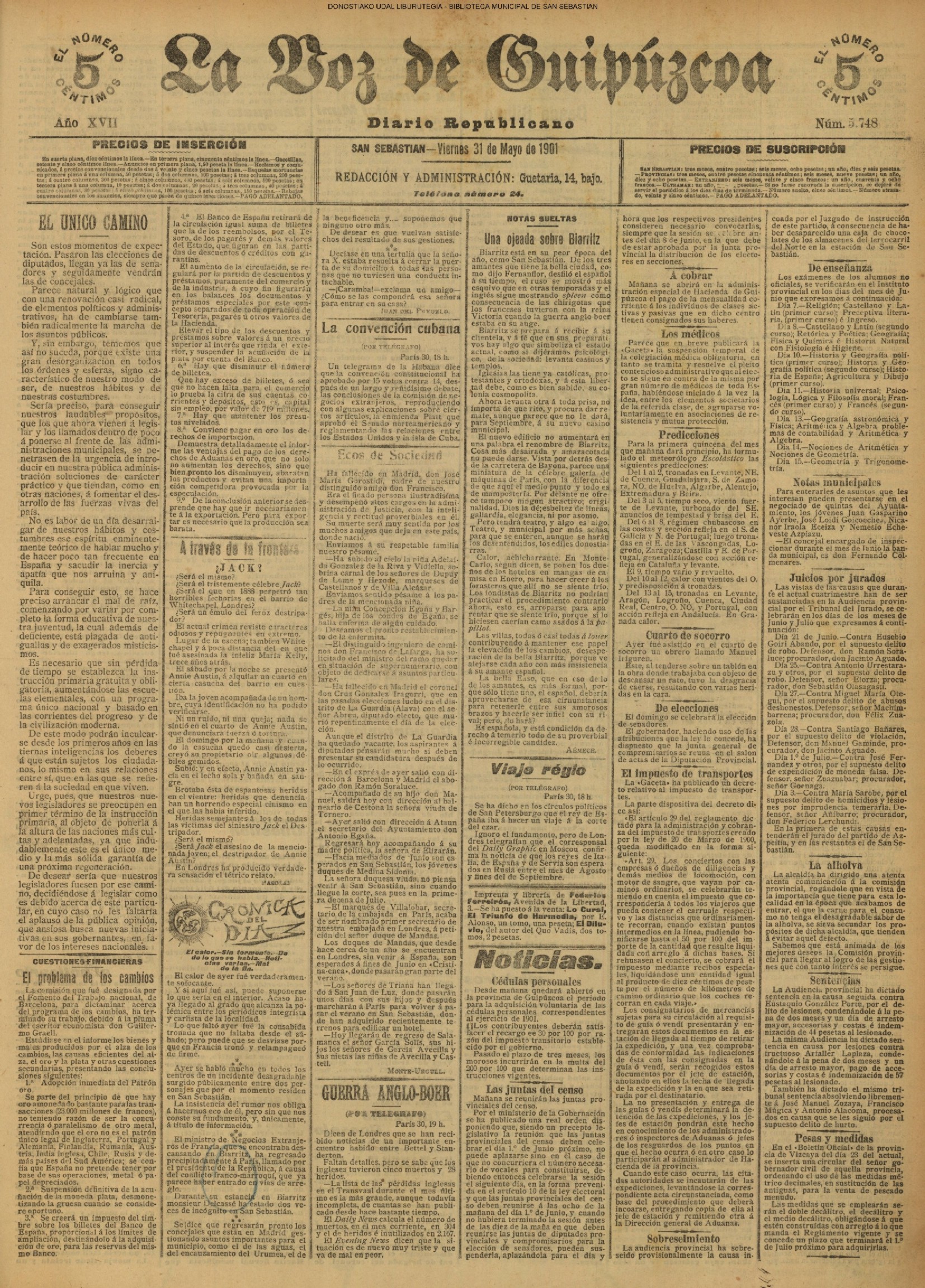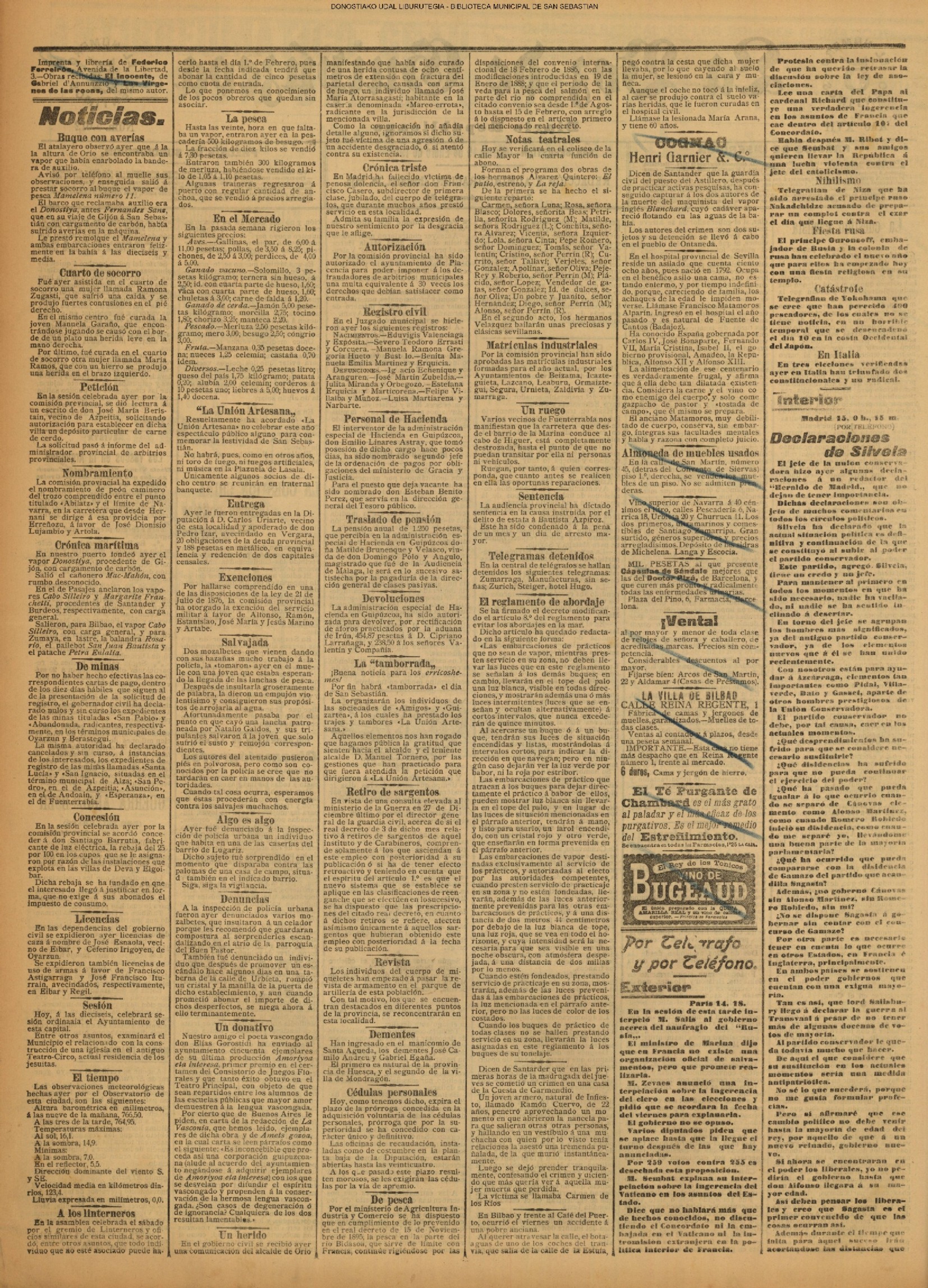 .- Nuevo Asilo de San José. En el magnifico paseo de los Fueros se está levantando el nuevo y hermoso Asilo en terrenos cedidos por el excelentísimo Ayuntamiento a la Junta de Señoras presidida por doña Desideria Petit Jean, viuda de Elosegui, que en unión de las demás señoras, y luchando con muchos inconvenientes, gracias a su constancia y amor å lacaridad, consiguieron fundar un asilo para niños pobres, que admirablemente administrado, llegó á la mayor perfección. Pero haciase demasiado reducido para las presentes necesidades el local que ocupaban, y solicitaron del excelentísimo Ayuntamiento la concesión de otro terreno más amplio, y nuestro ilustre municipio, como no podía menos, tratándose de señoras que tantos sacrificios han hecho por la doliente humanidad, el dió terreno indicado en el que van á levantar un magnífico edificio en el que quedarán satisfechas todas las necesidades y las aspiraciones propias para un establecimiento mentado según los adelantos del día. Felicitamos a las señoras que componen la referida Junta, y rogamos à Dios les conceda muchos años de salud para que con la misma solicitud y empeño puedan dedicarse á los muchos trabajos que tienen que emprender para ver coronada su obra de recibir las bendiciones de Dios y de los pobres. .- El observatorio del Mendizorrotz Gran Casino El Banco Guipuzcoano El Palacio de Justicia Notable progreso Súplica Felicitaciones