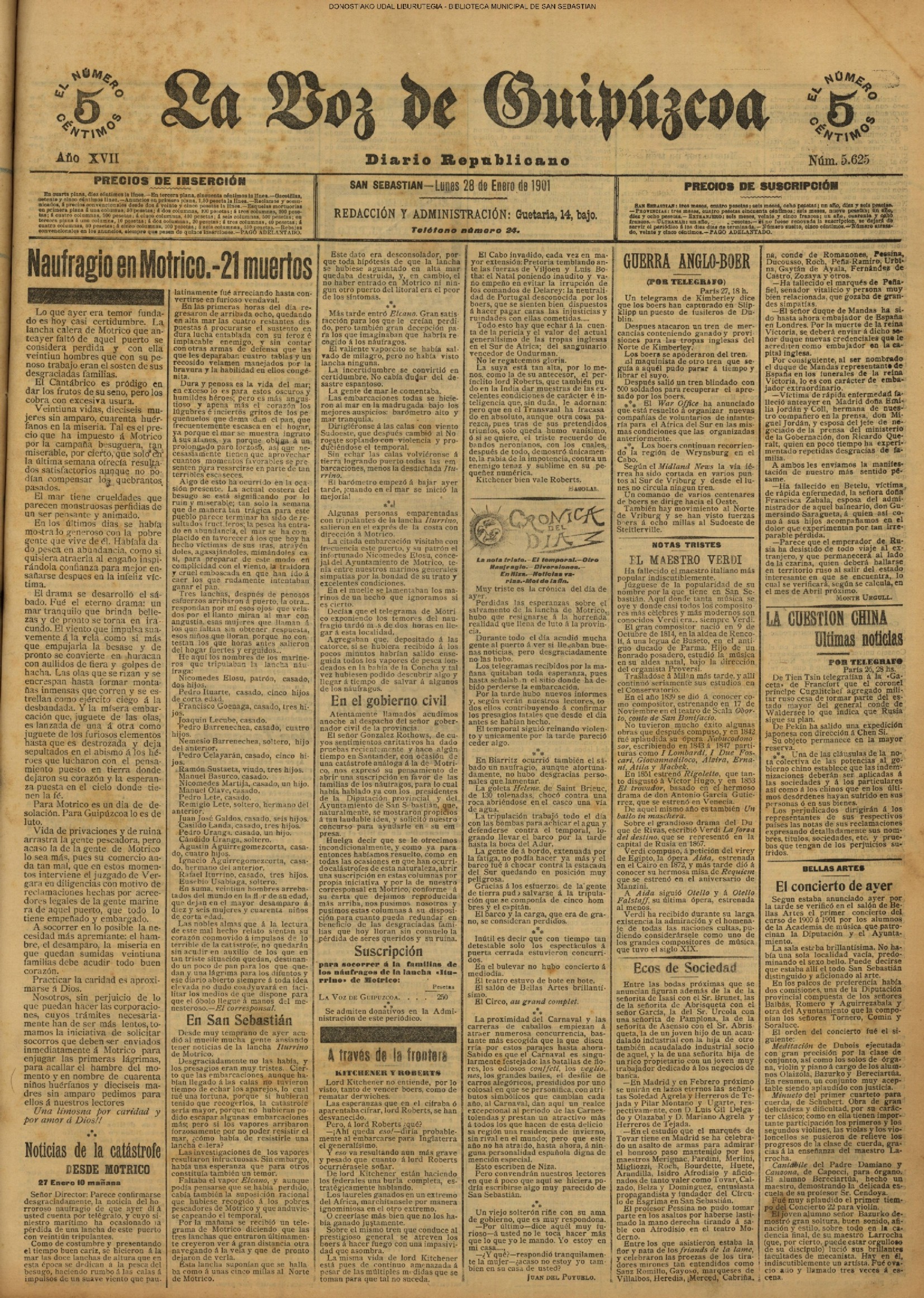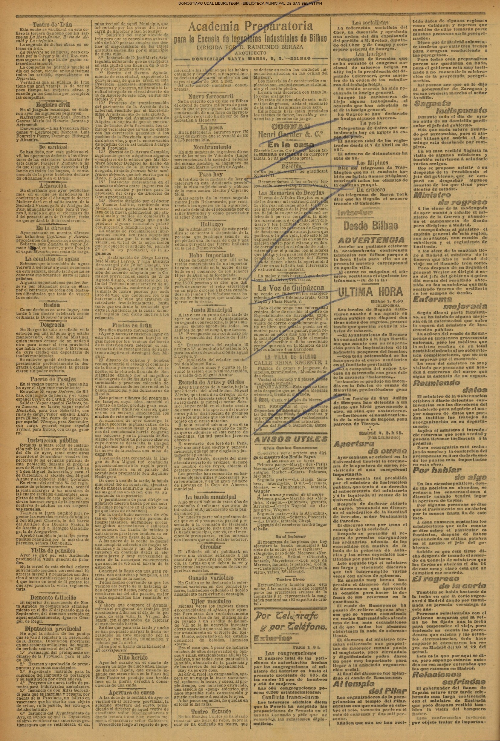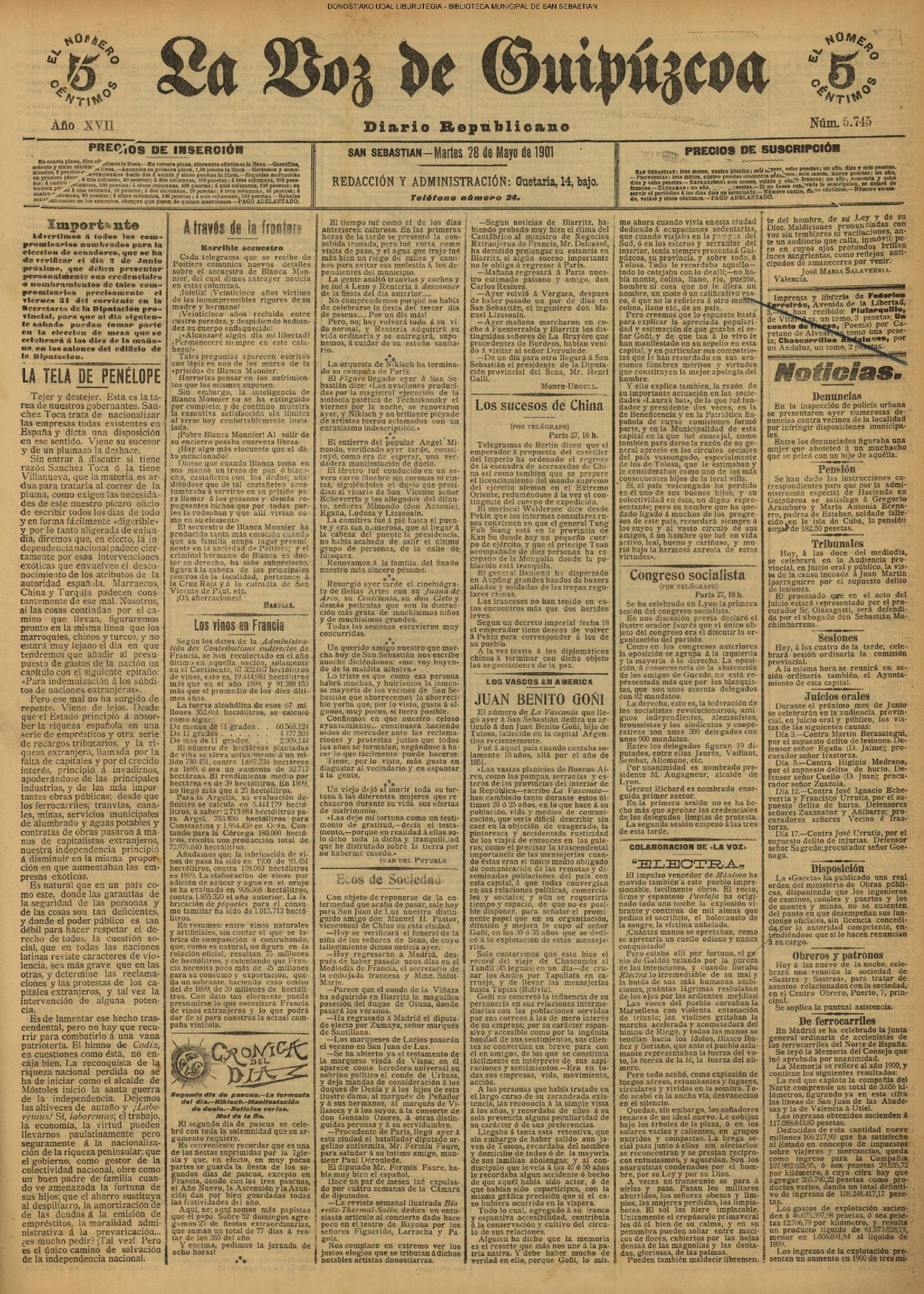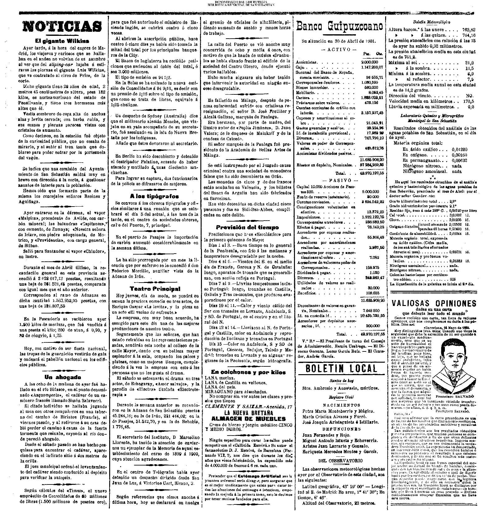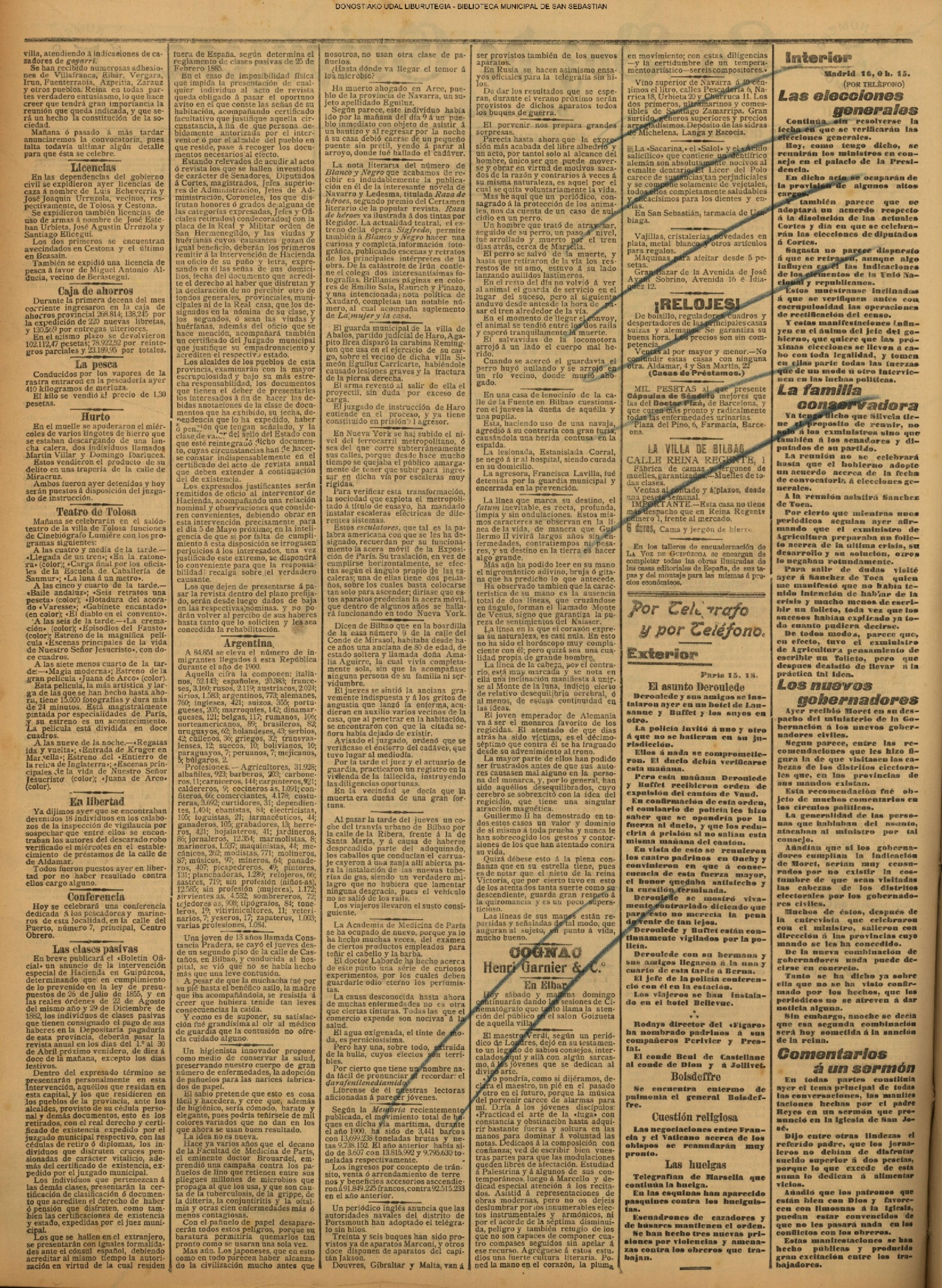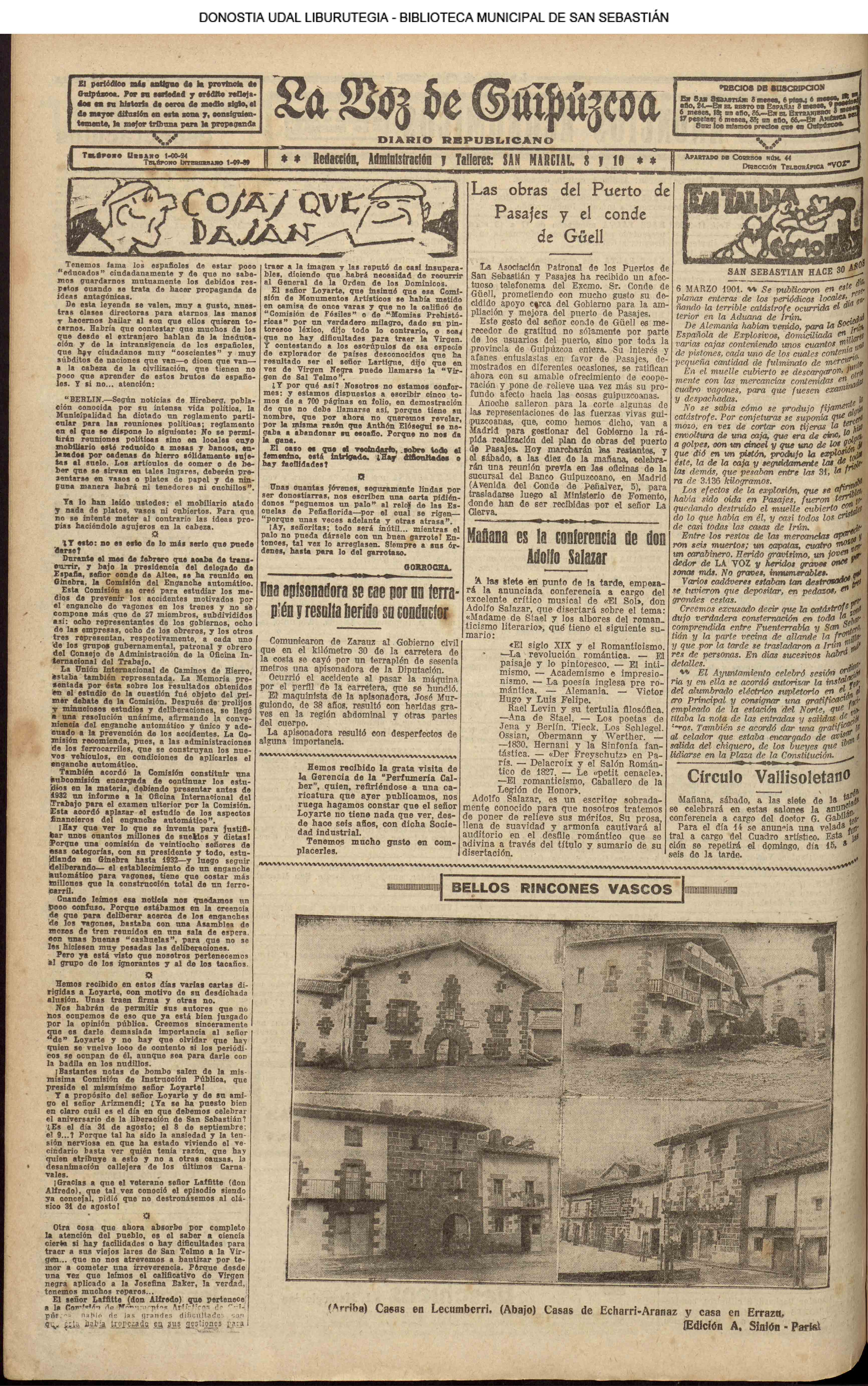 .- Nuevo Asilo de San José. En el magnifico paseo de los Fueros se está levantando el nuevo y hermoso Asilo en terrenos cedidos por el excelentísimo Ayuntamiento a la Junta de Señoras presidida por doña Desideria Petit Jean, viuda de Elosegui, que en unión de las demás señoras, y luchando con muchos inconvenientes, gracias a su constancia y amor å lacaridad, consiguieron fundar un asilo para niños pobres, que admirablemente administrado, llegó á la mayor perfección. Pero haciase demasiado reducido para las presentes necesidades el local que ocupaban, y solicitaron del excelentísimo Ayuntamiento la concesión de otro terreno más amplio, y nuestro ilustre municipio, como no podía menos, tratándose de señoras que tantos sacrificios han hecho por la doliente humanidad, el dió terreno indicado en el que van á levantar un magnífico edificio en el que quedarán satisfechas todas las necesidades y las aspiraciones propias para un establecimiento mentado según los adelantos del día. Felicitamos a las señoras que componen la referida Junta, y rogamos à Dios les conceda muchos años de salud para que con la misma solicitud y empeño puedan dedicarse á los muchos trabajos que tienen que emprender para ver coronada su obra de recibir las bendiciones de Dios y de los pobres. .- El observatorio del Mendizorrotz Gran Casino El Banco Guipuzcoano El Palacio de Justicia Notable progreso Súplica Felicitaciones