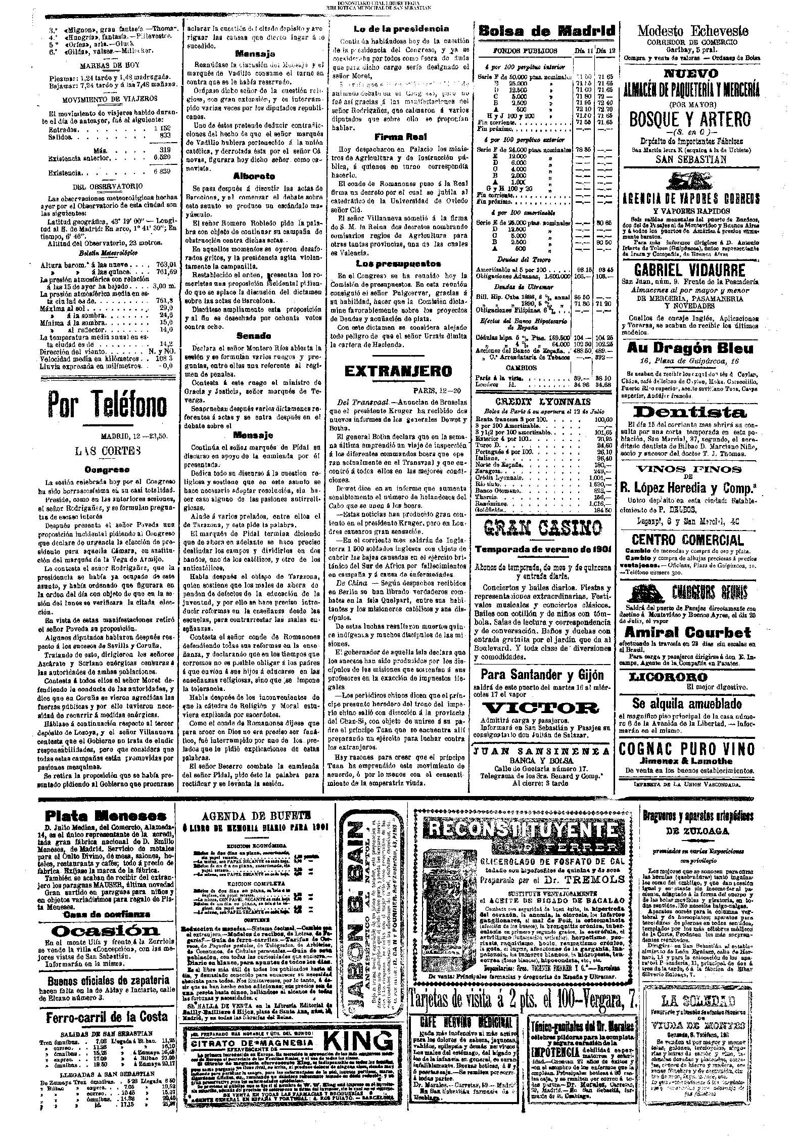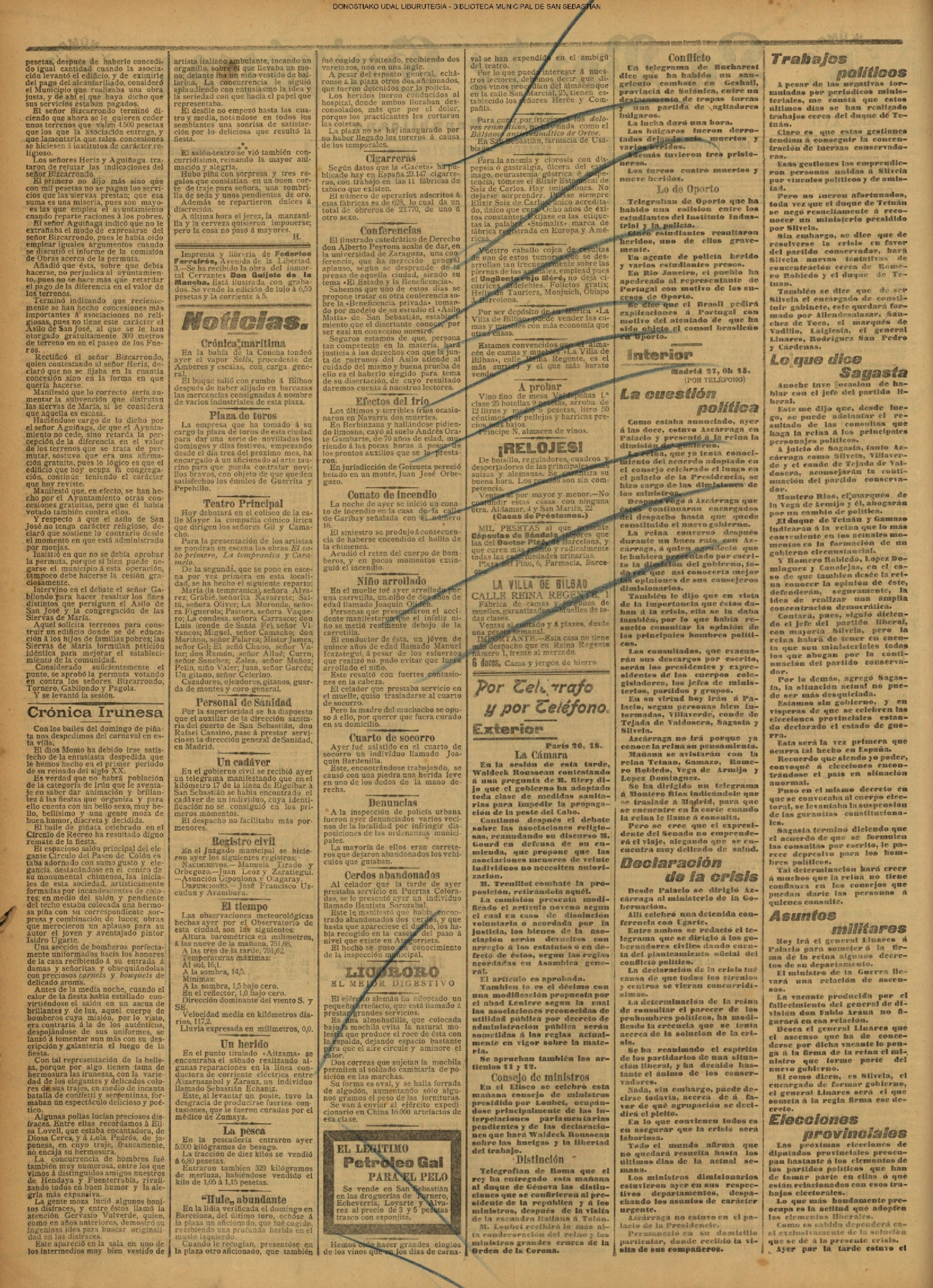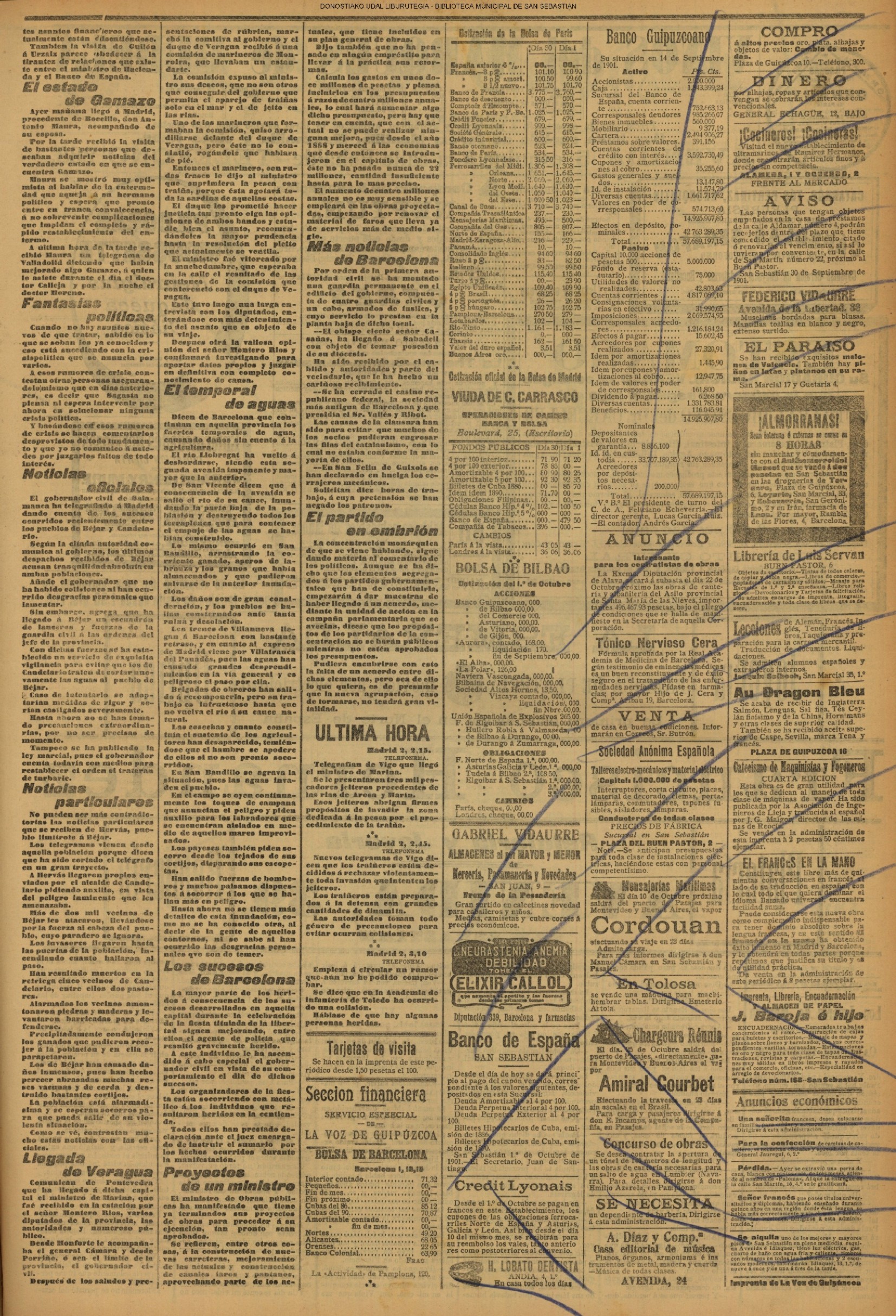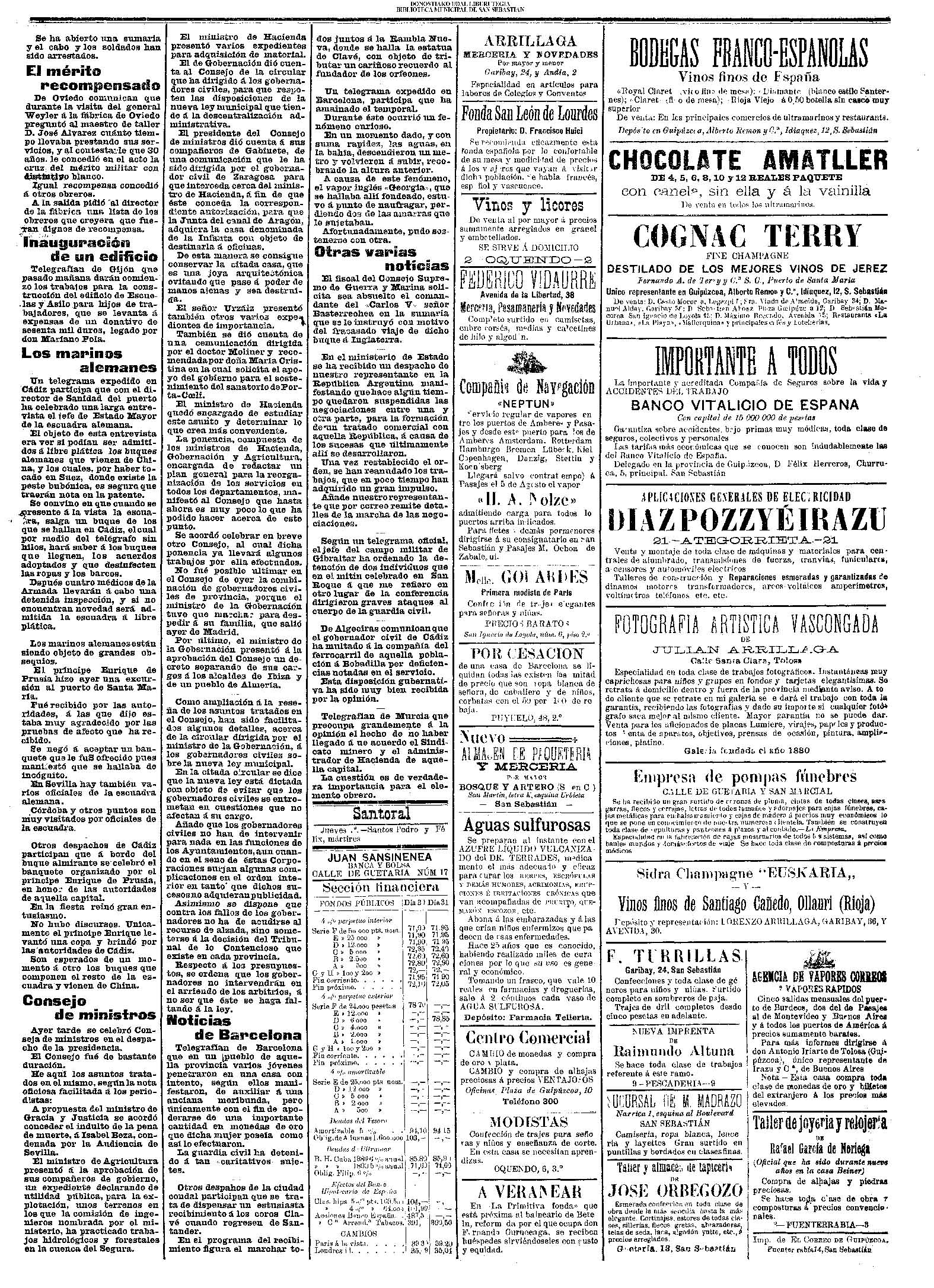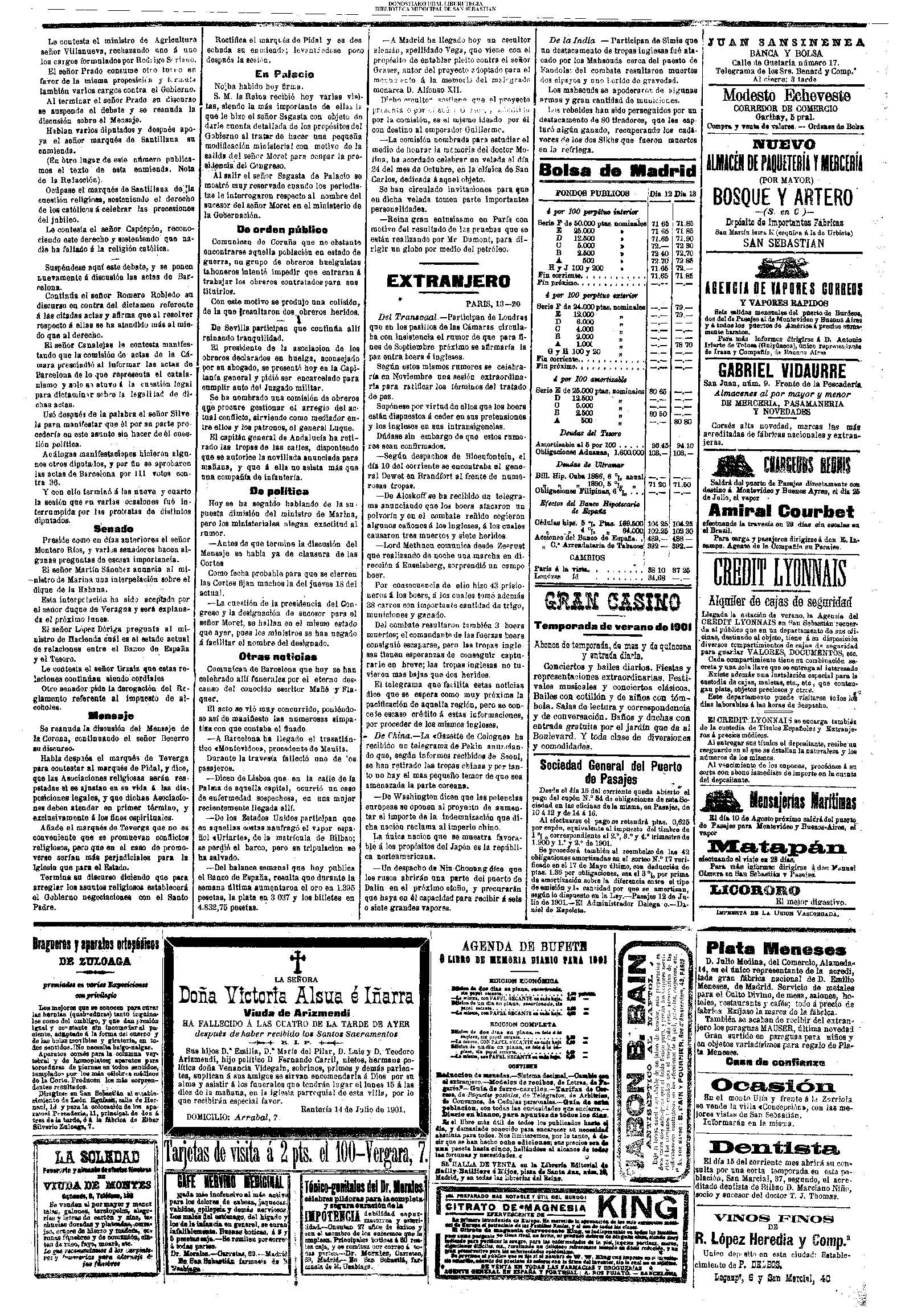 .- Nuevo Asilo de San José. En el magnifico paseo de los Fueros se está levantando el nuevo y hermoso Asilo en terrenos cedidos por el excelentísimo Ayuntamiento a la Junta de Señoras presidida por doña Desideria Petit Jean, viuda de Elosegui, que en unión de las demás señoras, y luchando con muchos inconvenientes, gracias a su constancia y amor å lacaridad, consiguieron fundar un asilo para niños pobres, que admirablemente administrado, llegó á la mayor perfección. Pero haciase demasiado reducido para las presentes necesidades el local que ocupaban, y solicitaron del excelentísimo Ayuntamiento la concesión de otro terreno más amplio, y nuestro ilustre municipio, como no podía menos, tratándose de señoras que tantos sacrificios han hecho por la doliente humanidad, el dió terreno indicado en el que van á levantar un magnífico edificio en el que quedarán satisfechas todas las necesidades y las aspiraciones propias para un establecimiento mentado según los adelantos del día. Felicitamos a las señoras que componen la referida Junta, y rogamos à Dios les conceda muchos años de salud para que con la misma solicitud y empeño puedan dedicarse á los muchos trabajos que tienen que emprender para ver coronada su obra de recibir las bendiciones de Dios y de los pobres. .- El observatorio del Mendizorrotz Gran Casino El Banco Guipuzcoano El Palacio de Justicia Notable progreso Súplica Felicitaciones