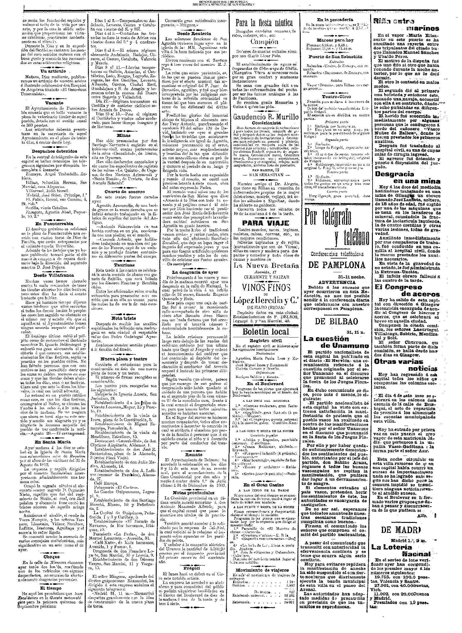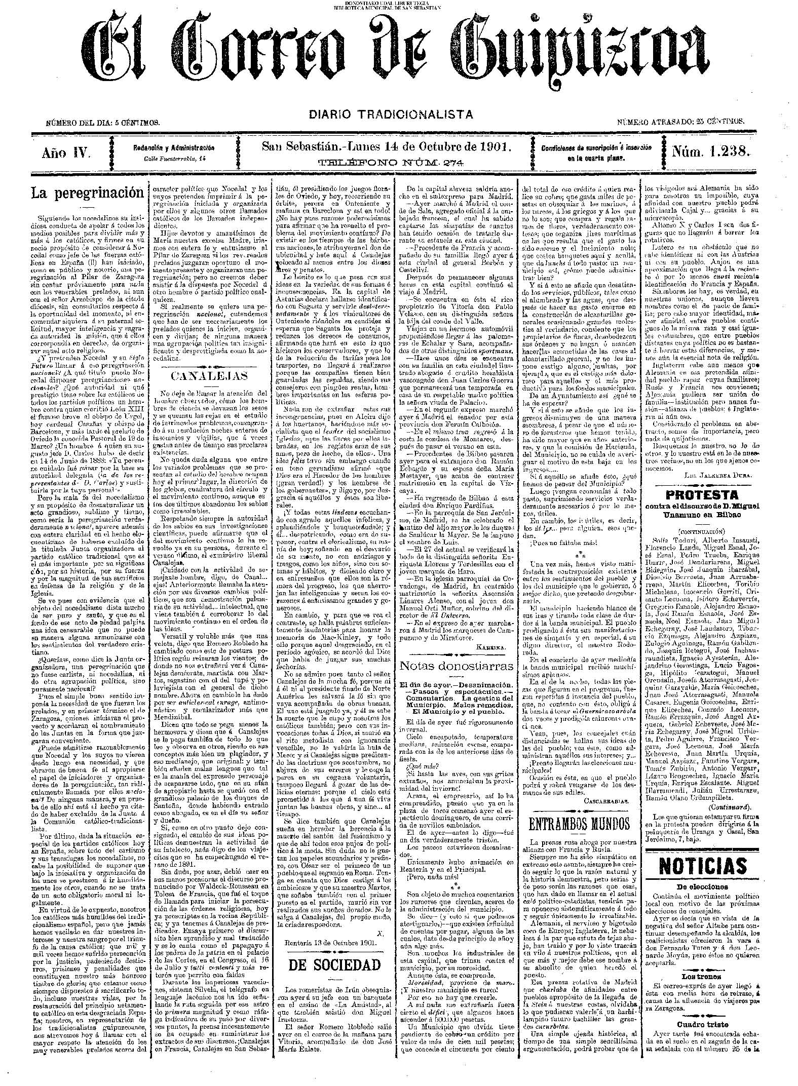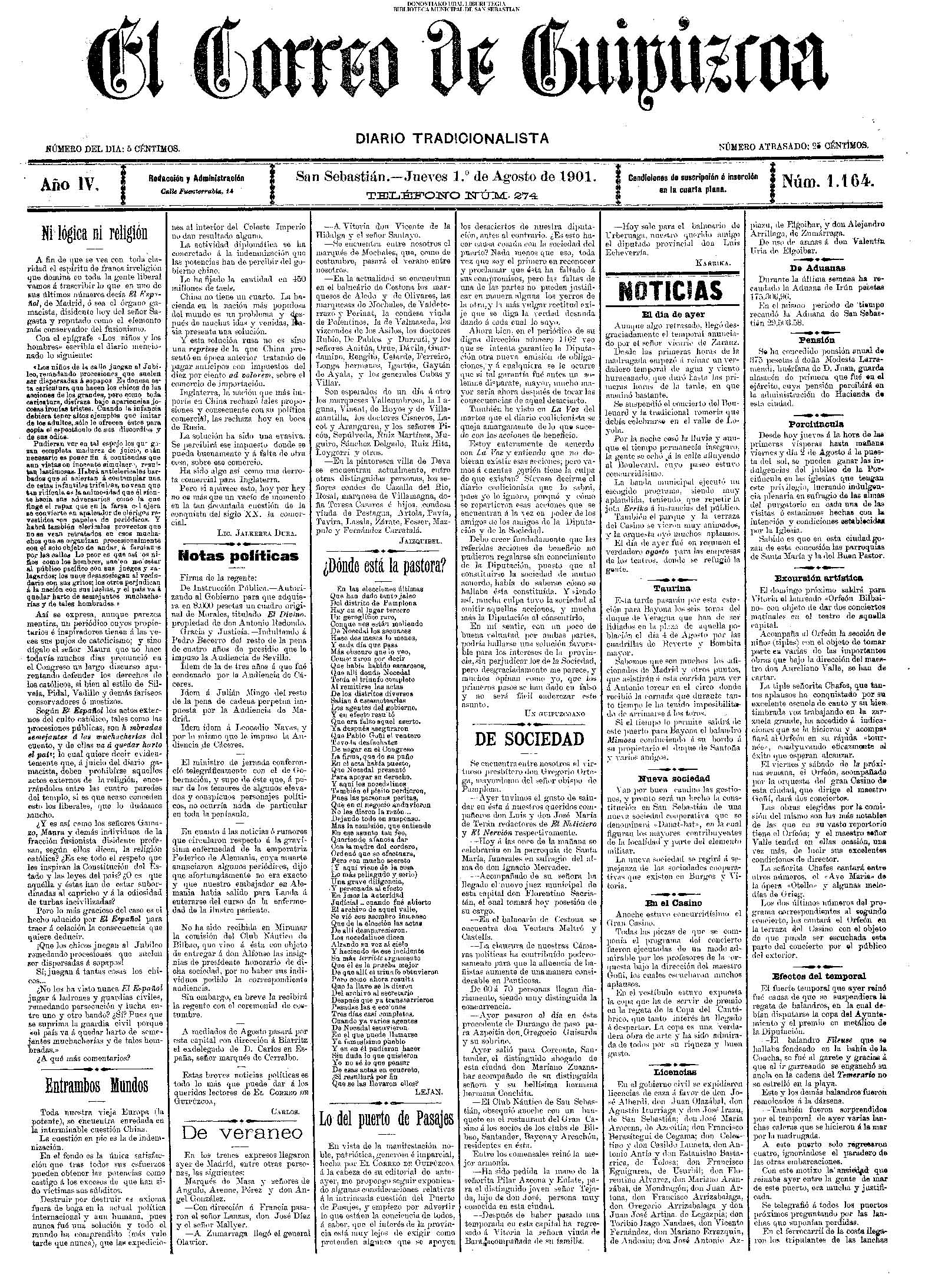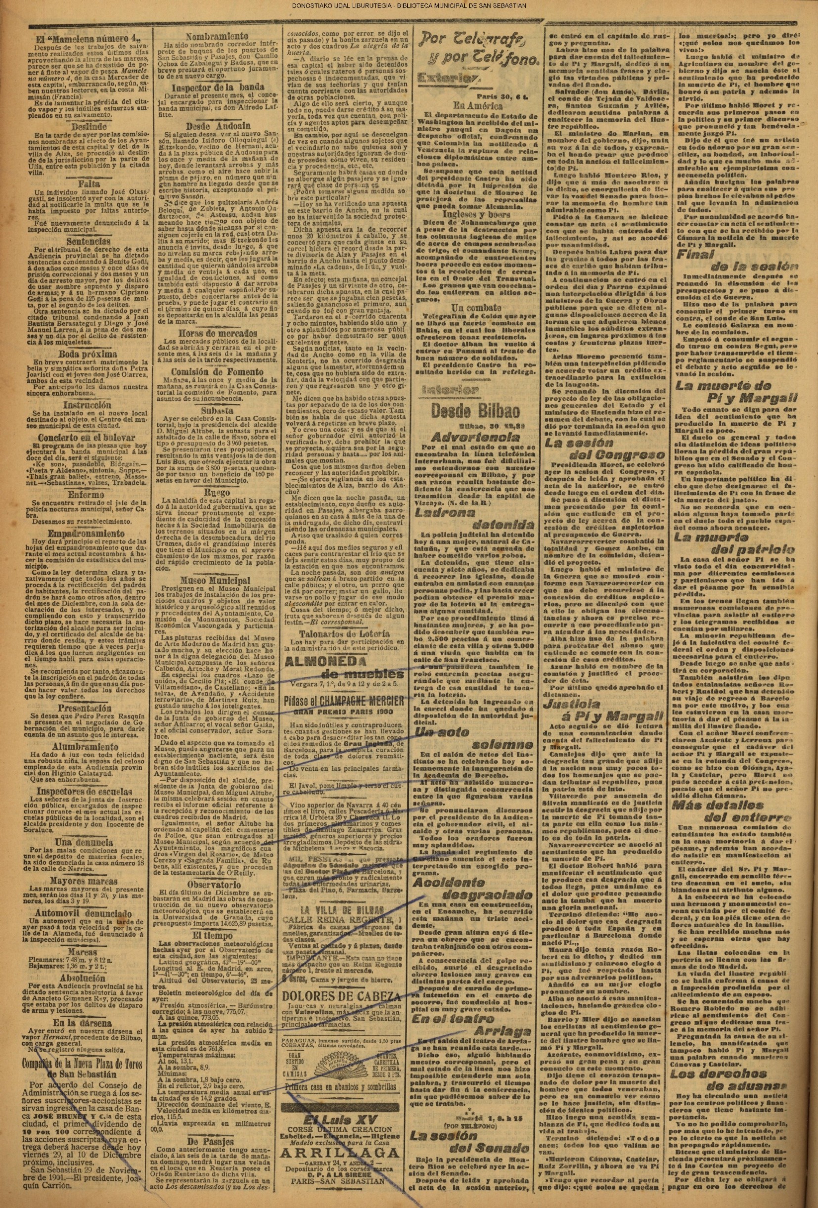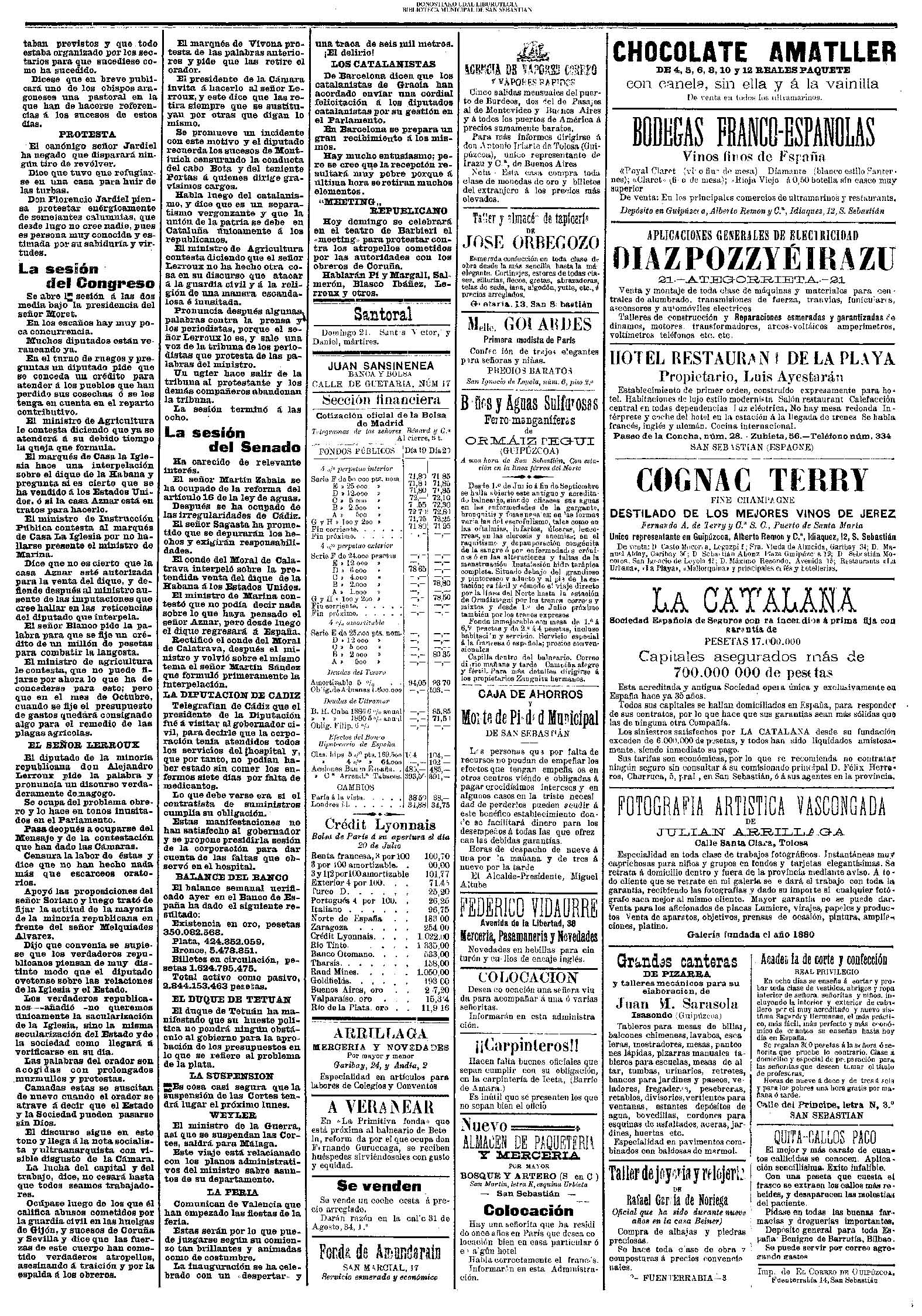 .- Nuevo Asilo de San José. En el magnifico paseo de los Fueros se está levantando el nuevo y hermoso Asilo en terrenos cedidos por el excelentísimo Ayuntamiento a la Junta de Señoras presidida por doña Desideria Petit Jean, viuda de Elosegui, que en unión de las demás señoras, y luchando con muchos inconvenientes, gracias a su constancia y amor å lacaridad, consiguieron fundar un asilo para niños pobres, que admirablemente administrado, llegó á la mayor perfección. Pero haciase demasiado reducido para las presentes necesidades el local que ocupaban, y solicitaron del excelentísimo Ayuntamiento la concesión de otro terreno más amplio, y nuestro ilustre municipio, como no podía menos, tratándose de señoras que tantos sacrificios han hecho por la doliente humanidad, el dió terreno indicado en el que van á levantar un magnífico edificio en el que quedarán satisfechas todas las necesidades y las aspiraciones propias para un establecimiento mentado según los adelantos del día. Felicitamos a las señoras que componen la referida Junta, y rogamos à Dios les conceda muchos años de salud para que con la misma solicitud y empeño puedan dedicarse á los muchos trabajos que tienen que emprender para ver coronada su obra de recibir las bendiciones de Dios y de los pobres. .- El observatorio del Mendizorrotz Gran Casino El Banco Guipuzcoano El Palacio de Justicia Notable progreso Súplica Felicitaciones