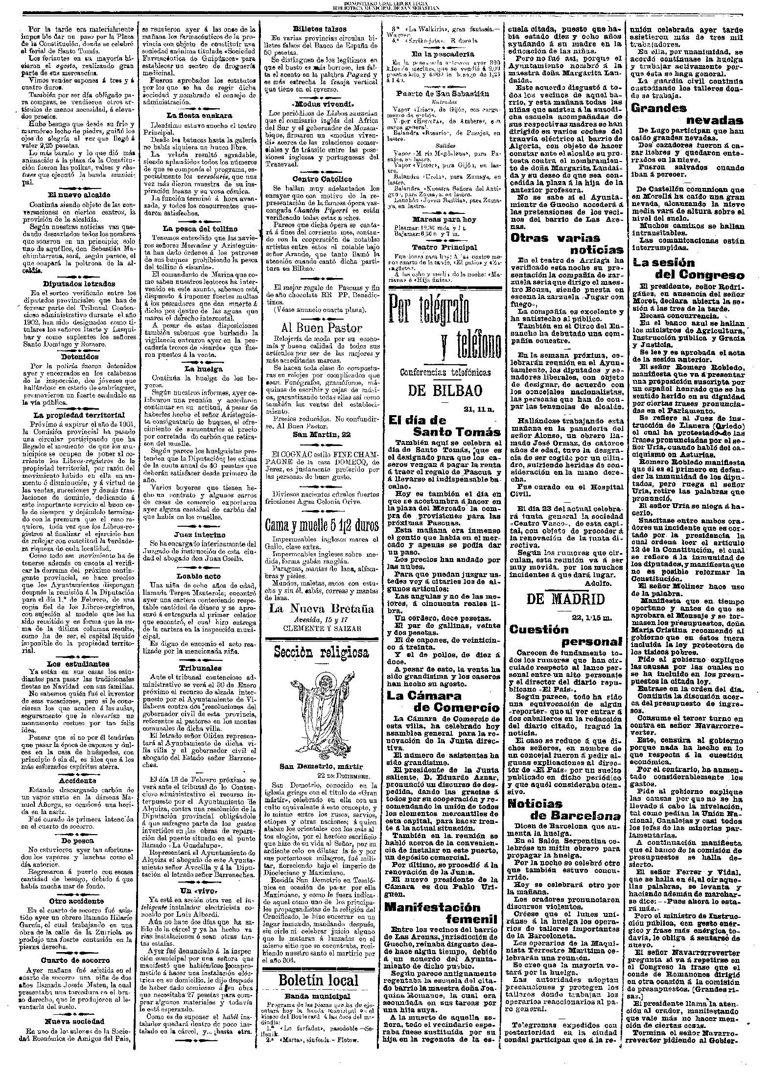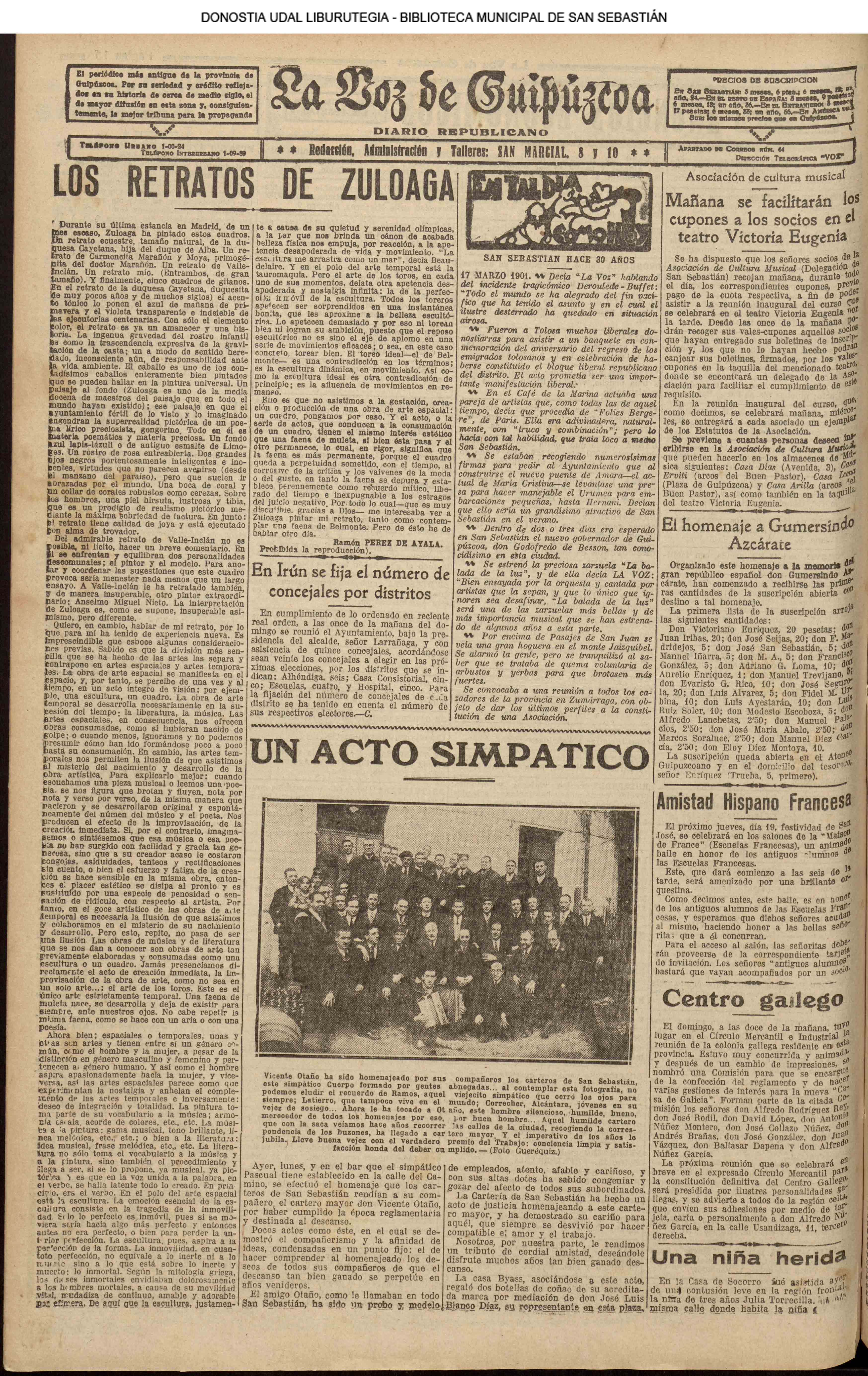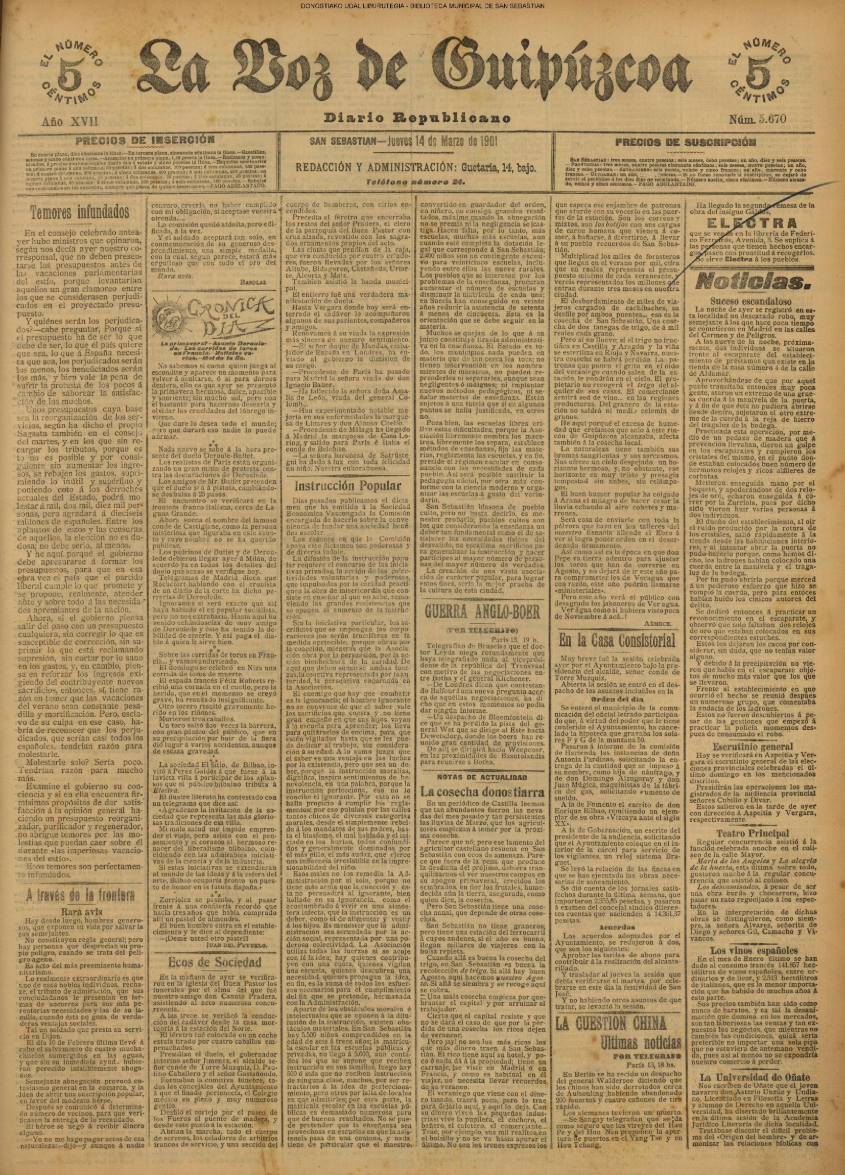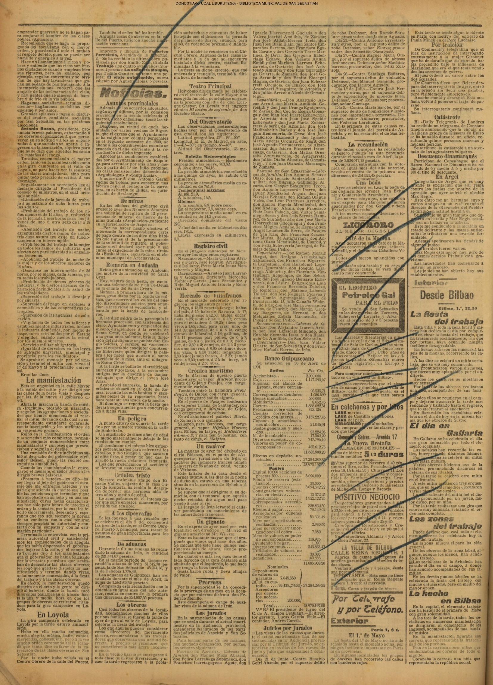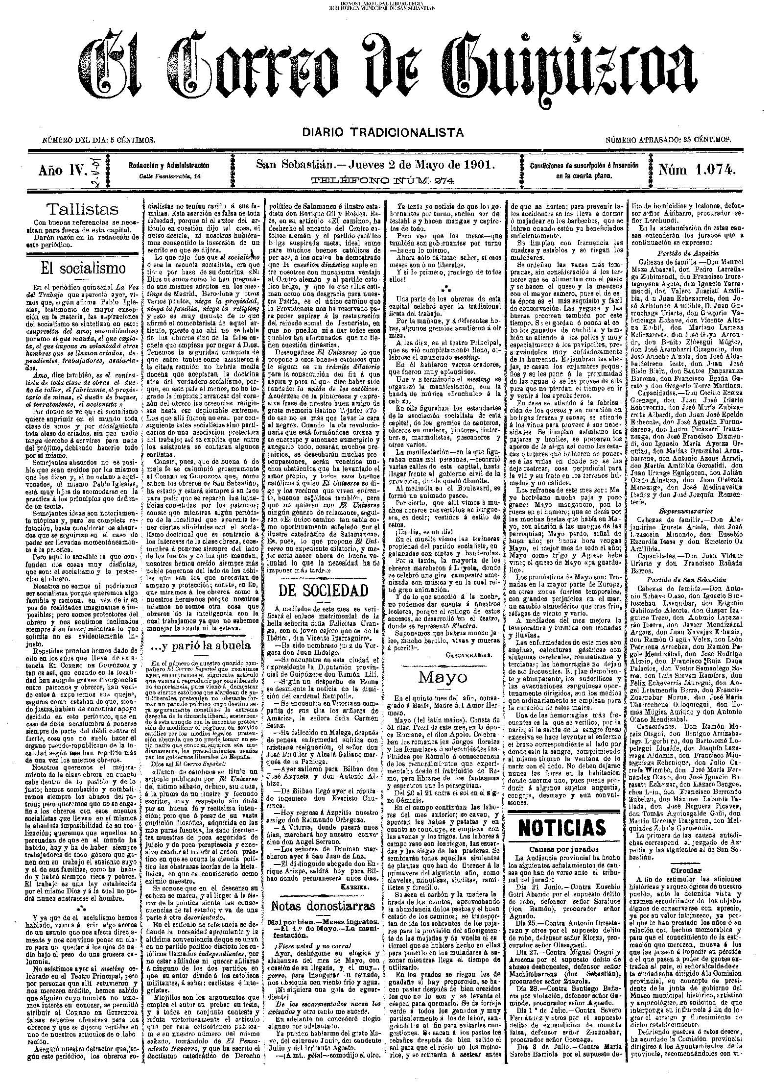 .- Nuevo Asilo de San José. En el magnifico paseo de los Fueros se está levantando el nuevo y hermoso Asilo en terrenos cedidos por el excelentísimo Ayuntamiento a la Junta de Señoras presidida por doña Desideria Petit Jean, viuda de Elosegui, que en unión de las demás señoras, y luchando con muchos inconvenientes, gracias a su constancia y amor å lacaridad, consiguieron fundar un asilo para niños pobres, que admirablemente administrado, llegó á la mayor perfección. Pero haciase demasiado reducido para las presentes necesidades el local que ocupaban, y solicitaron del excelentísimo Ayuntamiento la concesión de otro terreno más amplio, y nuestro ilustre municipio, como no podía menos, tratándose de señoras que tantos sacrificios han hecho por la doliente humanidad, el dió terreno indicado en el que van á levantar un magnífico edificio en el que quedarán satisfechas todas las necesidades y las aspiraciones propias para un establecimiento mentado según los adelantos del día. Felicitamos a las señoras que componen la referida Junta, y rogamos à Dios les conceda muchos años de salud para que con la misma solicitud y empeño puedan dedicarse á los muchos trabajos que tienen que emprender para ver coronada su obra de recibir las bendiciones de Dios y de los pobres. .- El observatorio del Mendizorrotz Gran Casino El Banco Guipuzcoano El Palacio de Justicia Notable progreso Súplica Felicitaciones