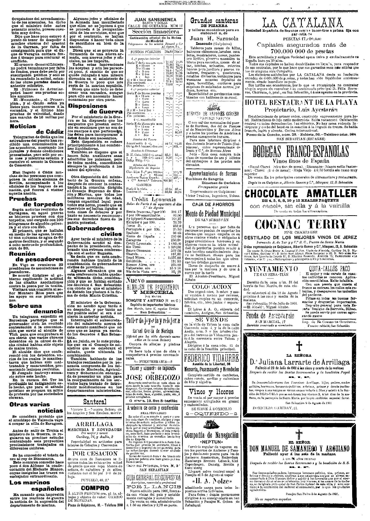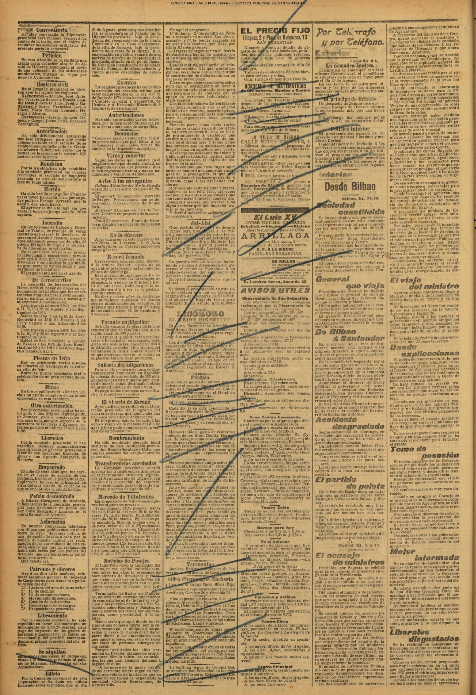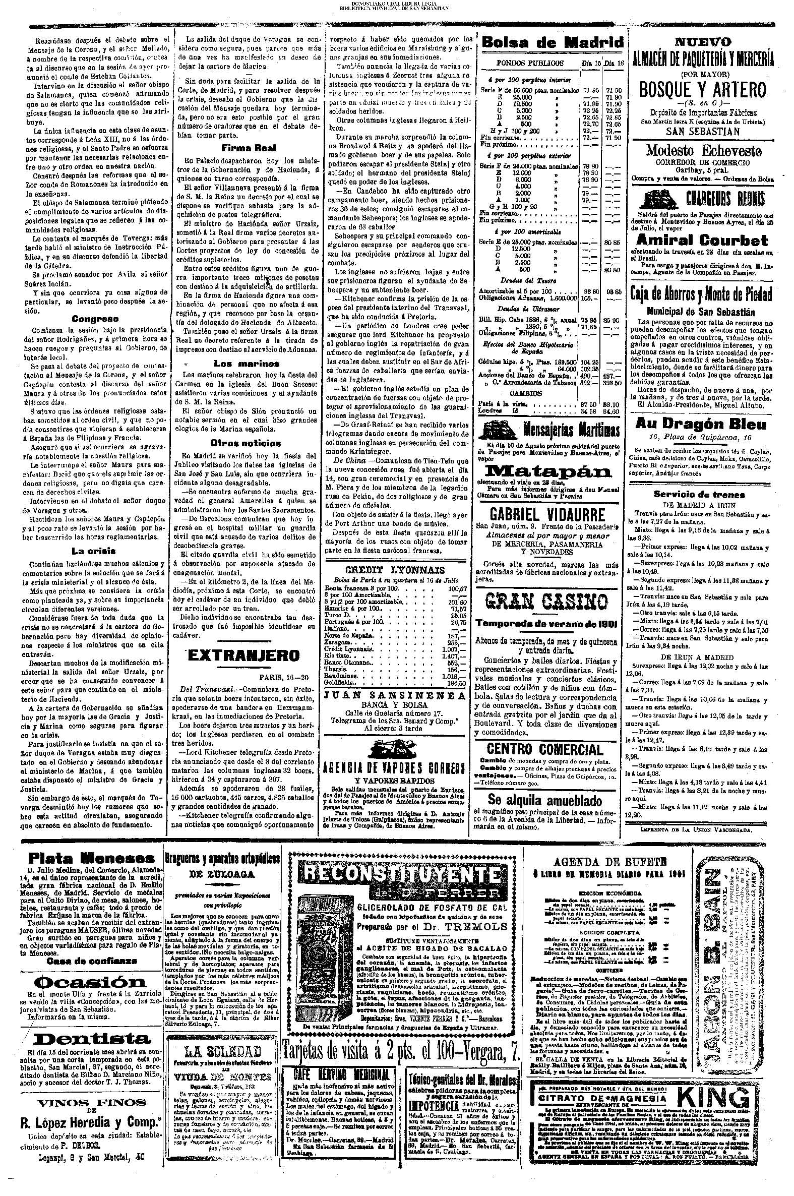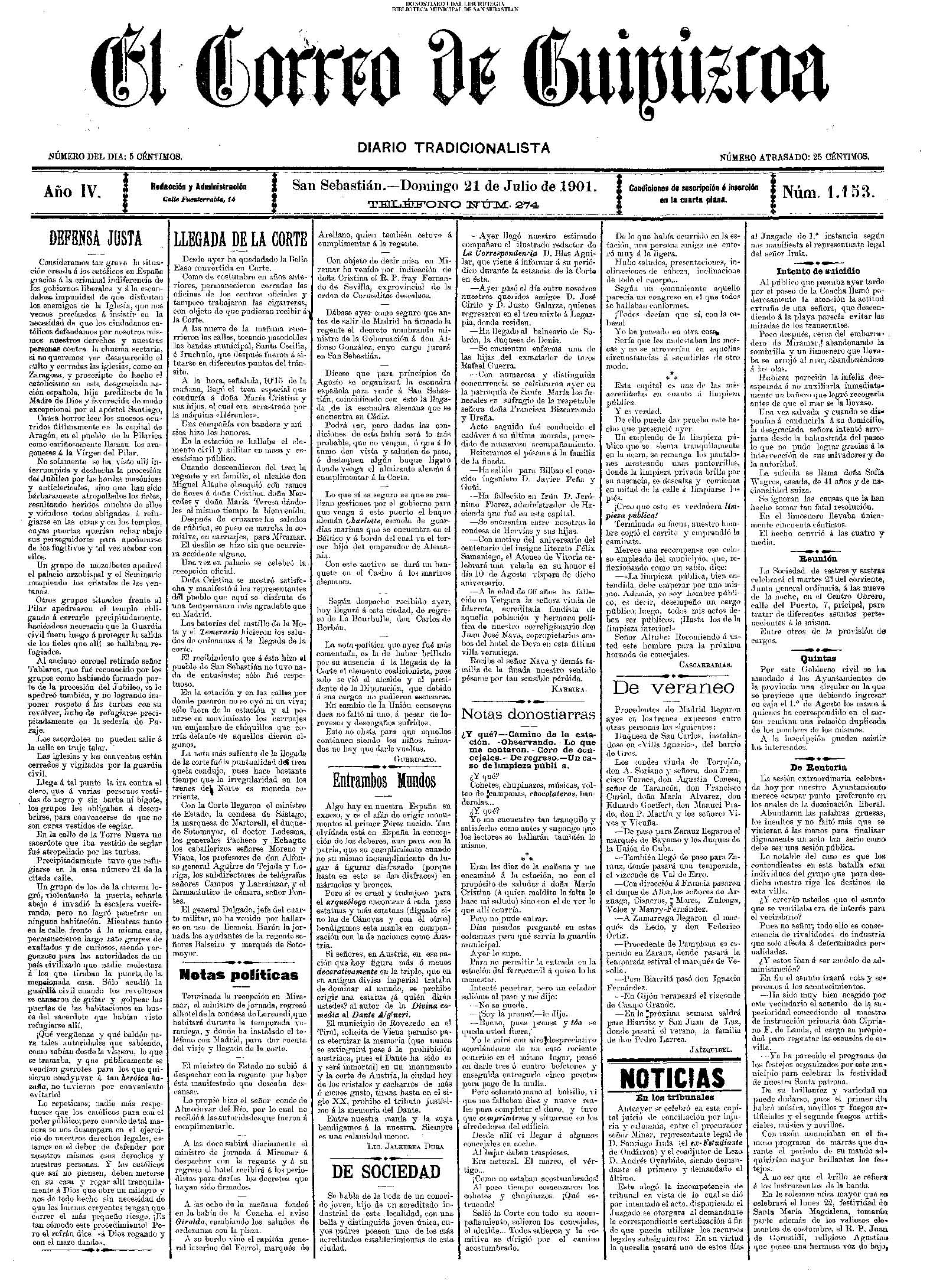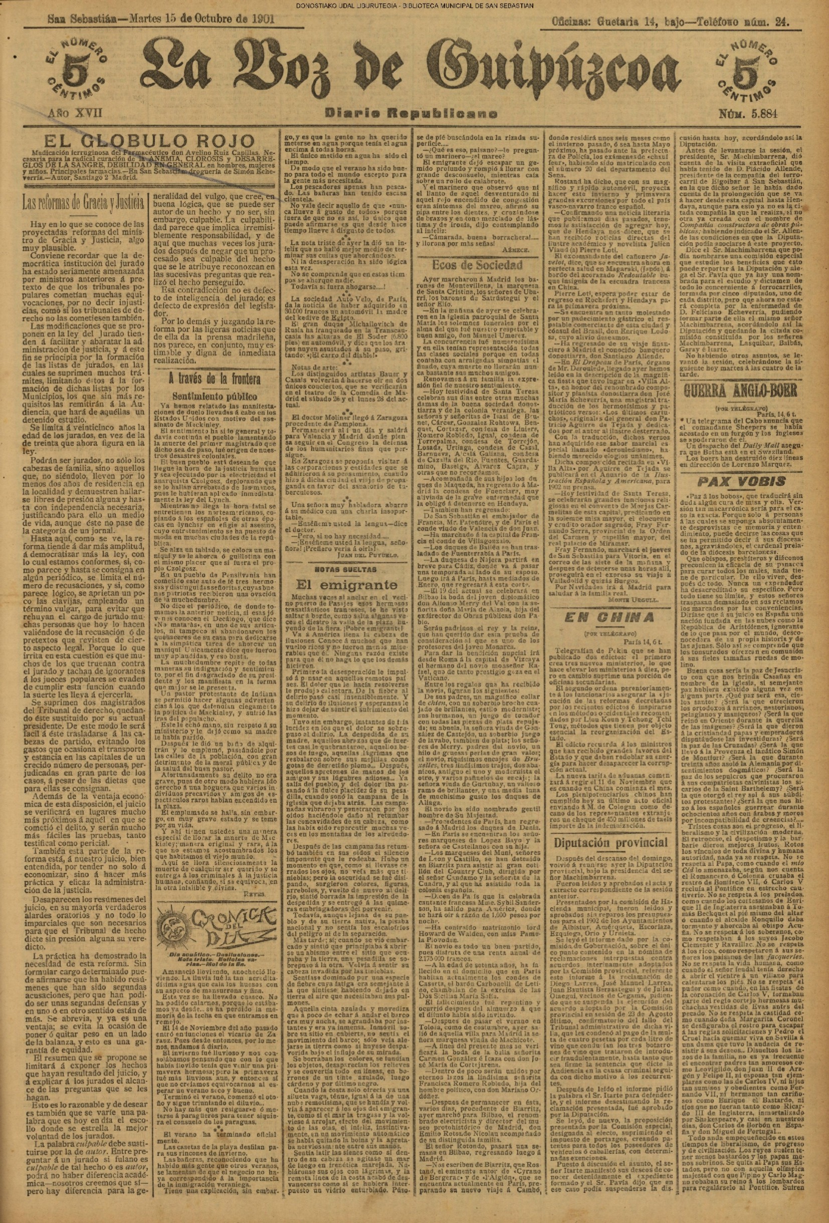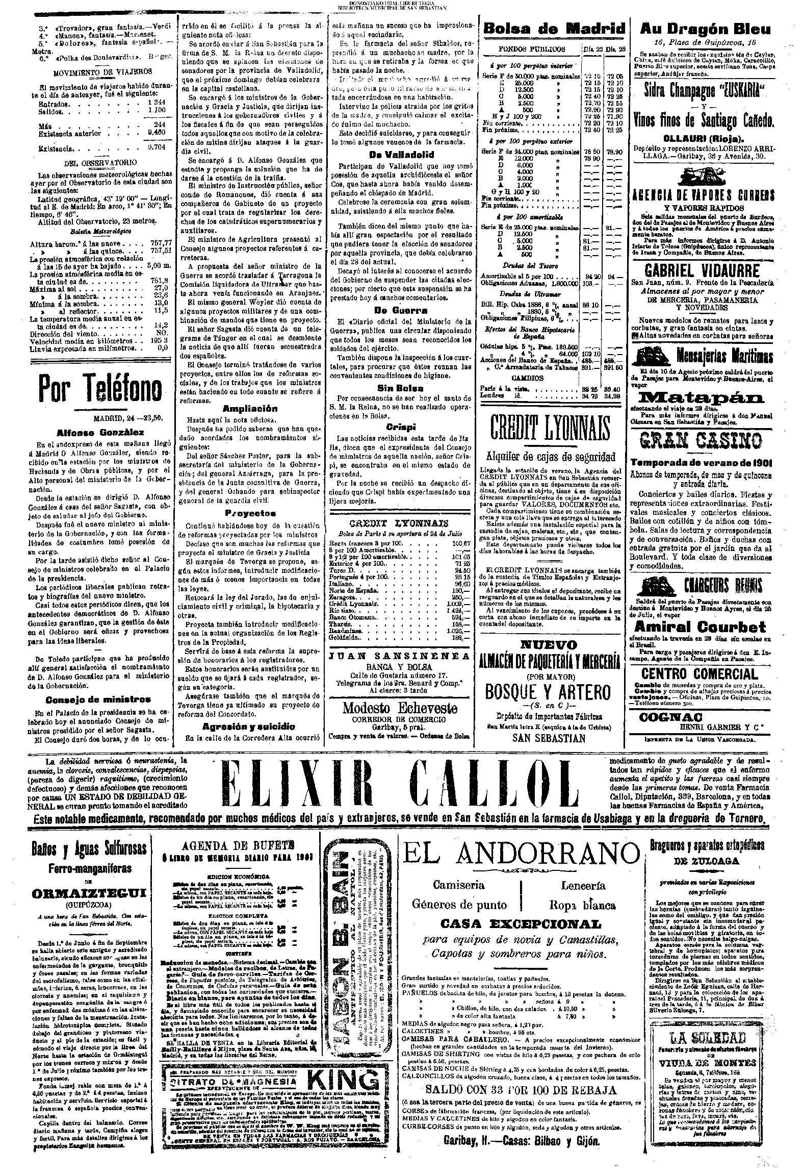 .- Nuevo Asilo de San José. En el magnifico paseo de los Fueros se está levantando el nuevo y hermoso Asilo en terrenos cedidos por el excelentísimo Ayuntamiento a la Junta de Señoras presidida por doña Desideria Petit Jean, viuda de Elosegui, que en unión de las demás señoras, y luchando con muchos inconvenientes, gracias a su constancia y amor å lacaridad, consiguieron fundar un asilo para niños pobres, que admirablemente administrado, llegó á la mayor perfección. Pero haciase demasiado reducido para las presentes necesidades el local que ocupaban, y solicitaron del excelentísimo Ayuntamiento la concesión de otro terreno más amplio, y nuestro ilustre municipio, como no podía menos, tratándose de señoras que tantos sacrificios han hecho por la doliente humanidad, el dió terreno indicado en el que van á levantar un magnífico edificio en el que quedarán satisfechas todas las necesidades y las aspiraciones propias para un establecimiento mentado según los adelantos del día. Felicitamos a las señoras que componen la referida Junta, y rogamos à Dios les conceda muchos años de salud para que con la misma solicitud y empeño puedan dedicarse á los muchos trabajos que tienen que emprender para ver coronada su obra de recibir las bendiciones de Dios y de los pobres. .- El observatorio del Mendizorrotz Gran Casino El Banco Guipuzcoano El Palacio de Justicia Notable progreso Súplica Felicitaciones