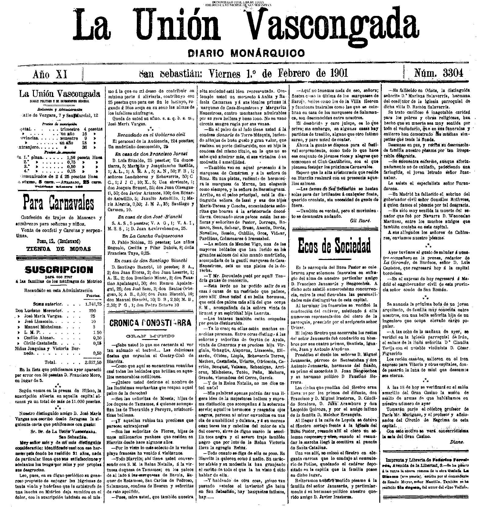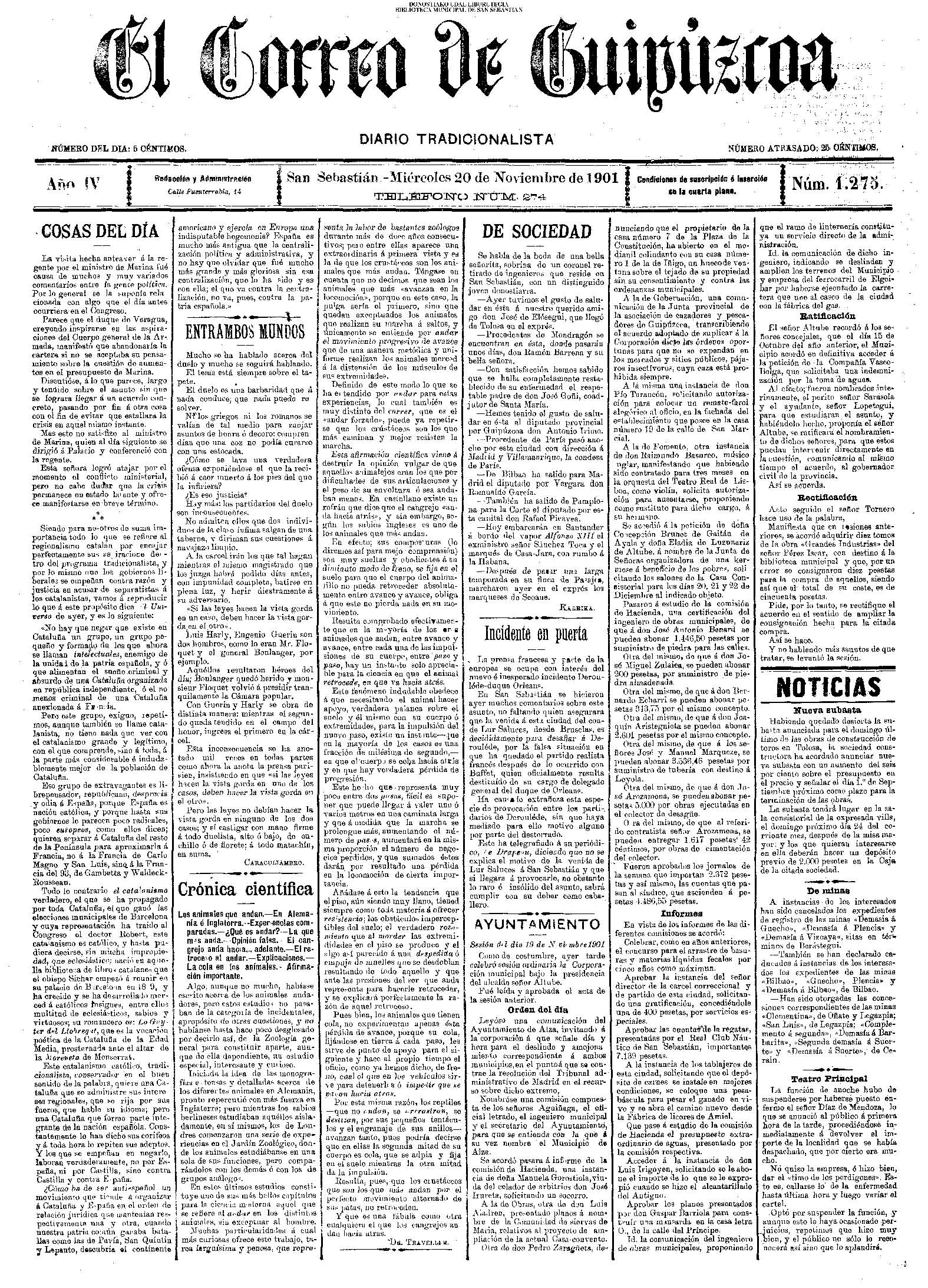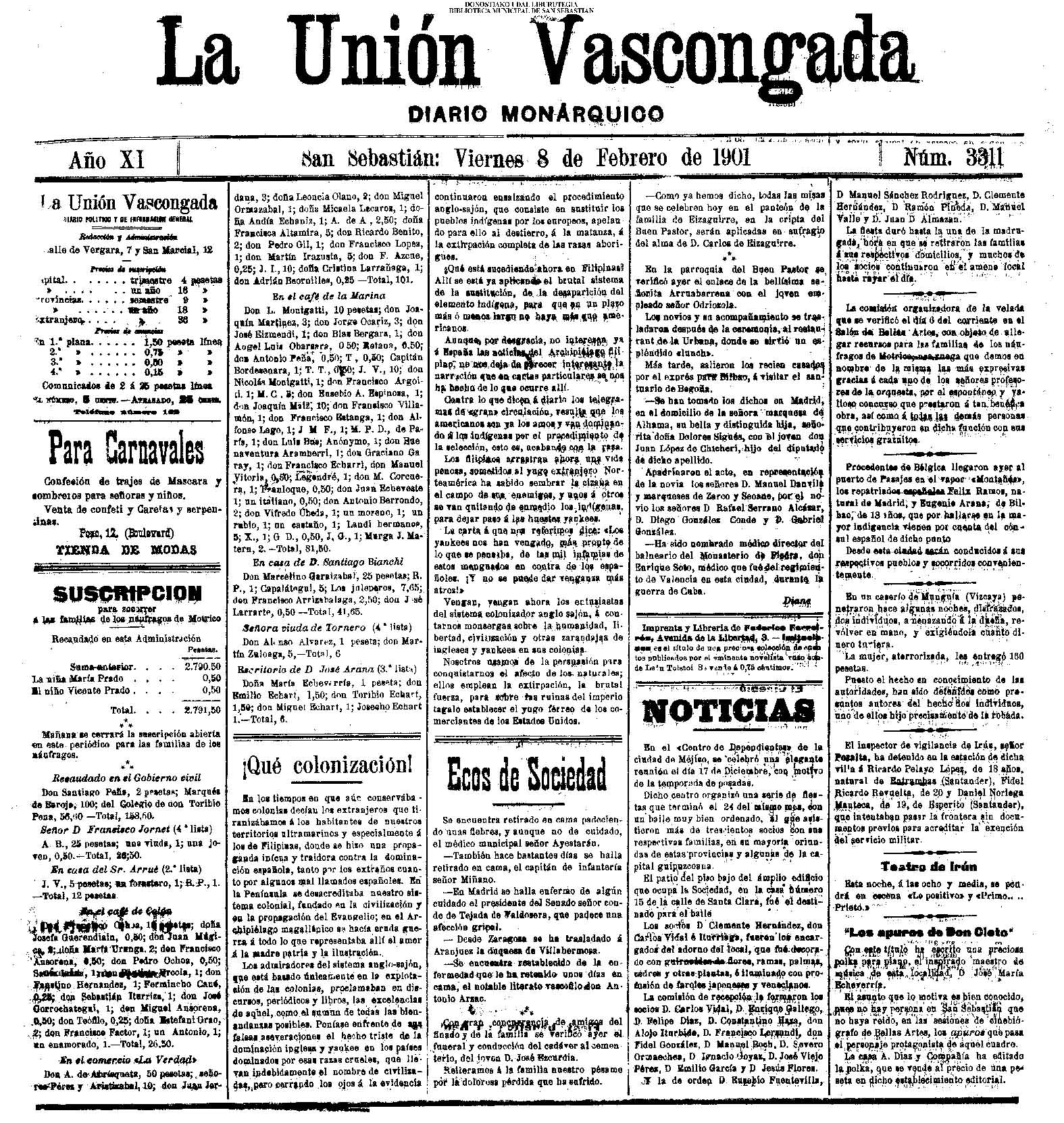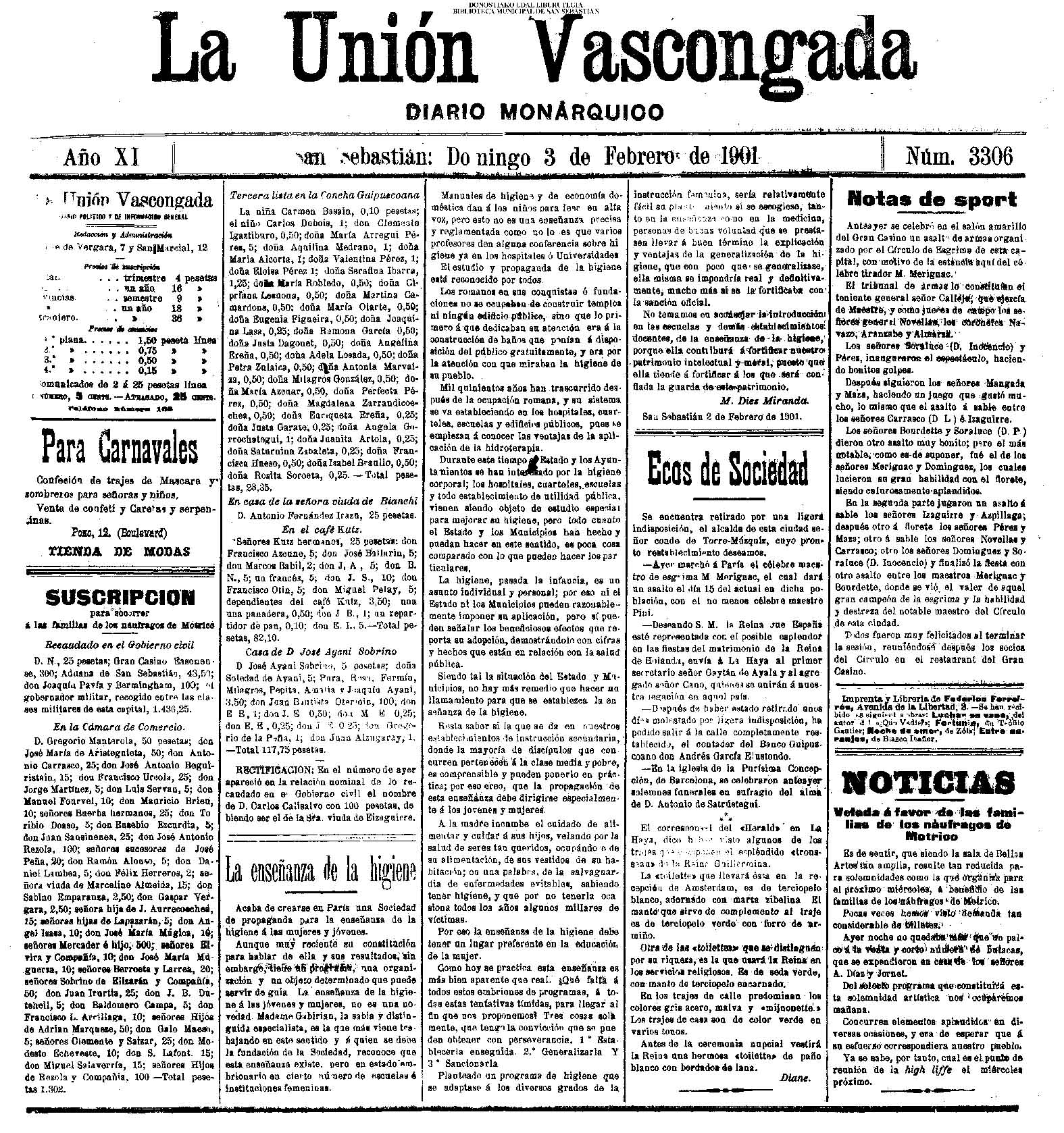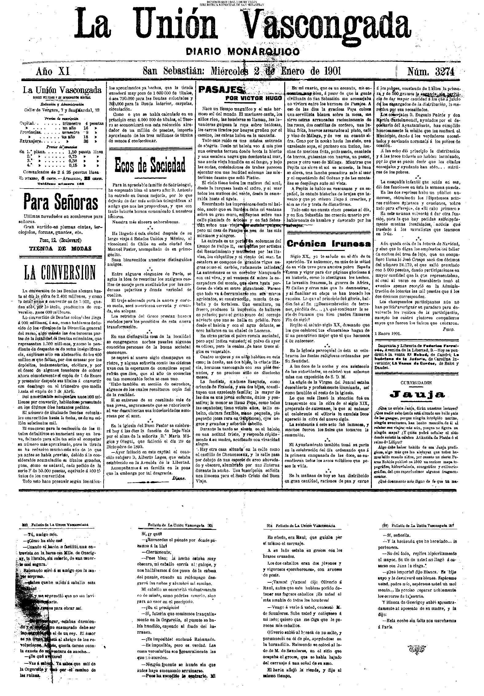 KOXKAS DONOSTIARRAS : "Curiosidades" El primer anuncio de la próxima llegada de las Navidades aparecía en los escaparates. Junto a otrsas golosinas, allí estaba en cajón o en barras el turrón, teniendo a su lado las olorosas aceitunas, las encendidas granadas, las peladillas bien envueltas en su capa de azúcar, los anises confitados, la garrapiñada, todo ese mundo de delicias. Al turrón le siguen el ejército de botellas y capones, de fiembres y pavos, de frutas sabrosísimas, de manjares incontables. Si en los días de Navidad sabe mejor el turrón, ¡qué deseado es siempre!¡Qué dulce es gustar siempre un cachito del azucarado postre!. La llegada del turrón era saludada en los periódicos de hace un siglo, que daban cuenta de que establecimiento había sido el primero en ponerlo en sus escaparates, como aviso urgente de que las Navidades estaban llegando. El cine llegó a nuestra ciudad hace un siglo. Entonces se llamaba Cinebiógrafo y las sesiones que daban eran cortas pero variadísimas. Vea el lector el programa que anunciaba el Cinebiógrafo Lumiére para el domingo 8 de diciembre de 1901. Primera sesión, a las 4 de la tarde : escenas cómicas. Magia moderna. Gabinete encantado. En la ratonera. El diablo en el convento. Regalo: rifa de una carabina Eureka. Segunda sesión, a las 5 de la tarde: Escenas marítimas. Seis retratos una peseta. Los apuros de don Cleto. Pirámides humanas. La luna, a un metro. Regalo: rifa de un servicio de porcelana para su muñeca. Tercera sesión, a las 6 de la tarde: Desfiles militares. Baile en el Olimpia. Entierro de la reina Victoria. Llegada de un tren. La Cenicienta. Regalo: rifa de un tren. Cuarta sesión, a las 7 de la tarde : Escenas infantiles. Danza de fuego. La portera burlada. Episodios del Fausto. Corrida de toros. Regalo: rifa de una preciosa muñeca. El cinebiógrafo de Bellas Artes, aquellos primeros días de diciembre de 1901, proyectaba Noel y anunciaba La caperuza roja, el popular cuento que todos los niños conocían, para los próximos días. Antes había proyectado la Cenicienta y Juana de Arco. Por aquellos días, en un par de escenarios hacían sus galas y su modo de retorcerse siete u ocho chiquillas "de esas que van de bellas". Con la cabeza coquetonamente cubierta por un sombrero, con la vistosa falta de colorines "previamente recogida como si estuviera pasando a pie un río, y el pañolón de Manila rodeado al cuerpo", comienza la suerte del tirabuzón, o sea, la del sacacorchos. Aquellas chicas se retuercen, hacen cosas raras con los pies, con las manos, con todo el cuerpo, volviendo locos a los espectadores. |
