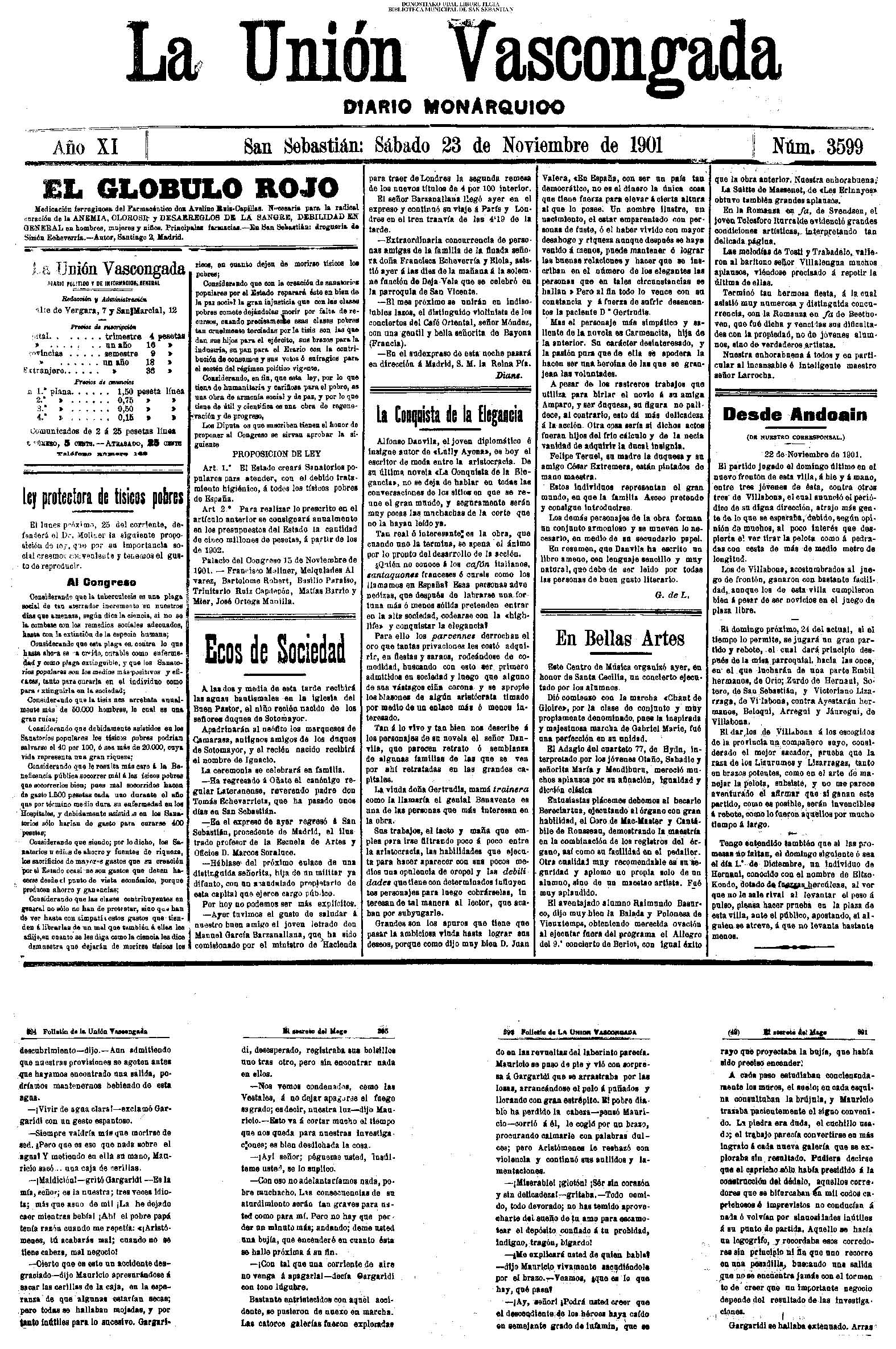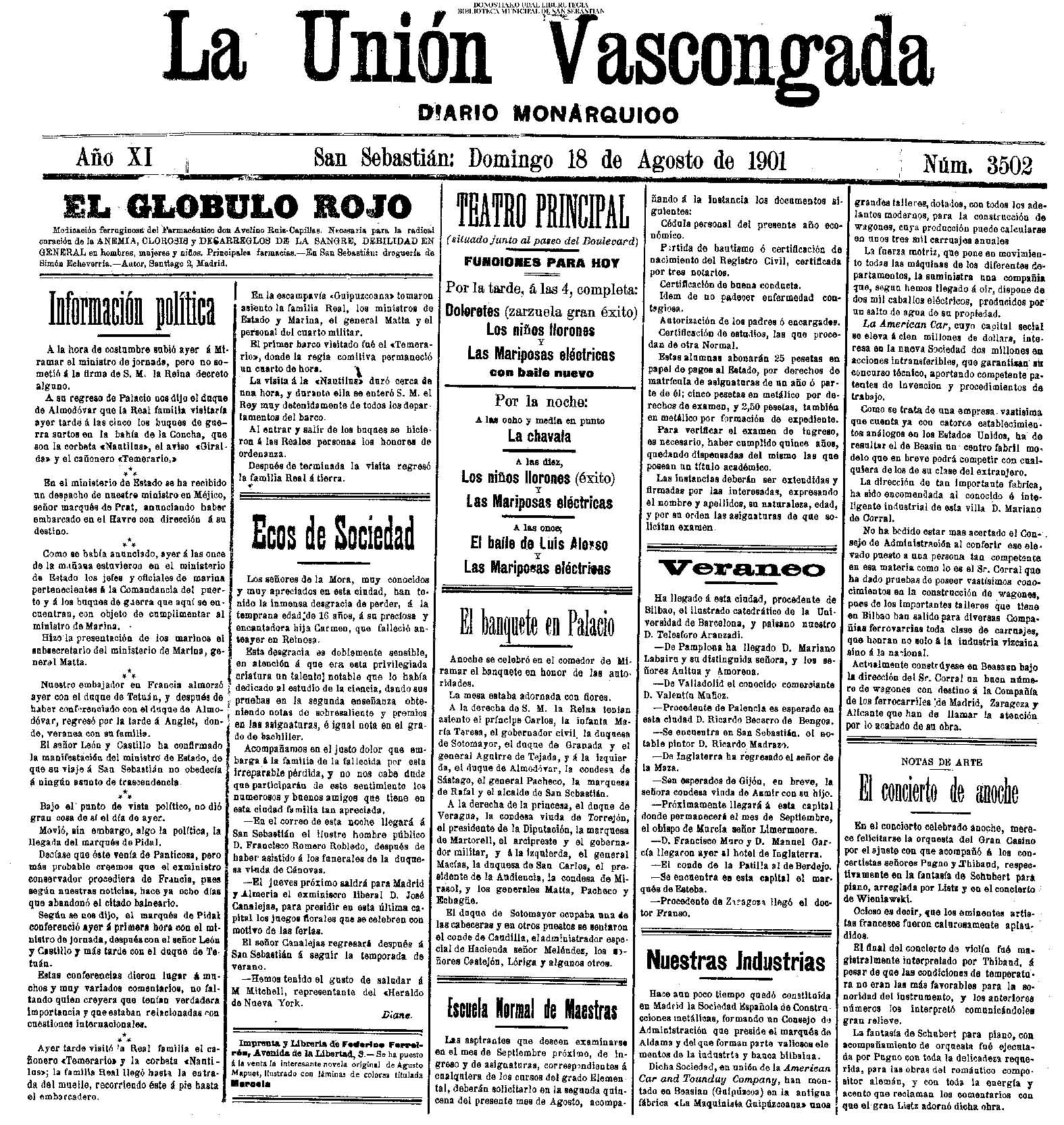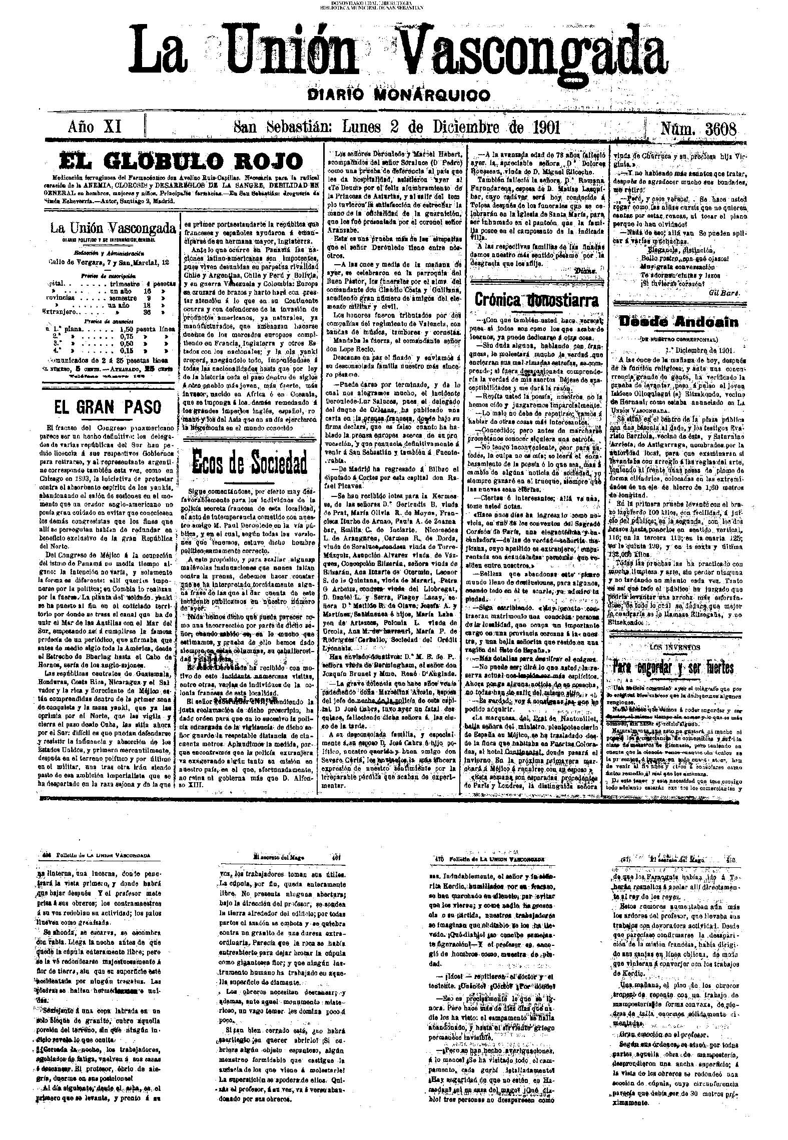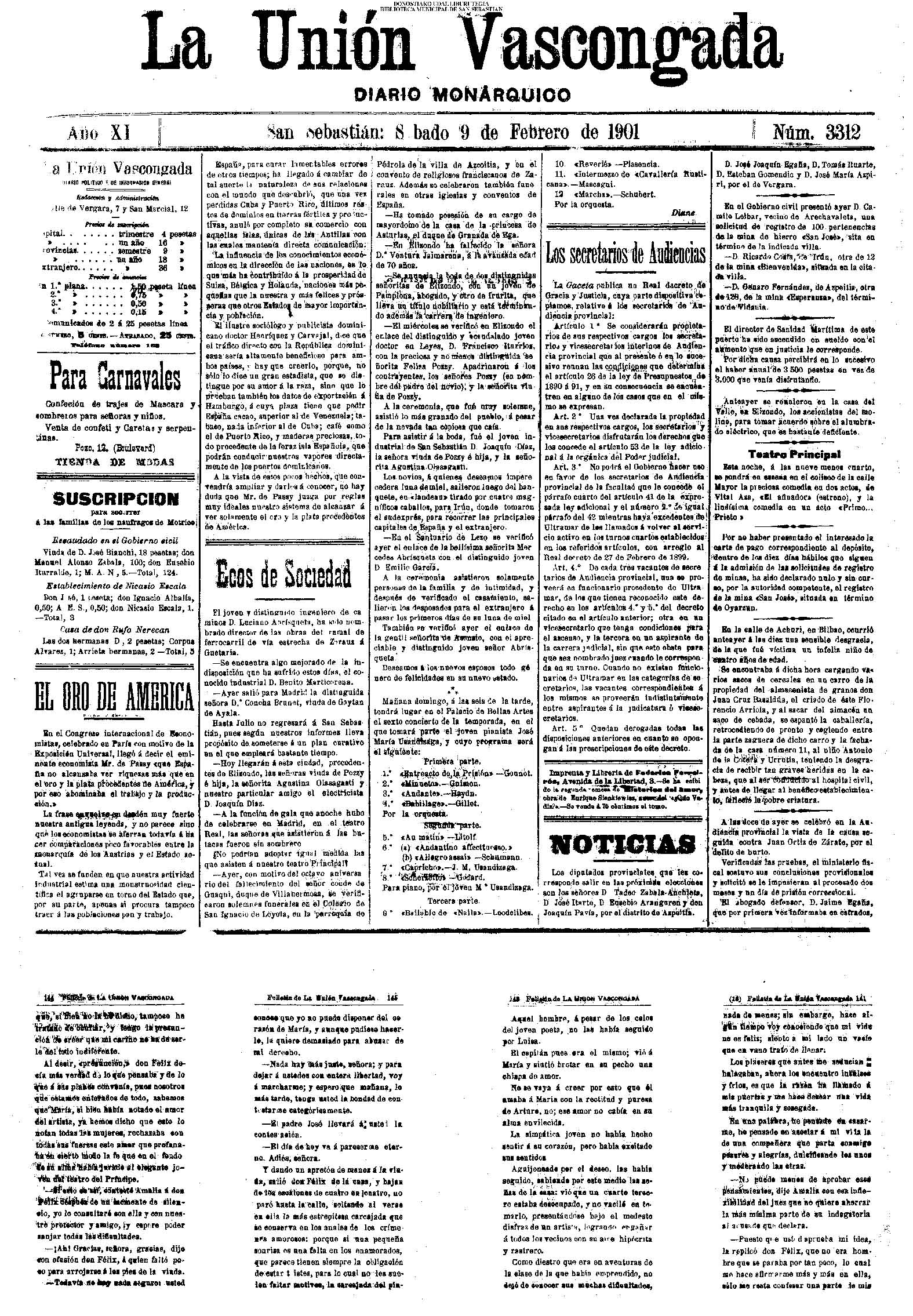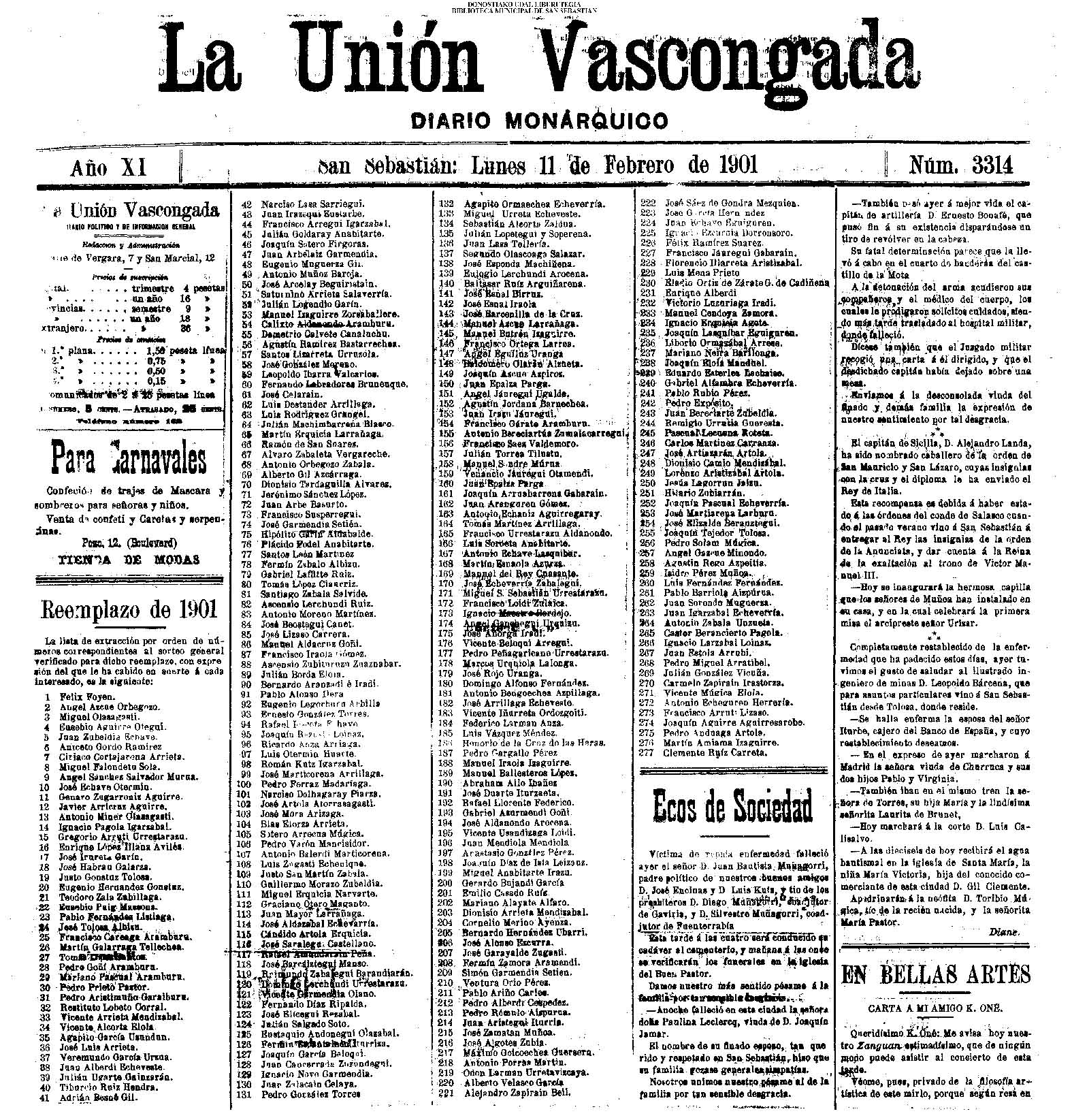 KOXKAS DONOSTIARRAS : "Curiosidades" El primer anuncio de la próxima llegada de las Navidades aparecía en los escaparates. Junto a otrsas golosinas, allí estaba en cajón o en barras el turrón, teniendo a su lado las olorosas aceitunas, las encendidas granadas, las peladillas bien envueltas en su capa de azúcar, los anises confitados, la garrapiñada, todo ese mundo de delicias. Al turrón le siguen el ejército de botellas y capones, de fiembres y pavos, de frutas sabrosísimas, de manjares incontables. Si en los días de Navidad sabe mejor el turrón, ¡qué deseado es siempre!¡Qué dulce es gustar siempre un cachito del azucarado postre!. La llegada del turrón era saludada en los periódicos de hace un siglo, que daban cuenta de que establecimiento había sido el primero en ponerlo en sus escaparates, como aviso urgente de que las Navidades estaban llegando. El cine llegó a nuestra ciudad hace un siglo. Entonces se llamaba Cinebiógrafo y las sesiones que daban eran cortas pero variadísimas. Vea el lector el programa que anunciaba el Cinebiógrafo Lumiére para el domingo 8 de diciembre de 1901. Primera sesión, a las 4 de la tarde : escenas cómicas. Magia moderna. Gabinete encantado. En la ratonera. El diablo en el convento. Regalo: rifa de una carabina Eureka. Segunda sesión, a las 5 de la tarde: Escenas marítimas. Seis retratos una peseta. Los apuros de don Cleto. Pirámides humanas. La luna, a un metro. Regalo: rifa de un servicio de porcelana para su muñeca. Tercera sesión, a las 6 de la tarde: Desfiles militares. Baile en el Olimpia. Entierro de la reina Victoria. Llegada de un tren. La Cenicienta. Regalo: rifa de un tren. Cuarta sesión, a las 7 de la tarde : Escenas infantiles. Danza de fuego. La portera burlada. Episodios del Fausto. Corrida de toros. Regalo: rifa de una preciosa muñeca. El cinebiógrafo de Bellas Artes, aquellos primeros días de diciembre de 1901, proyectaba Noel y anunciaba La caperuza roja, el popular cuento que todos los niños conocían, para los próximos días. Antes había proyectado la Cenicienta y Juana de Arco. Por aquellos días, en un par de escenarios hacían sus galas y su modo de retorcerse siete u ocho chiquillas "de esas que van de bellas". Con la cabeza coquetonamente cubierta por un sombrero, con la vistosa falta de colorines "previamente recogida como si estuviera pasando a pie un río, y el pañolón de Manila rodeado al cuerpo", comienza la suerte del tirabuzón, o sea, la del sacacorchos. Aquellas chicas se retuercen, hacen cosas raras con los pies, con las manos, con todo el cuerpo, volviendo locos a los espectadores. |