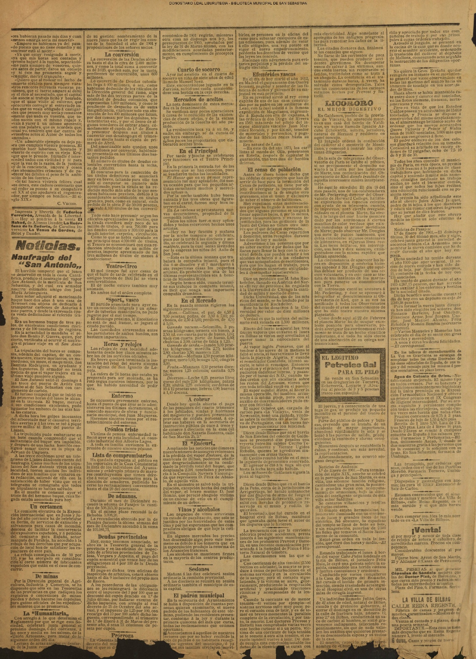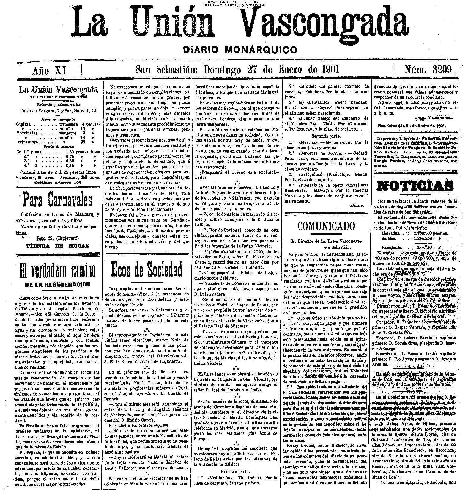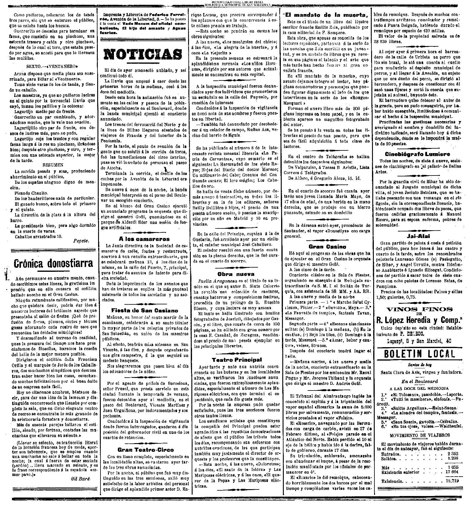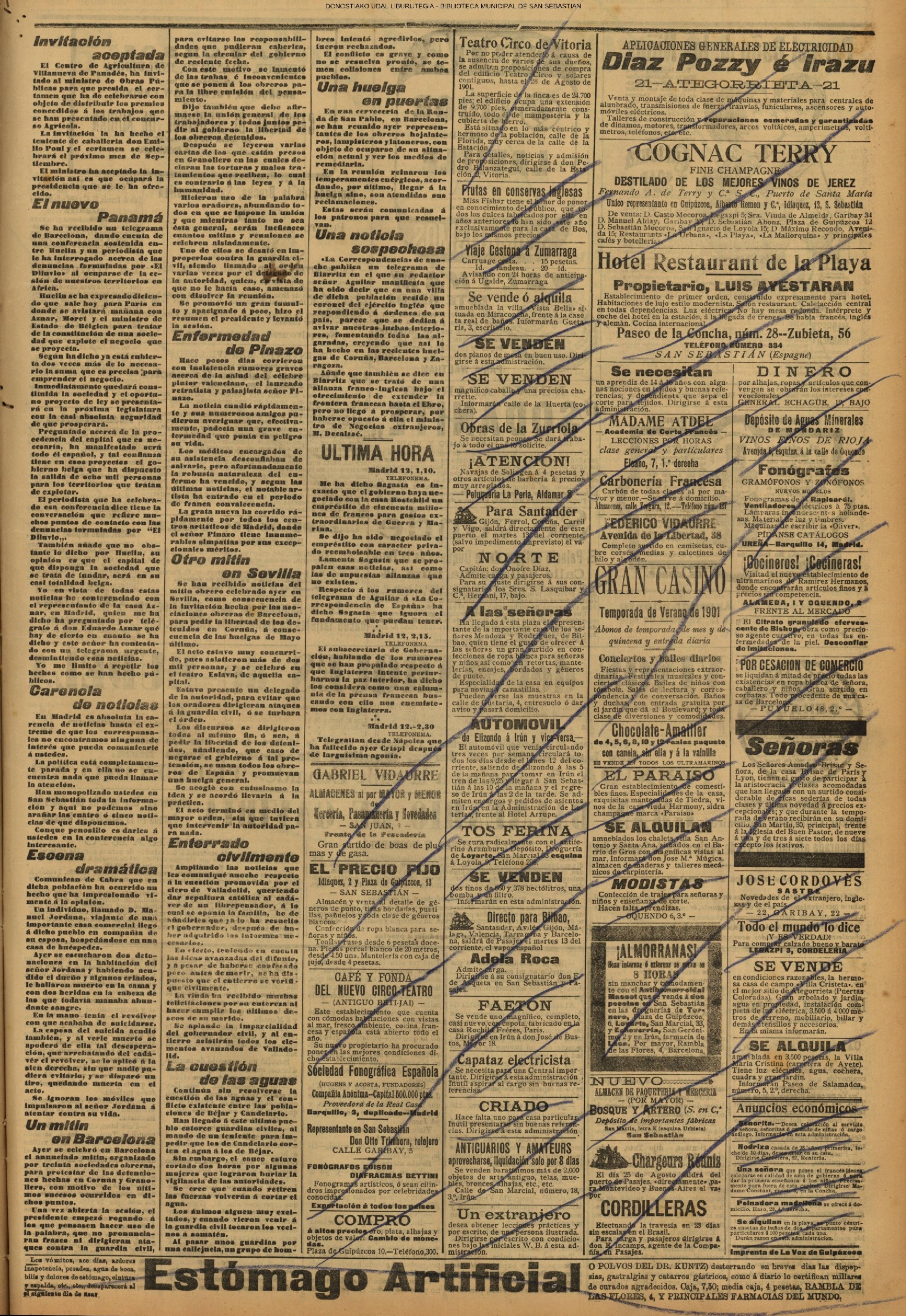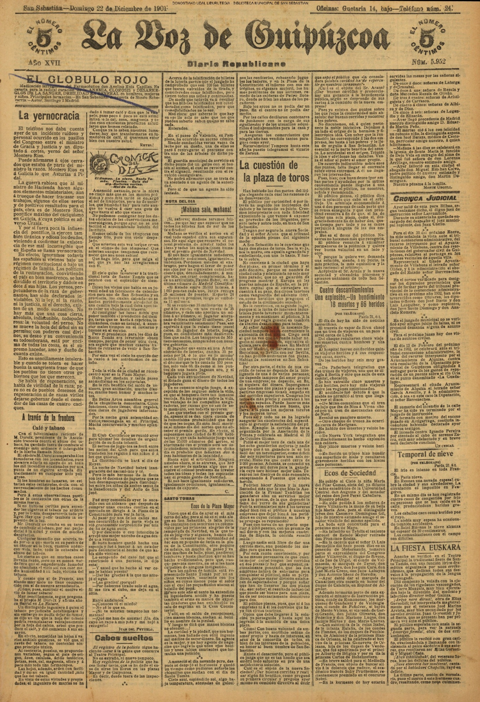 KOXKAS DONOSTIARRAS : "Curiosidades" El primer anuncio de la próxima llegada de las Navidades aparecía en los escaparates. Junto a otrsas golosinas, allí estaba en cajón o en barras el turrón, teniendo a su lado las olorosas aceitunas, las encendidas granadas, las peladillas bien envueltas en su capa de azúcar, los anises confitados, la garrapiñada, todo ese mundo de delicias. Al turrón le siguen el ejército de botellas y capones, de fiembres y pavos, de frutas sabrosísimas, de manjares incontables. Si en los días de Navidad sabe mejor el turrón, ¡qué deseado es siempre!¡Qué dulce es gustar siempre un cachito del azucarado postre!. La llegada del turrón era saludada en los periódicos de hace un siglo, que daban cuenta de que establecimiento había sido el primero en ponerlo en sus escaparates, como aviso urgente de que las Navidades estaban llegando. El cine llegó a nuestra ciudad hace un siglo. Entonces se llamaba Cinebiógrafo y las sesiones que daban eran cortas pero variadísimas. Vea el lector el programa que anunciaba el Cinebiógrafo Lumiére para el domingo 8 de diciembre de 1901. Primera sesión, a las 4 de la tarde : escenas cómicas. Magia moderna. Gabinete encantado. En la ratonera. El diablo en el convento. Regalo: rifa de una carabina Eureka. Segunda sesión, a las 5 de la tarde: Escenas marítimas. Seis retratos una peseta. Los apuros de don Cleto. Pirámides humanas. La luna, a un metro. Regalo: rifa de un servicio de porcelana para su muñeca. Tercera sesión, a las 6 de la tarde: Desfiles militares. Baile en el Olimpia. Entierro de la reina Victoria. Llegada de un tren. La Cenicienta. Regalo: rifa de un tren. Cuarta sesión, a las 7 de la tarde : Escenas infantiles. Danza de fuego. La portera burlada. Episodios del Fausto. Corrida de toros. Regalo: rifa de una preciosa muñeca. El cinebiógrafo de Bellas Artes, aquellos primeros días de diciembre de 1901, proyectaba Noel y anunciaba La caperuza roja, el popular cuento que todos los niños conocían, para los próximos días. Antes había proyectado la Cenicienta y Juana de Arco. Por aquellos días, en un par de escenarios hacían sus galas y su modo de retorcerse siete u ocho chiquillas "de esas que van de bellas". Con la cabeza coquetonamente cubierta por un sombrero, con la vistosa falta de colorines "previamente recogida como si estuviera pasando a pie un río, y el pañolón de Manila rodeado al cuerpo", comienza la suerte del tirabuzón, o sea, la del sacacorchos. Aquellas chicas se retuercen, hacen cosas raras con los pies, con las manos, con todo el cuerpo, volviendo locos a los espectadores. |
