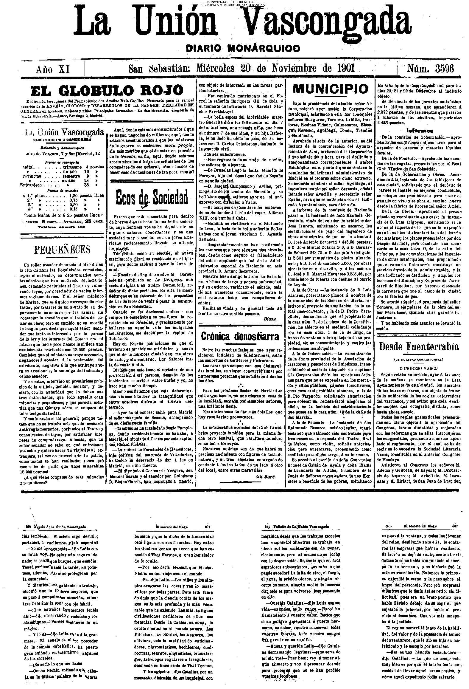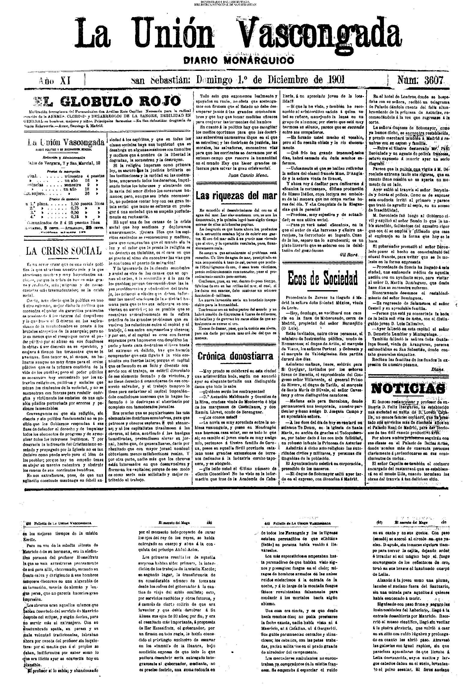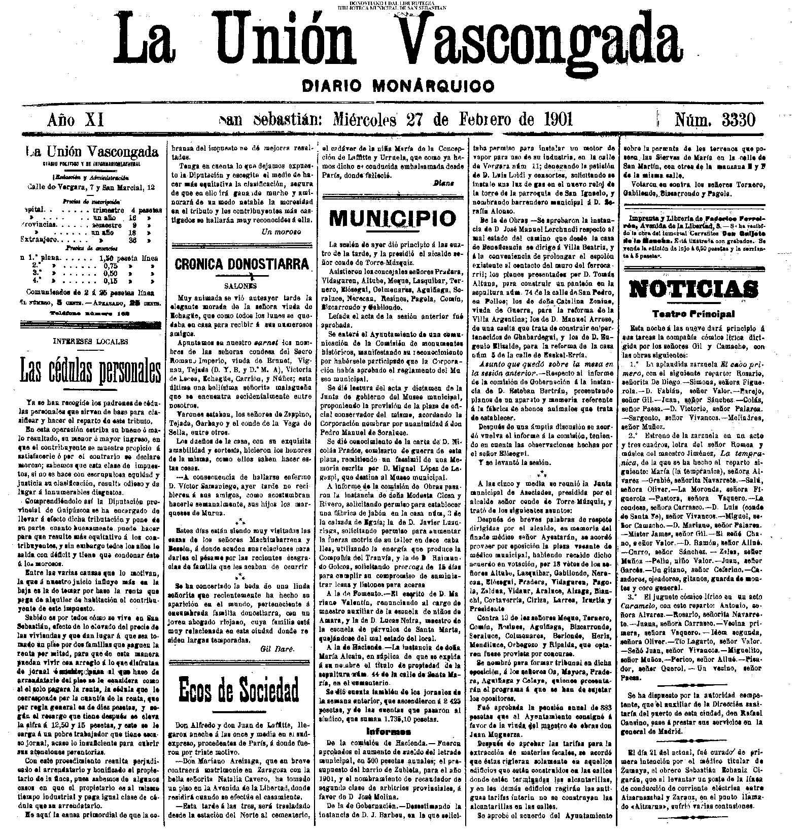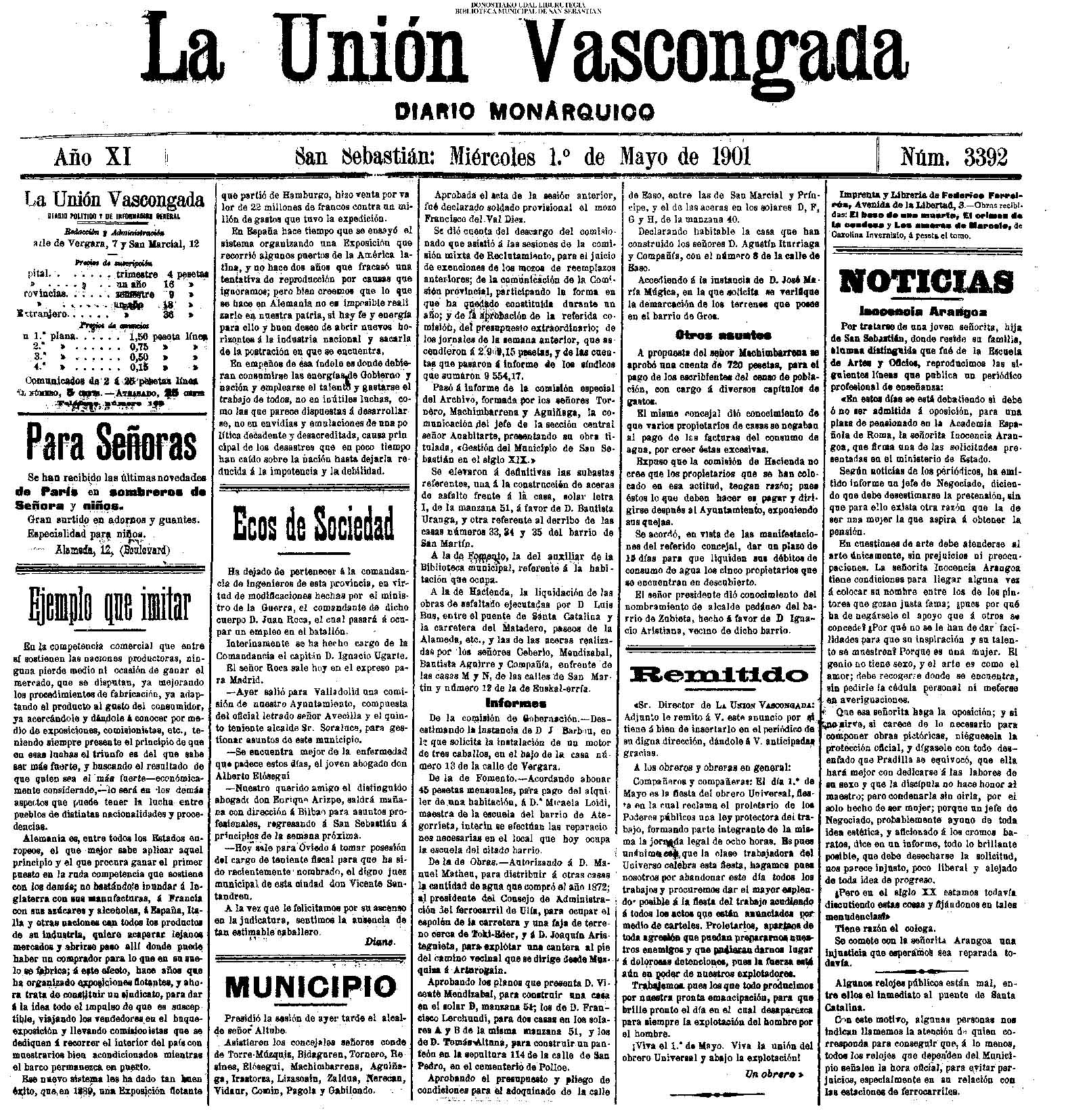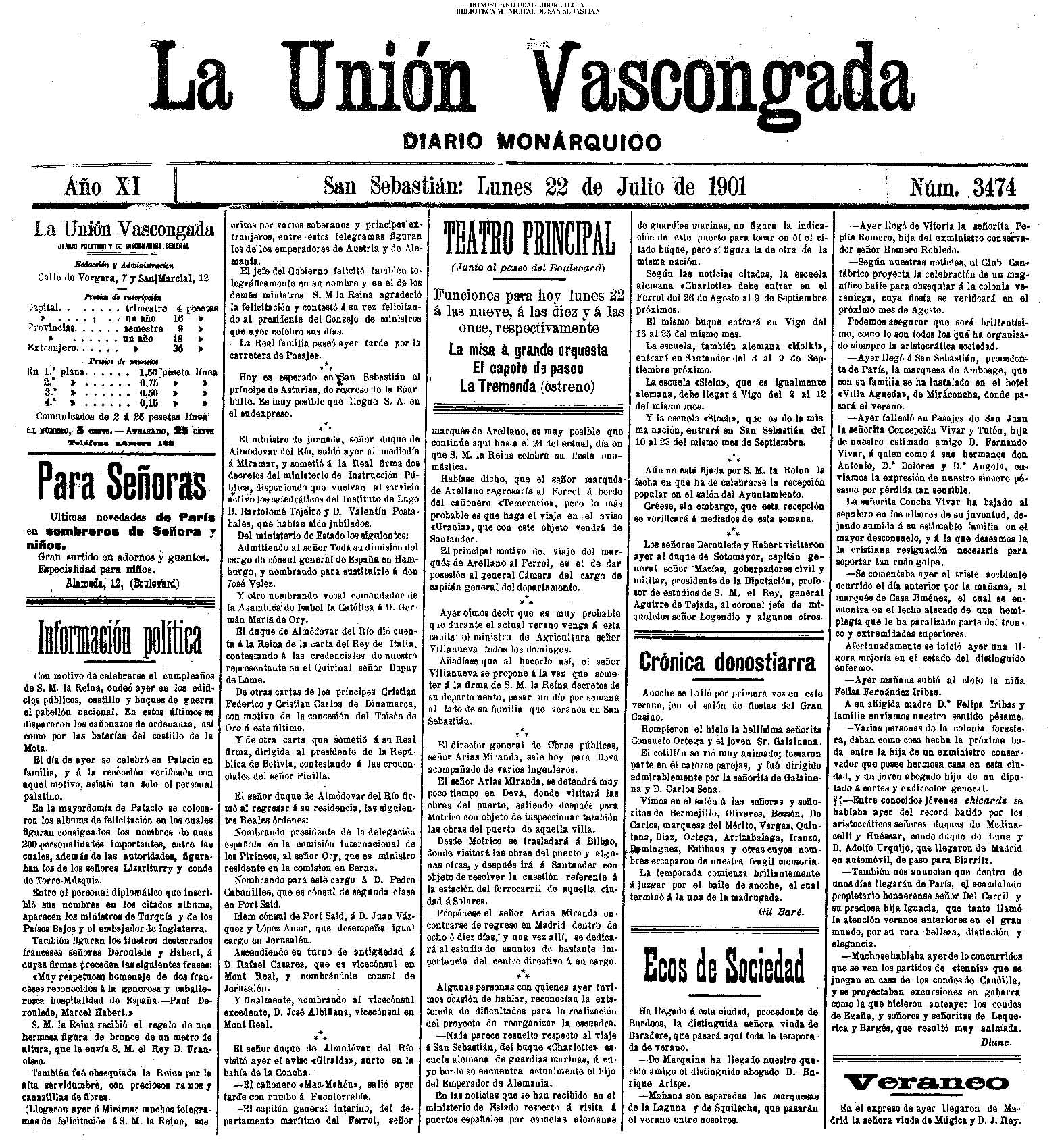KOXKAS DONOSTIARRAS : "Curiosidades" El primer anuncio de la próxima llegada de las Navidades aparecía en los escaparates. Junto a otrsas golosinas, allí estaba en cajón o en barras el turrón, teniendo a su lado las olorosas aceitunas, las encendidas granadas, las peladillas bien envueltas en su capa de azúcar, los anises confitados, la garrapiñada, todo ese mundo de delicias. Al turrón le siguen el ejército de botellas y capones, de fiembres y pavos, de frutas sabrosísimas, de manjares incontables. Si en los días de Navidad sabe mejor el turrón, ¡qué deseado es siempre!¡Qué dulce es gustar siempre un cachito del azucarado postre!. La llegada del turrón era saludada en los periódicos de hace un siglo, que daban cuenta de que establecimiento había sido el primero en ponerlo en sus escaparates, como aviso urgente de que las Navidades estaban llegando. El cine llegó a nuestra ciudad hace un siglo. Entonces se llamaba Cinebiógrafo y las sesiones que daban eran cortas pero variadísimas. Vea el lector el programa que anunciaba el Cinebiógrafo Lumiére para el domingo 8 de diciembre de 1901. Primera sesión, a las 4 de la tarde : escenas cómicas. Magia moderna. Gabinete encantado. En la ratonera. El diablo en el convento. Regalo: rifa de una carabina Eureka. Segunda sesión, a las 5 de la tarde: Escenas marítimas. Seis retratos una peseta. Los apuros de don Cleto. Pirámides humanas. La luna, a un metro. Regalo: rifa de un servicio de porcelana para su muñeca. Tercera sesión, a las 6 de la tarde: Desfiles militares. Baile en el Olimpia. Entierro de la reina Victoria. Llegada de un tren. La Cenicienta. Regalo: rifa de un tren. Cuarta sesión, a las 7 de la tarde : Escenas infantiles. Danza de fuego. La portera burlada. Episodios del Fausto. Corrida de toros. Regalo: rifa de una preciosa muñeca. El cinebiógrafo de Bellas Artes, aquellos primeros días de diciembre de 1901, proyectaba Noel y anunciaba La caperuza roja, el popular cuento que todos los niños conocían, para los próximos días. Antes había proyectado la Cenicienta y Juana de Arco. Por aquellos días, en un par de escenarios hacían sus galas y su modo de retorcerse siete u ocho chiquillas "de esas que van de bellas". Con la cabeza coquetonamente cubierta por un sombrero, con la vistosa falta de colorines "previamente recogida como si estuviera pasando a pie un río, y el pañolón de Manila rodeado al cuerpo", comienza la suerte del tirabuzón, o sea, la del sacacorchos. Aquellas chicas se retuercen, hacen cosas raras con los pies, con las manos, con todo el cuerpo, volviendo locos a los espectadores. |