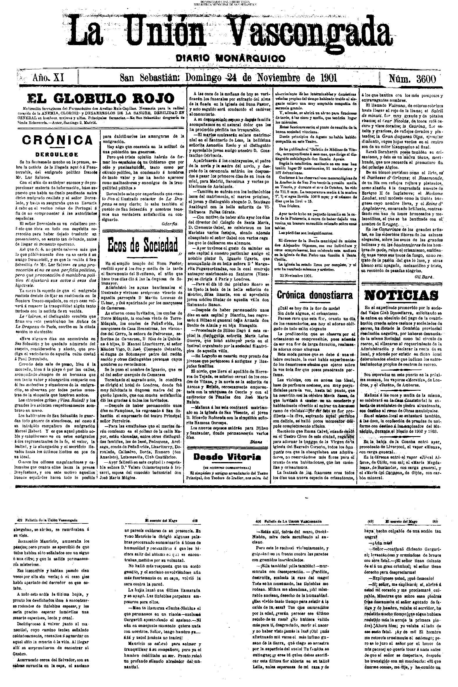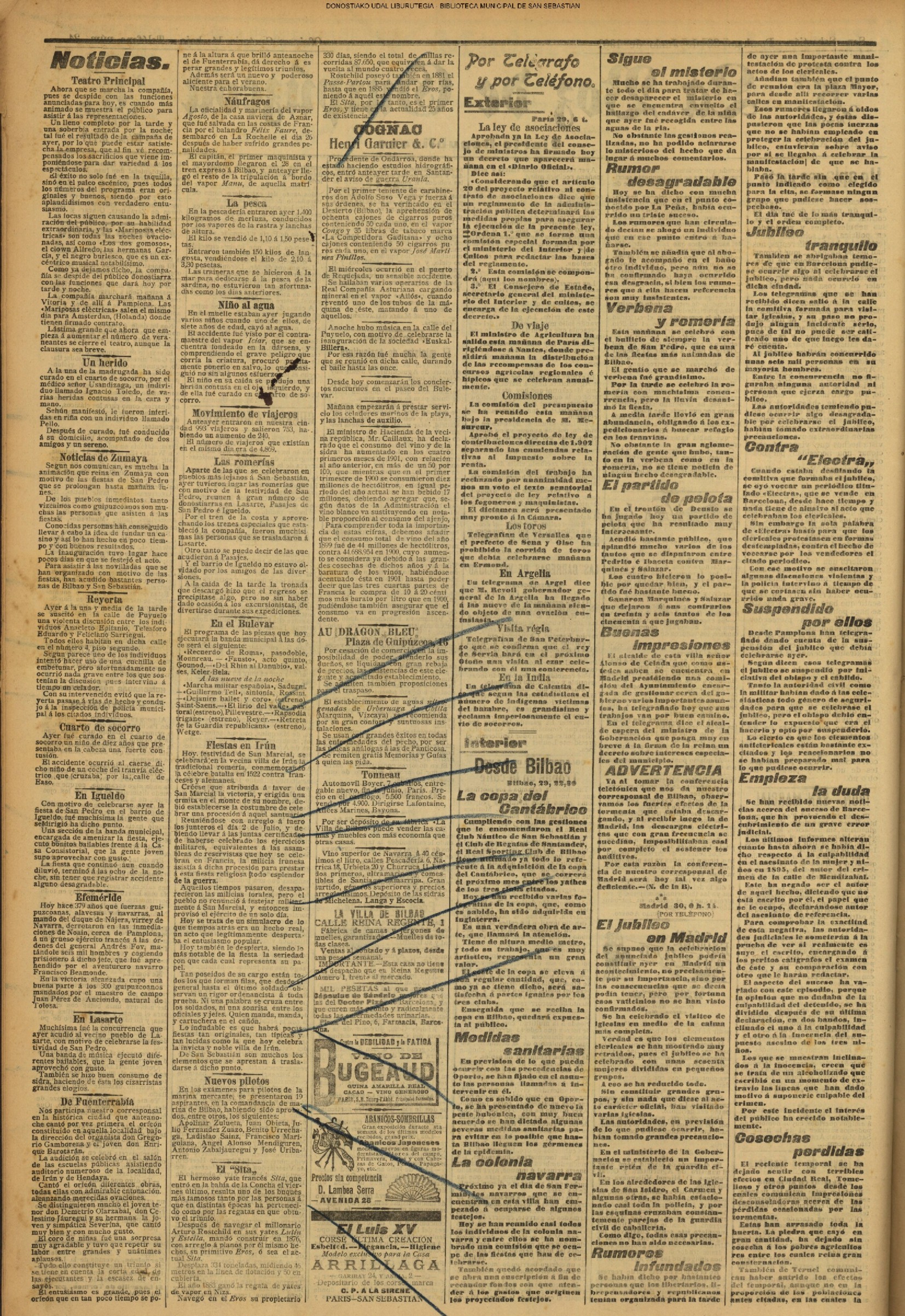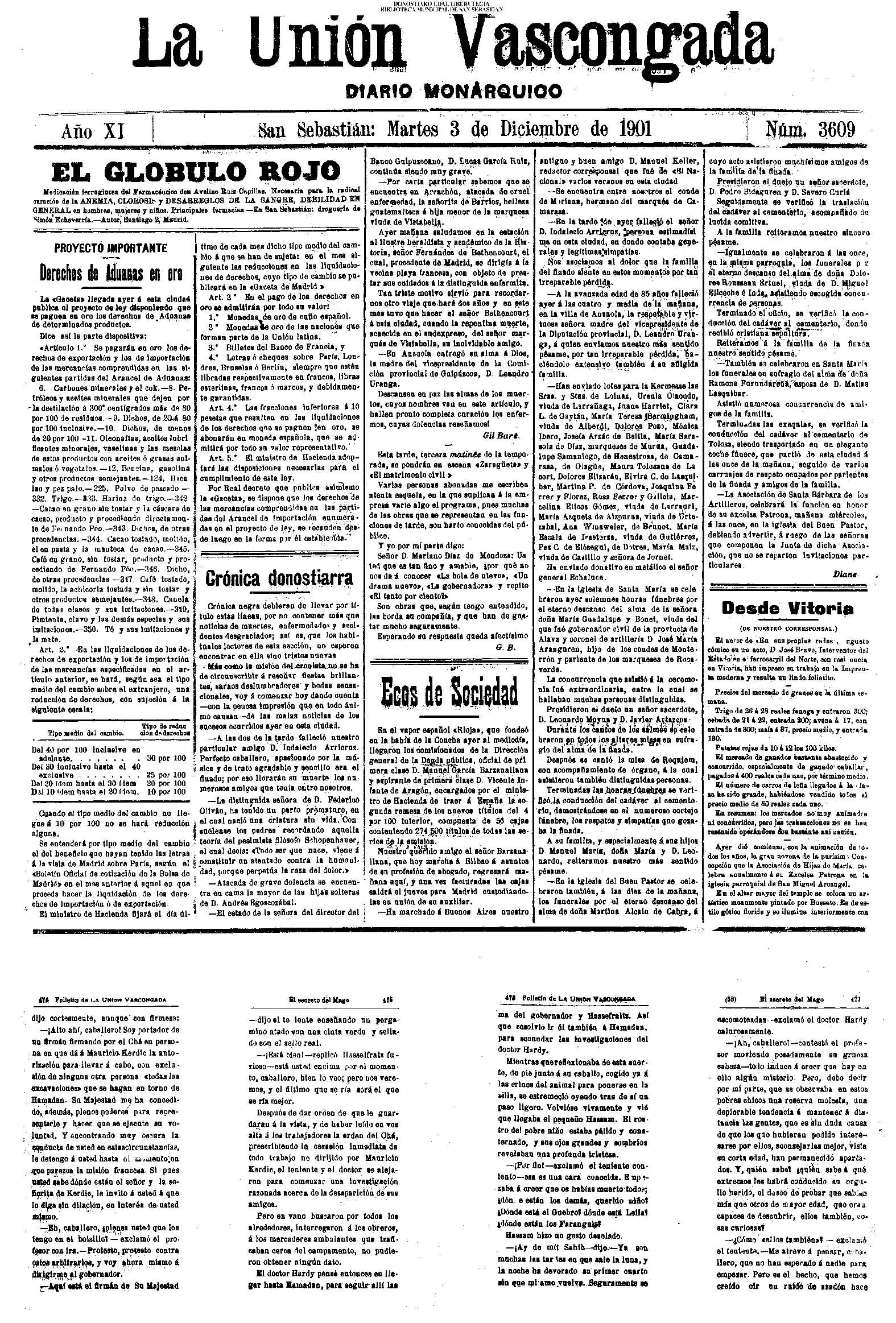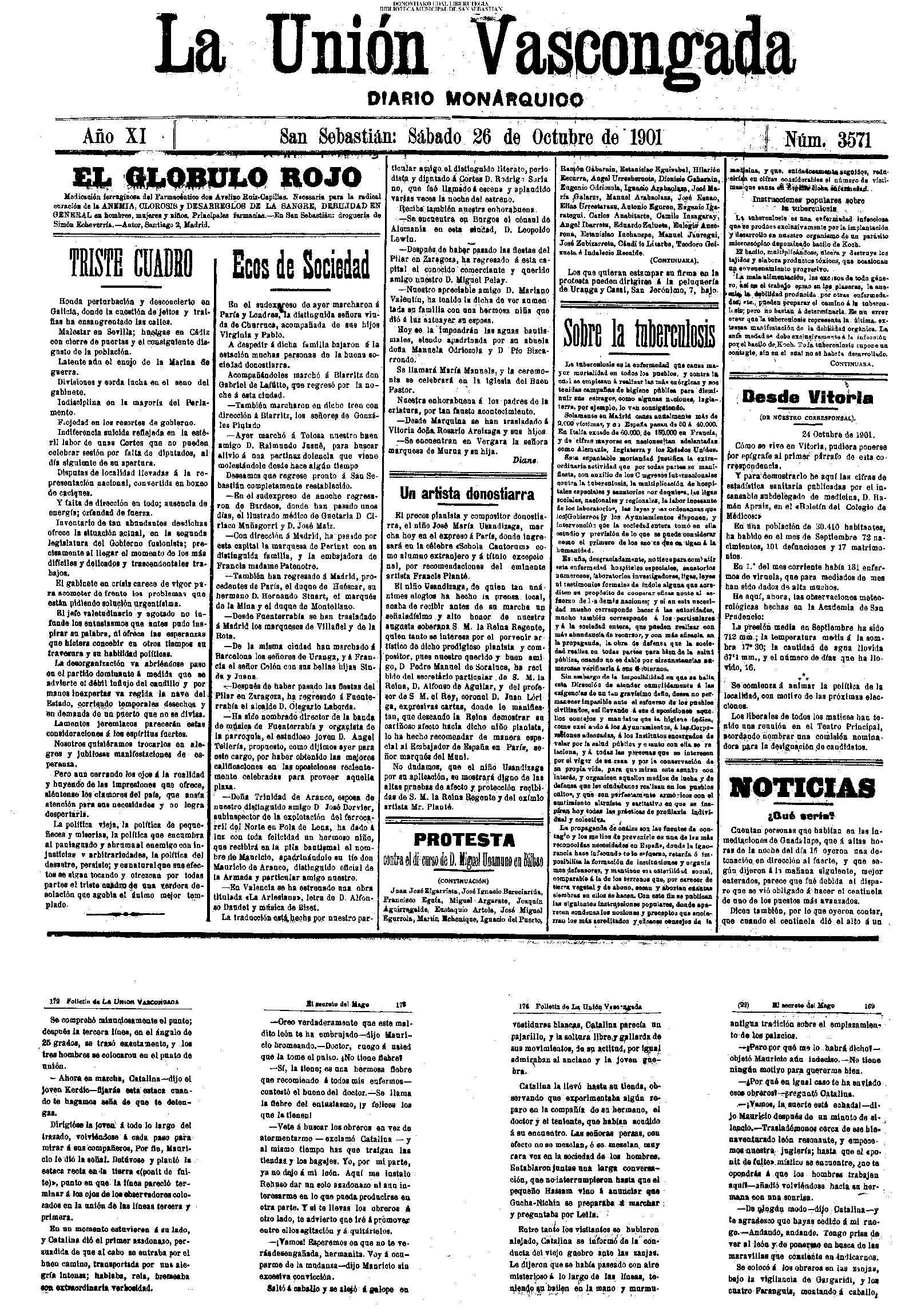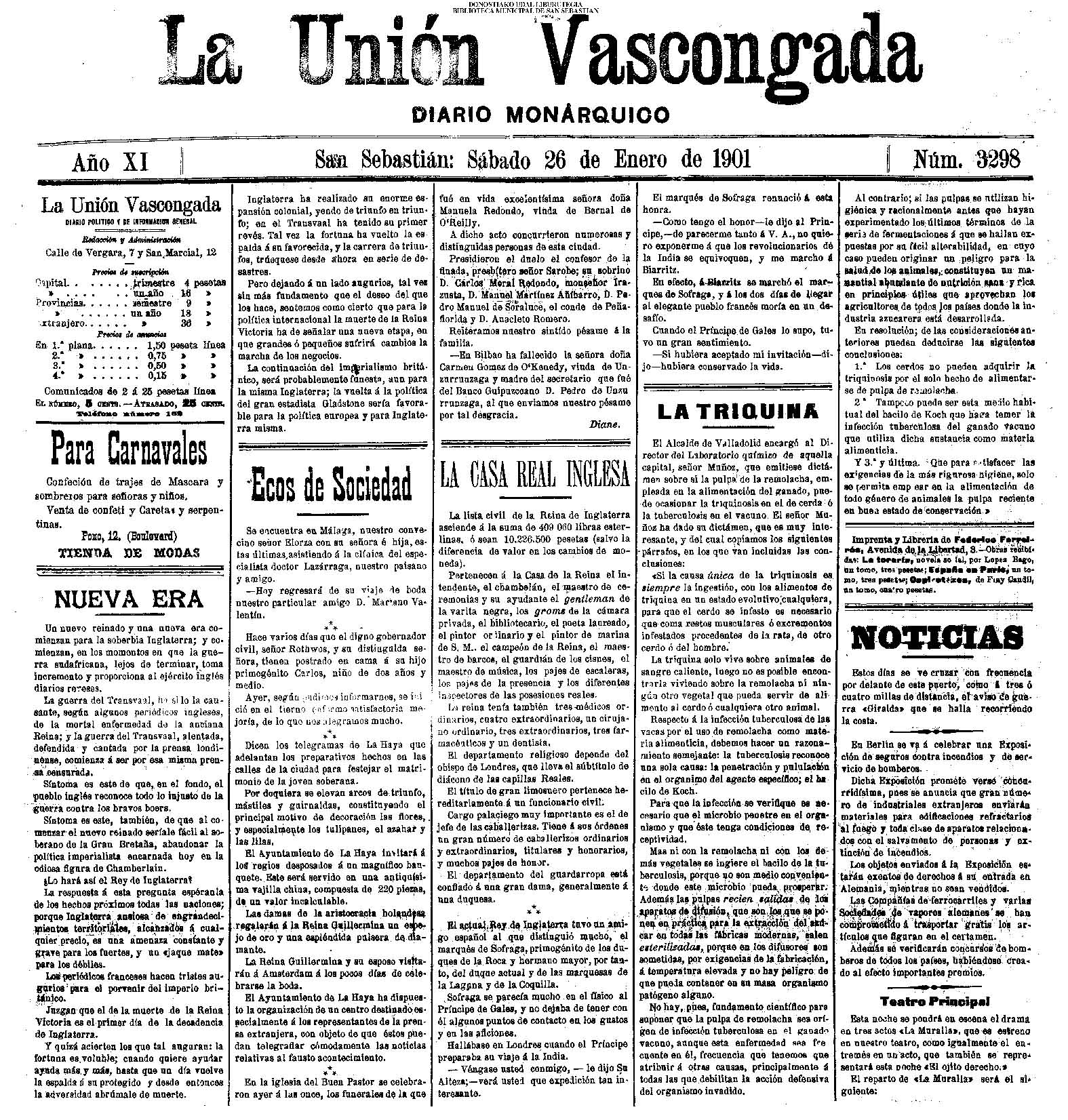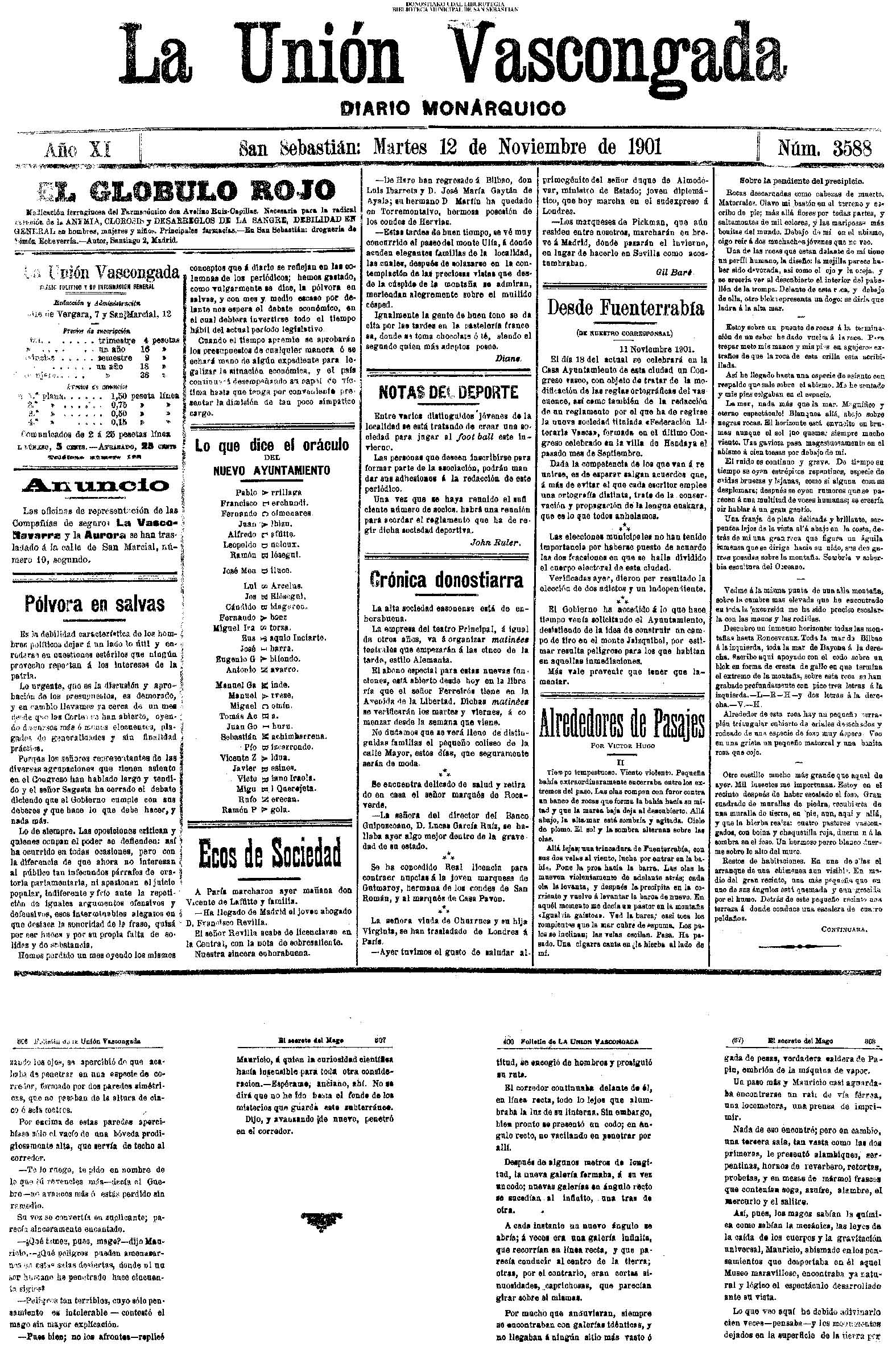 KOXKAS DONOSTIARRAS : "Curiosidades" El primer anuncio de la próxima llegada de las Navidades aparecía en los escaparates. Junto a otrsas golosinas, allí estaba en cajón o en barras el turrón, teniendo a su lado las olorosas aceitunas, las encendidas granadas, las peladillas bien envueltas en su capa de azúcar, los anises confitados, la garrapiñada, todo ese mundo de delicias. Al turrón le siguen el ejército de botellas y capones, de fiembres y pavos, de frutas sabrosísimas, de manjares incontables. Si en los días de Navidad sabe mejor el turrón, ¡qué deseado es siempre!¡Qué dulce es gustar siempre un cachito del azucarado postre!. La llegada del turrón era saludada en los periódicos de hace un siglo, que daban cuenta de que establecimiento había sido el primero en ponerlo en sus escaparates, como aviso urgente de que las Navidades estaban llegando. El cine llegó a nuestra ciudad hace un siglo. Entonces se llamaba Cinebiógrafo y las sesiones que daban eran cortas pero variadísimas. Vea el lector el programa que anunciaba el Cinebiógrafo Lumiére para el domingo 8 de diciembre de 1901. Primera sesión, a las 4 de la tarde : escenas cómicas. Magia moderna. Gabinete encantado. En la ratonera. El diablo en el convento. Regalo: rifa de una carabina Eureka. Segunda sesión, a las 5 de la tarde: Escenas marítimas. Seis retratos una peseta. Los apuros de don Cleto. Pirámides humanas. La luna, a un metro. Regalo: rifa de un servicio de porcelana para su muñeca. Tercera sesión, a las 6 de la tarde: Desfiles militares. Baile en el Olimpia. Entierro de la reina Victoria. Llegada de un tren. La Cenicienta. Regalo: rifa de un tren. Cuarta sesión, a las 7 de la tarde : Escenas infantiles. Danza de fuego. La portera burlada. Episodios del Fausto. Corrida de toros. Regalo: rifa de una preciosa muñeca. El cinebiógrafo de Bellas Artes, aquellos primeros días de diciembre de 1901, proyectaba Noel y anunciaba La caperuza roja, el popular cuento que todos los niños conocían, para los próximos días. Antes había proyectado la Cenicienta y Juana de Arco. Por aquellos días, en un par de escenarios hacían sus galas y su modo de retorcerse siete u ocho chiquillas "de esas que van de bellas". Con la cabeza coquetonamente cubierta por un sombrero, con la vistosa falta de colorines "previamente recogida como si estuviera pasando a pie un río, y el pañolón de Manila rodeado al cuerpo", comienza la suerte del tirabuzón, o sea, la del sacacorchos. Aquellas chicas se retuercen, hacen cosas raras con los pies, con las manos, con todo el cuerpo, volviendo locos a los espectadores. |