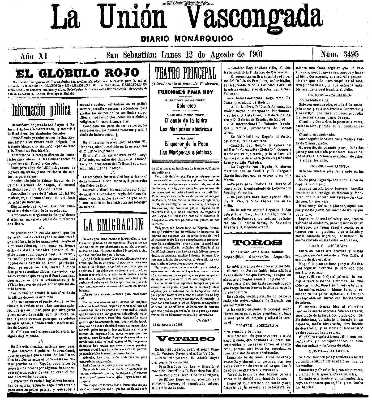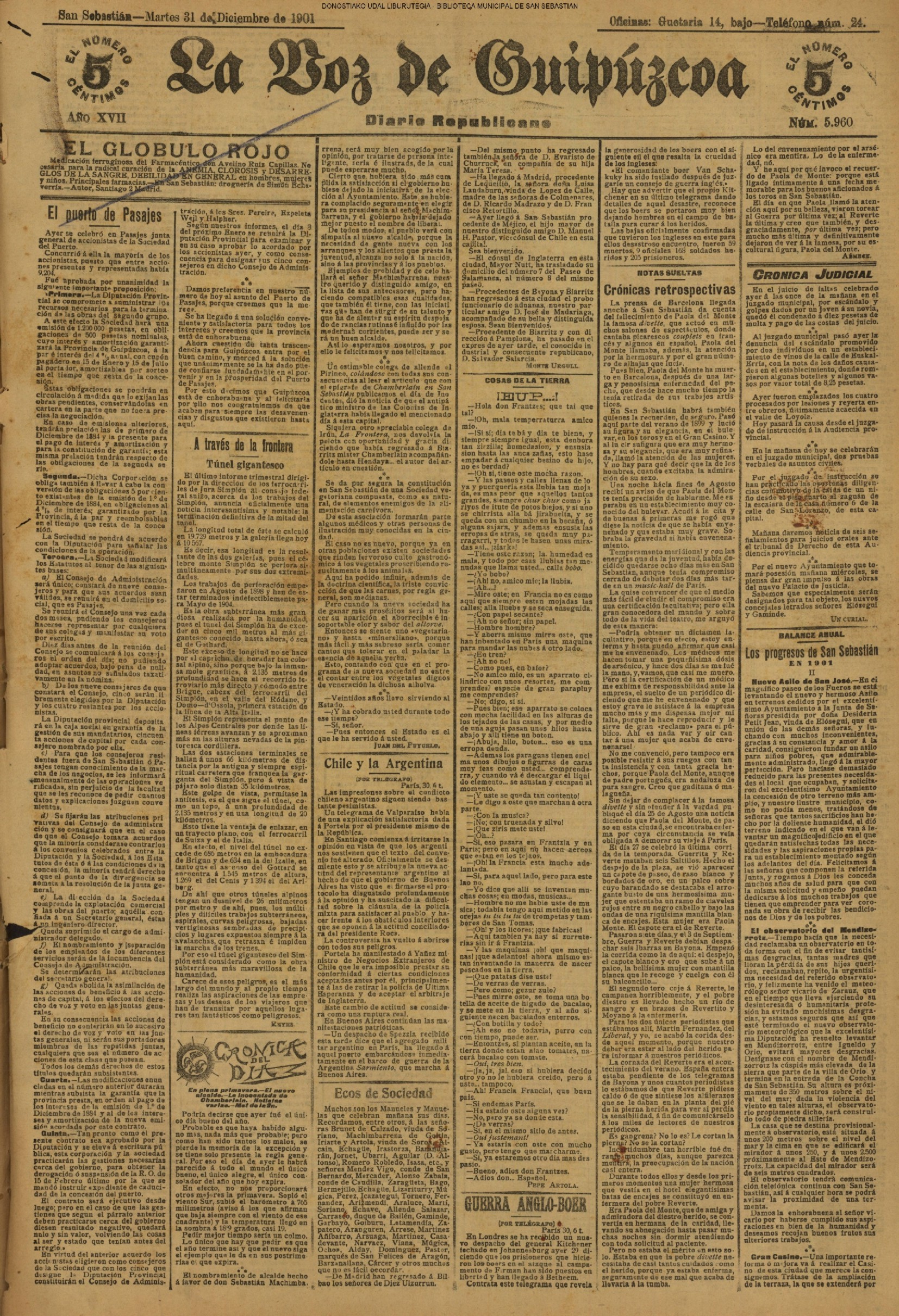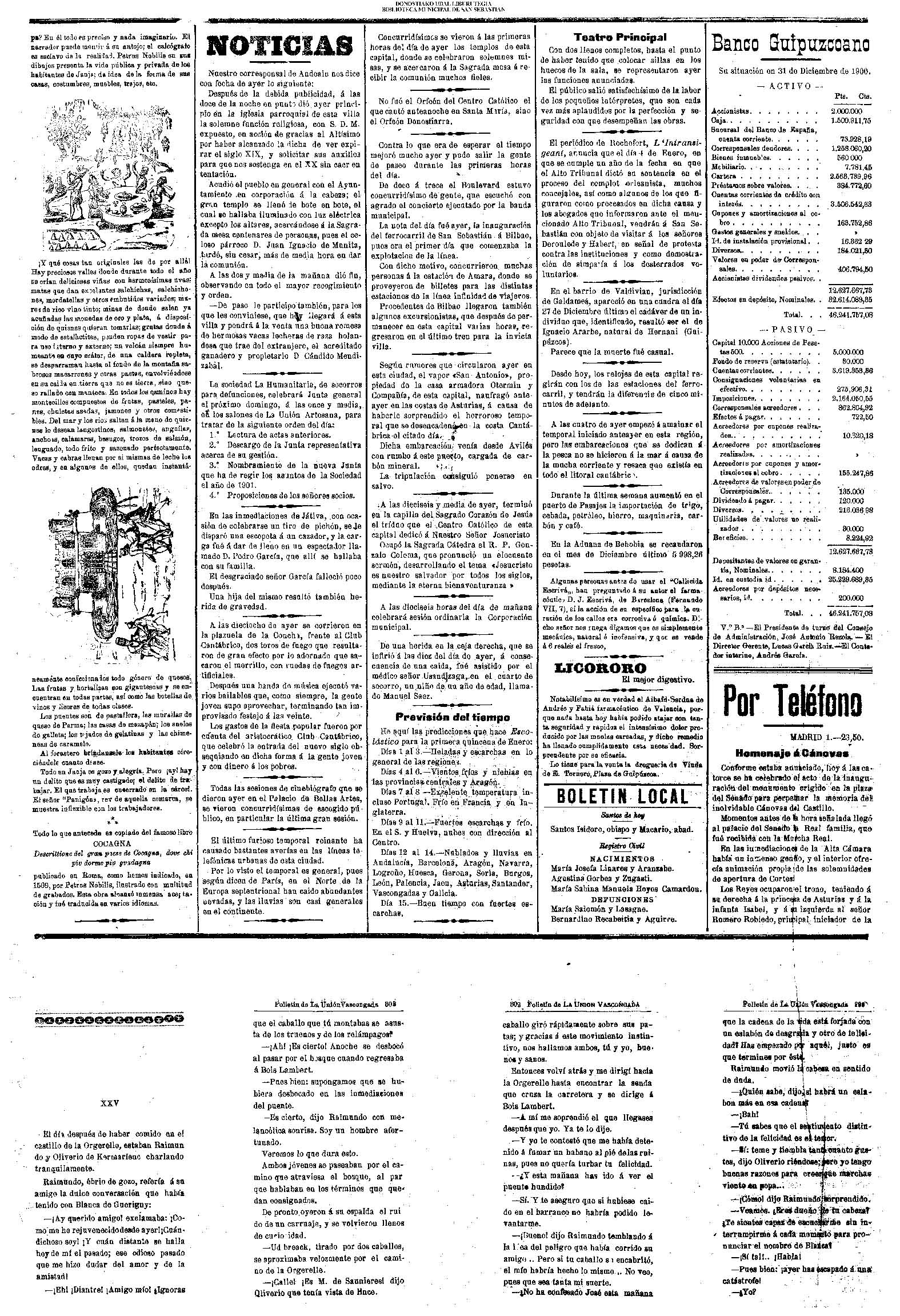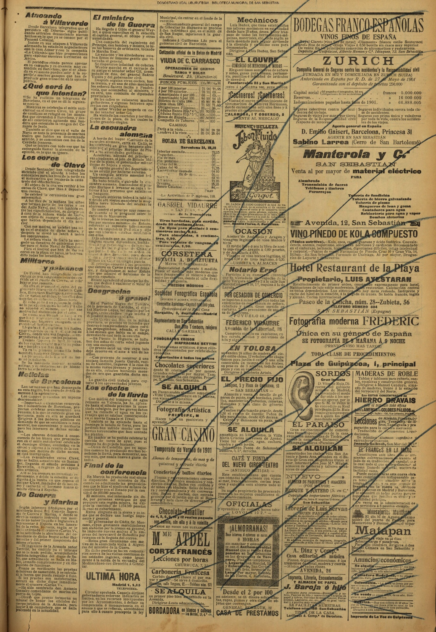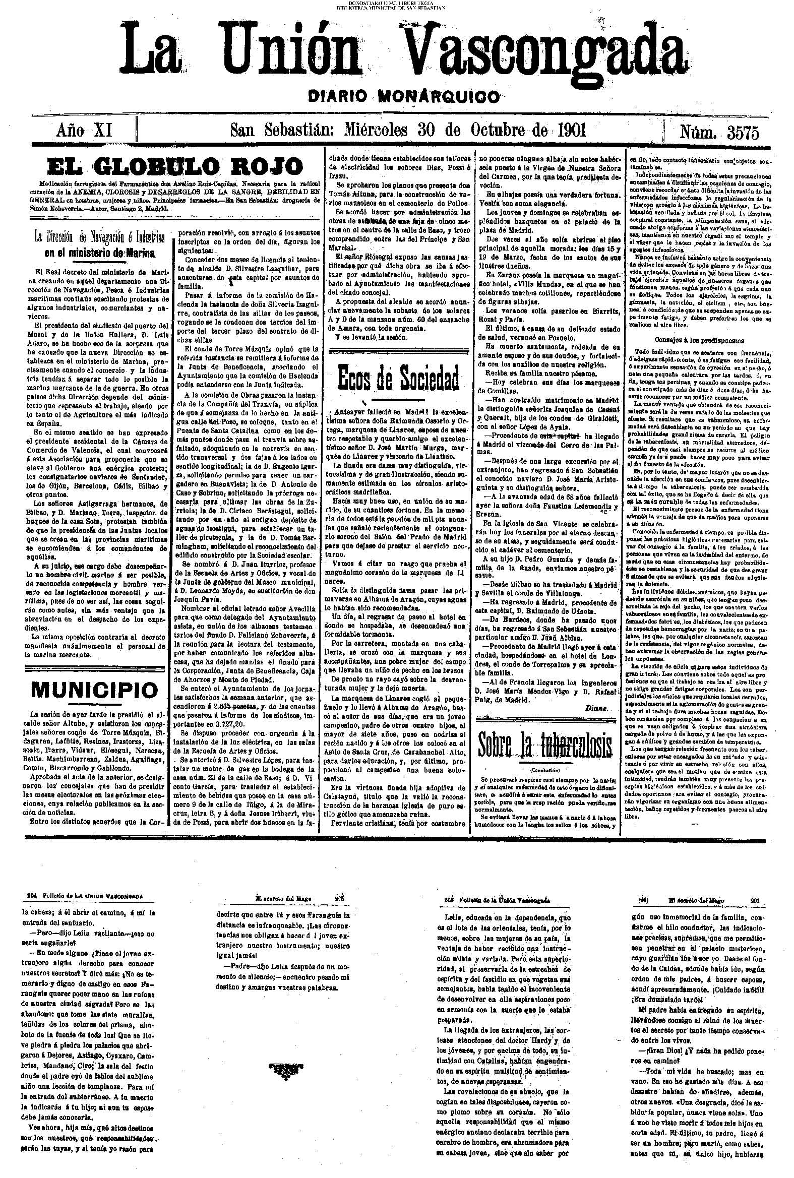 KOXKAS DONOSTIARRAS : "Curiosidades" El primer anuncio de la próxima llegada de las Navidades aparecía en los escaparates. Junto a otrsas golosinas, allí estaba en cajón o en barras el turrón, teniendo a su lado las olorosas aceitunas, las encendidas granadas, las peladillas bien envueltas en su capa de azúcar, los anises confitados, la garrapiñada, todo ese mundo de delicias. Al turrón le siguen el ejército de botellas y capones, de fiembres y pavos, de frutas sabrosísimas, de manjares incontables. Si en los días de Navidad sabe mejor el turrón, ¡qué deseado es siempre!¡Qué dulce es gustar siempre un cachito del azucarado postre!. La llegada del turrón era saludada en los periódicos de hace un siglo, que daban cuenta de que establecimiento había sido el primero en ponerlo en sus escaparates, como aviso urgente de que las Navidades estaban llegando. El cine llegó a nuestra ciudad hace un siglo. Entonces se llamaba Cinebiógrafo y las sesiones que daban eran cortas pero variadísimas. Vea el lector el programa que anunciaba el Cinebiógrafo Lumiére para el domingo 8 de diciembre de 1901. Primera sesión, a las 4 de la tarde : escenas cómicas. Magia moderna. Gabinete encantado. En la ratonera. El diablo en el convento. Regalo: rifa de una carabina Eureka. Segunda sesión, a las 5 de la tarde: Escenas marítimas. Seis retratos una peseta. Los apuros de don Cleto. Pirámides humanas. La luna, a un metro. Regalo: rifa de un servicio de porcelana para su muñeca. Tercera sesión, a las 6 de la tarde: Desfiles militares. Baile en el Olimpia. Entierro de la reina Victoria. Llegada de un tren. La Cenicienta. Regalo: rifa de un tren. Cuarta sesión, a las 7 de la tarde : Escenas infantiles. Danza de fuego. La portera burlada. Episodios del Fausto. Corrida de toros. Regalo: rifa de una preciosa muñeca. El cinebiógrafo de Bellas Artes, aquellos primeros días de diciembre de 1901, proyectaba Noel y anunciaba La caperuza roja, el popular cuento que todos los niños conocían, para los próximos días. Antes había proyectado la Cenicienta y Juana de Arco. Por aquellos días, en un par de escenarios hacían sus galas y su modo de retorcerse siete u ocho chiquillas "de esas que van de bellas". Con la cabeza coquetonamente cubierta por un sombrero, con la vistosa falta de colorines "previamente recogida como si estuviera pasando a pie un río, y el pañolón de Manila rodeado al cuerpo", comienza la suerte del tirabuzón, o sea, la del sacacorchos. Aquellas chicas se retuercen, hacen cosas raras con los pies, con las manos, con todo el cuerpo, volviendo locos a los espectadores. |