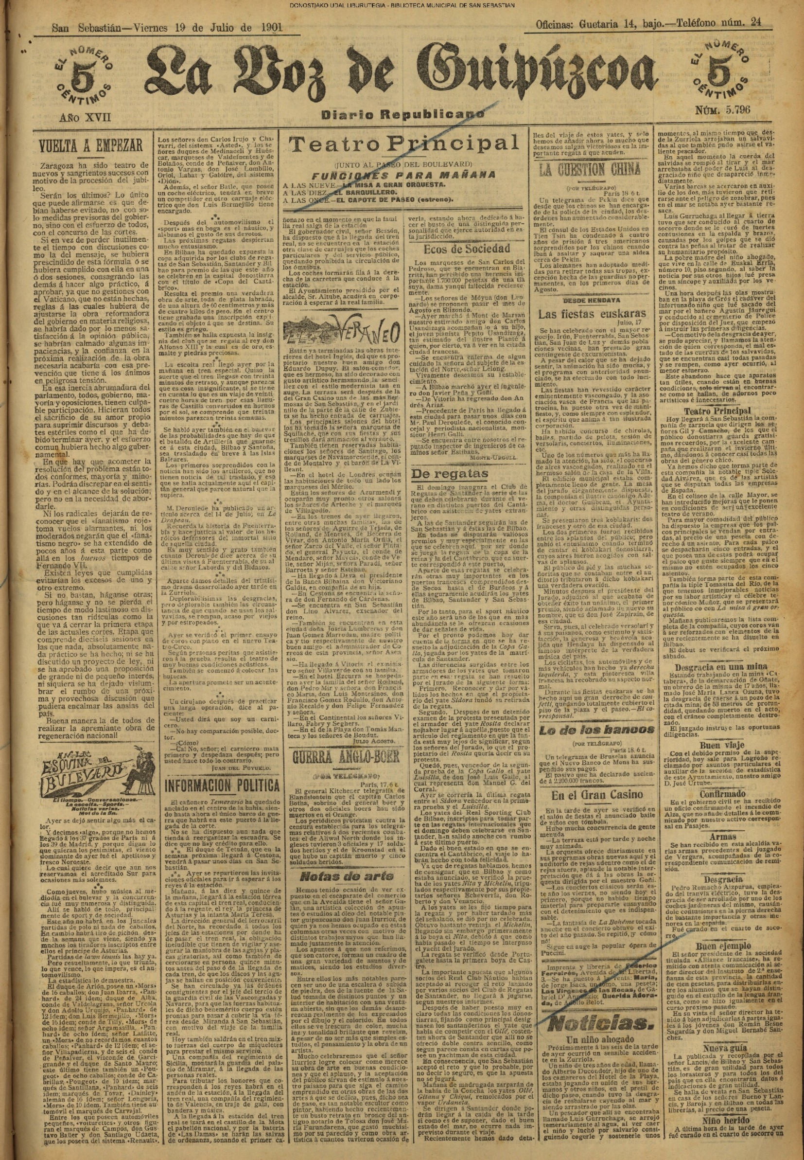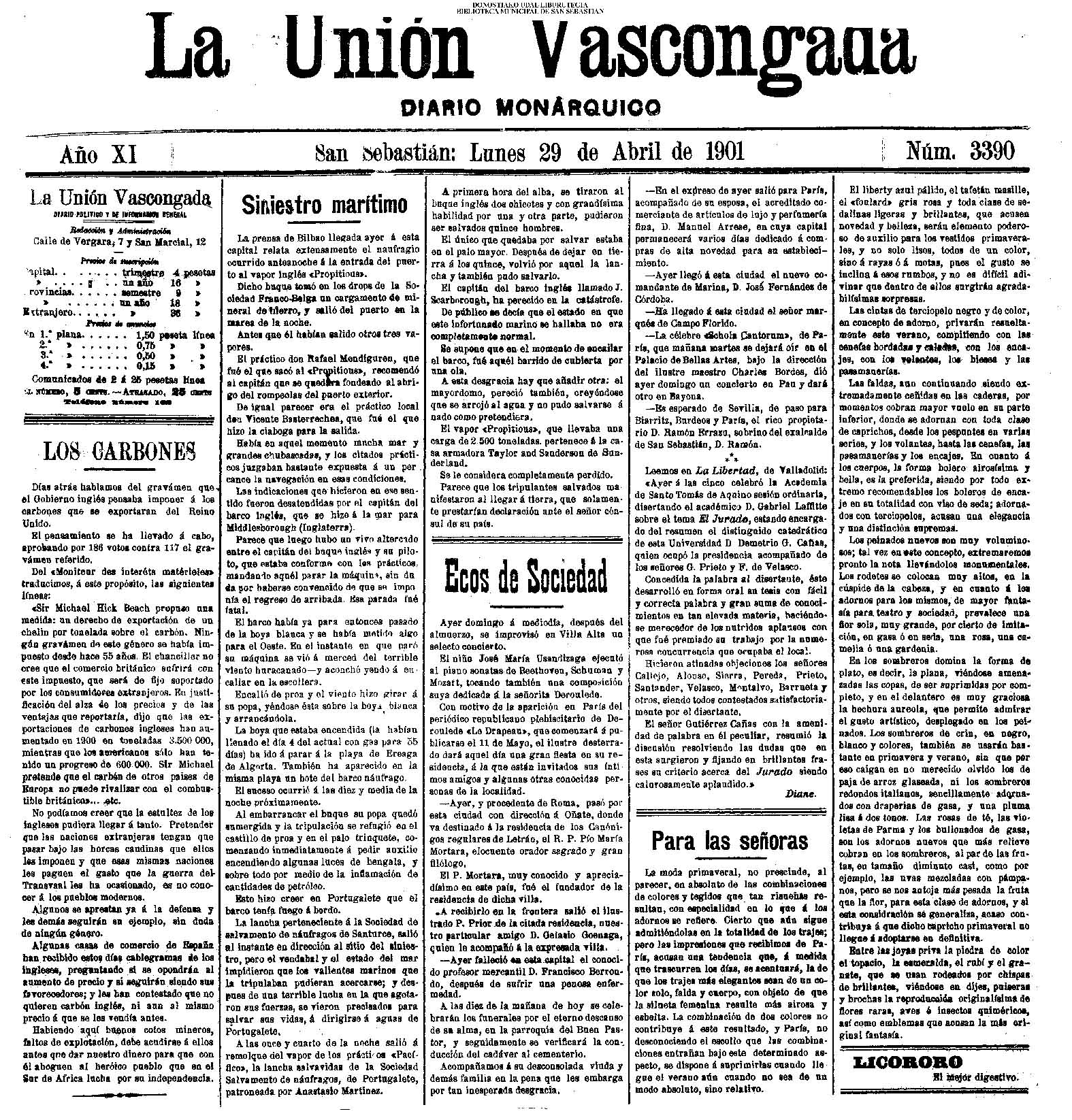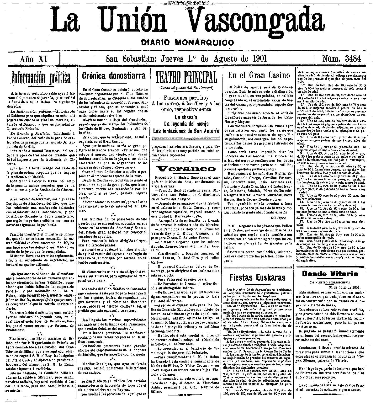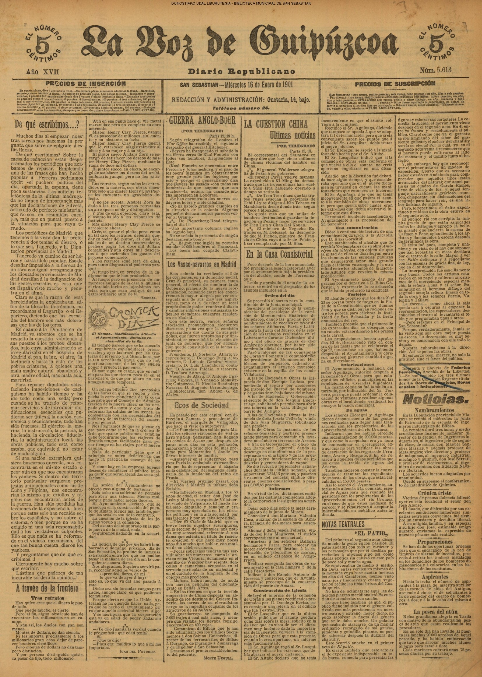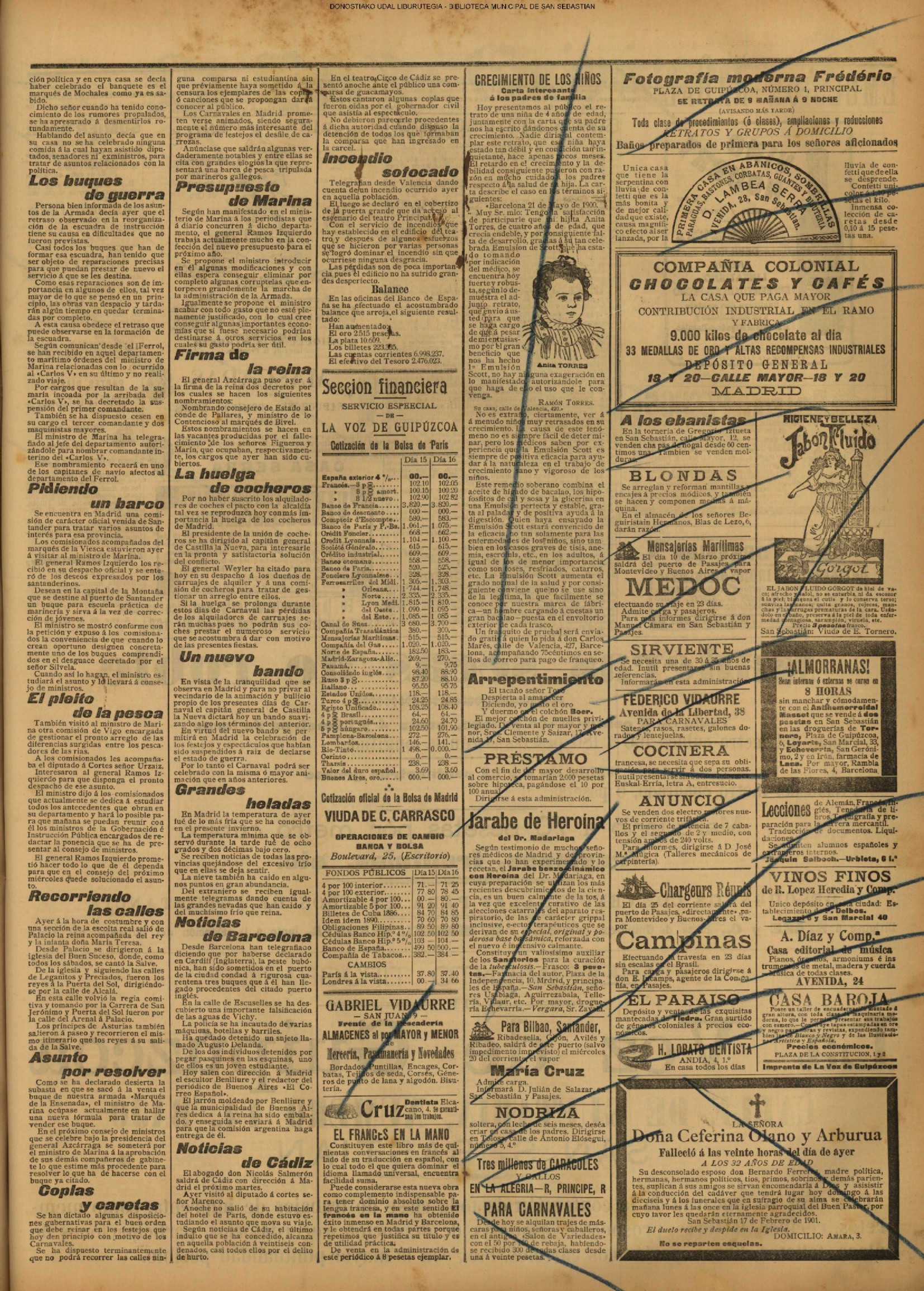 KOXKAS DONOSTIARRAS : "Curiosidades" El primer anuncio de la próxima llegada de las Navidades aparecía en los escaparates. Junto a otrsas golosinas, allí estaba en cajón o en barras el turrón, teniendo a su lado las olorosas aceitunas, las encendidas granadas, las peladillas bien envueltas en su capa de azúcar, los anises confitados, la garrapiñada, todo ese mundo de delicias. Al turrón le siguen el ejército de botellas y capones, de fiembres y pavos, de frutas sabrosísimas, de manjares incontables. Si en los días de Navidad sabe mejor el turrón, ¡qué deseado es siempre!¡Qué dulce es gustar siempre un cachito del azucarado postre!. La llegada del turrón era saludada en los periódicos de hace un siglo, que daban cuenta de que establecimiento había sido el primero en ponerlo en sus escaparates, como aviso urgente de que las Navidades estaban llegando. El cine llegó a nuestra ciudad hace un siglo. Entonces se llamaba Cinebiógrafo y las sesiones que daban eran cortas pero variadísimas. Vea el lector el programa que anunciaba el Cinebiógrafo Lumiére para el domingo 8 de diciembre de 1901. Primera sesión, a las 4 de la tarde : escenas cómicas. Magia moderna. Gabinete encantado. En la ratonera. El diablo en el convento. Regalo: rifa de una carabina Eureka. Segunda sesión, a las 5 de la tarde: Escenas marítimas. Seis retratos una peseta. Los apuros de don Cleto. Pirámides humanas. La luna, a un metro. Regalo: rifa de un servicio de porcelana para su muñeca. Tercera sesión, a las 6 de la tarde: Desfiles militares. Baile en el Olimpia. Entierro de la reina Victoria. Llegada de un tren. La Cenicienta. Regalo: rifa de un tren. Cuarta sesión, a las 7 de la tarde : Escenas infantiles. Danza de fuego. La portera burlada. Episodios del Fausto. Corrida de toros. Regalo: rifa de una preciosa muñeca. El cinebiógrafo de Bellas Artes, aquellos primeros días de diciembre de 1901, proyectaba Noel y anunciaba La caperuza roja, el popular cuento que todos los niños conocían, para los próximos días. Antes había proyectado la Cenicienta y Juana de Arco. Por aquellos días, en un par de escenarios hacían sus galas y su modo de retorcerse siete u ocho chiquillas "de esas que van de bellas". Con la cabeza coquetonamente cubierta por un sombrero, con la vistosa falta de colorines "previamente recogida como si estuviera pasando a pie un río, y el pañolón de Manila rodeado al cuerpo", comienza la suerte del tirabuzón, o sea, la del sacacorchos. Aquellas chicas se retuercen, hacen cosas raras con los pies, con las manos, con todo el cuerpo, volviendo locos a los espectadores. |