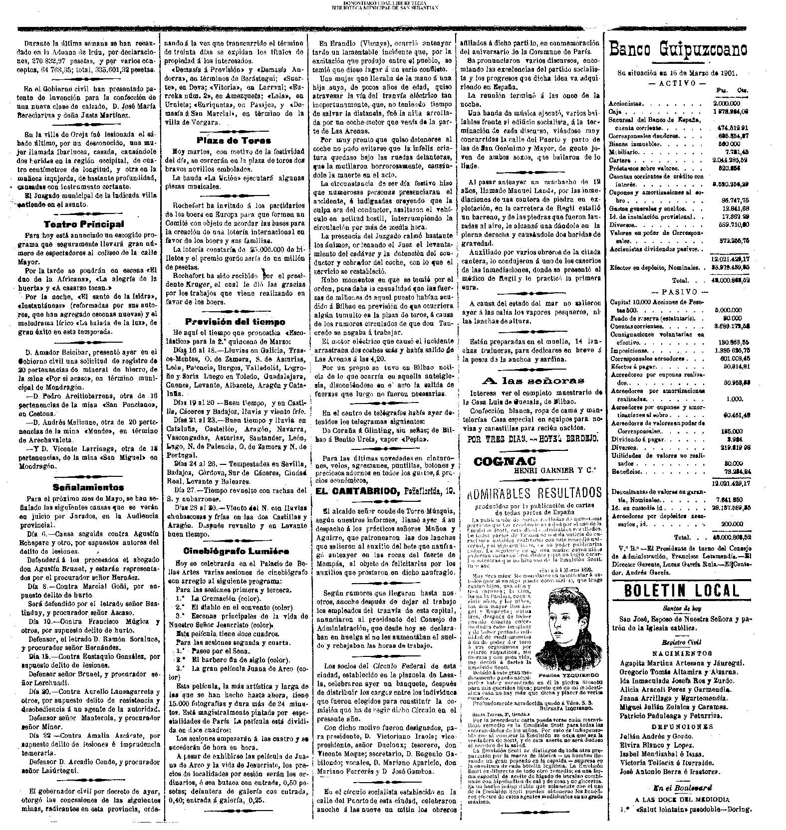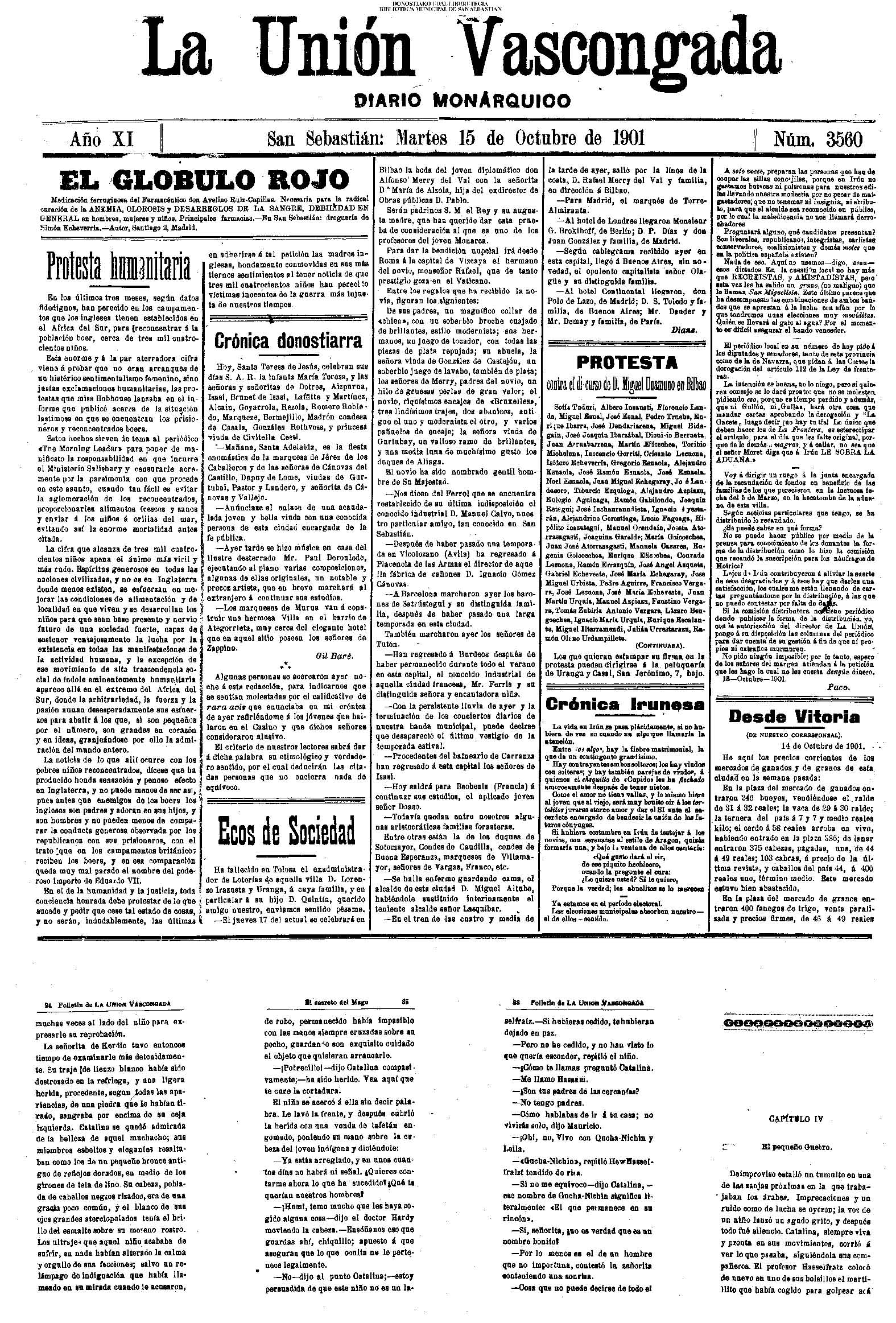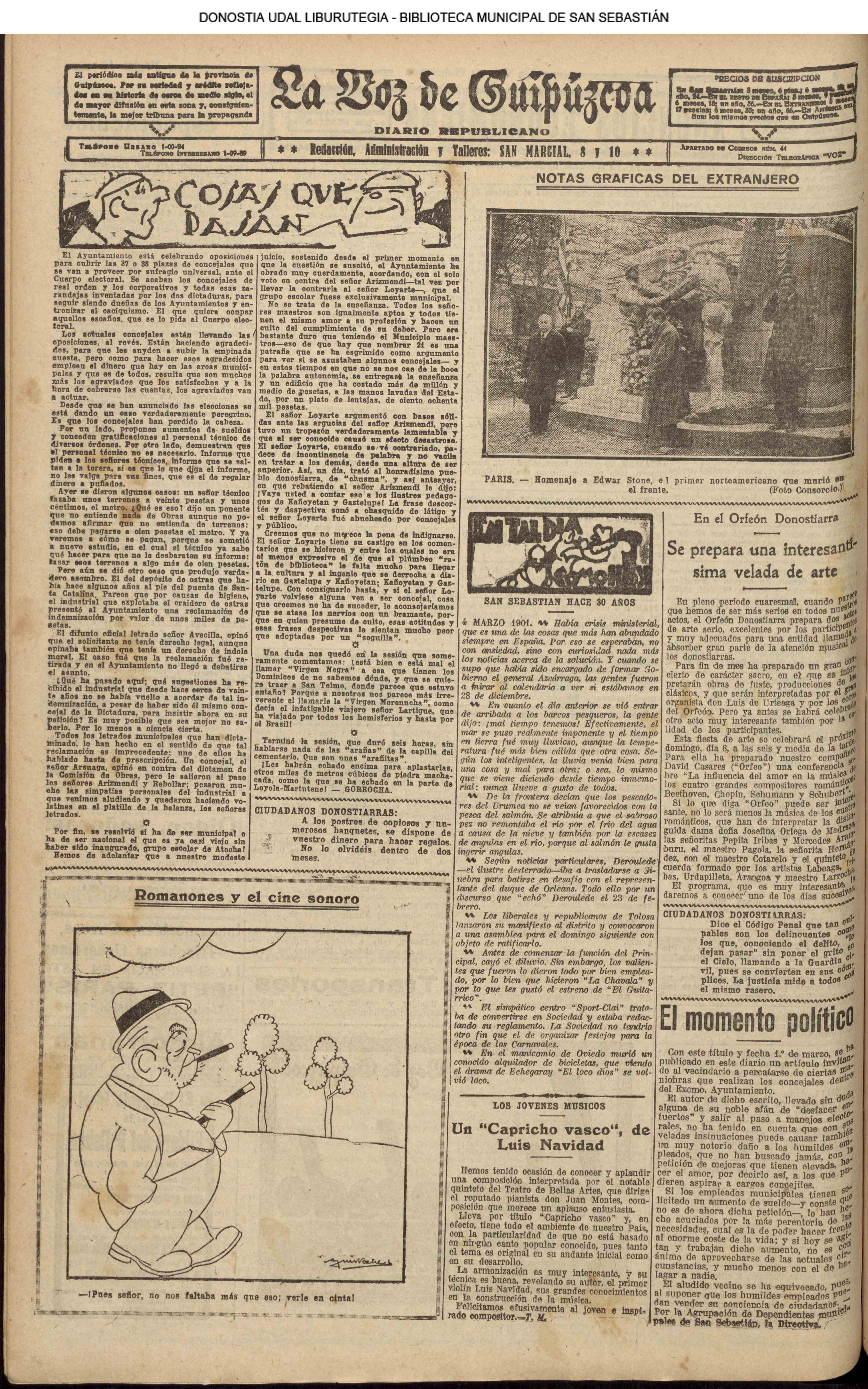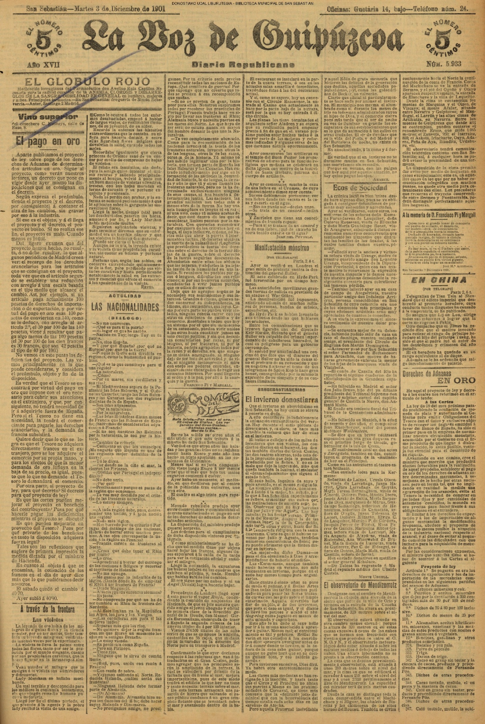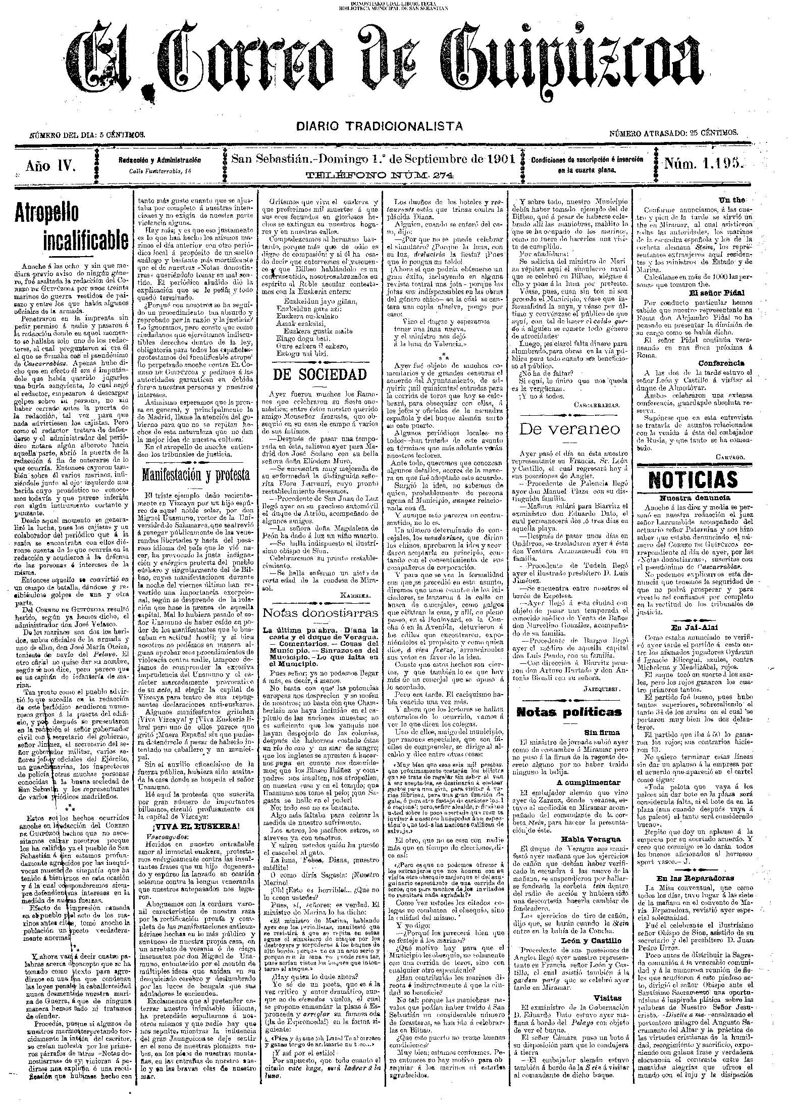 KOXKAS DONOSTIARRAS : "Curiosidades" El primer anuncio de la próxima llegada de las Navidades aparecía en los escaparates. Junto a otrsas golosinas, allí estaba en cajón o en barras el turrón, teniendo a su lado las olorosas aceitunas, las encendidas granadas, las peladillas bien envueltas en su capa de azúcar, los anises confitados, la garrapiñada, todo ese mundo de delicias. Al turrón le siguen el ejército de botellas y capones, de fiembres y pavos, de frutas sabrosísimas, de manjares incontables. Si en los días de Navidad sabe mejor el turrón, ¡qué deseado es siempre!¡Qué dulce es gustar siempre un cachito del azucarado postre!. La llegada del turrón era saludada en los periódicos de hace un siglo, que daban cuenta de que establecimiento había sido el primero en ponerlo en sus escaparates, como aviso urgente de que las Navidades estaban llegando. El cine llegó a nuestra ciudad hace un siglo. Entonces se llamaba Cinebiógrafo y las sesiones que daban eran cortas pero variadísimas. Vea el lector el programa que anunciaba el Cinebiógrafo Lumiére para el domingo 8 de diciembre de 1901. Primera sesión, a las 4 de la tarde : escenas cómicas. Magia moderna. Gabinete encantado. En la ratonera. El diablo en el convento. Regalo: rifa de una carabina Eureka. Segunda sesión, a las 5 de la tarde: Escenas marítimas. Seis retratos una peseta. Los apuros de don Cleto. Pirámides humanas. La luna, a un metro. Regalo: rifa de un servicio de porcelana para su muñeca. Tercera sesión, a las 6 de la tarde: Desfiles militares. Baile en el Olimpia. Entierro de la reina Victoria. Llegada de un tren. La Cenicienta. Regalo: rifa de un tren. Cuarta sesión, a las 7 de la tarde : Escenas infantiles. Danza de fuego. La portera burlada. Episodios del Fausto. Corrida de toros. Regalo: rifa de una preciosa muñeca. El cinebiógrafo de Bellas Artes, aquellos primeros días de diciembre de 1901, proyectaba Noel y anunciaba La caperuza roja, el popular cuento que todos los niños conocían, para los próximos días. Antes había proyectado la Cenicienta y Juana de Arco. Por aquellos días, en un par de escenarios hacían sus galas y su modo de retorcerse siete u ocho chiquillas "de esas que van de bellas". Con la cabeza coquetonamente cubierta por un sombrero, con la vistosa falta de colorines "previamente recogida como si estuviera pasando a pie un río, y el pañolón de Manila rodeado al cuerpo", comienza la suerte del tirabuzón, o sea, la del sacacorchos. Aquellas chicas se retuercen, hacen cosas raras con los pies, con las manos, con todo el cuerpo, volviendo locos a los espectadores. |