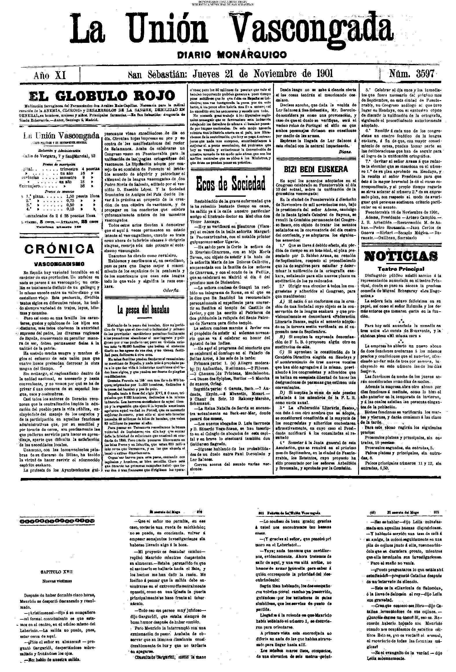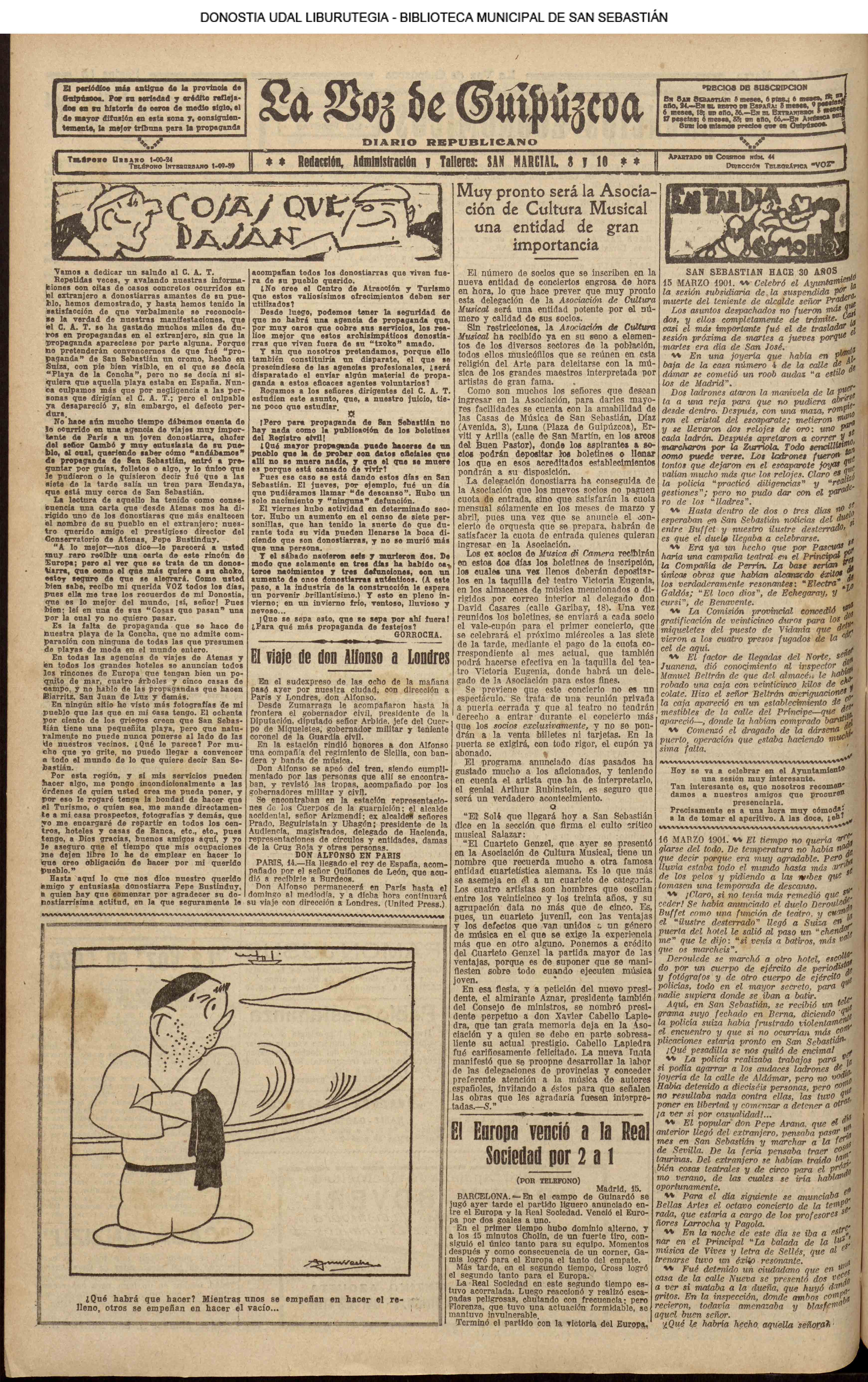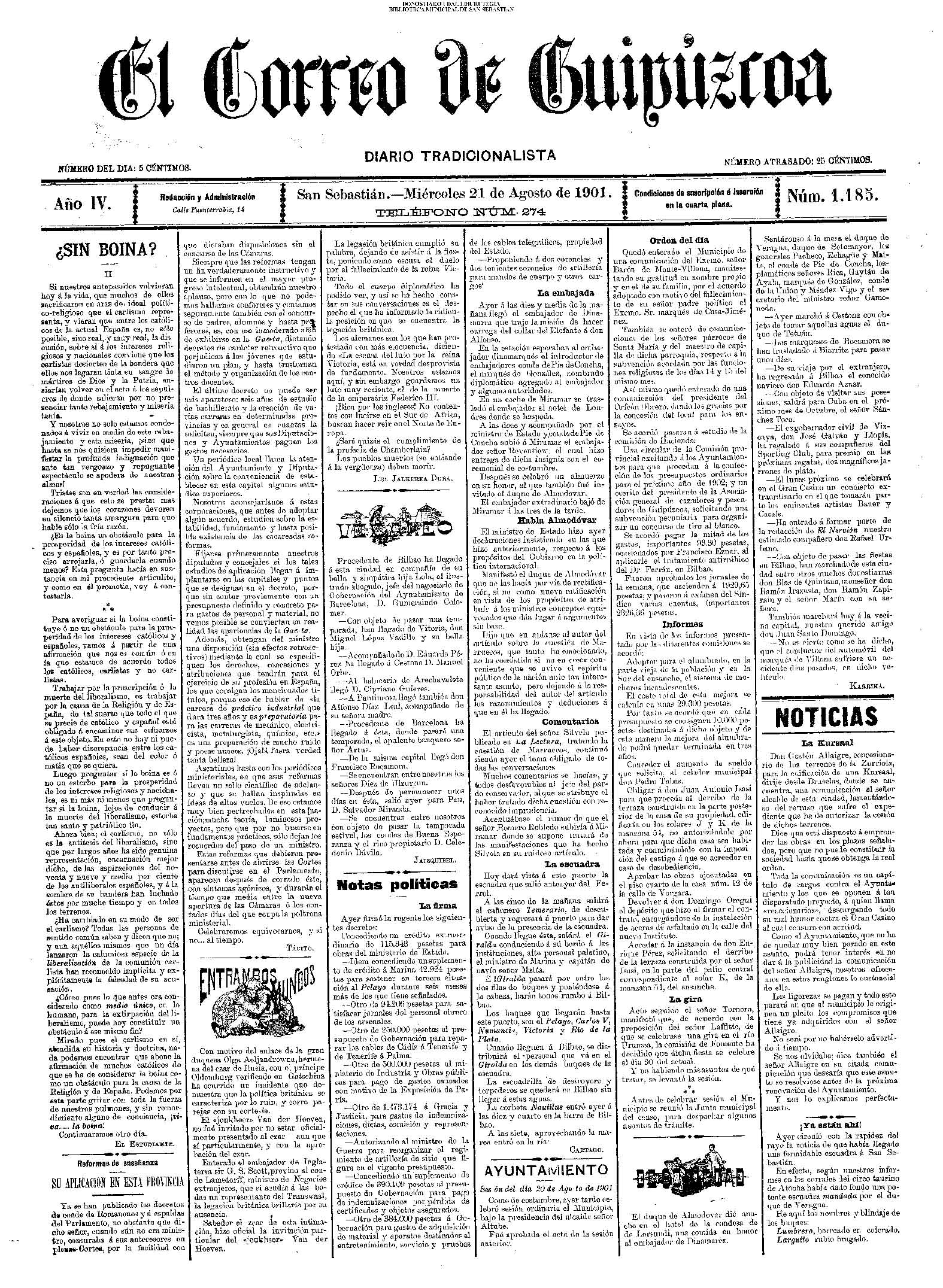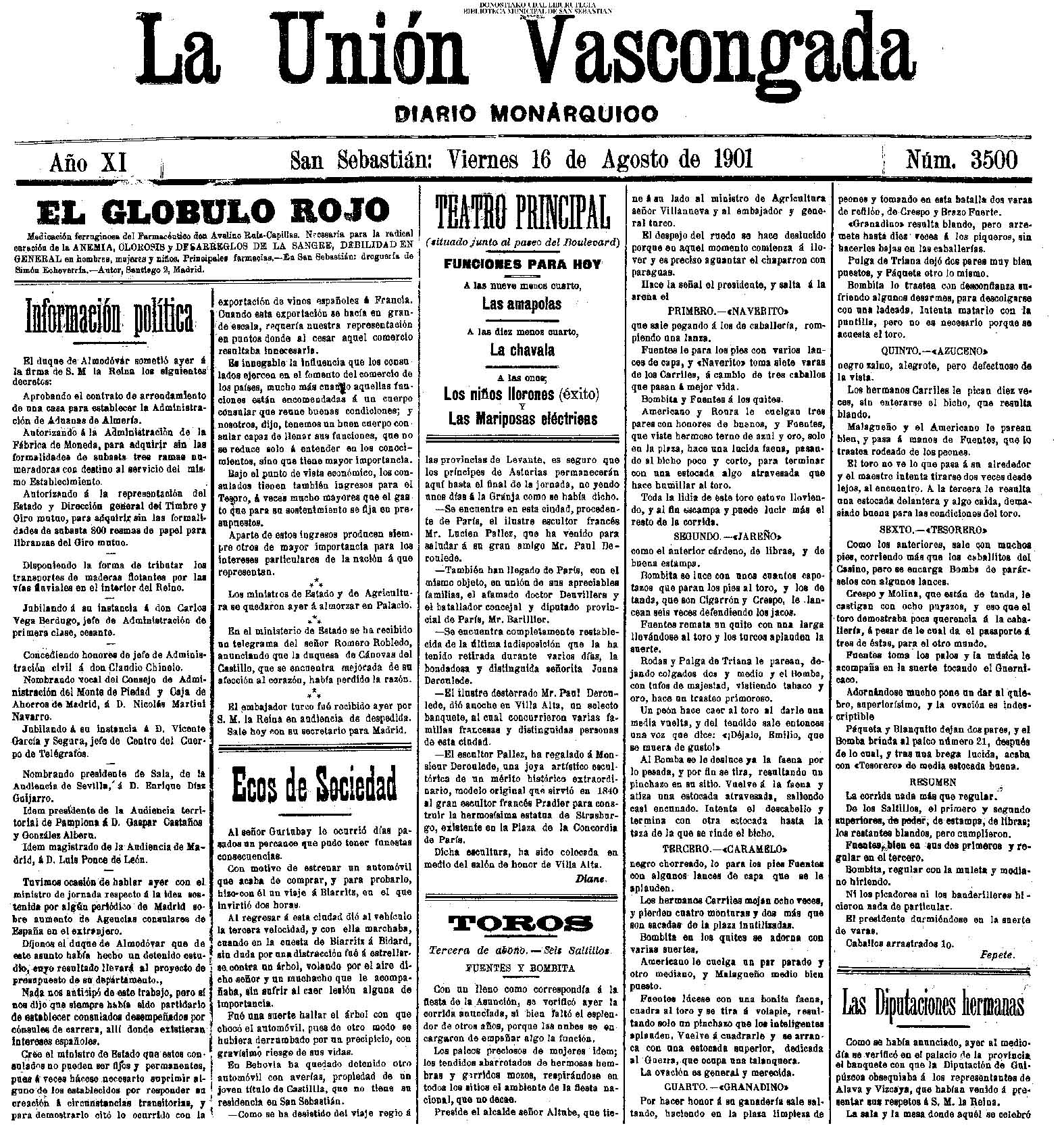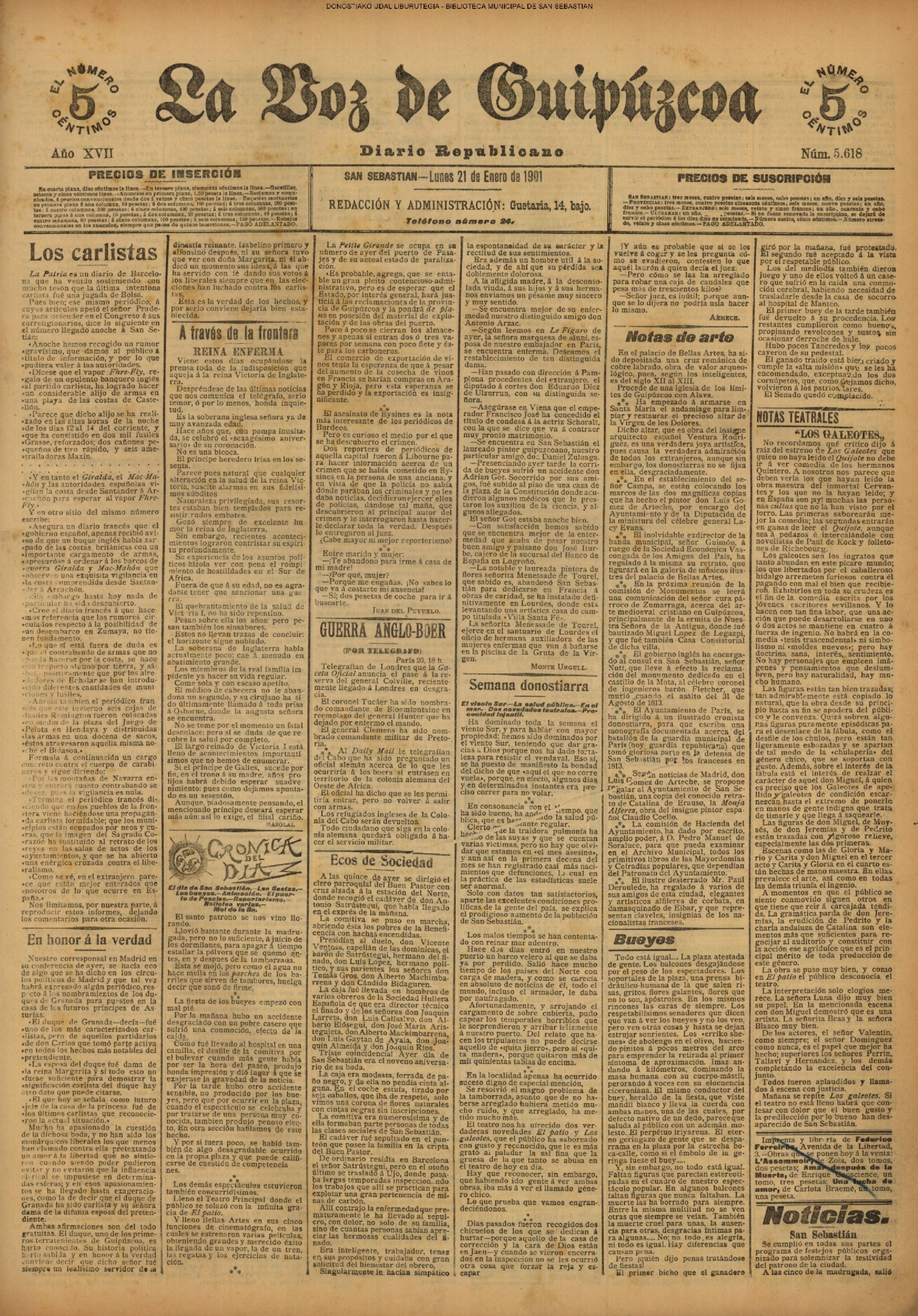 KOXKAS DONOSTIARRAS : "Curiosidades" El primer anuncio de la próxima llegada de las Navidades aparecía en los escaparates. Junto a otrsas golosinas, allí estaba en cajón o en barras el turrón, teniendo a su lado las olorosas aceitunas, las encendidas granadas, las peladillas bien envueltas en su capa de azúcar, los anises confitados, la garrapiñada, todo ese mundo de delicias. Al turrón le siguen el ejército de botellas y capones, de fiembres y pavos, de frutas sabrosísimas, de manjares incontables. Si en los días de Navidad sabe mejor el turrón, ¡qué deseado es siempre!¡Qué dulce es gustar siempre un cachito del azucarado postre!. La llegada del turrón era saludada en los periódicos de hace un siglo, que daban cuenta de que establecimiento había sido el primero en ponerlo en sus escaparates, como aviso urgente de que las Navidades estaban llegando. El cine llegó a nuestra ciudad hace un siglo. Entonces se llamaba Cinebiógrafo y las sesiones que daban eran cortas pero variadísimas. Vea el lector el programa que anunciaba el Cinebiógrafo Lumiére para el domingo 8 de diciembre de 1901. Primera sesión, a las 4 de la tarde : escenas cómicas. Magia moderna. Gabinete encantado. En la ratonera. El diablo en el convento. Regalo: rifa de una carabina Eureka. Segunda sesión, a las 5 de la tarde: Escenas marítimas. Seis retratos una peseta. Los apuros de don Cleto. Pirámides humanas. La luna, a un metro. Regalo: rifa de un servicio de porcelana para su muñeca. Tercera sesión, a las 6 de la tarde: Desfiles militares. Baile en el Olimpia. Entierro de la reina Victoria. Llegada de un tren. La Cenicienta. Regalo: rifa de un tren. Cuarta sesión, a las 7 de la tarde : Escenas infantiles. Danza de fuego. La portera burlada. Episodios del Fausto. Corrida de toros. Regalo: rifa de una preciosa muñeca. El cinebiógrafo de Bellas Artes, aquellos primeros días de diciembre de 1901, proyectaba Noel y anunciaba La caperuza roja, el popular cuento que todos los niños conocían, para los próximos días. Antes había proyectado la Cenicienta y Juana de Arco. Por aquellos días, en un par de escenarios hacían sus galas y su modo de retorcerse siete u ocho chiquillas "de esas que van de bellas". Con la cabeza coquetonamente cubierta por un sombrero, con la vistosa falta de colorines "previamente recogida como si estuviera pasando a pie un río, y el pañolón de Manila rodeado al cuerpo", comienza la suerte del tirabuzón, o sea, la del sacacorchos. Aquellas chicas se retuercen, hacen cosas raras con los pies, con las manos, con todo el cuerpo, volviendo locos a los espectadores. |