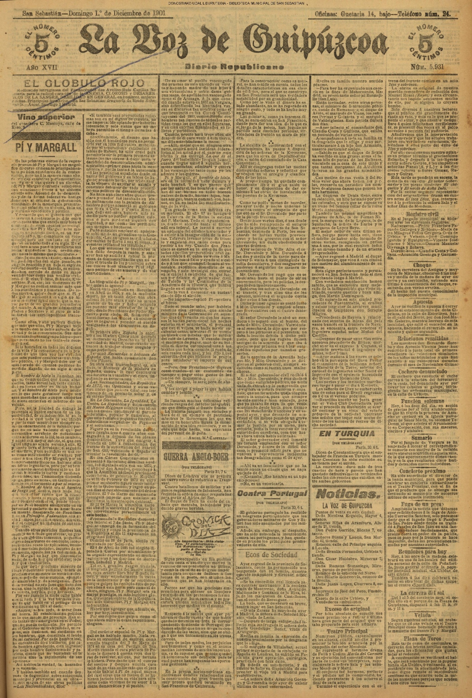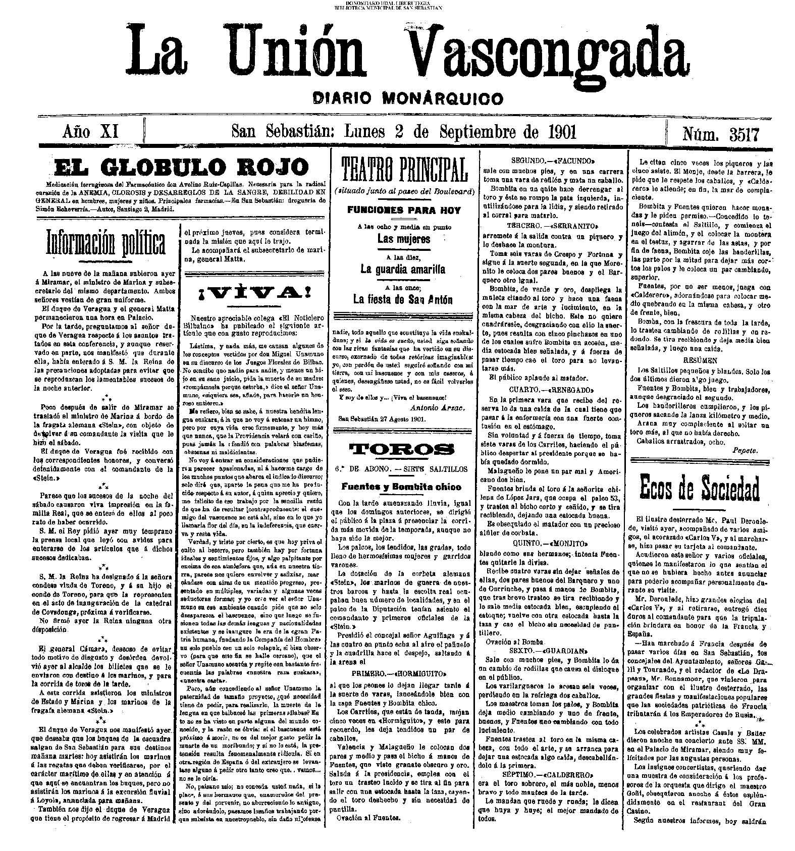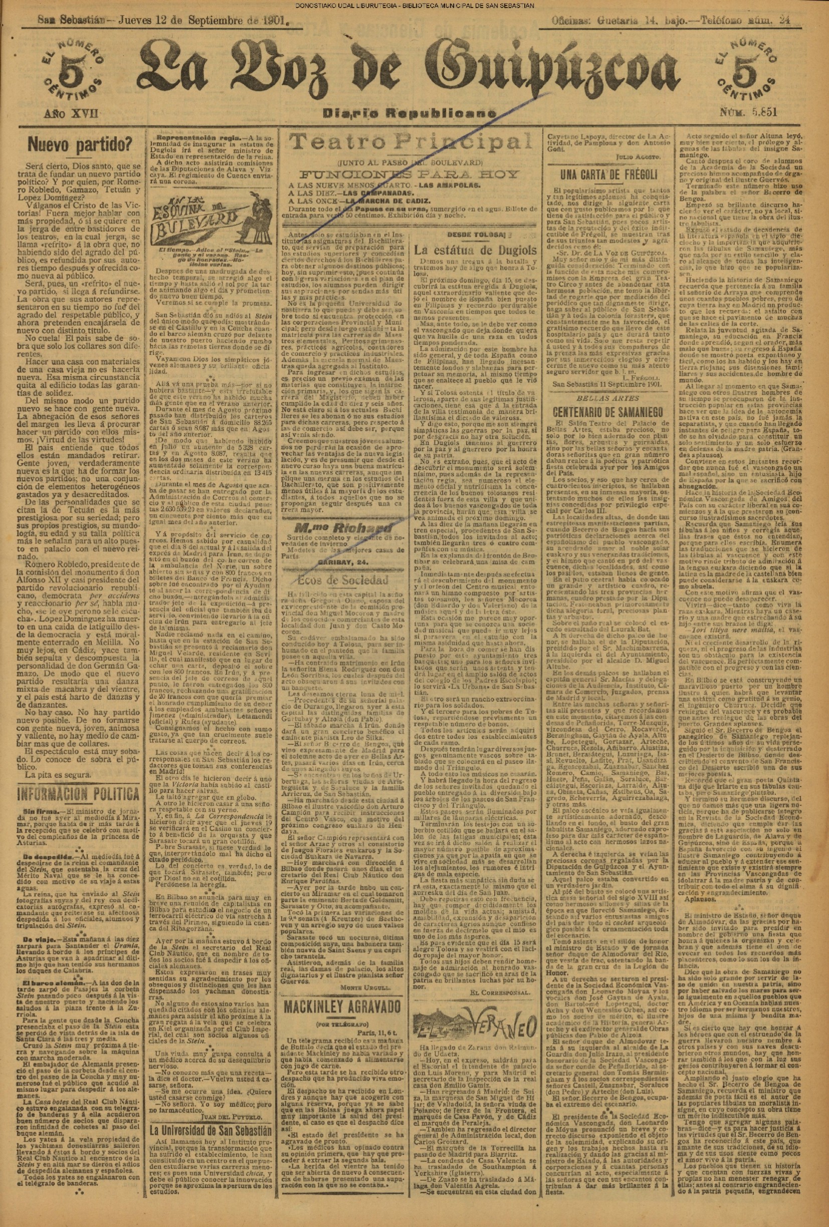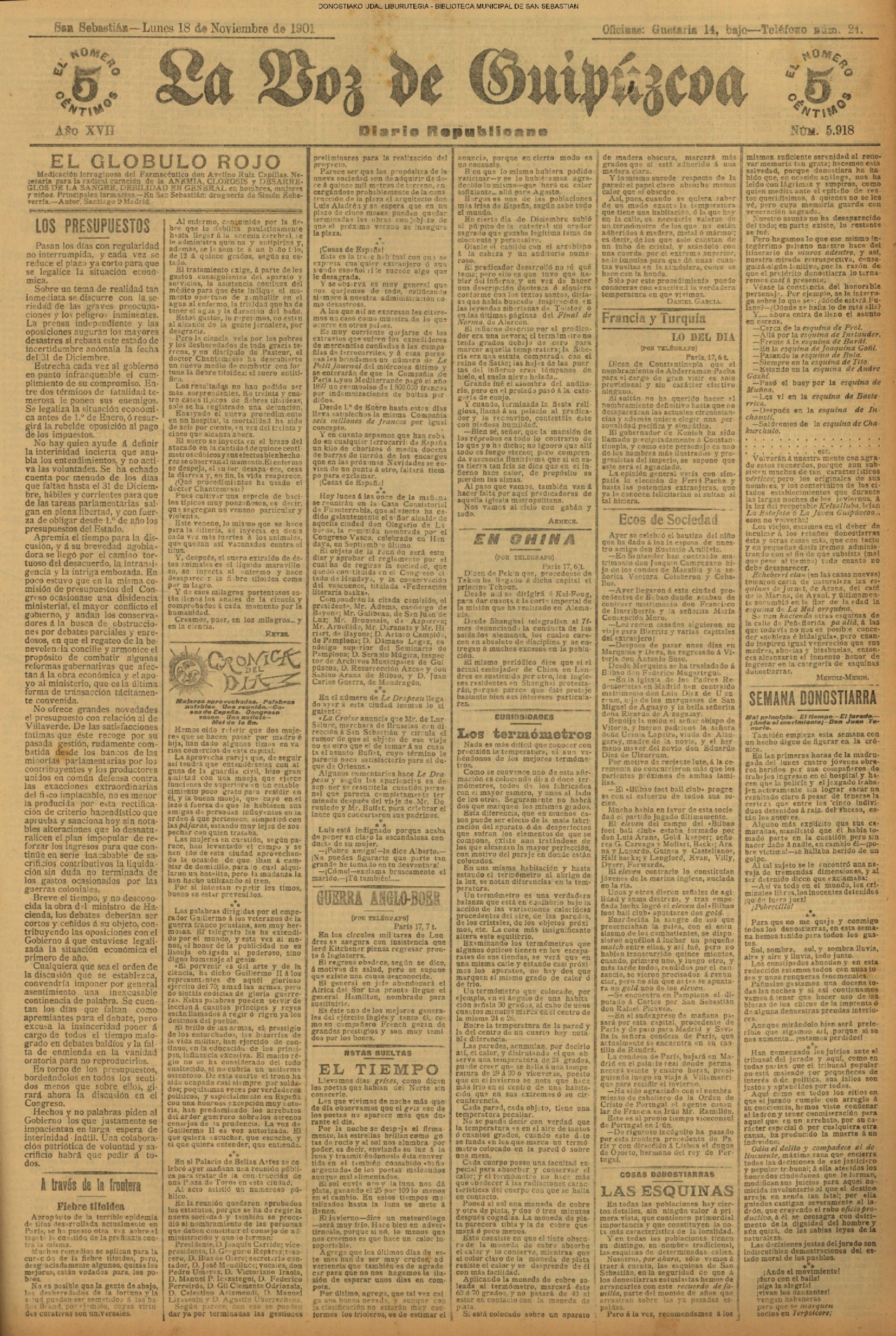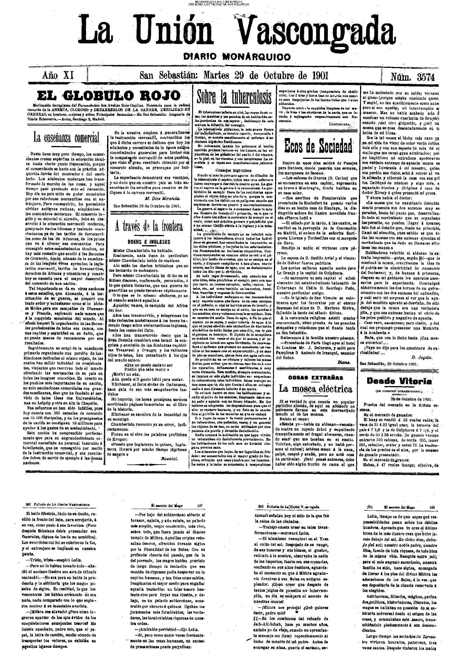 KOXKAS DONOSTIARRAS : "Curiosidades" El primer anuncio de la próxima llegada de las Navidades aparecía en los escaparates. Junto a otrsas golosinas, allí estaba en cajón o en barras el turrón, teniendo a su lado las olorosas aceitunas, las encendidas granadas, las peladillas bien envueltas en su capa de azúcar, los anises confitados, la garrapiñada, todo ese mundo de delicias. Al turrón le siguen el ejército de botellas y capones, de fiembres y pavos, de frutas sabrosísimas, de manjares incontables. Si en los días de Navidad sabe mejor el turrón, ¡qué deseado es siempre!¡Qué dulce es gustar siempre un cachito del azucarado postre!. La llegada del turrón era saludada en los periódicos de hace un siglo, que daban cuenta de que establecimiento había sido el primero en ponerlo en sus escaparates, como aviso urgente de que las Navidades estaban llegando. El cine llegó a nuestra ciudad hace un siglo. Entonces se llamaba Cinebiógrafo y las sesiones que daban eran cortas pero variadísimas. Vea el lector el programa que anunciaba el Cinebiógrafo Lumiére para el domingo 8 de diciembre de 1901. Primera sesión, a las 4 de la tarde : escenas cómicas. Magia moderna. Gabinete encantado. En la ratonera. El diablo en el convento. Regalo: rifa de una carabina Eureka. Segunda sesión, a las 5 de la tarde: Escenas marítimas. Seis retratos una peseta. Los apuros de don Cleto. Pirámides humanas. La luna, a un metro. Regalo: rifa de un servicio de porcelana para su muñeca. Tercera sesión, a las 6 de la tarde: Desfiles militares. Baile en el Olimpia. Entierro de la reina Victoria. Llegada de un tren. La Cenicienta. Regalo: rifa de un tren. Cuarta sesión, a las 7 de la tarde : Escenas infantiles. Danza de fuego. La portera burlada. Episodios del Fausto. Corrida de toros. Regalo: rifa de una preciosa muñeca. El cinebiógrafo de Bellas Artes, aquellos primeros días de diciembre de 1901, proyectaba Noel y anunciaba La caperuza roja, el popular cuento que todos los niños conocían, para los próximos días. Antes había proyectado la Cenicienta y Juana de Arco. Por aquellos días, en un par de escenarios hacían sus galas y su modo de retorcerse siete u ocho chiquillas "de esas que van de bellas". Con la cabeza coquetonamente cubierta por un sombrero, con la vistosa falta de colorines "previamente recogida como si estuviera pasando a pie un río, y el pañolón de Manila rodeado al cuerpo", comienza la suerte del tirabuzón, o sea, la del sacacorchos. Aquellas chicas se retuercen, hacen cosas raras con los pies, con las manos, con todo el cuerpo, volviendo locos a los espectadores. |