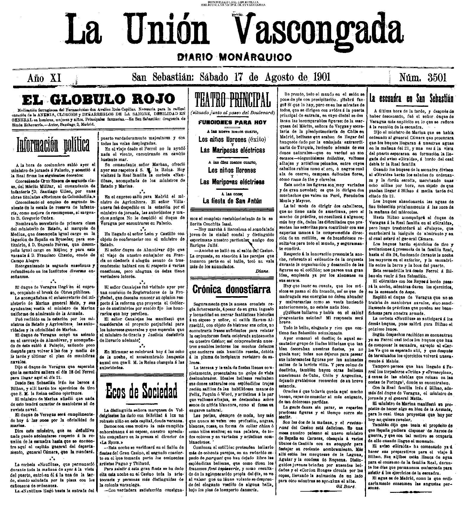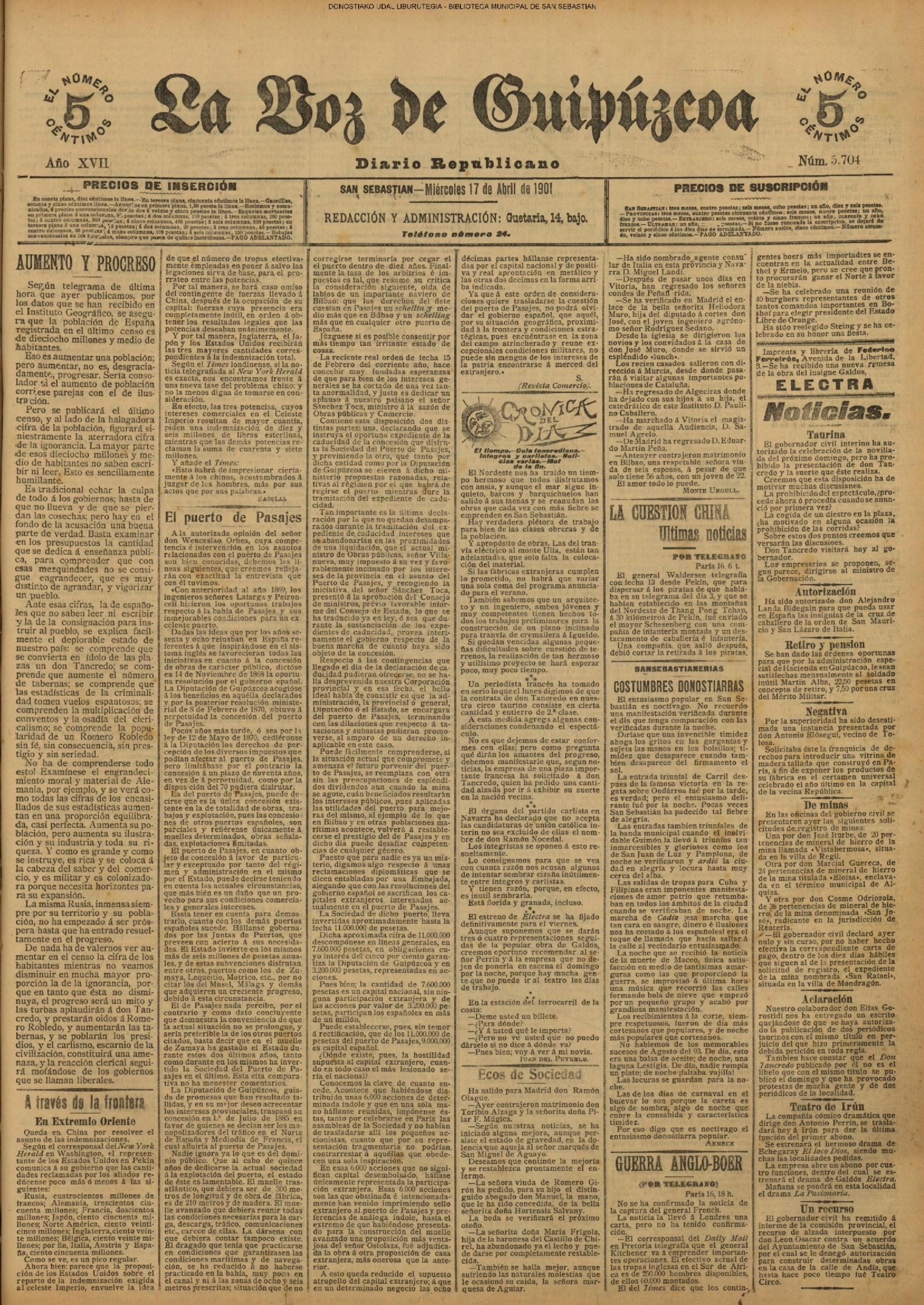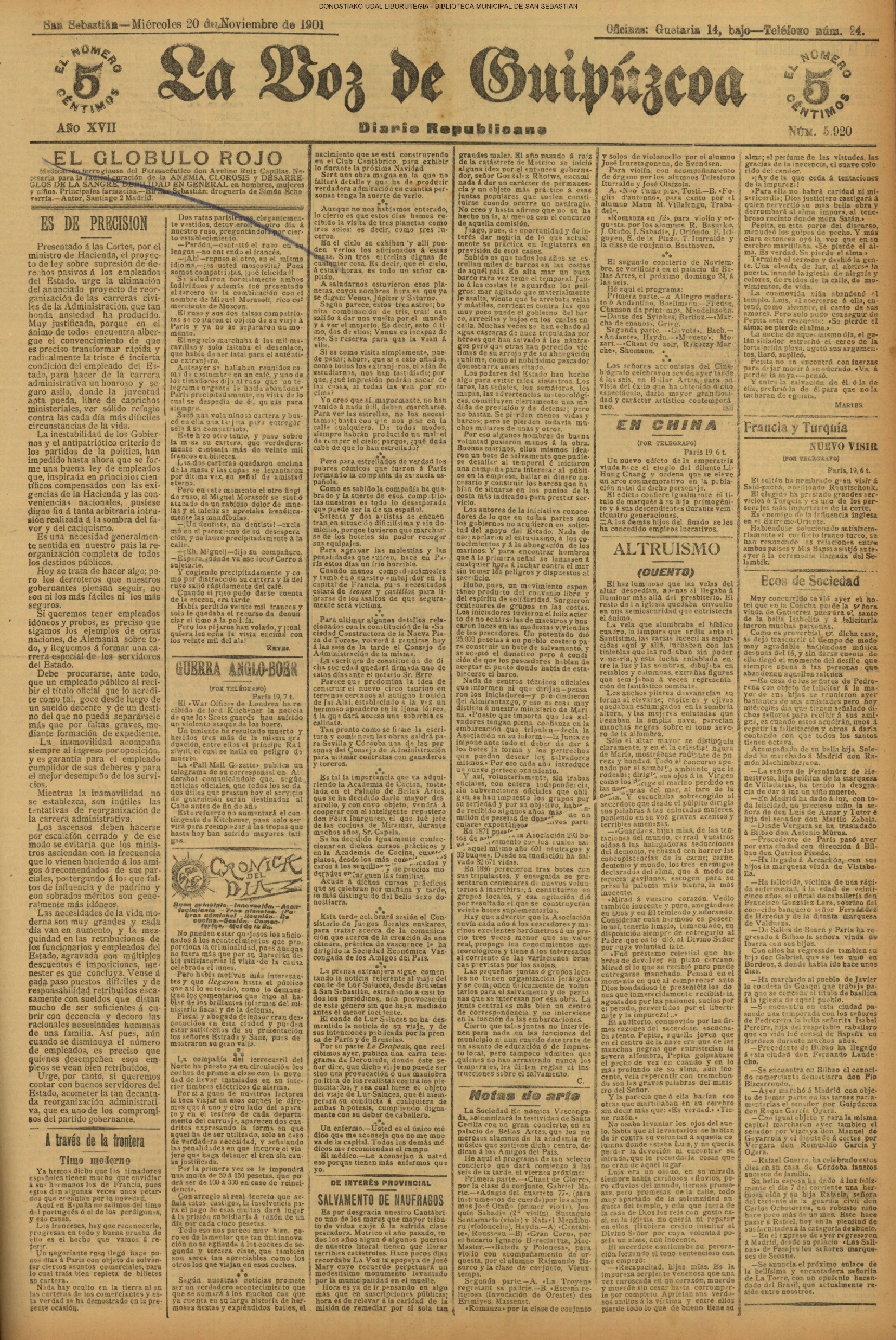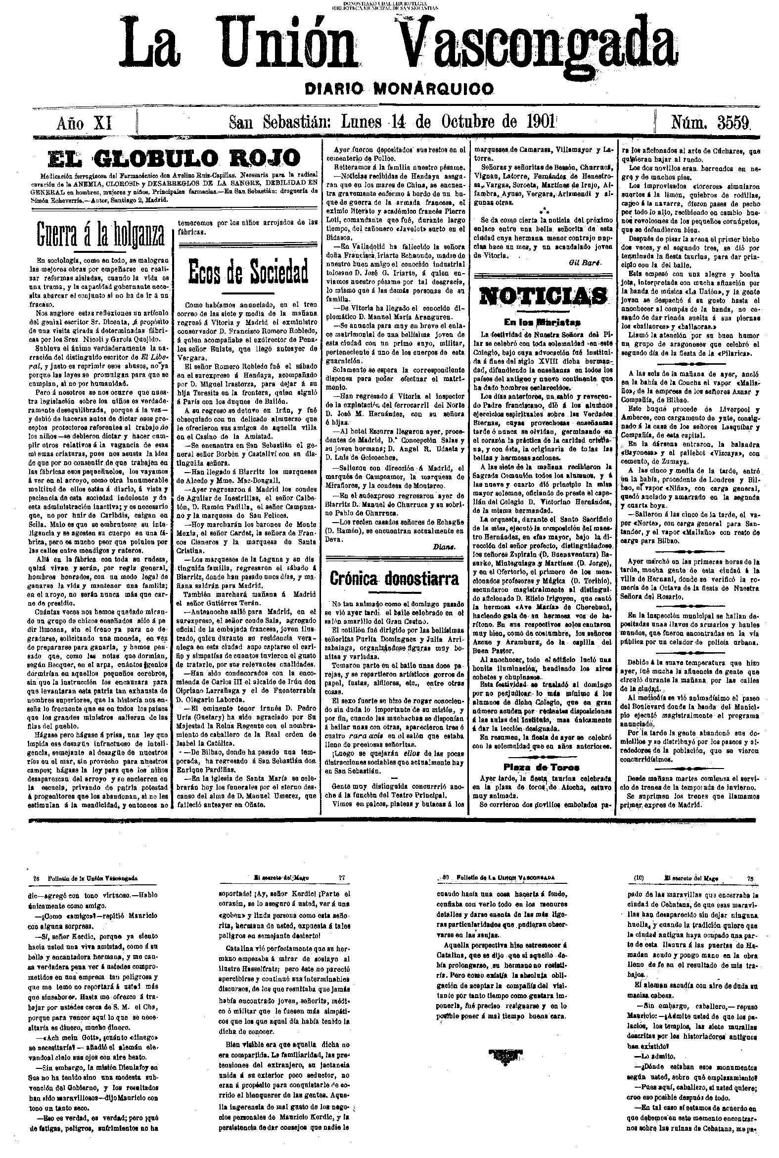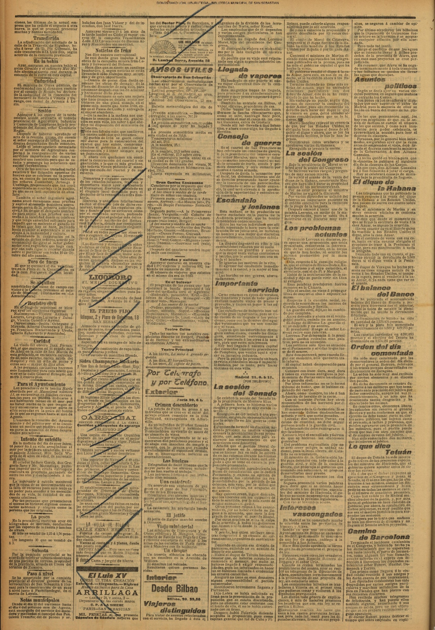 KOXKAS DONOSTIARRAS : "Curiosidades" El primer anuncio de la próxima llegada de las Navidades aparecía en los escaparates. Junto a otrsas golosinas, allí estaba en cajón o en barras el turrón, teniendo a su lado las olorosas aceitunas, las encendidas granadas, las peladillas bien envueltas en su capa de azúcar, los anises confitados, la garrapiñada, todo ese mundo de delicias. Al turrón le siguen el ejército de botellas y capones, de fiembres y pavos, de frutas sabrosísimas, de manjares incontables. Si en los días de Navidad sabe mejor el turrón, ¡qué deseado es siempre!¡Qué dulce es gustar siempre un cachito del azucarado postre!. La llegada del turrón era saludada en los periódicos de hace un siglo, que daban cuenta de que establecimiento había sido el primero en ponerlo en sus escaparates, como aviso urgente de que las Navidades estaban llegando. El cine llegó a nuestra ciudad hace un siglo. Entonces se llamaba Cinebiógrafo y las sesiones que daban eran cortas pero variadísimas. Vea el lector el programa que anunciaba el Cinebiógrafo Lumiére para el domingo 8 de diciembre de 1901. Primera sesión, a las 4 de la tarde : escenas cómicas. Magia moderna. Gabinete encantado. En la ratonera. El diablo en el convento. Regalo: rifa de una carabina Eureka. Segunda sesión, a las 5 de la tarde: Escenas marítimas. Seis retratos una peseta. Los apuros de don Cleto. Pirámides humanas. La luna, a un metro. Regalo: rifa de un servicio de porcelana para su muñeca. Tercera sesión, a las 6 de la tarde: Desfiles militares. Baile en el Olimpia. Entierro de la reina Victoria. Llegada de un tren. La Cenicienta. Regalo: rifa de un tren. Cuarta sesión, a las 7 de la tarde : Escenas infantiles. Danza de fuego. La portera burlada. Episodios del Fausto. Corrida de toros. Regalo: rifa de una preciosa muñeca. El cinebiógrafo de Bellas Artes, aquellos primeros días de diciembre de 1901, proyectaba Noel y anunciaba La caperuza roja, el popular cuento que todos los niños conocían, para los próximos días. Antes había proyectado la Cenicienta y Juana de Arco. Por aquellos días, en un par de escenarios hacían sus galas y su modo de retorcerse siete u ocho chiquillas "de esas que van de bellas". Con la cabeza coquetonamente cubierta por un sombrero, con la vistosa falta de colorines "previamente recogida como si estuviera pasando a pie un río, y el pañolón de Manila rodeado al cuerpo", comienza la suerte del tirabuzón, o sea, la del sacacorchos. Aquellas chicas se retuercen, hacen cosas raras con los pies, con las manos, con todo el cuerpo, volviendo locos a los espectadores. |