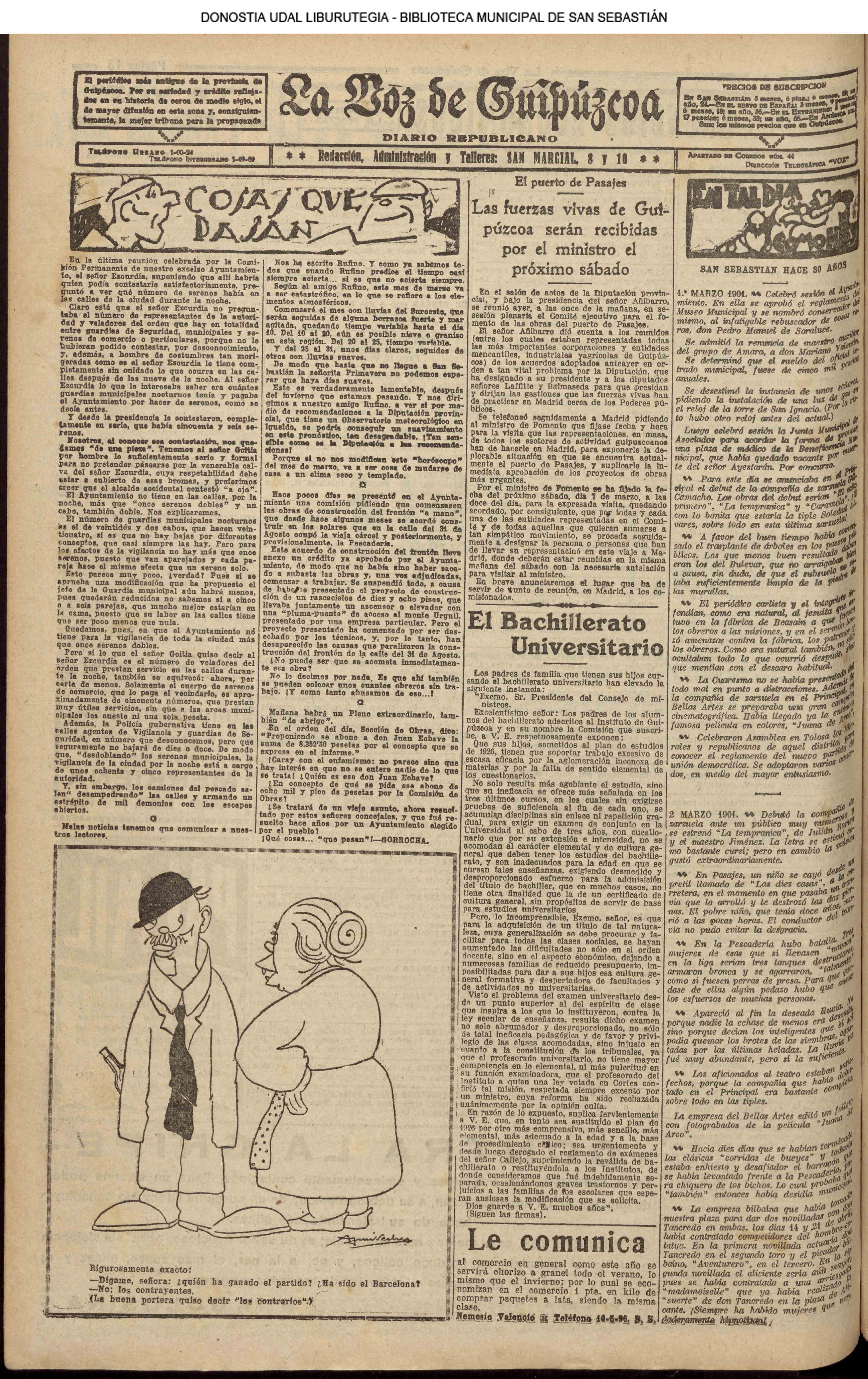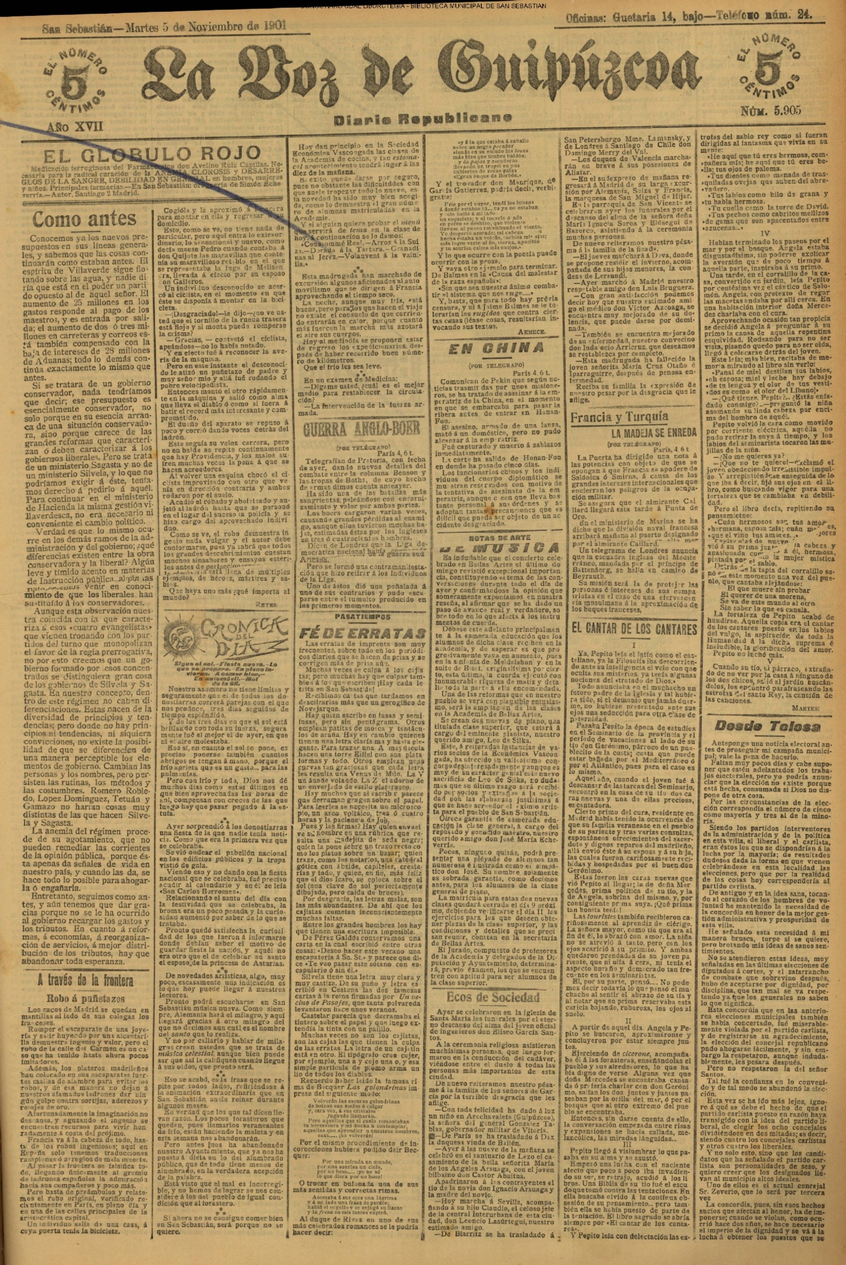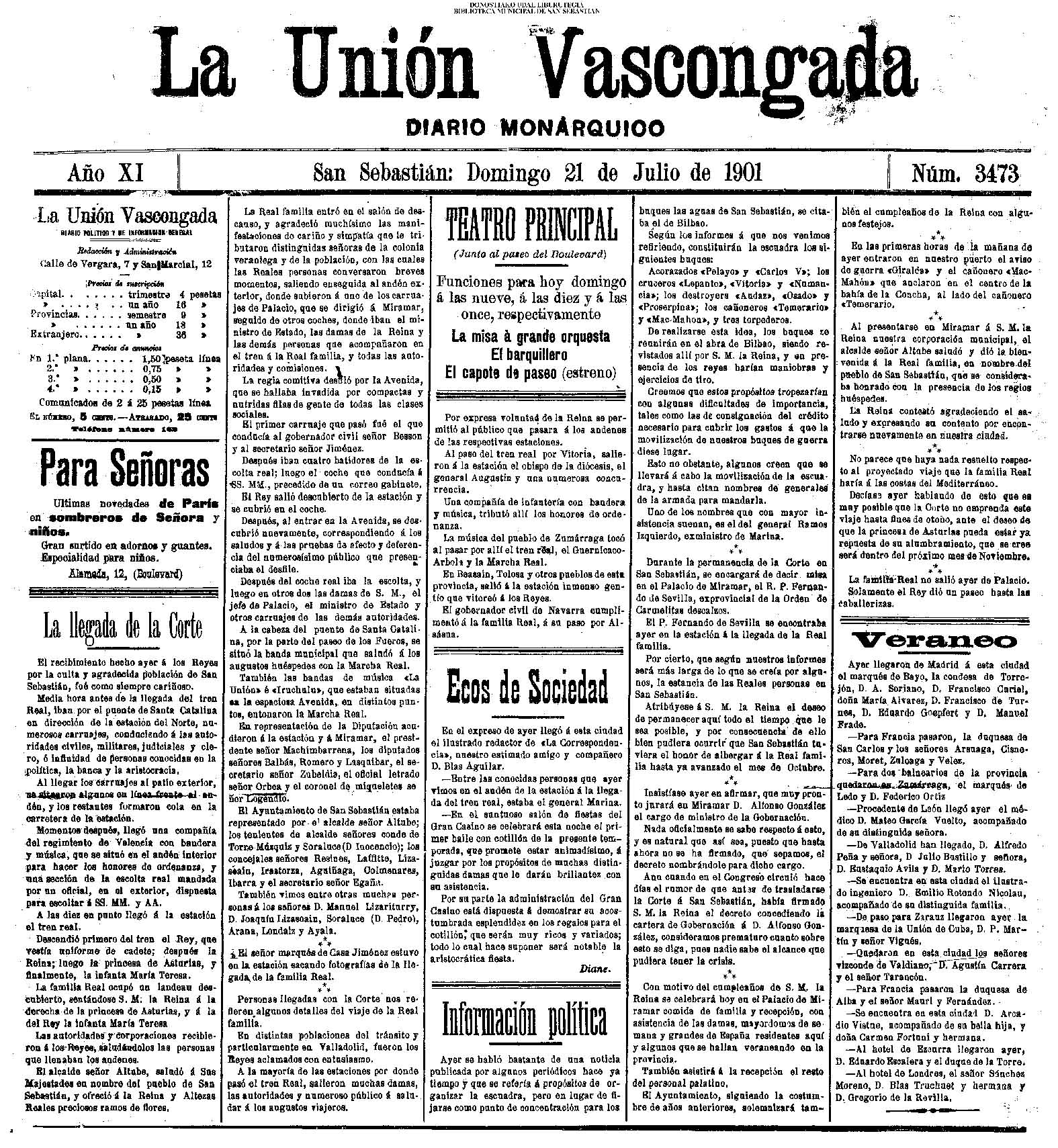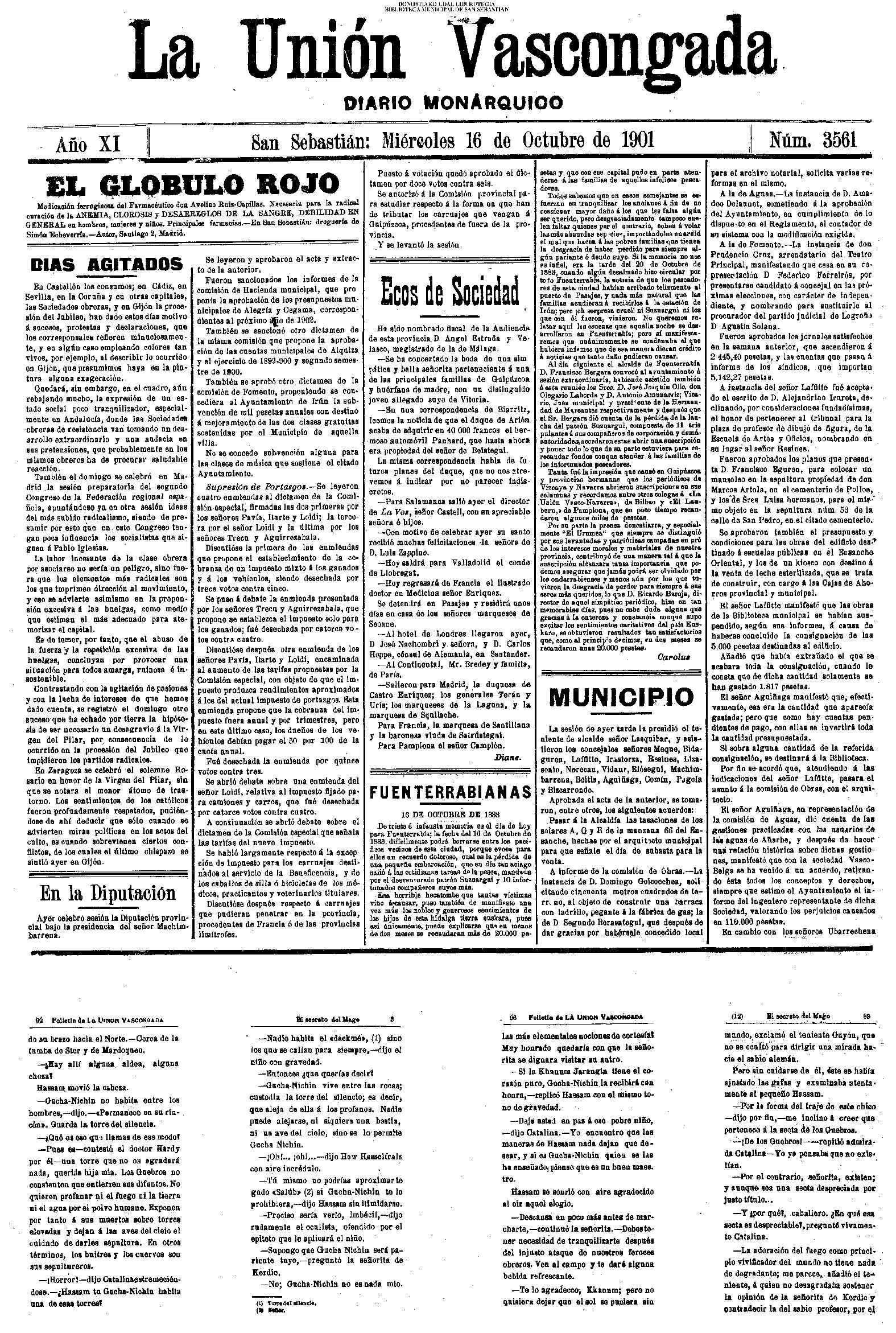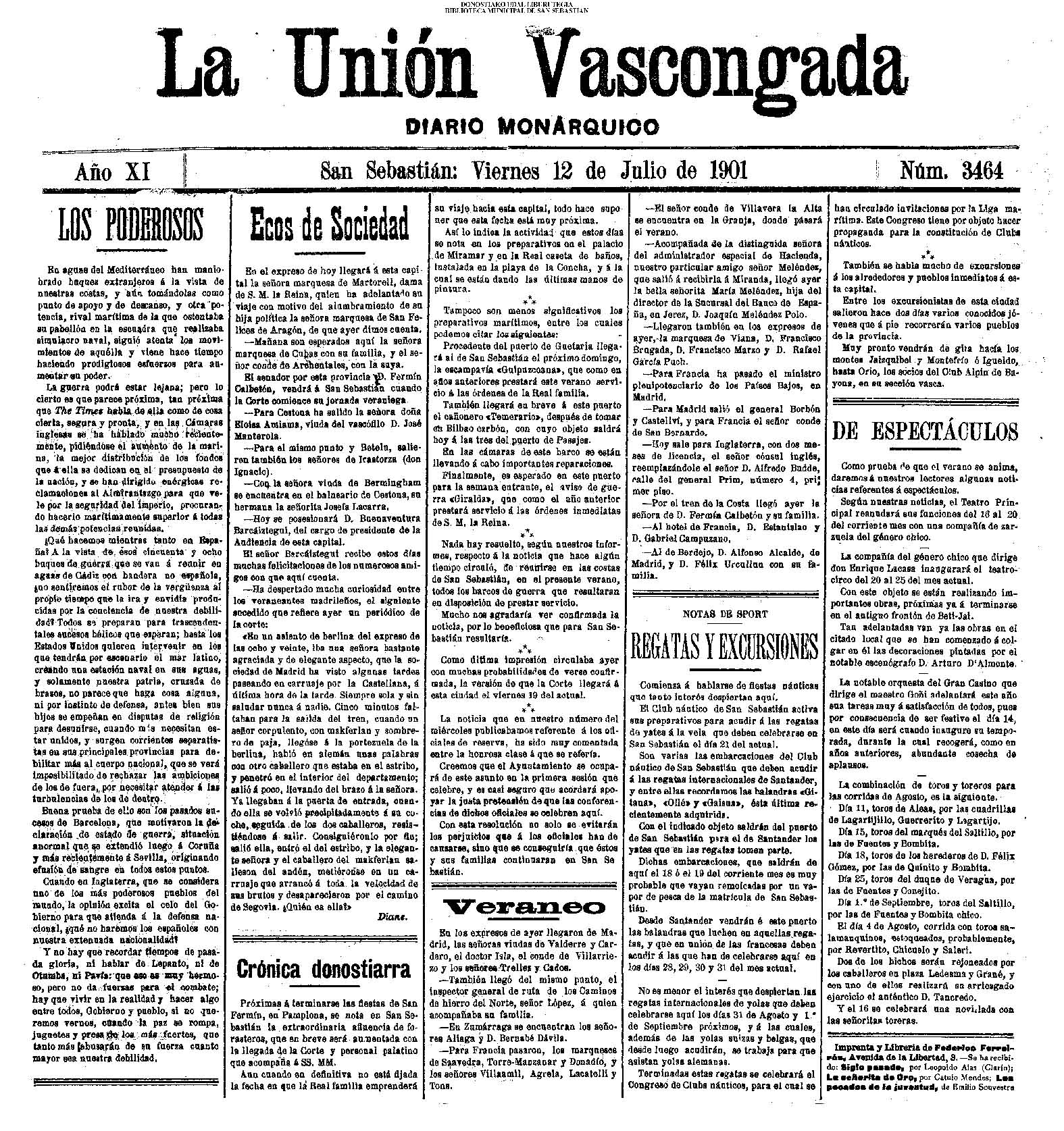 KOXKAS DONOSTIARRAS : "Curiosidades" El primer anuncio de la próxima llegada de las Navidades aparecía en los escaparates. Junto a otrsas golosinas, allí estaba en cajón o en barras el turrón, teniendo a su lado las olorosas aceitunas, las encendidas granadas, las peladillas bien envueltas en su capa de azúcar, los anises confitados, la garrapiñada, todo ese mundo de delicias. Al turrón le siguen el ejército de botellas y capones, de fiembres y pavos, de frutas sabrosísimas, de manjares incontables. Si en los días de Navidad sabe mejor el turrón, ¡qué deseado es siempre!¡Qué dulce es gustar siempre un cachito del azucarado postre!. La llegada del turrón era saludada en los periódicos de hace un siglo, que daban cuenta de que establecimiento había sido el primero en ponerlo en sus escaparates, como aviso urgente de que las Navidades estaban llegando. El cine llegó a nuestra ciudad hace un siglo. Entonces se llamaba Cinebiógrafo y las sesiones que daban eran cortas pero variadísimas. Vea el lector el programa que anunciaba el Cinebiógrafo Lumiére para el domingo 8 de diciembre de 1901. Primera sesión, a las 4 de la tarde : escenas cómicas. Magia moderna. Gabinete encantado. En la ratonera. El diablo en el convento. Regalo: rifa de una carabina Eureka. Segunda sesión, a las 5 de la tarde: Escenas marítimas. Seis retratos una peseta. Los apuros de don Cleto. Pirámides humanas. La luna, a un metro. Regalo: rifa de un servicio de porcelana para su muñeca. Tercera sesión, a las 6 de la tarde: Desfiles militares. Baile en el Olimpia. Entierro de la reina Victoria. Llegada de un tren. La Cenicienta. Regalo: rifa de un tren. Cuarta sesión, a las 7 de la tarde : Escenas infantiles. Danza de fuego. La portera burlada. Episodios del Fausto. Corrida de toros. Regalo: rifa de una preciosa muñeca. El cinebiógrafo de Bellas Artes, aquellos primeros días de diciembre de 1901, proyectaba Noel y anunciaba La caperuza roja, el popular cuento que todos los niños conocían, para los próximos días. Antes había proyectado la Cenicienta y Juana de Arco. Por aquellos días, en un par de escenarios hacían sus galas y su modo de retorcerse siete u ocho chiquillas "de esas que van de bellas". Con la cabeza coquetonamente cubierta por un sombrero, con la vistosa falta de colorines "previamente recogida como si estuviera pasando a pie un río, y el pañolón de Manila rodeado al cuerpo", comienza la suerte del tirabuzón, o sea, la del sacacorchos. Aquellas chicas se retuercen, hacen cosas raras con los pies, con las manos, con todo el cuerpo, volviendo locos a los espectadores. |