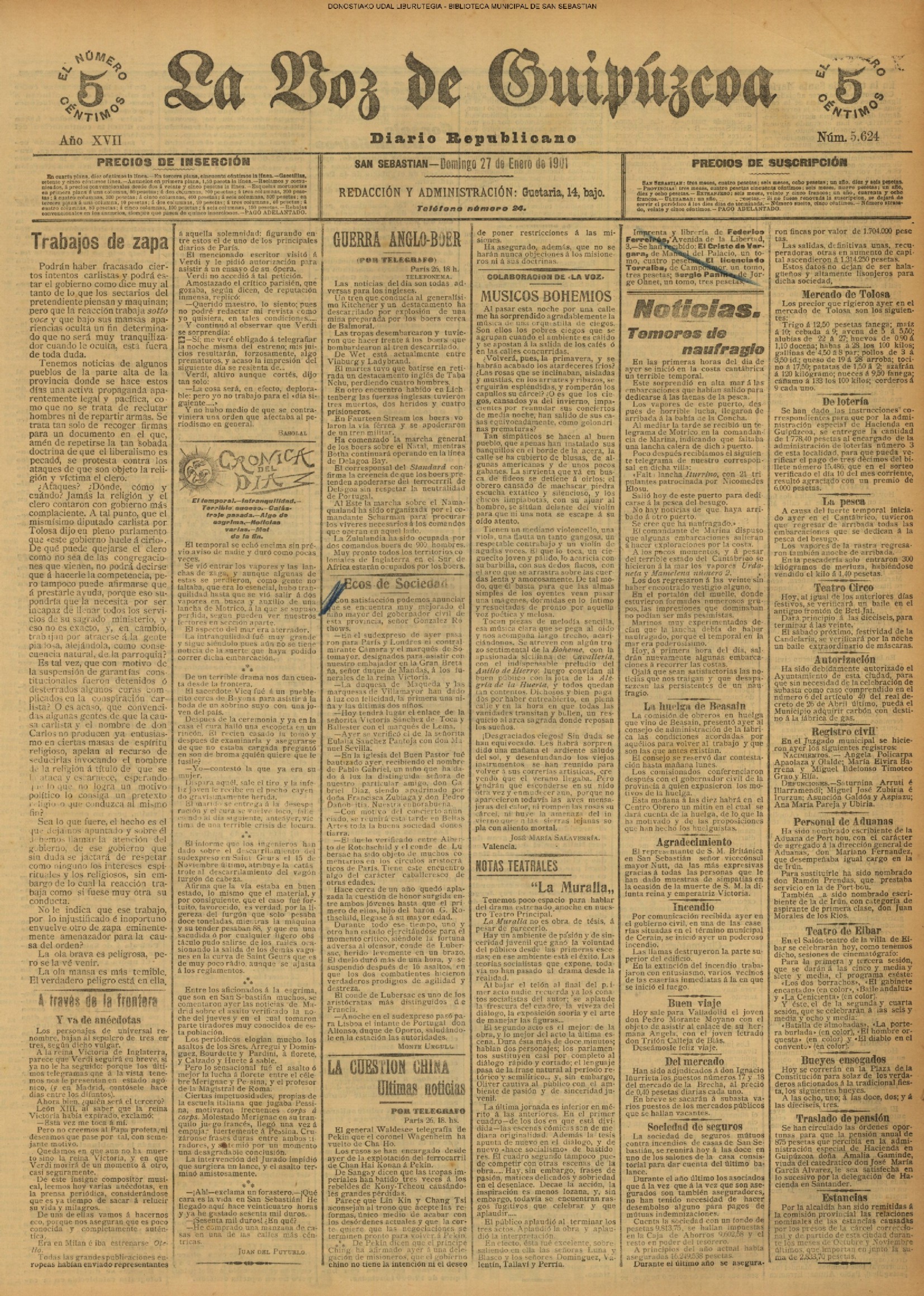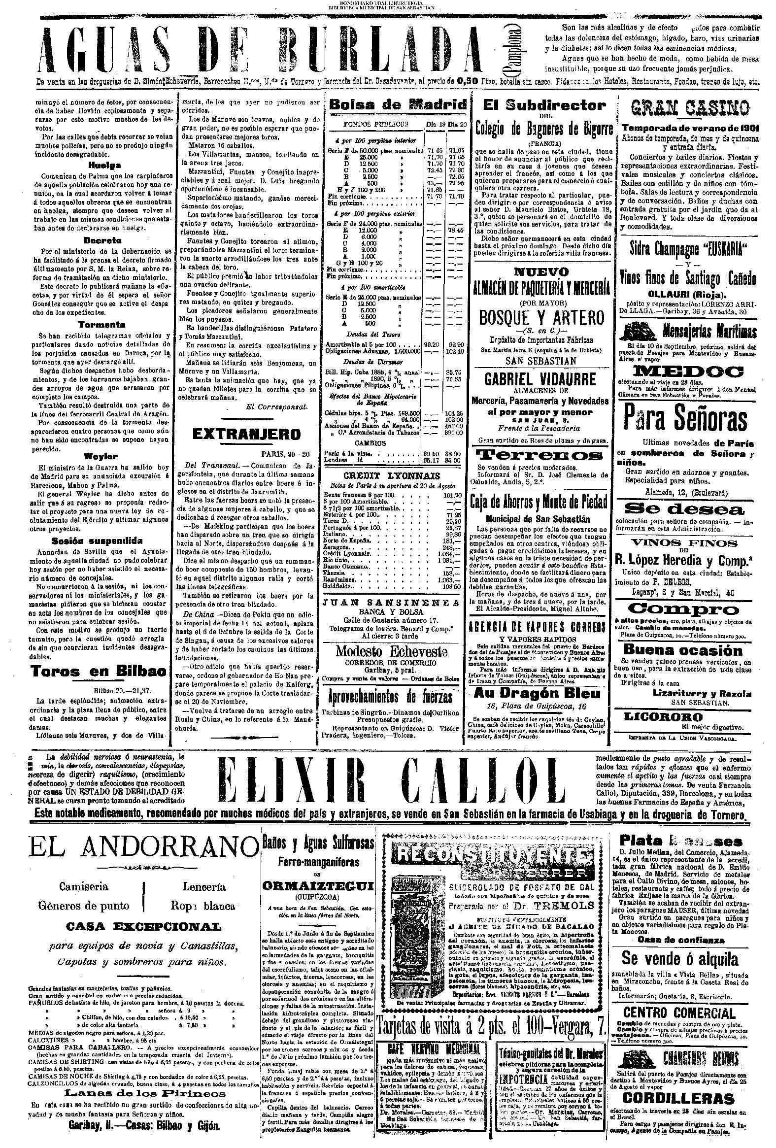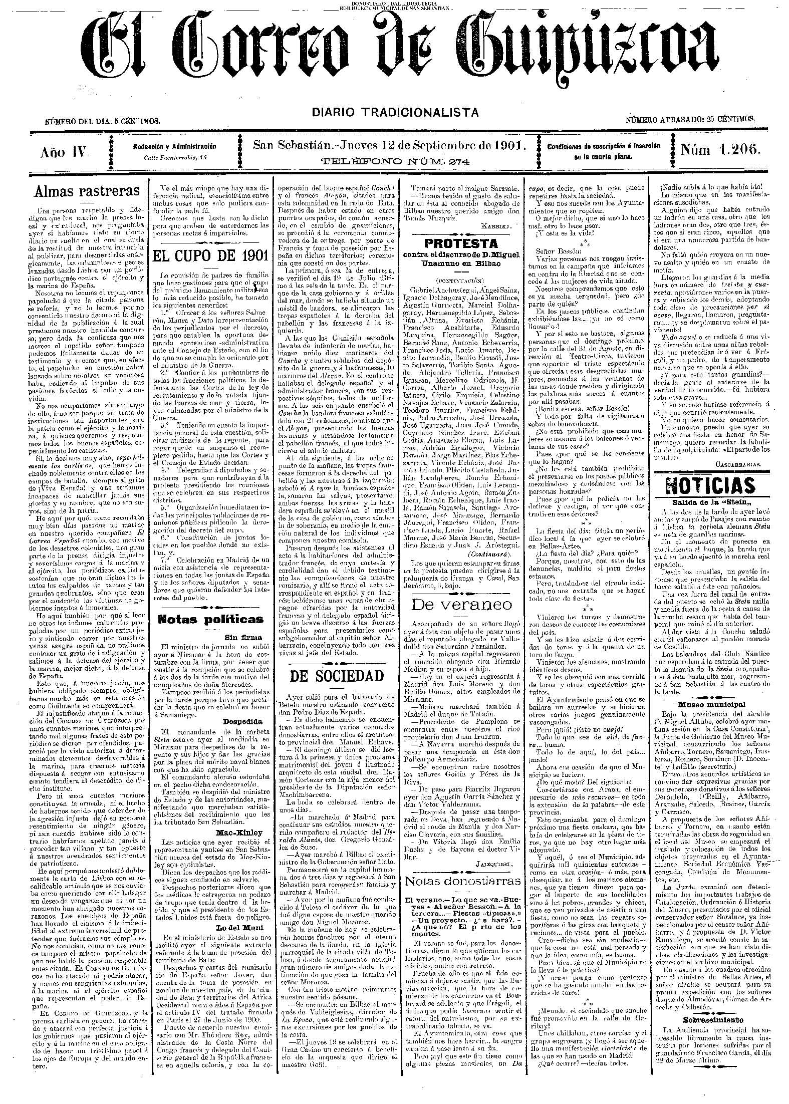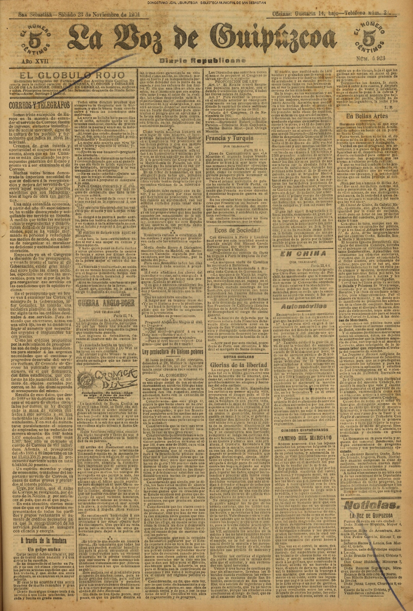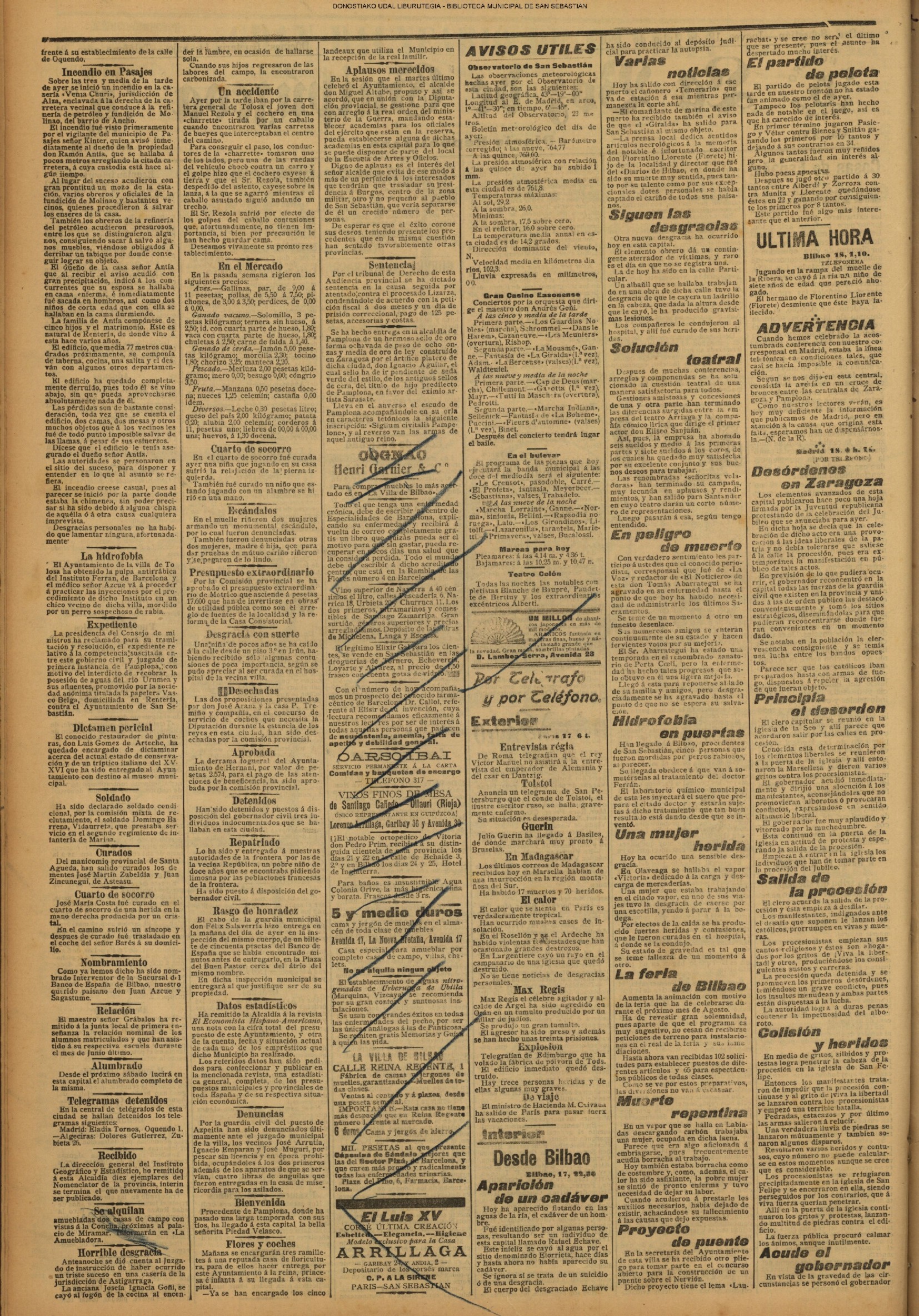 KOXKAS DONOSTIARRAS : "Curiosidades" El primer anuncio de la próxima llegada de las Navidades aparecía en los escaparates. Junto a otrsas golosinas, allí estaba en cajón o en barras el turrón, teniendo a su lado las olorosas aceitunas, las encendidas granadas, las peladillas bien envueltas en su capa de azúcar, los anises confitados, la garrapiñada, todo ese mundo de delicias. Al turrón le siguen el ejército de botellas y capones, de fiembres y pavos, de frutas sabrosísimas, de manjares incontables. Si en los días de Navidad sabe mejor el turrón, ¡qué deseado es siempre!¡Qué dulce es gustar siempre un cachito del azucarado postre!. La llegada del turrón era saludada en los periódicos de hace un siglo, que daban cuenta de que establecimiento había sido el primero en ponerlo en sus escaparates, como aviso urgente de que las Navidades estaban llegando. El cine llegó a nuestra ciudad hace un siglo. Entonces se llamaba Cinebiógrafo y las sesiones que daban eran cortas pero variadísimas. Vea el lector el programa que anunciaba el Cinebiógrafo Lumiére para el domingo 8 de diciembre de 1901. Primera sesión, a las 4 de la tarde : escenas cómicas. Magia moderna. Gabinete encantado. En la ratonera. El diablo en el convento. Regalo: rifa de una carabina Eureka. Segunda sesión, a las 5 de la tarde: Escenas marítimas. Seis retratos una peseta. Los apuros de don Cleto. Pirámides humanas. La luna, a un metro. Regalo: rifa de un servicio de porcelana para su muñeca. Tercera sesión, a las 6 de la tarde: Desfiles militares. Baile en el Olimpia. Entierro de la reina Victoria. Llegada de un tren. La Cenicienta. Regalo: rifa de un tren. Cuarta sesión, a las 7 de la tarde : Escenas infantiles. Danza de fuego. La portera burlada. Episodios del Fausto. Corrida de toros. Regalo: rifa de una preciosa muñeca. El cinebiógrafo de Bellas Artes, aquellos primeros días de diciembre de 1901, proyectaba Noel y anunciaba La caperuza roja, el popular cuento que todos los niños conocían, para los próximos días. Antes había proyectado la Cenicienta y Juana de Arco. Por aquellos días, en un par de escenarios hacían sus galas y su modo de retorcerse siete u ocho chiquillas "de esas que van de bellas". Con la cabeza coquetonamente cubierta por un sombrero, con la vistosa falta de colorines "previamente recogida como si estuviera pasando a pie un río, y el pañolón de Manila rodeado al cuerpo", comienza la suerte del tirabuzón, o sea, la del sacacorchos. Aquellas chicas se retuercen, hacen cosas raras con los pies, con las manos, con todo el cuerpo, volviendo locos a los espectadores. |