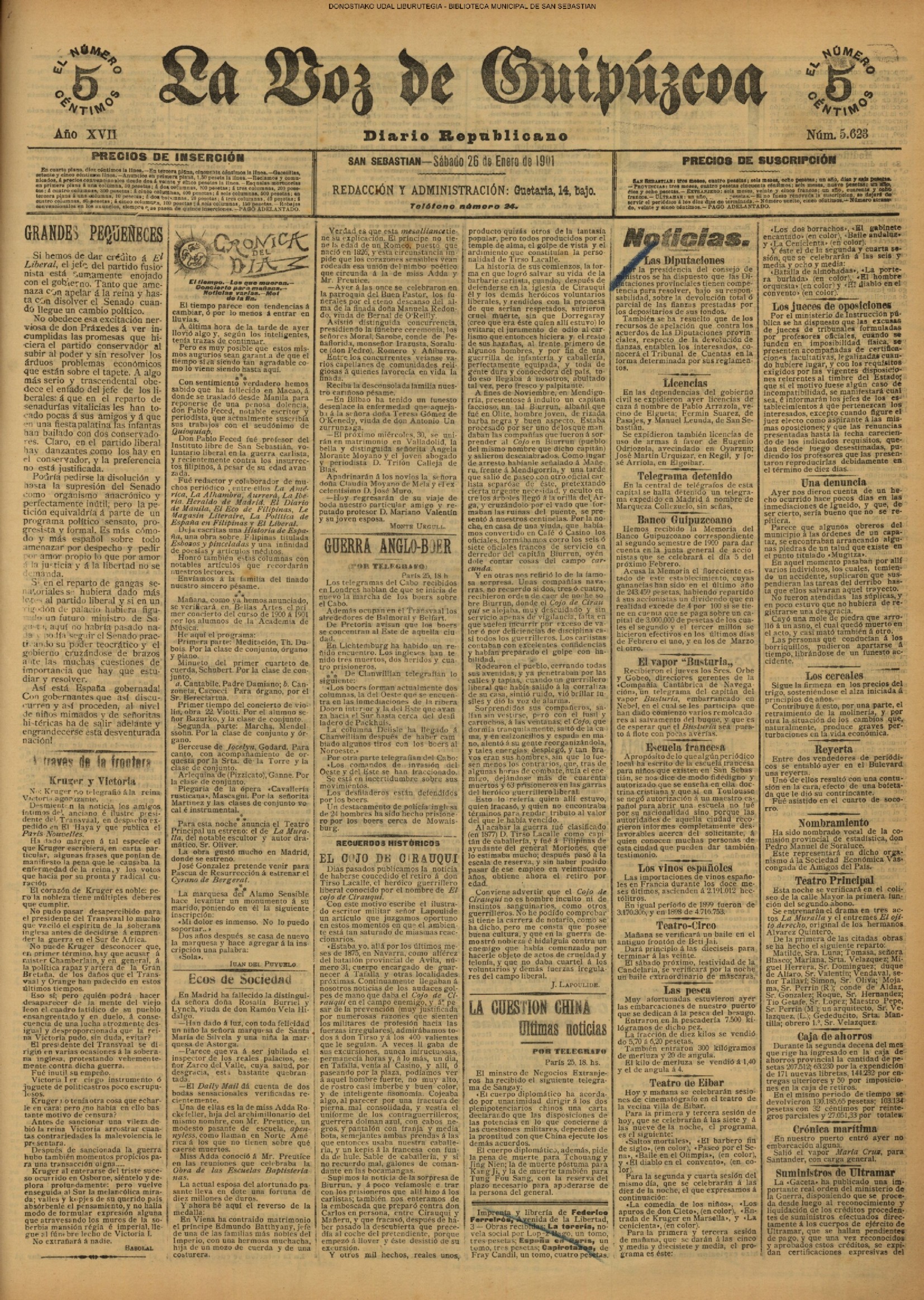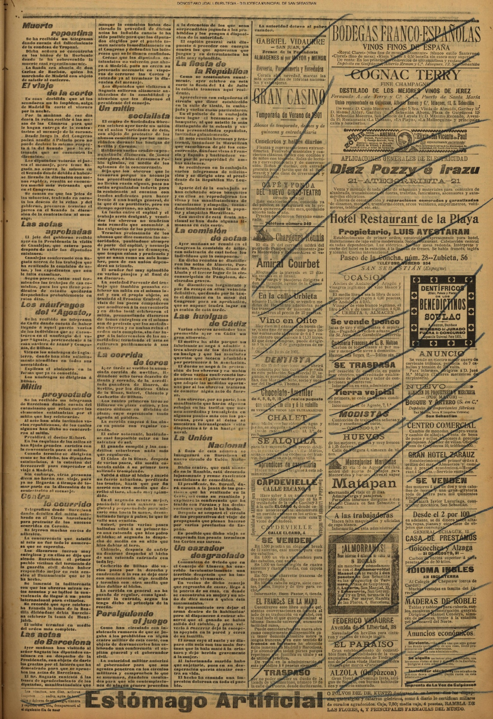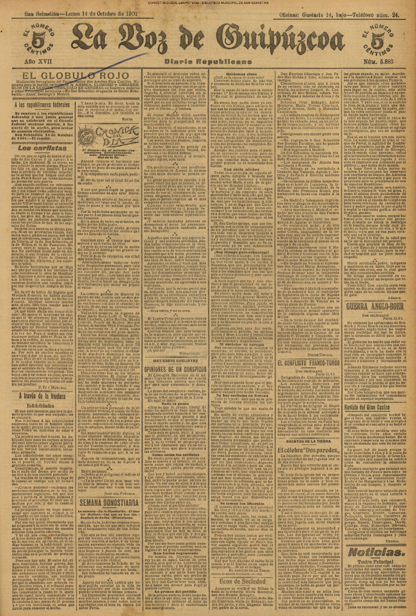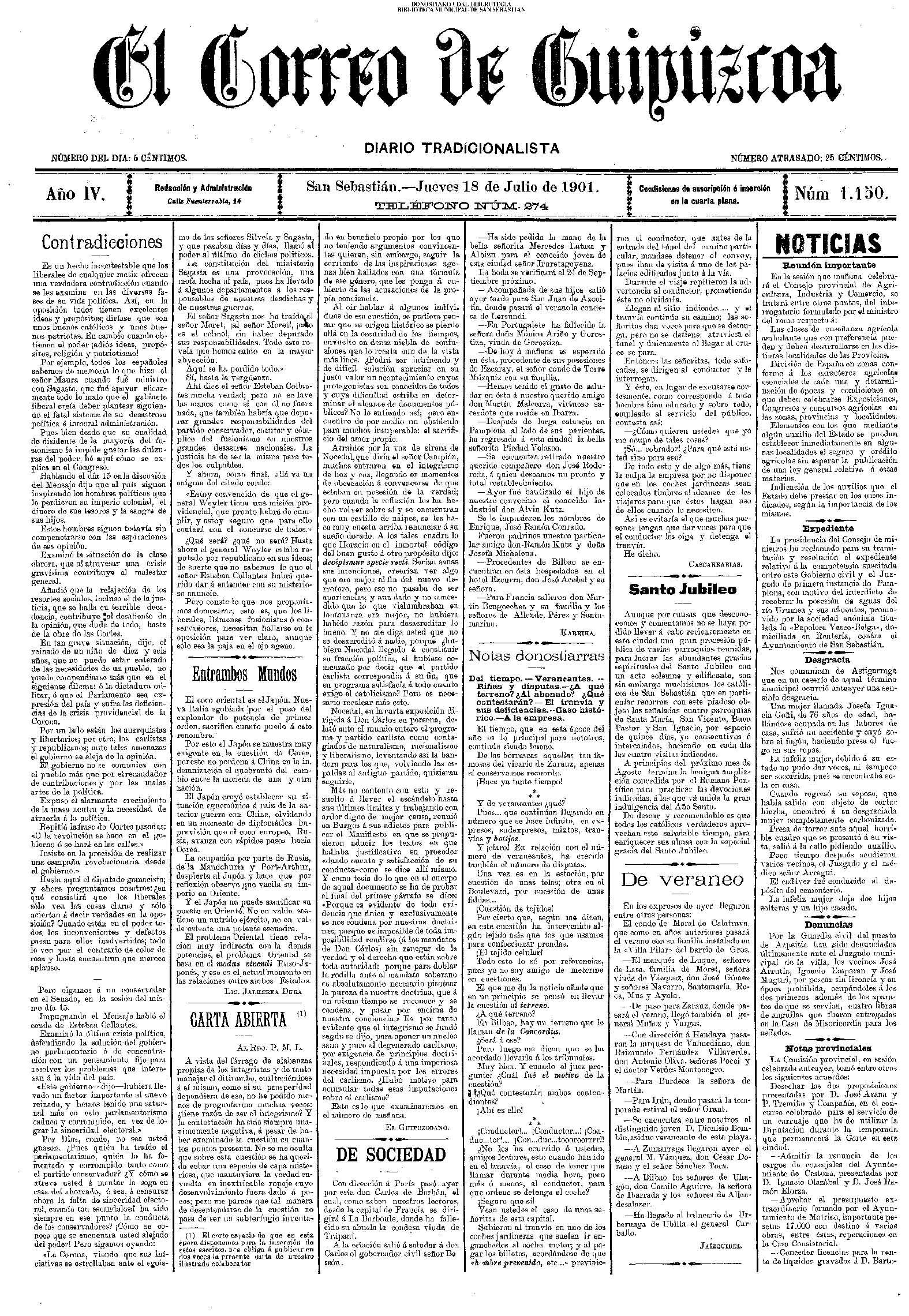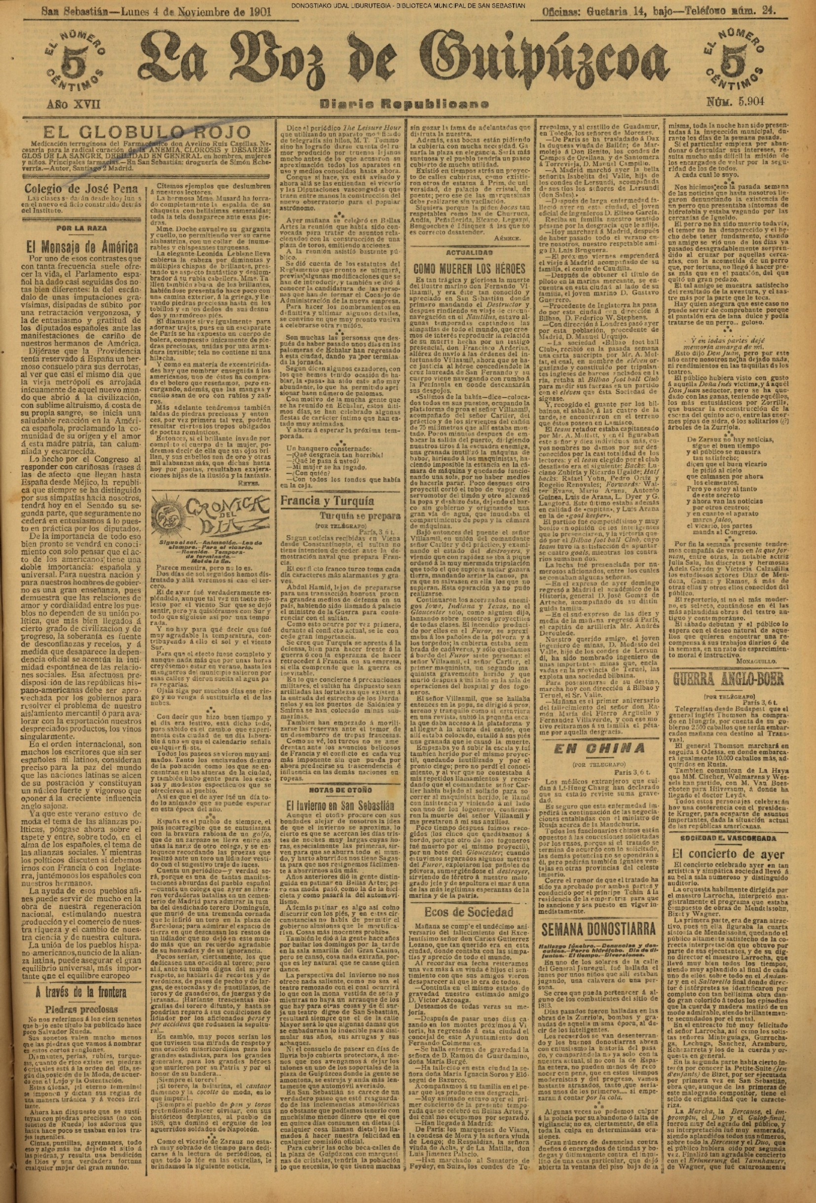 KOXKAS DONOSTIARRAS : "Curiosidades" El primer anuncio de la próxima llegada de las Navidades aparecía en los escaparates. Junto a otrsas golosinas, allí estaba en cajón o en barras el turrón, teniendo a su lado las olorosas aceitunas, las encendidas granadas, las peladillas bien envueltas en su capa de azúcar, los anises confitados, la garrapiñada, todo ese mundo de delicias. Al turrón le siguen el ejército de botellas y capones, de fiembres y pavos, de frutas sabrosísimas, de manjares incontables. Si en los días de Navidad sabe mejor el turrón, ¡qué deseado es siempre!¡Qué dulce es gustar siempre un cachito del azucarado postre!. La llegada del turrón era saludada en los periódicos de hace un siglo, que daban cuenta de que establecimiento había sido el primero en ponerlo en sus escaparates, como aviso urgente de que las Navidades estaban llegando. El cine llegó a nuestra ciudad hace un siglo. Entonces se llamaba Cinebiógrafo y las sesiones que daban eran cortas pero variadísimas. Vea el lector el programa que anunciaba el Cinebiógrafo Lumiére para el domingo 8 de diciembre de 1901. Primera sesión, a las 4 de la tarde : escenas cómicas. Magia moderna. Gabinete encantado. En la ratonera. El diablo en el convento. Regalo: rifa de una carabina Eureka. Segunda sesión, a las 5 de la tarde: Escenas marítimas. Seis retratos una peseta. Los apuros de don Cleto. Pirámides humanas. La luna, a un metro. Regalo: rifa de un servicio de porcelana para su muñeca. Tercera sesión, a las 6 de la tarde: Desfiles militares. Baile en el Olimpia. Entierro de la reina Victoria. Llegada de un tren. La Cenicienta. Regalo: rifa de un tren. Cuarta sesión, a las 7 de la tarde : Escenas infantiles. Danza de fuego. La portera burlada. Episodios del Fausto. Corrida de toros. Regalo: rifa de una preciosa muñeca. El cinebiógrafo de Bellas Artes, aquellos primeros días de diciembre de 1901, proyectaba Noel y anunciaba La caperuza roja, el popular cuento que todos los niños conocían, para los próximos días. Antes había proyectado la Cenicienta y Juana de Arco. Por aquellos días, en un par de escenarios hacían sus galas y su modo de retorcerse siete u ocho chiquillas "de esas que van de bellas". Con la cabeza coquetonamente cubierta por un sombrero, con la vistosa falta de colorines "previamente recogida como si estuviera pasando a pie un río, y el pañolón de Manila rodeado al cuerpo", comienza la suerte del tirabuzón, o sea, la del sacacorchos. Aquellas chicas se retuercen, hacen cosas raras con los pies, con las manos, con todo el cuerpo, volviendo locos a los espectadores. |