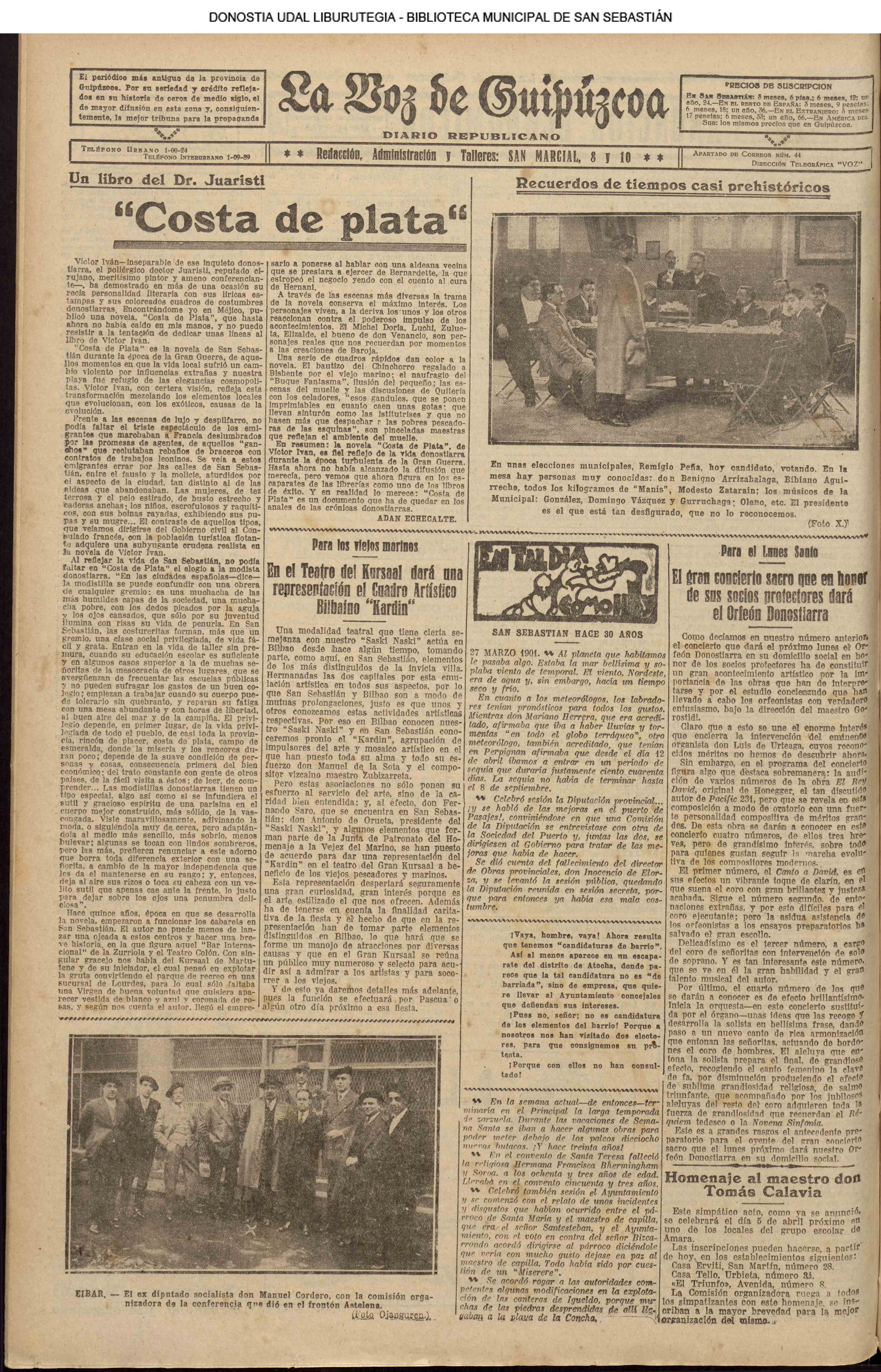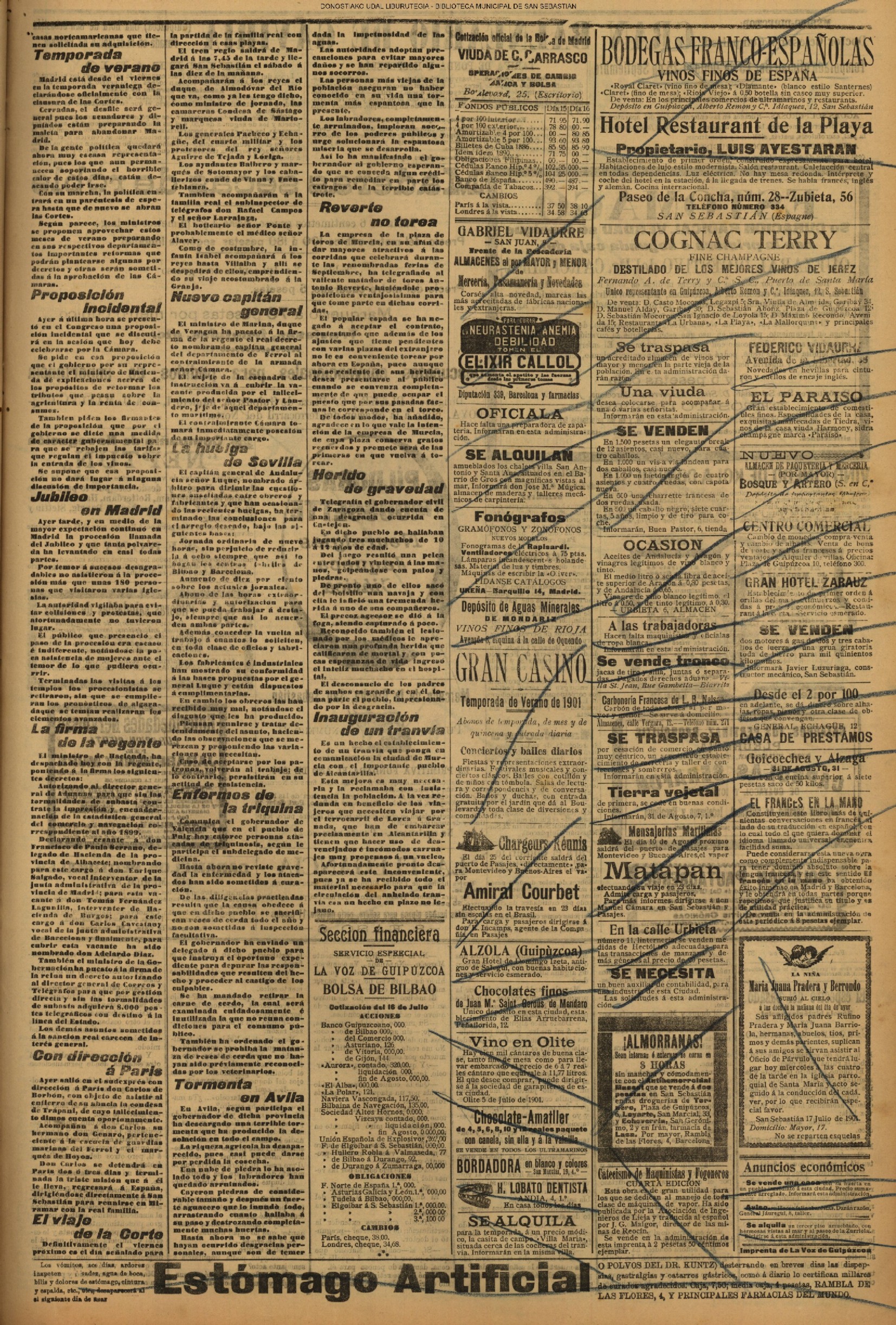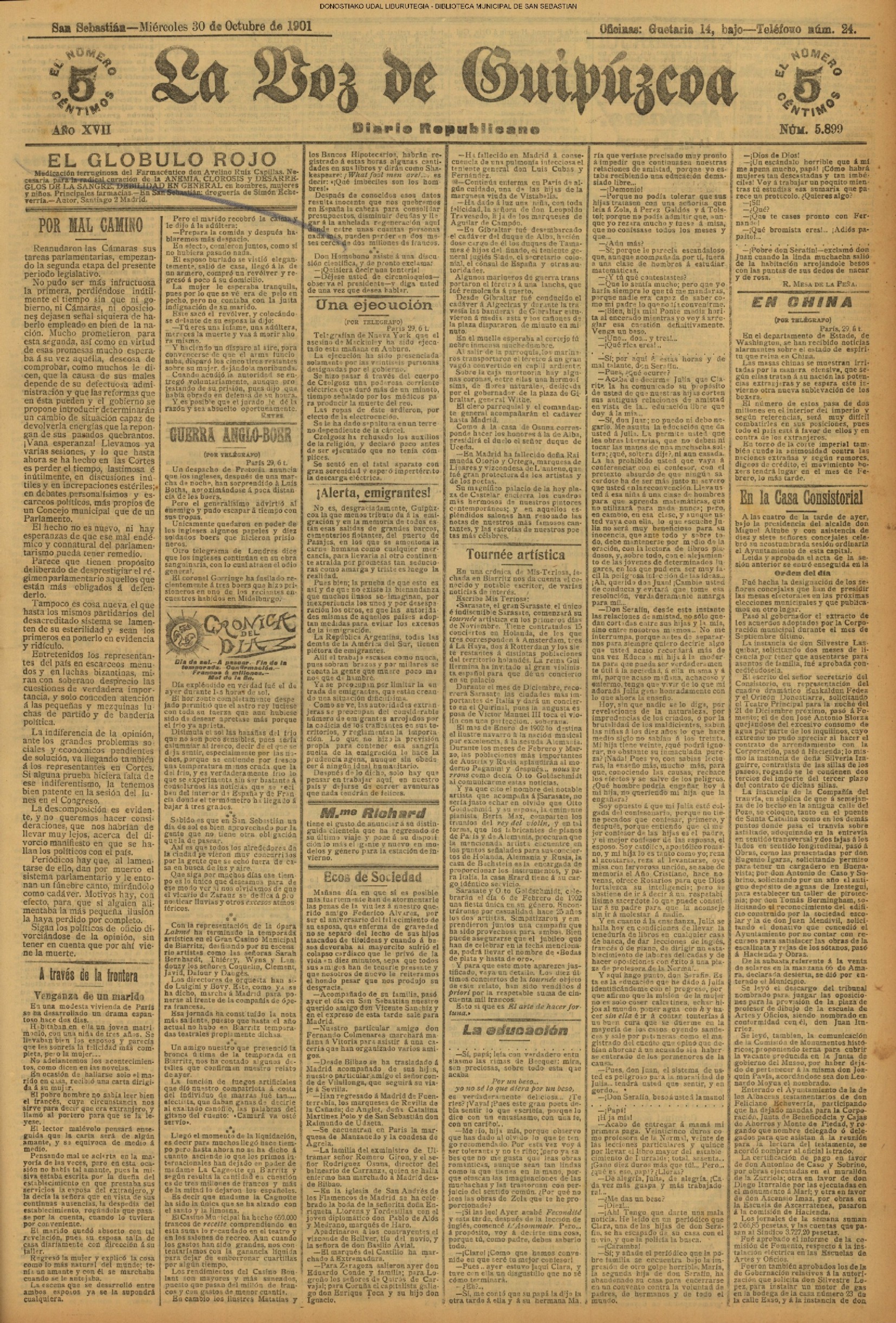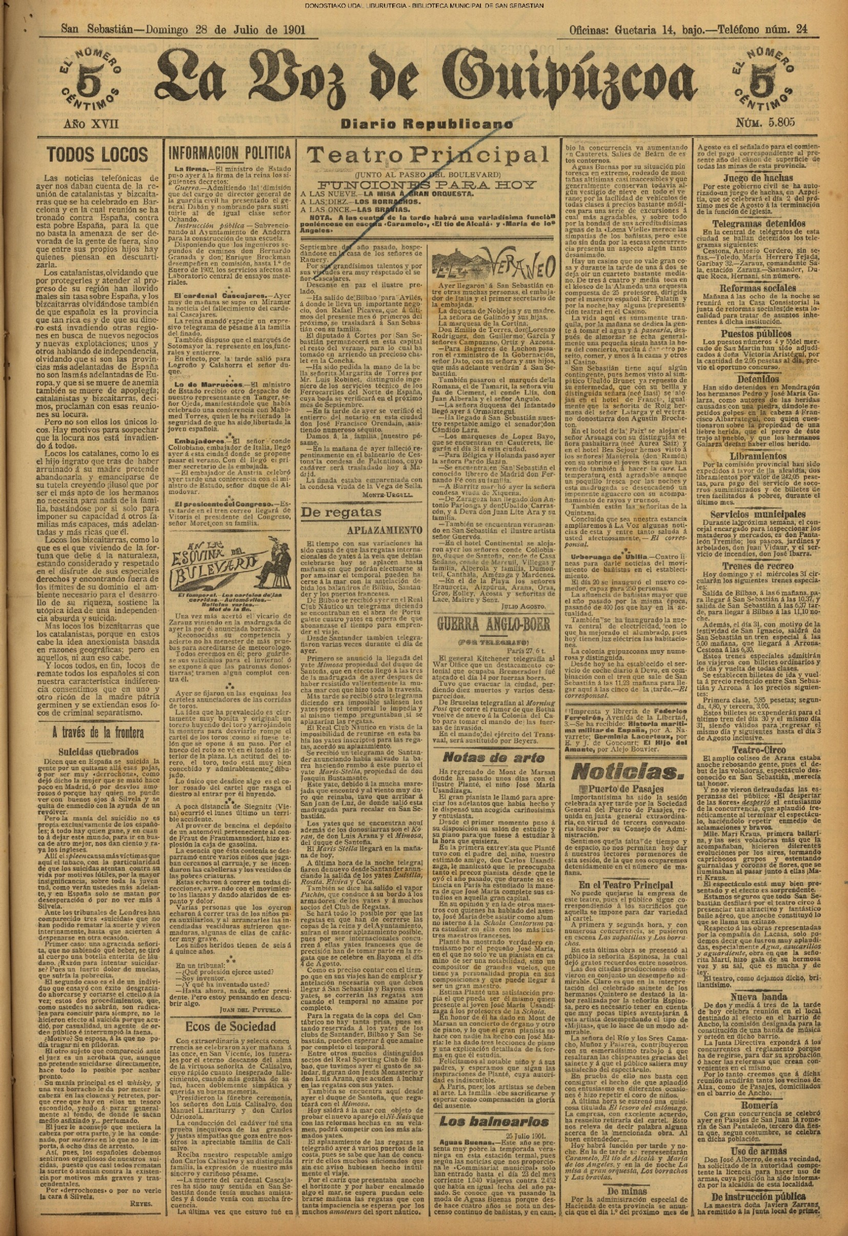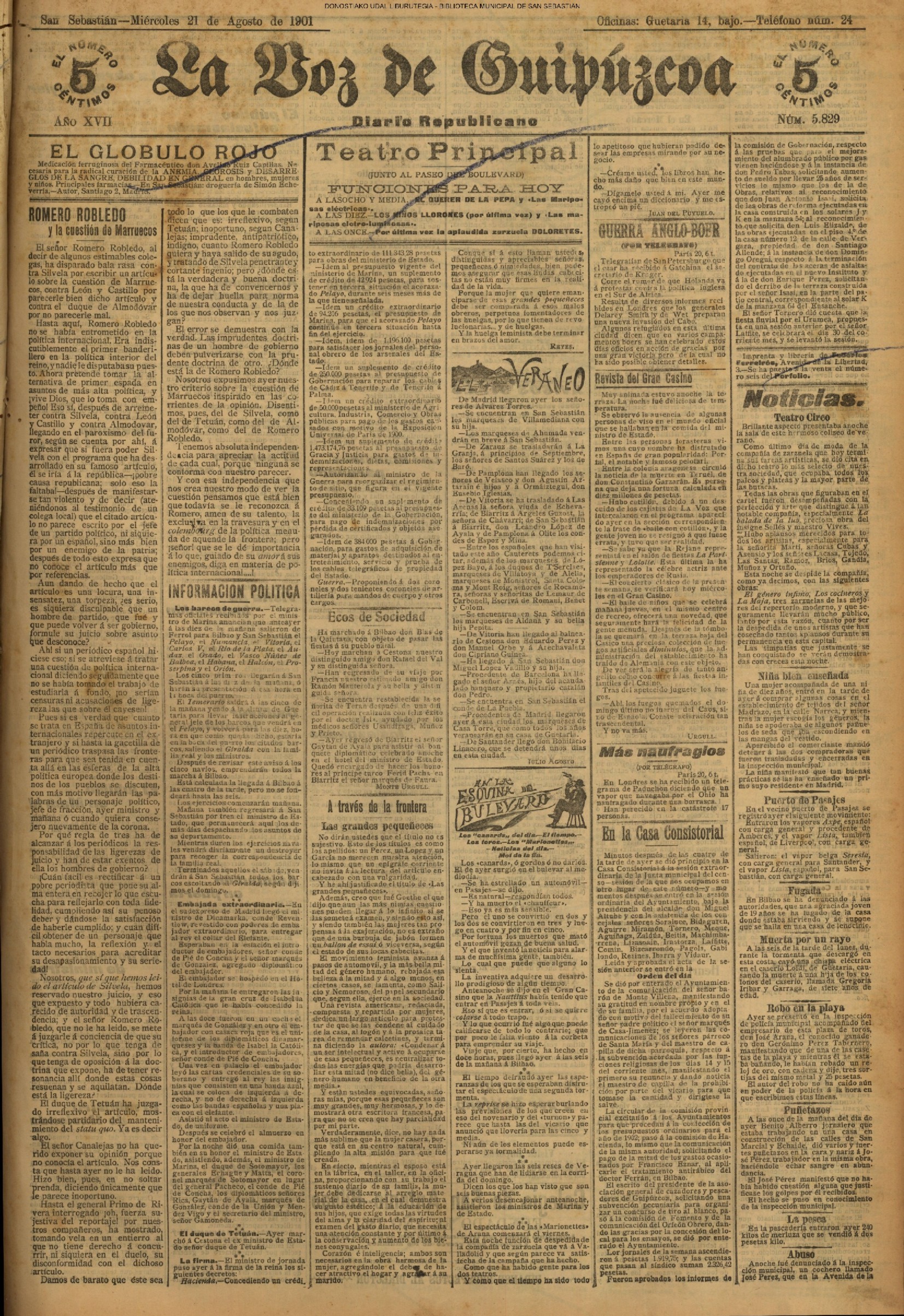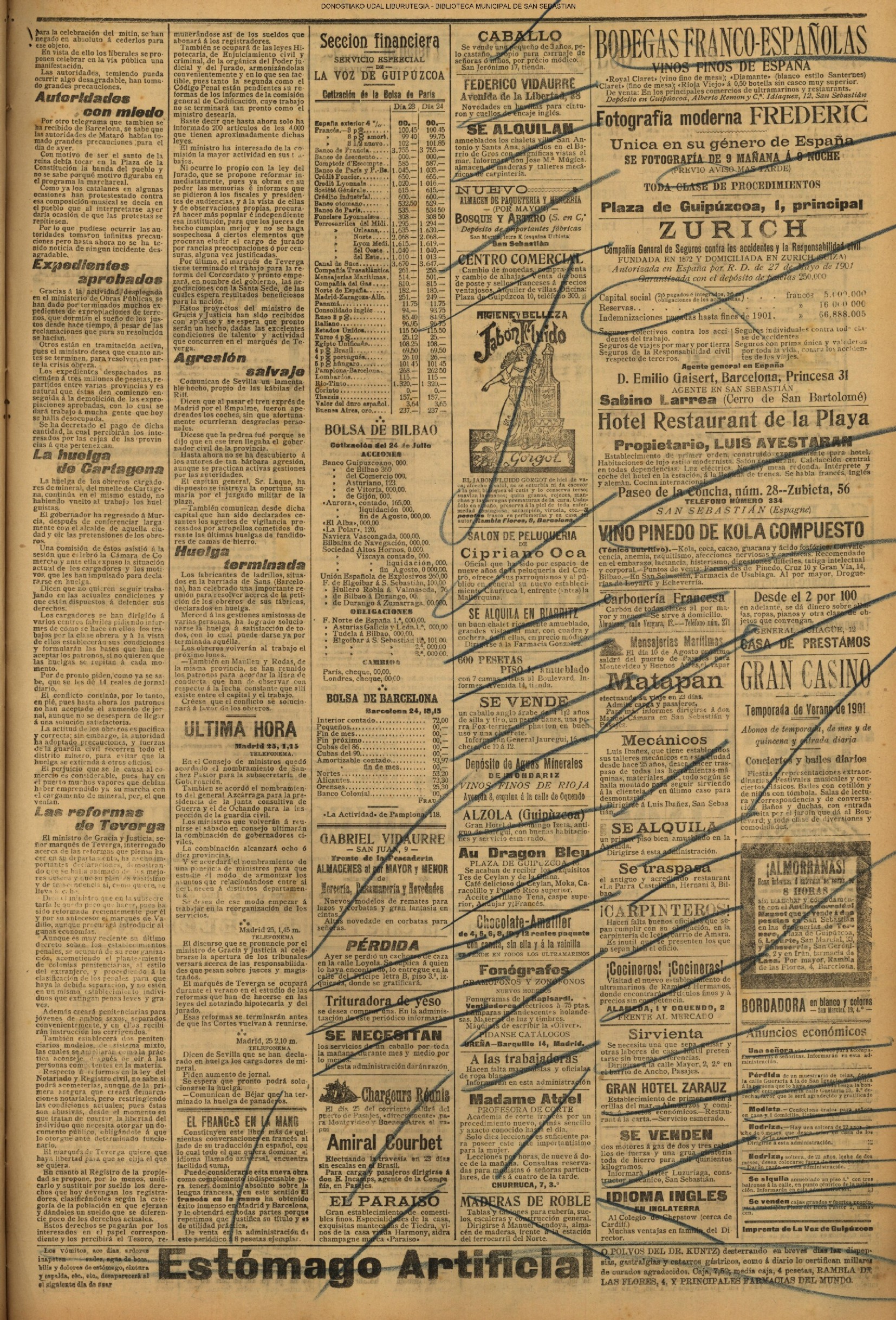 KOXKAS DONOSTIARRAS : "Curiosidades" El primer anuncio de la próxima llegada de las Navidades aparecía en los escaparates. Junto a otrsas golosinas, allí estaba en cajón o en barras el turrón, teniendo a su lado las olorosas aceitunas, las encendidas granadas, las peladillas bien envueltas en su capa de azúcar, los anises confitados, la garrapiñada, todo ese mundo de delicias. Al turrón le siguen el ejército de botellas y capones, de fiembres y pavos, de frutas sabrosísimas, de manjares incontables. Si en los días de Navidad sabe mejor el turrón, ¡qué deseado es siempre!¡Qué dulce es gustar siempre un cachito del azucarado postre!. La llegada del turrón era saludada en los periódicos de hace un siglo, que daban cuenta de que establecimiento había sido el primero en ponerlo en sus escaparates, como aviso urgente de que las Navidades estaban llegando. El cine llegó a nuestra ciudad hace un siglo. Entonces se llamaba Cinebiógrafo y las sesiones que daban eran cortas pero variadísimas. Vea el lector el programa que anunciaba el Cinebiógrafo Lumiére para el domingo 8 de diciembre de 1901. Primera sesión, a las 4 de la tarde : escenas cómicas. Magia moderna. Gabinete encantado. En la ratonera. El diablo en el convento. Regalo: rifa de una carabina Eureka. Segunda sesión, a las 5 de la tarde: Escenas marítimas. Seis retratos una peseta. Los apuros de don Cleto. Pirámides humanas. La luna, a un metro. Regalo: rifa de un servicio de porcelana para su muñeca. Tercera sesión, a las 6 de la tarde: Desfiles militares. Baile en el Olimpia. Entierro de la reina Victoria. Llegada de un tren. La Cenicienta. Regalo: rifa de un tren. Cuarta sesión, a las 7 de la tarde : Escenas infantiles. Danza de fuego. La portera burlada. Episodios del Fausto. Corrida de toros. Regalo: rifa de una preciosa muñeca. El cinebiógrafo de Bellas Artes, aquellos primeros días de diciembre de 1901, proyectaba Noel y anunciaba La caperuza roja, el popular cuento que todos los niños conocían, para los próximos días. Antes había proyectado la Cenicienta y Juana de Arco. Por aquellos días, en un par de escenarios hacían sus galas y su modo de retorcerse siete u ocho chiquillas "de esas que van de bellas". Con la cabeza coquetonamente cubierta por un sombrero, con la vistosa falta de colorines "previamente recogida como si estuviera pasando a pie un río, y el pañolón de Manila rodeado al cuerpo", comienza la suerte del tirabuzón, o sea, la del sacacorchos. Aquellas chicas se retuercen, hacen cosas raras con los pies, con las manos, con todo el cuerpo, volviendo locos a los espectadores. |