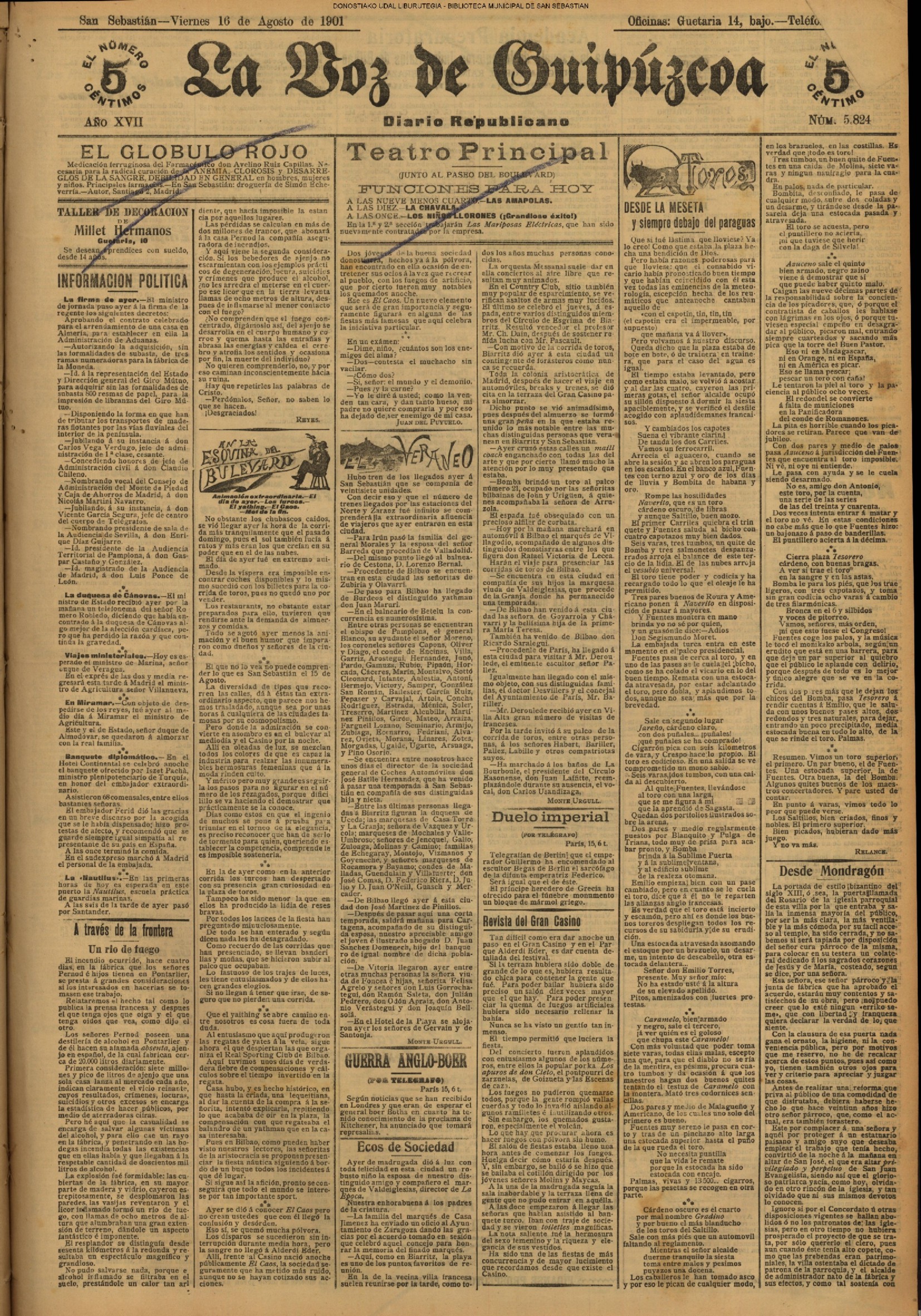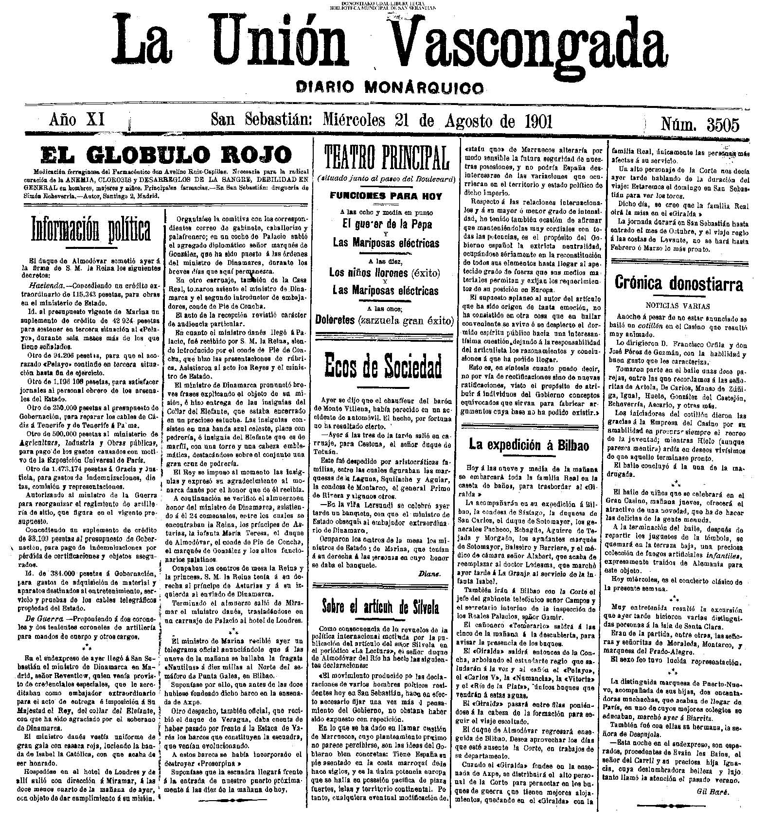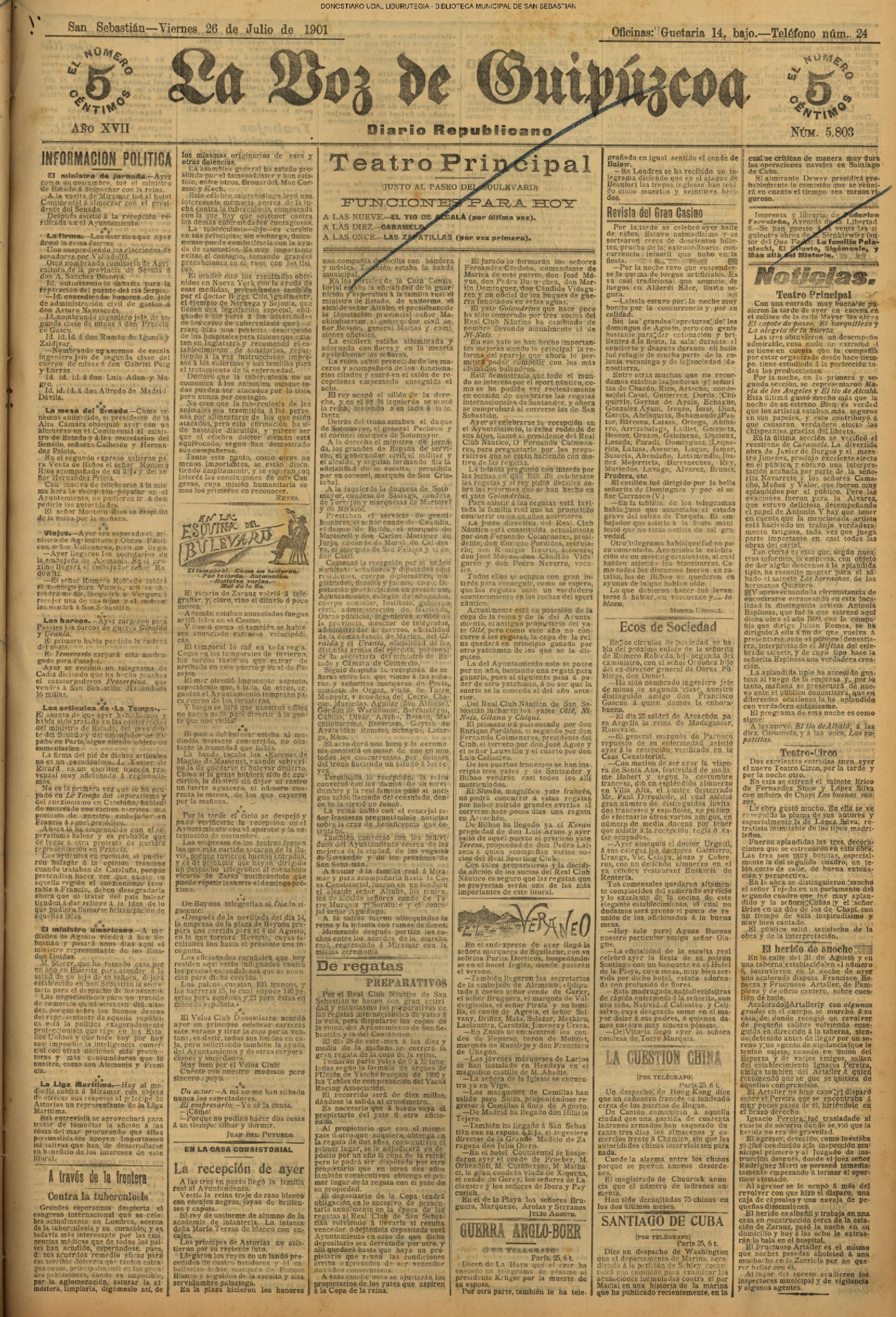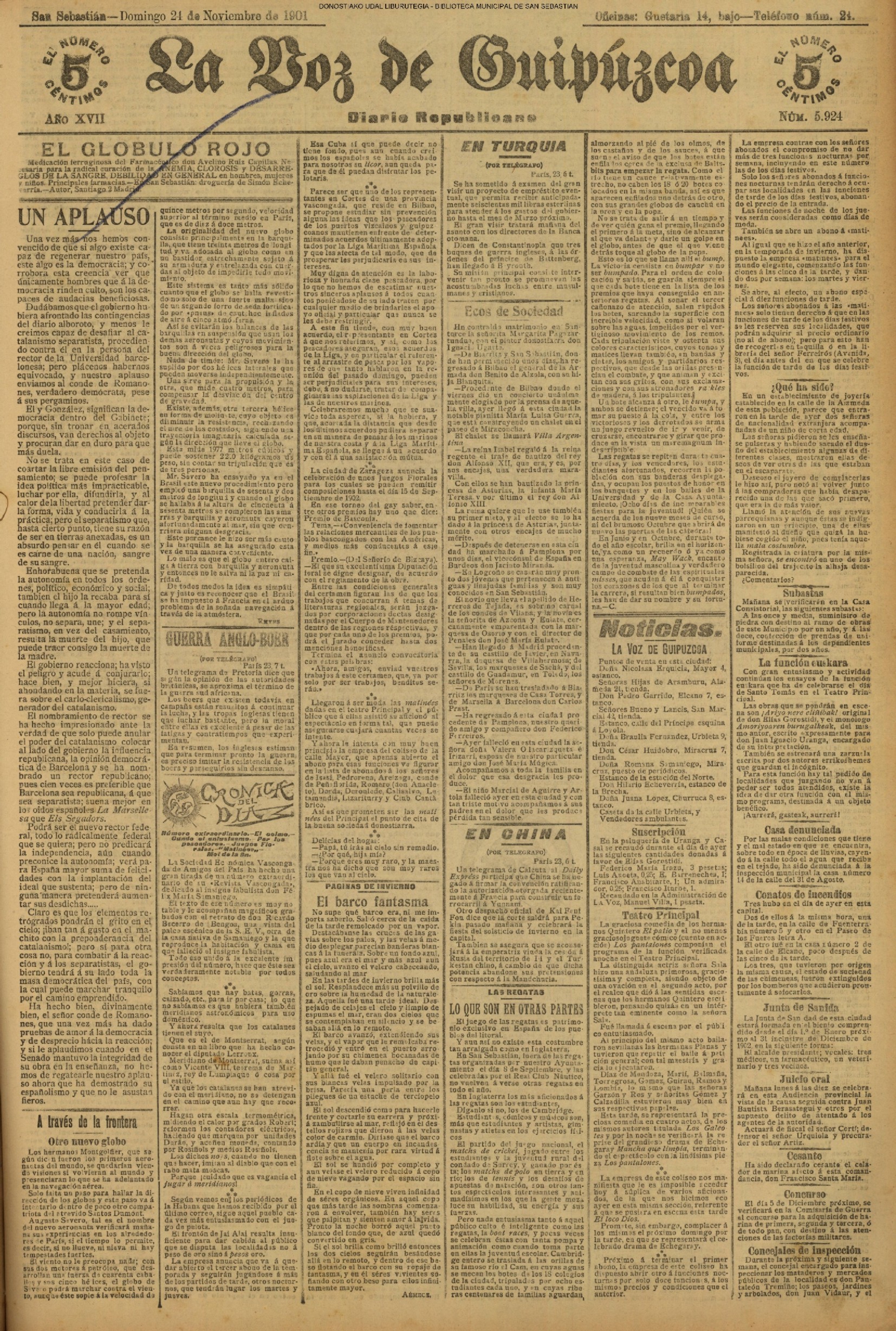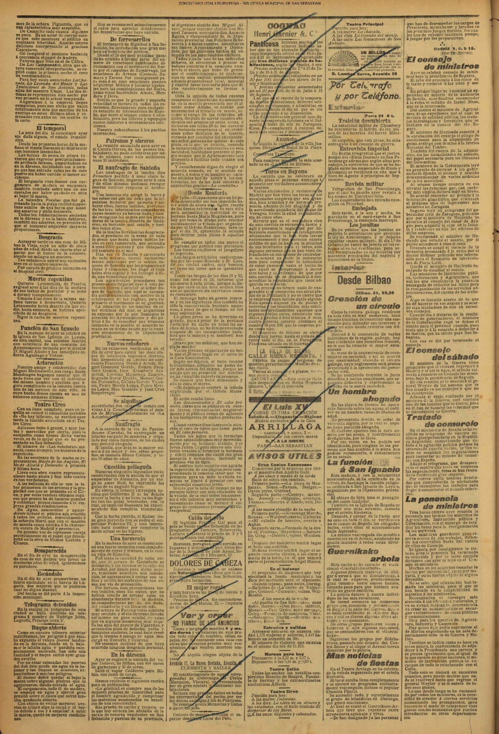KOXKAS DONOSTIARRAS : "Curiosidades" El primer anuncio de la próxima llegada de las Navidades aparecía en los escaparates. Junto a otrsas golosinas, allí estaba en cajón o en barras el turrón, teniendo a su lado las olorosas aceitunas, las encendidas granadas, las peladillas bien envueltas en su capa de azúcar, los anises confitados, la garrapiñada, todo ese mundo de delicias. Al turrón le siguen el ejército de botellas y capones, de fiembres y pavos, de frutas sabrosísimas, de manjares incontables. Si en los días de Navidad sabe mejor el turrón, ¡qué deseado es siempre!¡Qué dulce es gustar siempre un cachito del azucarado postre!. La llegada del turrón era saludada en los periódicos de hace un siglo, que daban cuenta de que establecimiento había sido el primero en ponerlo en sus escaparates, como aviso urgente de que las Navidades estaban llegando. El cine llegó a nuestra ciudad hace un siglo. Entonces se llamaba Cinebiógrafo y las sesiones que daban eran cortas pero variadísimas. Vea el lector el programa que anunciaba el Cinebiógrafo Lumiére para el domingo 8 de diciembre de 1901. Primera sesión, a las 4 de la tarde : escenas cómicas. Magia moderna. Gabinete encantado. En la ratonera. El diablo en el convento. Regalo: rifa de una carabina Eureka. Segunda sesión, a las 5 de la tarde: Escenas marítimas. Seis retratos una peseta. Los apuros de don Cleto. Pirámides humanas. La luna, a un metro. Regalo: rifa de un servicio de porcelana para su muñeca. Tercera sesión, a las 6 de la tarde: Desfiles militares. Baile en el Olimpia. Entierro de la reina Victoria. Llegada de un tren. La Cenicienta. Regalo: rifa de un tren. Cuarta sesión, a las 7 de la tarde : Escenas infantiles. Danza de fuego. La portera burlada. Episodios del Fausto. Corrida de toros. Regalo: rifa de una preciosa muñeca. El cinebiógrafo de Bellas Artes, aquellos primeros días de diciembre de 1901, proyectaba Noel y anunciaba La caperuza roja, el popular cuento que todos los niños conocían, para los próximos días. Antes había proyectado la Cenicienta y Juana de Arco. Por aquellos días, en un par de escenarios hacían sus galas y su modo de retorcerse siete u ocho chiquillas "de esas que van de bellas". Con la cabeza coquetonamente cubierta por un sombrero, con la vistosa falta de colorines "previamente recogida como si estuviera pasando a pie un río, y el pañolón de Manila rodeado al cuerpo", comienza la suerte del tirabuzón, o sea, la del sacacorchos. Aquellas chicas se retuercen, hacen cosas raras con los pies, con las manos, con todo el cuerpo, volviendo locos a los espectadores. |