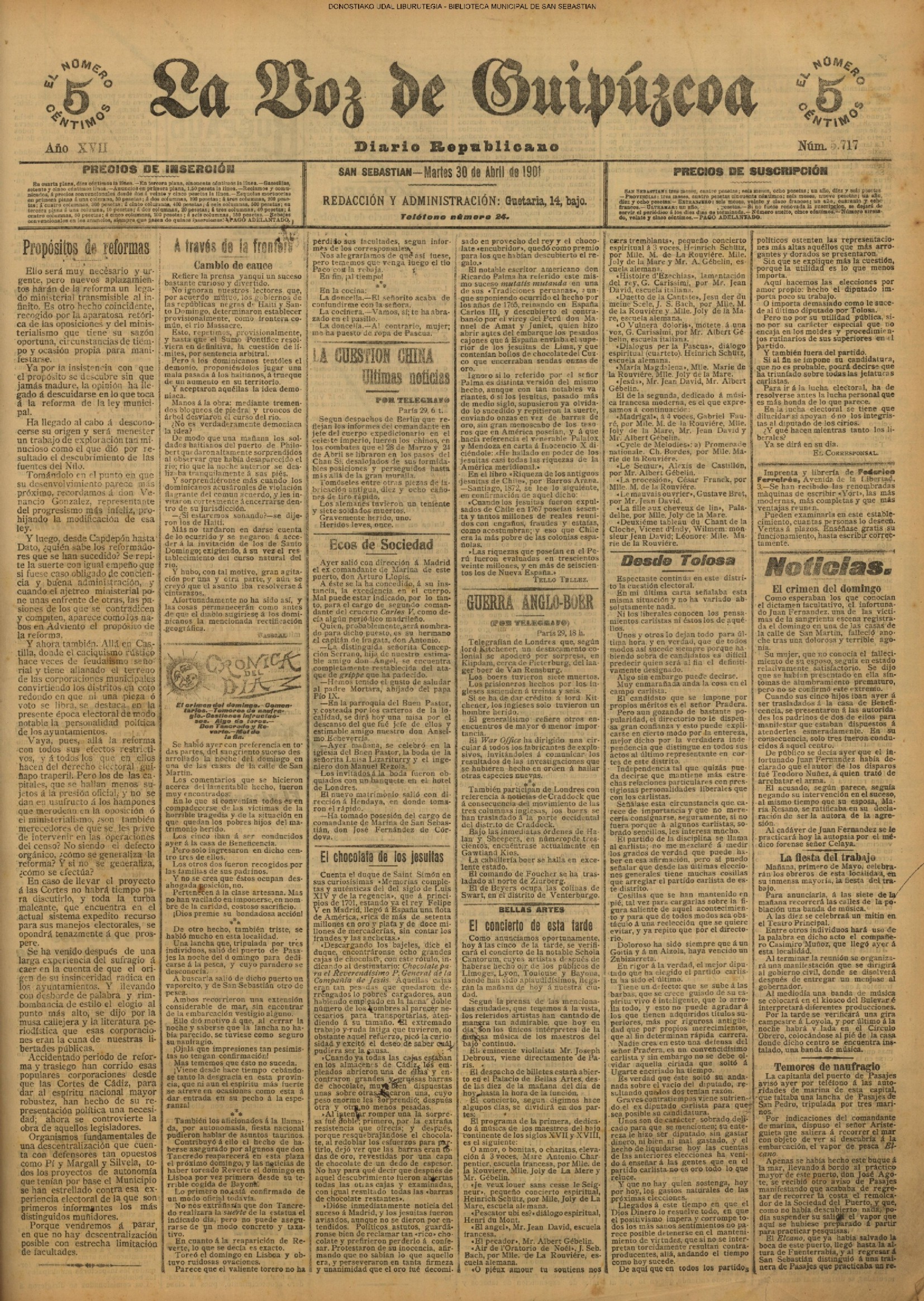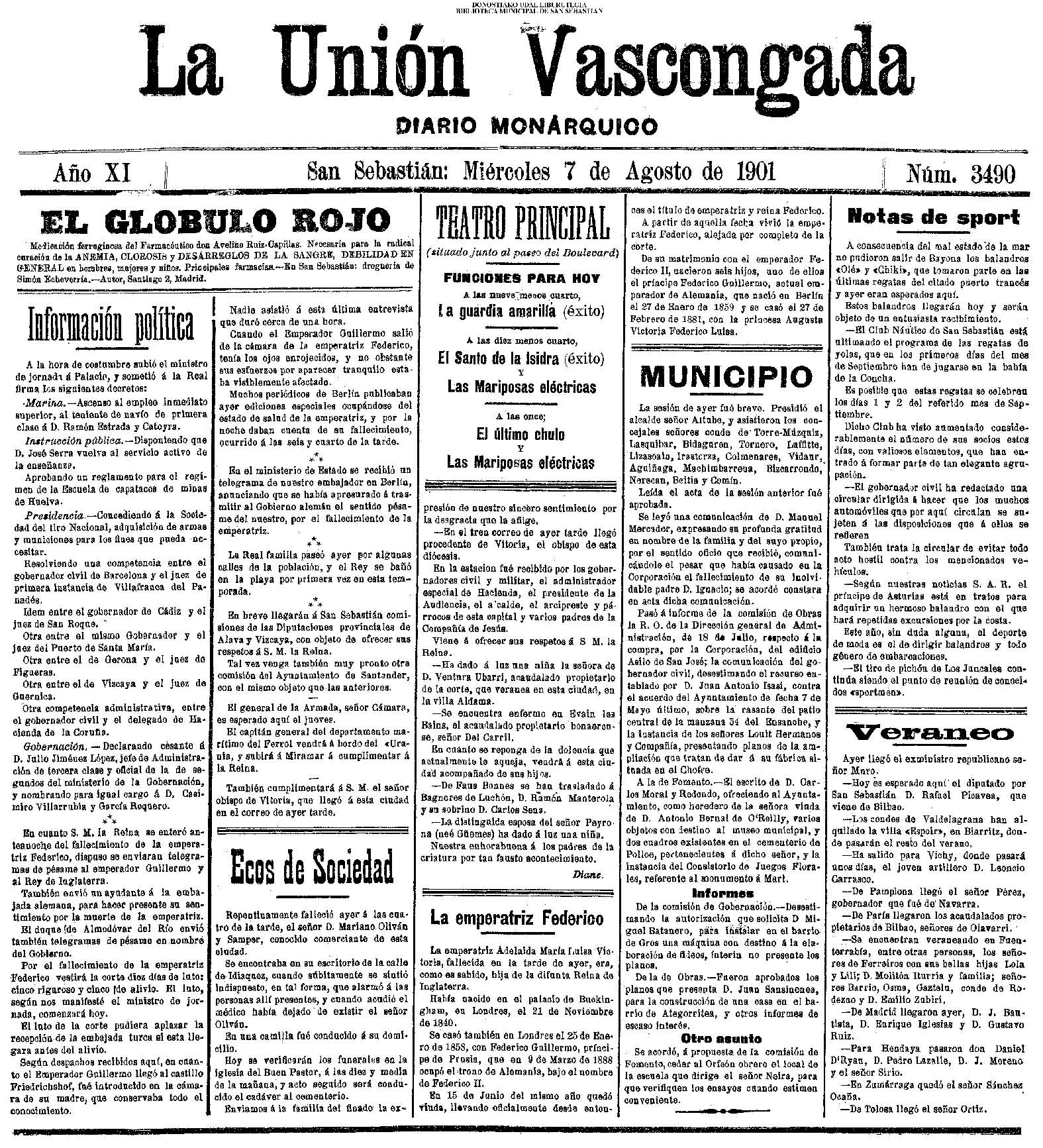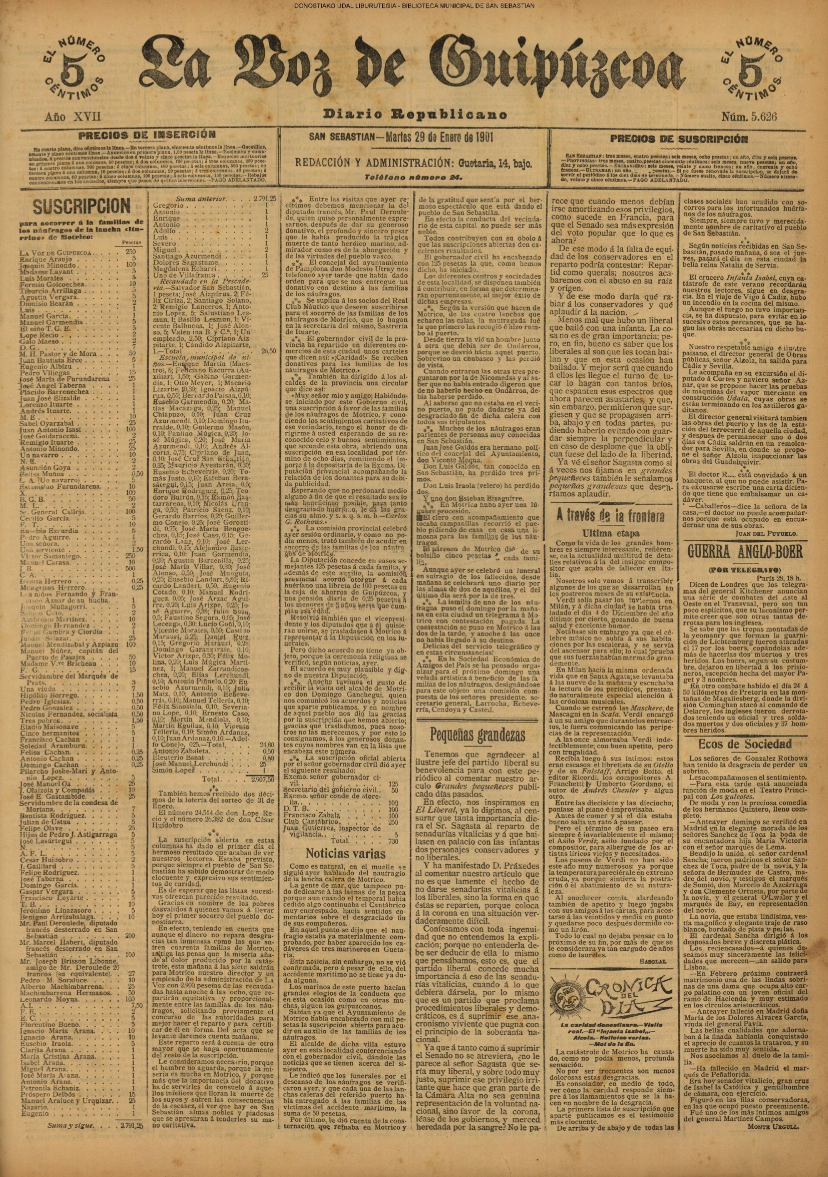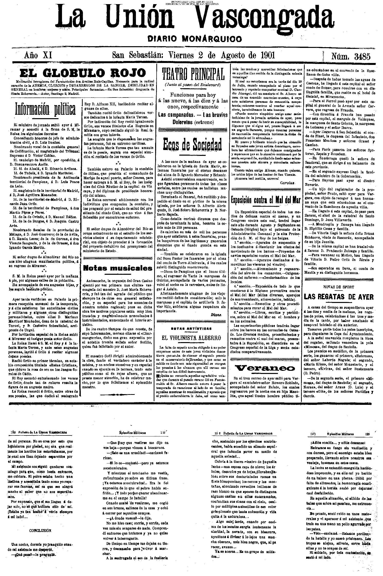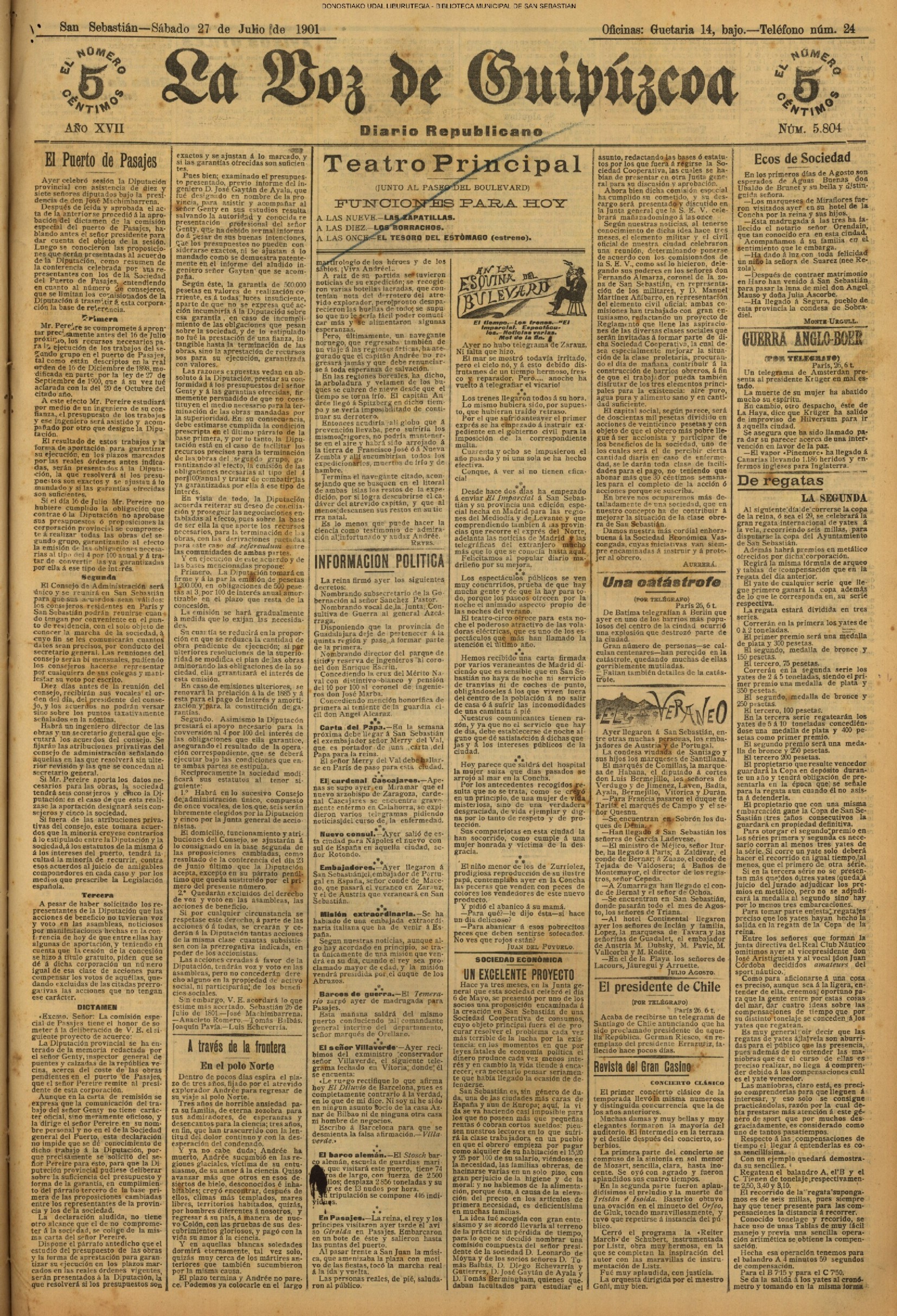 KOXKAS DONOSTIARRAS : "Curiosidades" El primer anuncio de la próxima llegada de las Navidades aparecía en los escaparates. Junto a otrsas golosinas, allí estaba en cajón o en barras el turrón, teniendo a su lado las olorosas aceitunas, las encendidas granadas, las peladillas bien envueltas en su capa de azúcar, los anises confitados, la garrapiñada, todo ese mundo de delicias. Al turrón le siguen el ejército de botellas y capones, de fiembres y pavos, de frutas sabrosísimas, de manjares incontables. Si en los días de Navidad sabe mejor el turrón, ¡qué deseado es siempre!¡Qué dulce es gustar siempre un cachito del azucarado postre!. La llegada del turrón era saludada en los periódicos de hace un siglo, que daban cuenta de que establecimiento había sido el primero en ponerlo en sus escaparates, como aviso urgente de que las Navidades estaban llegando. El cine llegó a nuestra ciudad hace un siglo. Entonces se llamaba Cinebiógrafo y las sesiones que daban eran cortas pero variadísimas. Vea el lector el programa que anunciaba el Cinebiógrafo Lumiére para el domingo 8 de diciembre de 1901. Primera sesión, a las 4 de la tarde : escenas cómicas. Magia moderna. Gabinete encantado. En la ratonera. El diablo en el convento. Regalo: rifa de una carabina Eureka. Segunda sesión, a las 5 de la tarde: Escenas marítimas. Seis retratos una peseta. Los apuros de don Cleto. Pirámides humanas. La luna, a un metro. Regalo: rifa de un servicio de porcelana para su muñeca. Tercera sesión, a las 6 de la tarde: Desfiles militares. Baile en el Olimpia. Entierro de la reina Victoria. Llegada de un tren. La Cenicienta. Regalo: rifa de un tren. Cuarta sesión, a las 7 de la tarde : Escenas infantiles. Danza de fuego. La portera burlada. Episodios del Fausto. Corrida de toros. Regalo: rifa de una preciosa muñeca. El cinebiógrafo de Bellas Artes, aquellos primeros días de diciembre de 1901, proyectaba Noel y anunciaba La caperuza roja, el popular cuento que todos los niños conocían, para los próximos días. Antes había proyectado la Cenicienta y Juana de Arco. Por aquellos días, en un par de escenarios hacían sus galas y su modo de retorcerse siete u ocho chiquillas "de esas que van de bellas". Con la cabeza coquetonamente cubierta por un sombrero, con la vistosa falta de colorines "previamente recogida como si estuviera pasando a pie un río, y el pañolón de Manila rodeado al cuerpo", comienza la suerte del tirabuzón, o sea, la del sacacorchos. Aquellas chicas se retuercen, hacen cosas raras con los pies, con las manos, con todo el cuerpo, volviendo locos a los espectadores. |
