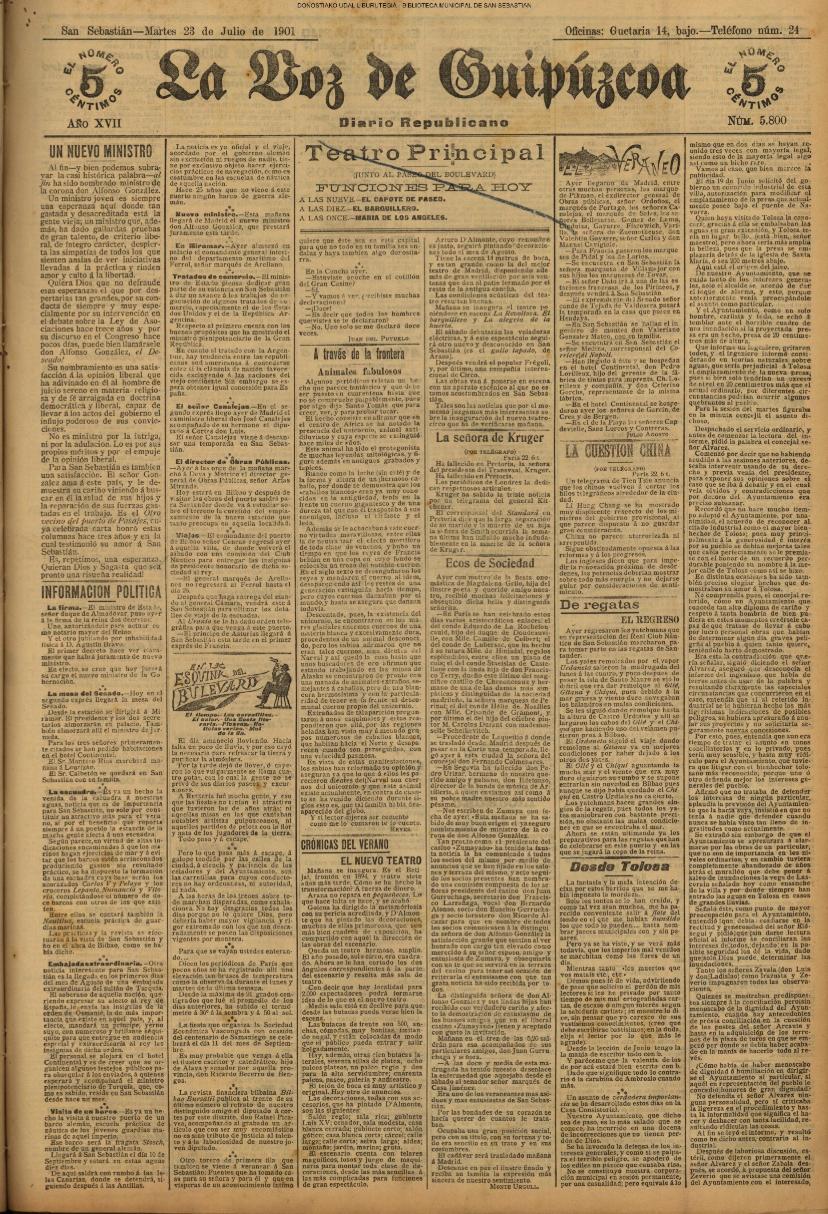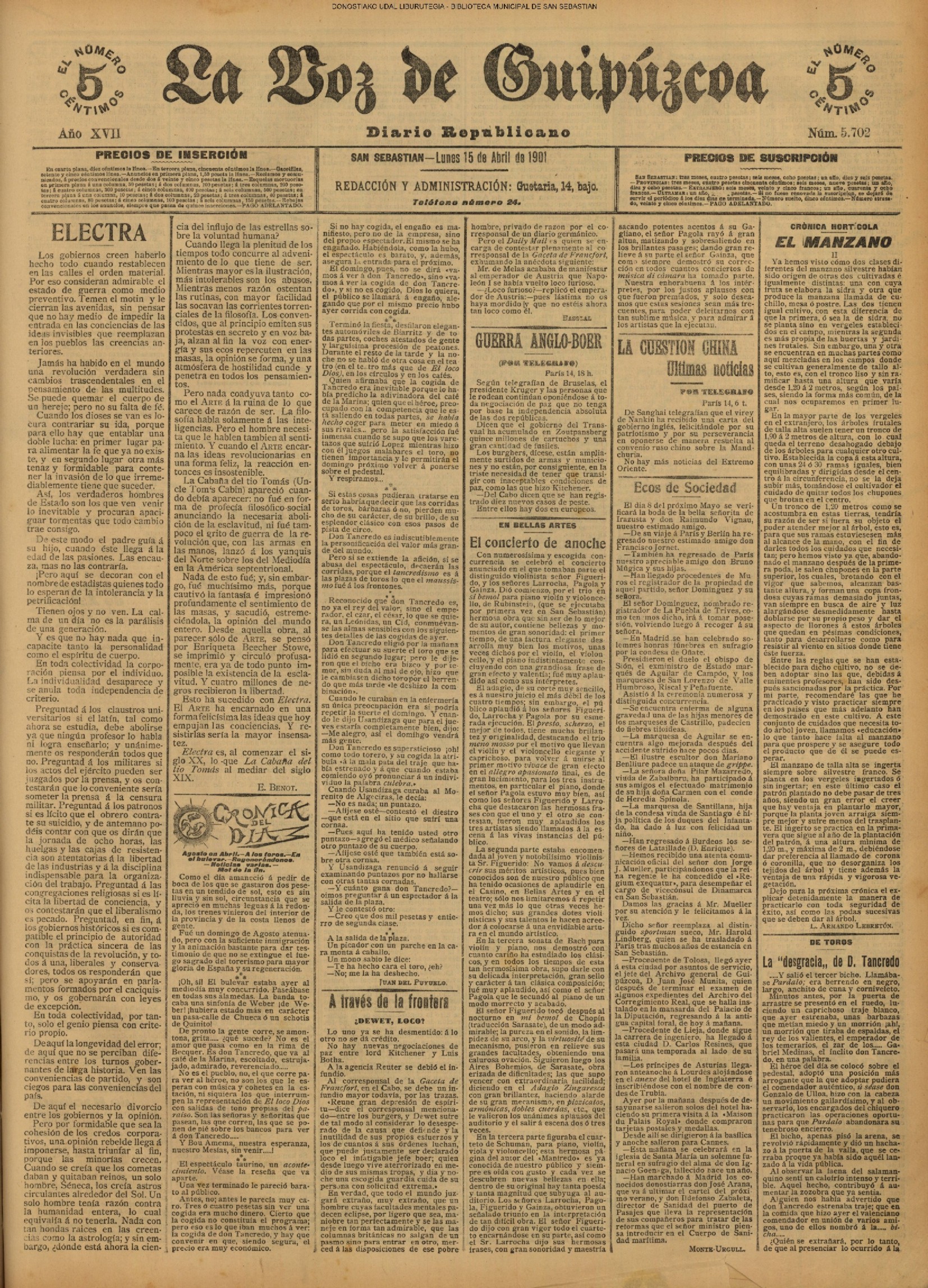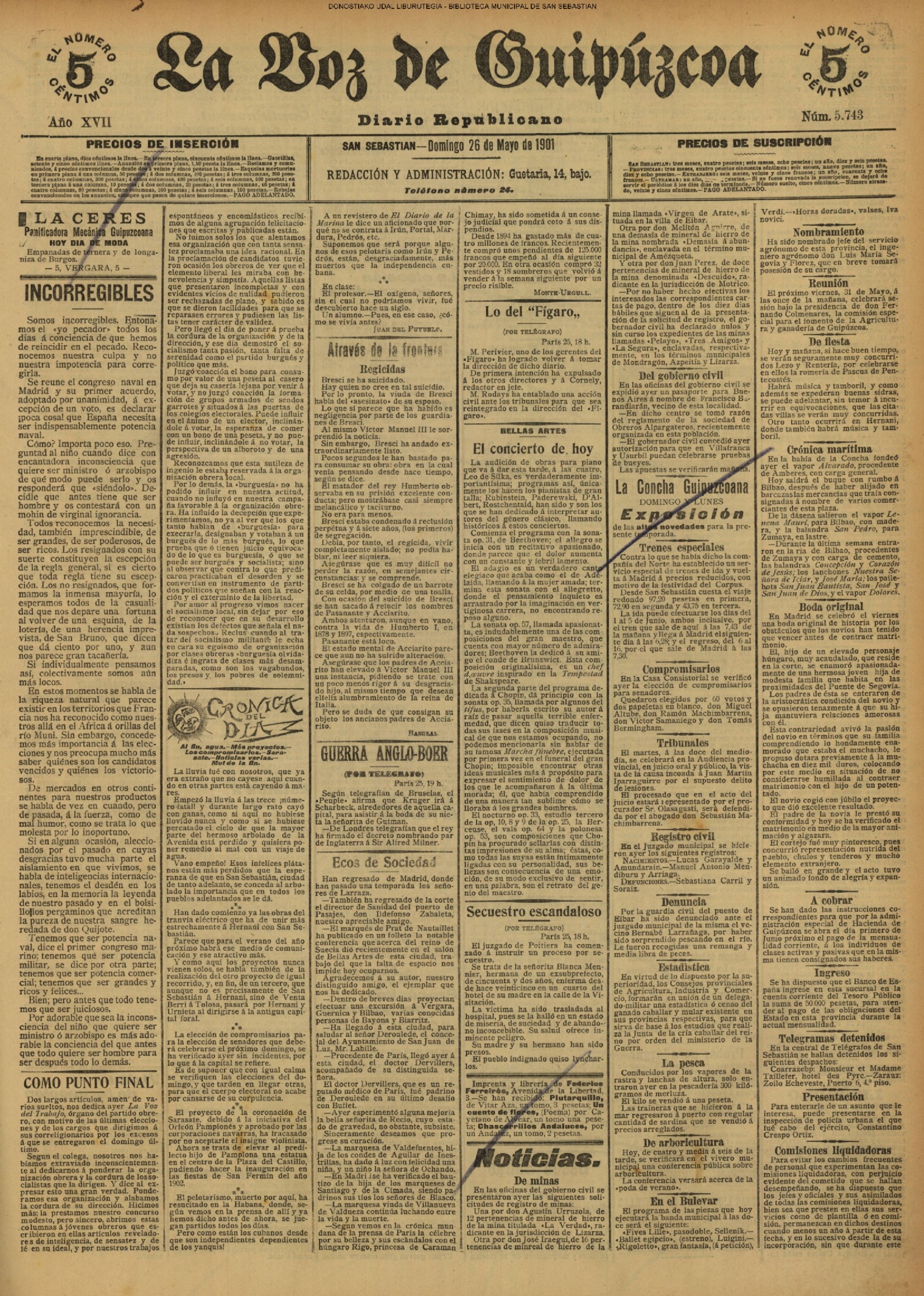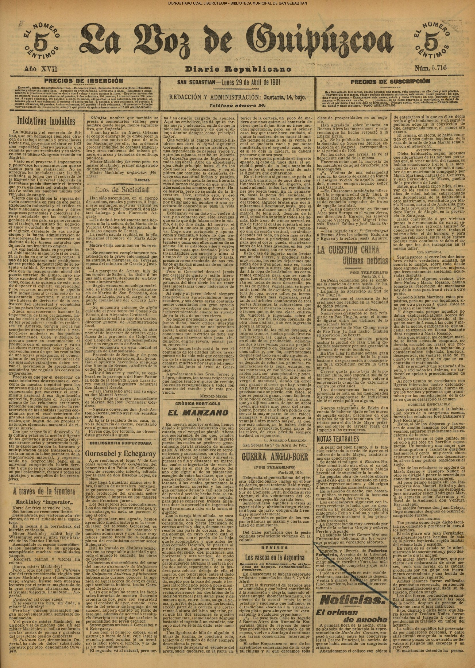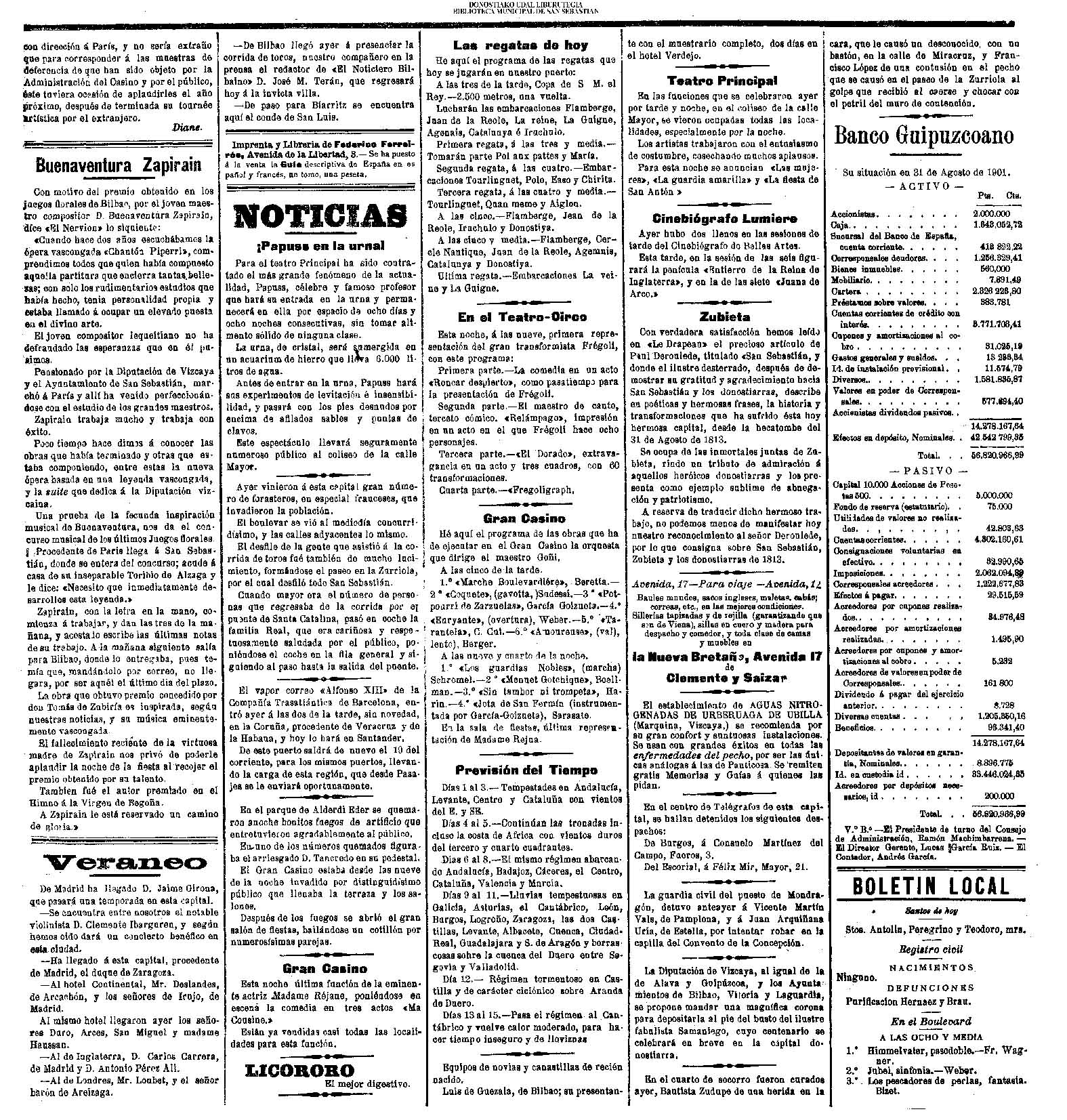 KOXKAS DONOSTIARRAS : "Curiosidades" El primer anuncio de la próxima llegada de las Navidades aparecía en los escaparates. Junto a otrsas golosinas, allí estaba en cajón o en barras el turrón, teniendo a su lado las olorosas aceitunas, las encendidas granadas, las peladillas bien envueltas en su capa de azúcar, los anises confitados, la garrapiñada, todo ese mundo de delicias. Al turrón le siguen el ejército de botellas y capones, de fiembres y pavos, de frutas sabrosísimas, de manjares incontables. Si en los días de Navidad sabe mejor el turrón, ¡qué deseado es siempre!¡Qué dulce es gustar siempre un cachito del azucarado postre!. La llegada del turrón era saludada en los periódicos de hace un siglo, que daban cuenta de que establecimiento había sido el primero en ponerlo en sus escaparates, como aviso urgente de que las Navidades estaban llegando. El cine llegó a nuestra ciudad hace un siglo. Entonces se llamaba Cinebiógrafo y las sesiones que daban eran cortas pero variadísimas. Vea el lector el programa que anunciaba el Cinebiógrafo Lumiére para el domingo 8 de diciembre de 1901. Primera sesión, a las 4 de la tarde : escenas cómicas. Magia moderna. Gabinete encantado. En la ratonera. El diablo en el convento. Regalo: rifa de una carabina Eureka. Segunda sesión, a las 5 de la tarde: Escenas marítimas. Seis retratos una peseta. Los apuros de don Cleto. Pirámides humanas. La luna, a un metro. Regalo: rifa de un servicio de porcelana para su muñeca. Tercera sesión, a las 6 de la tarde: Desfiles militares. Baile en el Olimpia. Entierro de la reina Victoria. Llegada de un tren. La Cenicienta. Regalo: rifa de un tren. Cuarta sesión, a las 7 de la tarde : Escenas infantiles. Danza de fuego. La portera burlada. Episodios del Fausto. Corrida de toros. Regalo: rifa de una preciosa muñeca. El cinebiógrafo de Bellas Artes, aquellos primeros días de diciembre de 1901, proyectaba Noel y anunciaba La caperuza roja, el popular cuento que todos los niños conocían, para los próximos días. Antes había proyectado la Cenicienta y Juana de Arco. Por aquellos días, en un par de escenarios hacían sus galas y su modo de retorcerse siete u ocho chiquillas "de esas que van de bellas". Con la cabeza coquetonamente cubierta por un sombrero, con la vistosa falta de colorines "previamente recogida como si estuviera pasando a pie un río, y el pañolón de Manila rodeado al cuerpo", comienza la suerte del tirabuzón, o sea, la del sacacorchos. Aquellas chicas se retuercen, hacen cosas raras con los pies, con las manos, con todo el cuerpo, volviendo locos a los espectadores. |