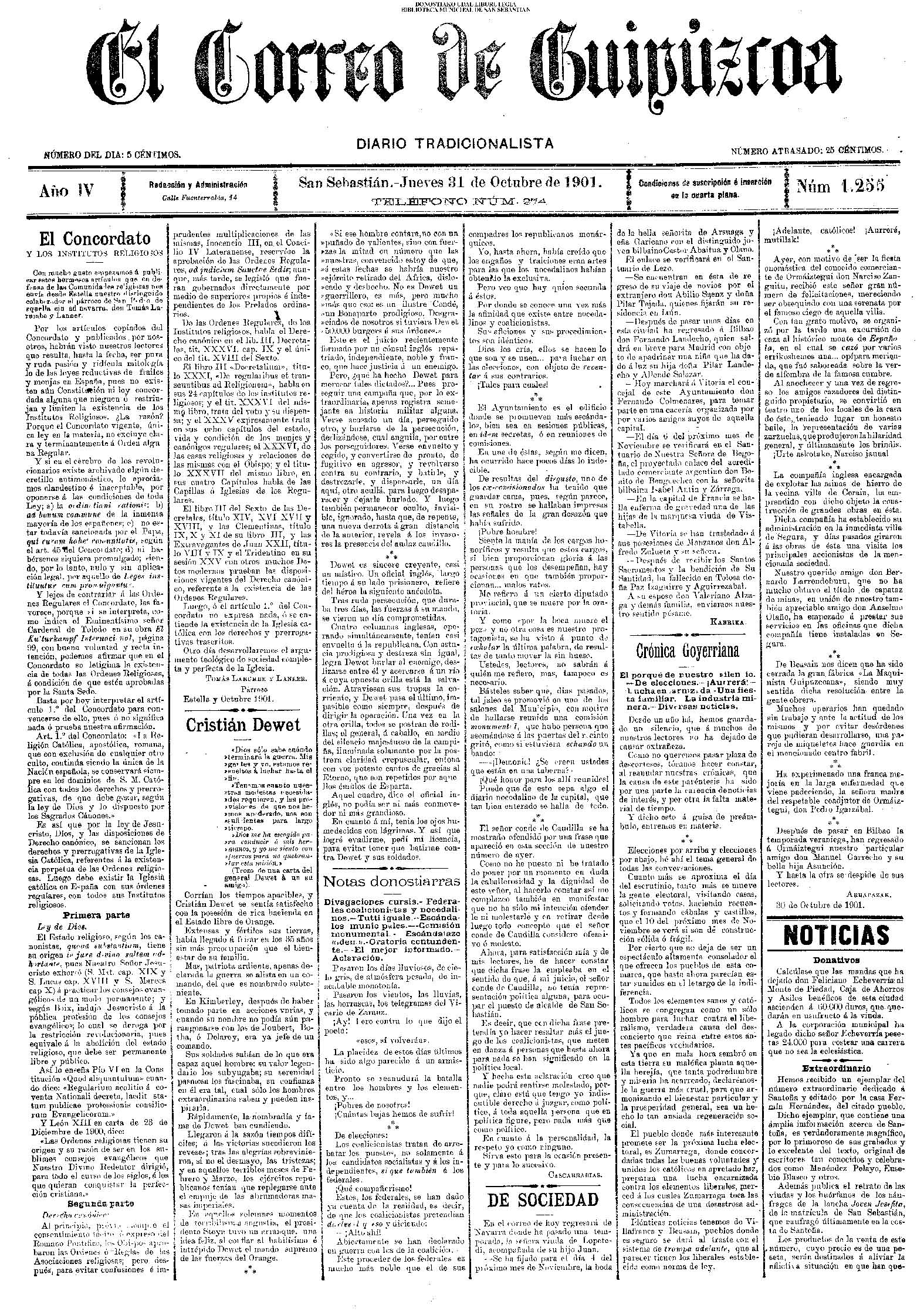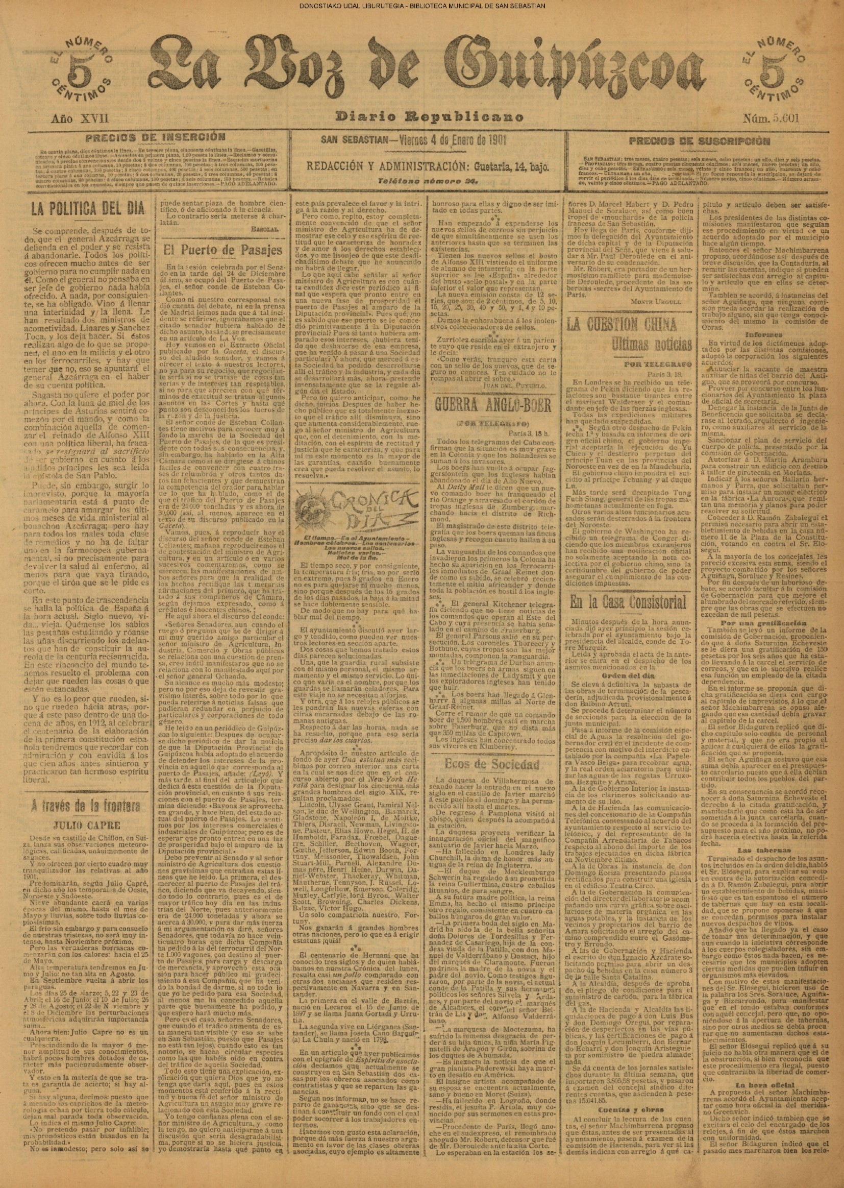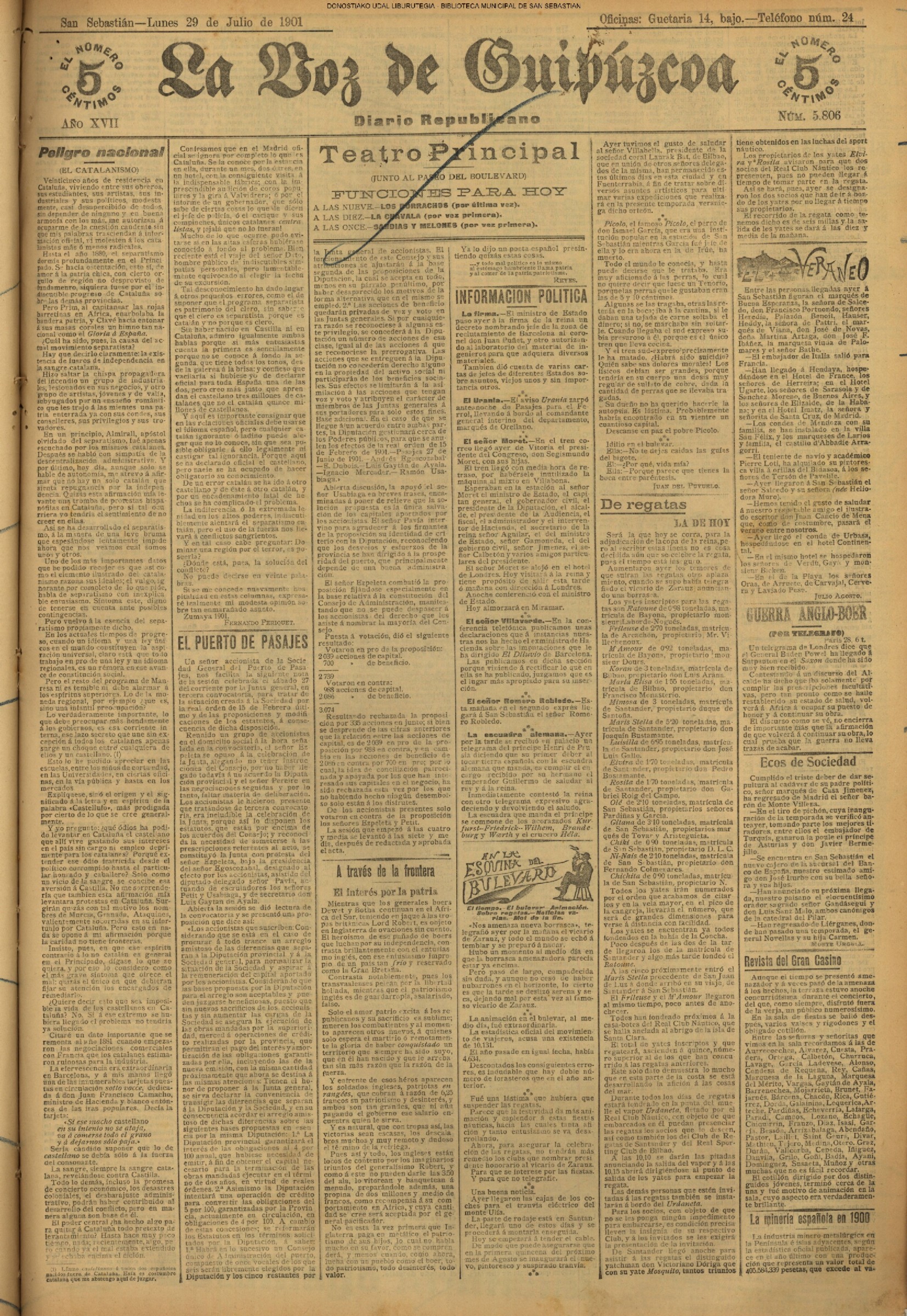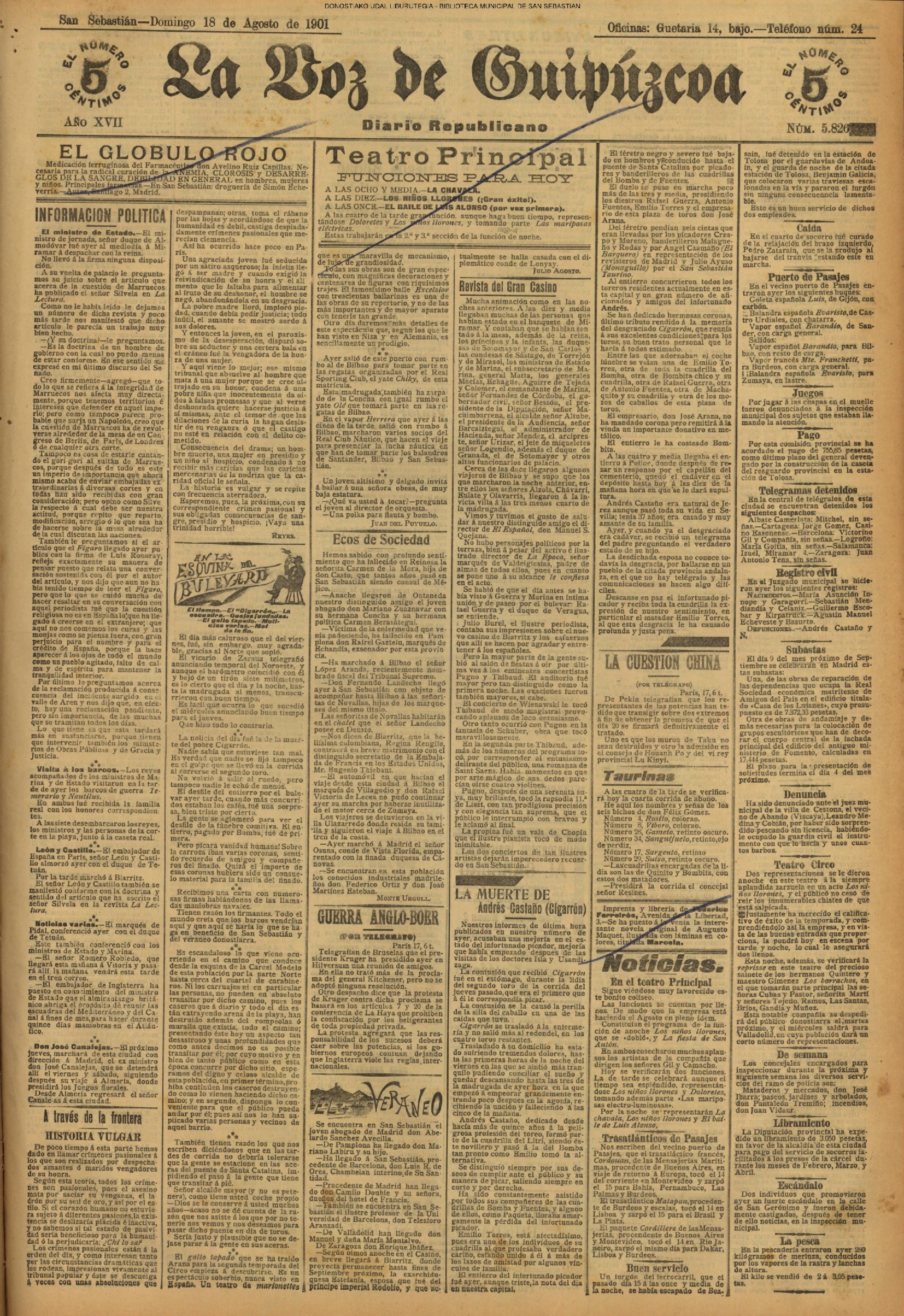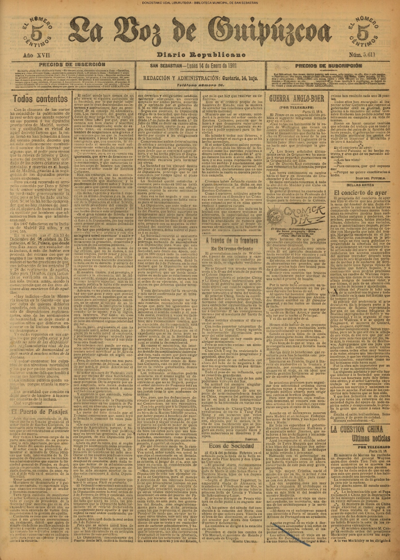 KOXKAS DONOSTIARRAS : "Curiosidades" El primer anuncio de la próxima llegada de las Navidades aparecía en los escaparates. Junto a otrsas golosinas, allí estaba en cajón o en barras el turrón, teniendo a su lado las olorosas aceitunas, las encendidas granadas, las peladillas bien envueltas en su capa de azúcar, los anises confitados, la garrapiñada, todo ese mundo de delicias. Al turrón le siguen el ejército de botellas y capones, de fiembres y pavos, de frutas sabrosísimas, de manjares incontables. Si en los días de Navidad sabe mejor el turrón, ¡qué deseado es siempre!¡Qué dulce es gustar siempre un cachito del azucarado postre!. La llegada del turrón era saludada en los periódicos de hace un siglo, que daban cuenta de que establecimiento había sido el primero en ponerlo en sus escaparates, como aviso urgente de que las Navidades estaban llegando. El cine llegó a nuestra ciudad hace un siglo. Entonces se llamaba Cinebiógrafo y las sesiones que daban eran cortas pero variadísimas. Vea el lector el programa que anunciaba el Cinebiógrafo Lumiére para el domingo 8 de diciembre de 1901. Primera sesión, a las 4 de la tarde : escenas cómicas. Magia moderna. Gabinete encantado. En la ratonera. El diablo en el convento. Regalo: rifa de una carabina Eureka. Segunda sesión, a las 5 de la tarde: Escenas marítimas. Seis retratos una peseta. Los apuros de don Cleto. Pirámides humanas. La luna, a un metro. Regalo: rifa de un servicio de porcelana para su muñeca. Tercera sesión, a las 6 de la tarde: Desfiles militares. Baile en el Olimpia. Entierro de la reina Victoria. Llegada de un tren. La Cenicienta. Regalo: rifa de un tren. Cuarta sesión, a las 7 de la tarde : Escenas infantiles. Danza de fuego. La portera burlada. Episodios del Fausto. Corrida de toros. Regalo: rifa de una preciosa muñeca. El cinebiógrafo de Bellas Artes, aquellos primeros días de diciembre de 1901, proyectaba Noel y anunciaba La caperuza roja, el popular cuento que todos los niños conocían, para los próximos días. Antes había proyectado la Cenicienta y Juana de Arco. Por aquellos días, en un par de escenarios hacían sus galas y su modo de retorcerse siete u ocho chiquillas "de esas que van de bellas". Con la cabeza coquetonamente cubierta por un sombrero, con la vistosa falta de colorines "previamente recogida como si estuviera pasando a pie un río, y el pañolón de Manila rodeado al cuerpo", comienza la suerte del tirabuzón, o sea, la del sacacorchos. Aquellas chicas se retuercen, hacen cosas raras con los pies, con las manos, con todo el cuerpo, volviendo locos a los espectadores. |