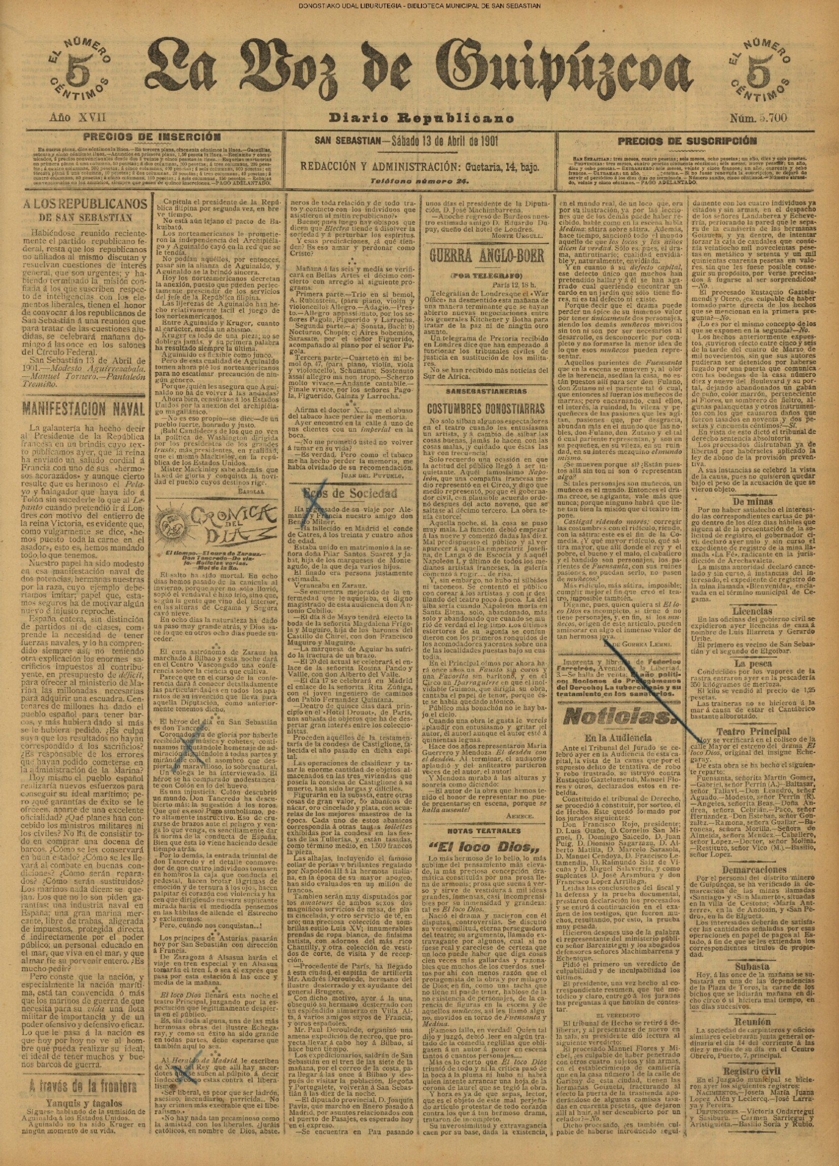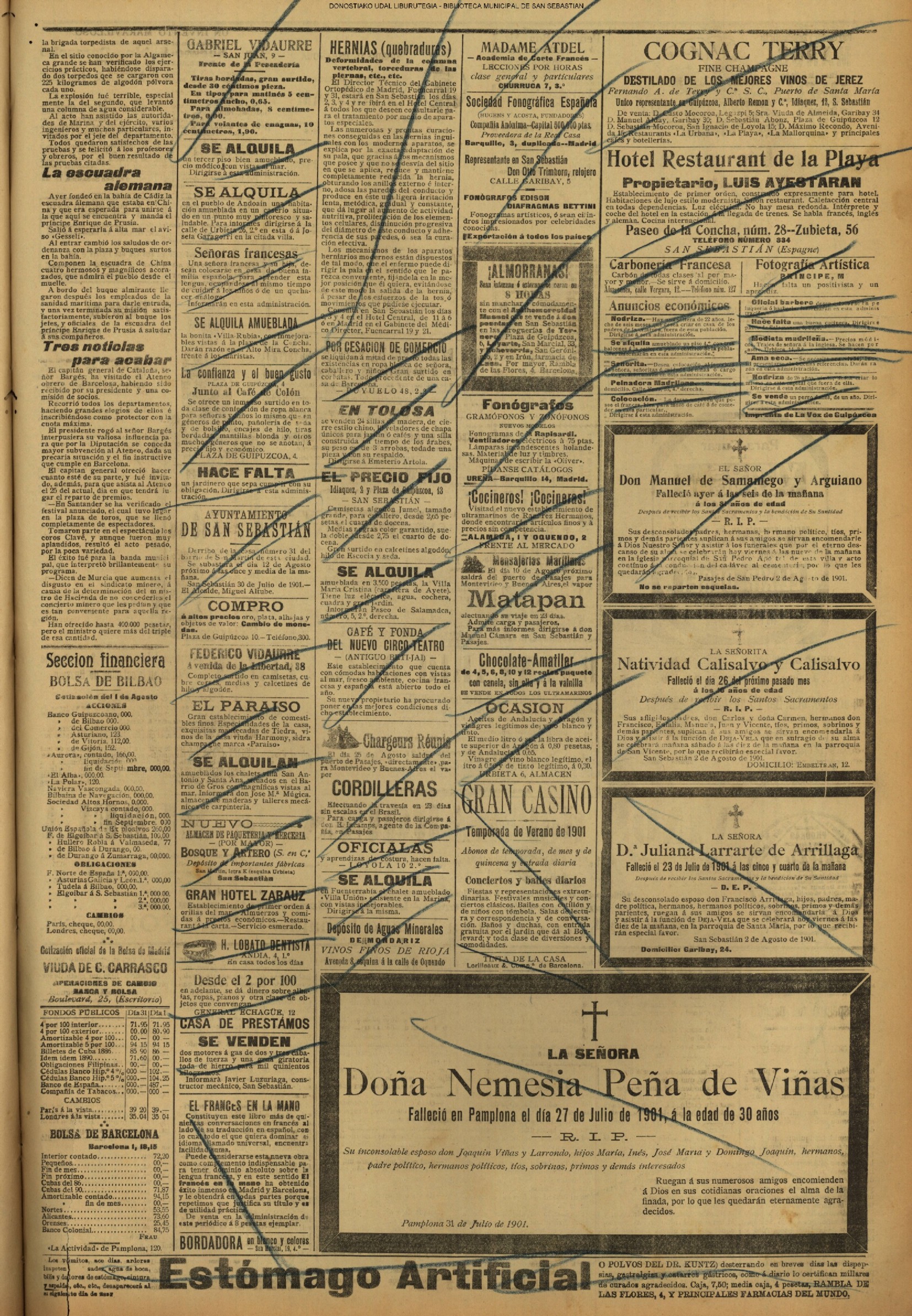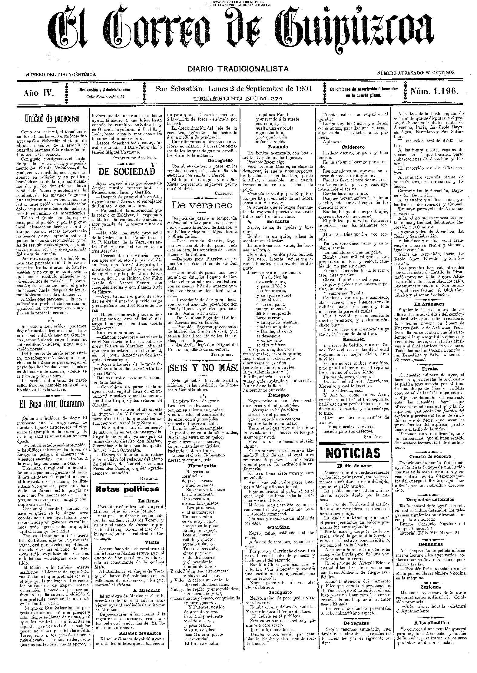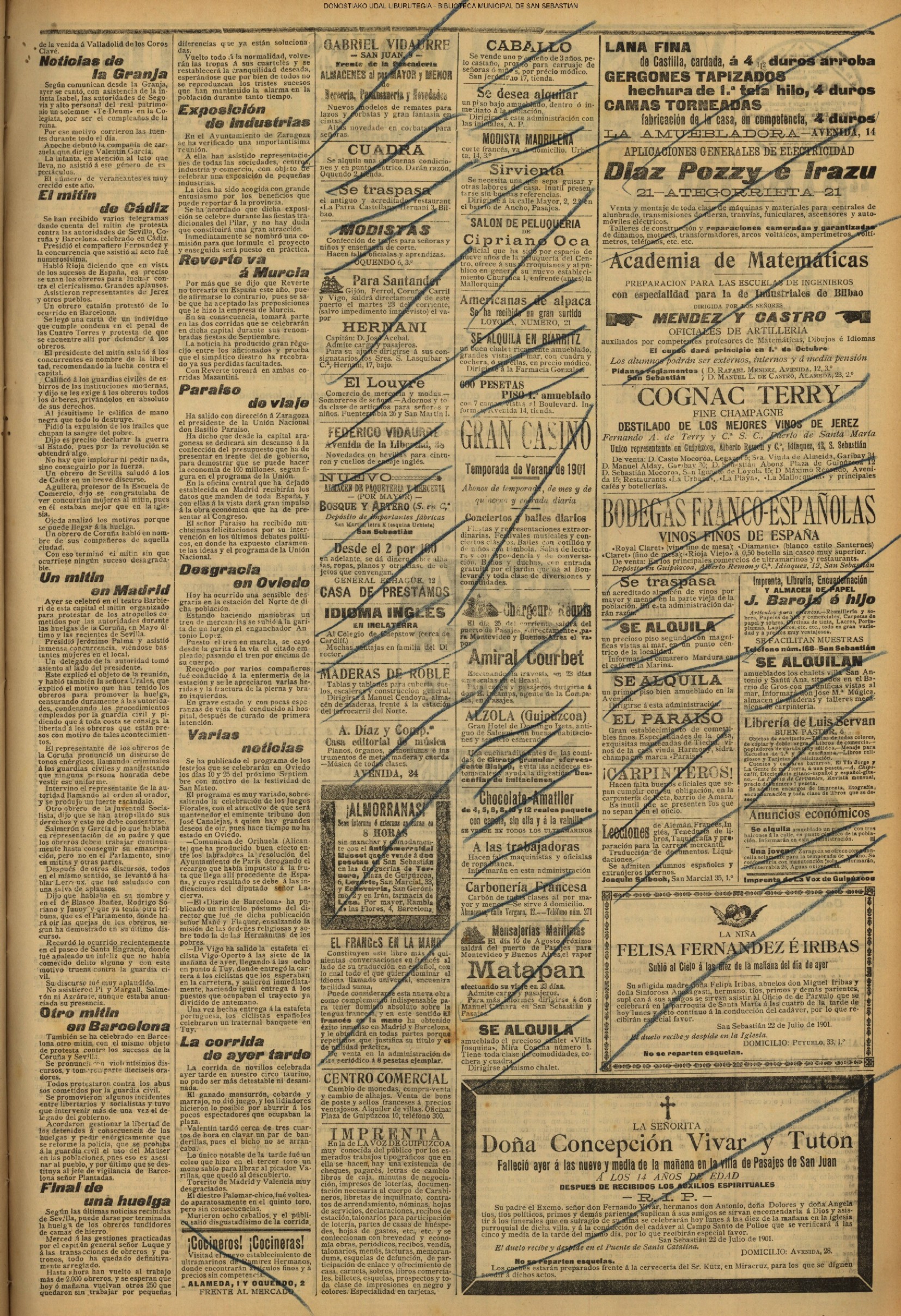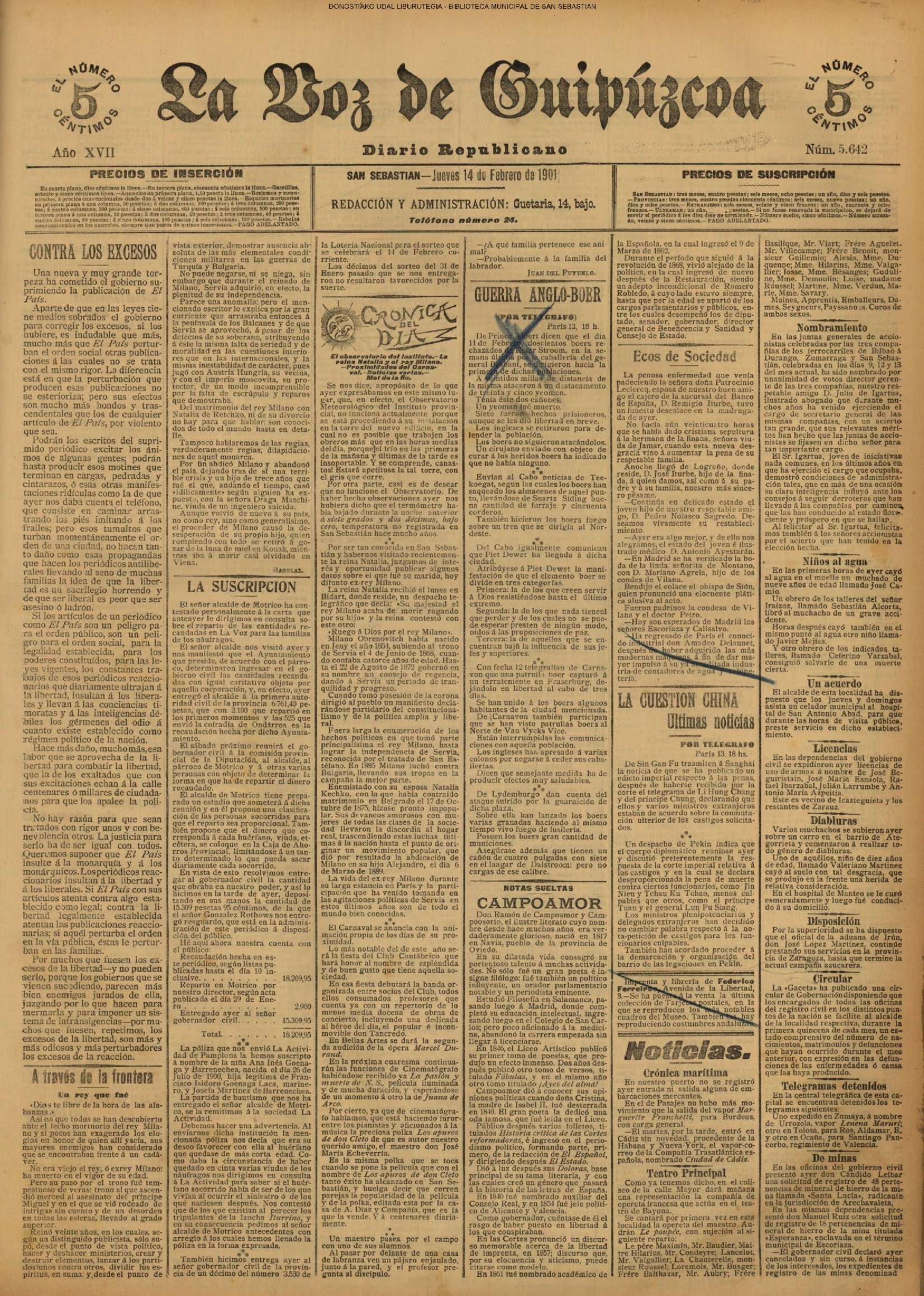 KOXKAS DONOSTIARRAS : "Curiosidades" El primer anuncio de la próxima llegada de las Navidades aparecía en los escaparates. Junto a otrsas golosinas, allí estaba en cajón o en barras el turrón, teniendo a su lado las olorosas aceitunas, las encendidas granadas, las peladillas bien envueltas en su capa de azúcar, los anises confitados, la garrapiñada, todo ese mundo de delicias. Al turrón le siguen el ejército de botellas y capones, de fiembres y pavos, de frutas sabrosísimas, de manjares incontables. Si en los días de Navidad sabe mejor el turrón, ¡qué deseado es siempre!¡Qué dulce es gustar siempre un cachito del azucarado postre!. La llegada del turrón era saludada en los periódicos de hace un siglo, que daban cuenta de que establecimiento había sido el primero en ponerlo en sus escaparates, como aviso urgente de que las Navidades estaban llegando. El cine llegó a nuestra ciudad hace un siglo. Entonces se llamaba Cinebiógrafo y las sesiones que daban eran cortas pero variadísimas. Vea el lector el programa que anunciaba el Cinebiógrafo Lumiére para el domingo 8 de diciembre de 1901. Primera sesión, a las 4 de la tarde : escenas cómicas. Magia moderna. Gabinete encantado. En la ratonera. El diablo en el convento. Regalo: rifa de una carabina Eureka. Segunda sesión, a las 5 de la tarde: Escenas marítimas. Seis retratos una peseta. Los apuros de don Cleto. Pirámides humanas. La luna, a un metro. Regalo: rifa de un servicio de porcelana para su muñeca. Tercera sesión, a las 6 de la tarde: Desfiles militares. Baile en el Olimpia. Entierro de la reina Victoria. Llegada de un tren. La Cenicienta. Regalo: rifa de un tren. Cuarta sesión, a las 7 de la tarde : Escenas infantiles. Danza de fuego. La portera burlada. Episodios del Fausto. Corrida de toros. Regalo: rifa de una preciosa muñeca. El cinebiógrafo de Bellas Artes, aquellos primeros días de diciembre de 1901, proyectaba Noel y anunciaba La caperuza roja, el popular cuento que todos los niños conocían, para los próximos días. Antes había proyectado la Cenicienta y Juana de Arco. Por aquellos días, en un par de escenarios hacían sus galas y su modo de retorcerse siete u ocho chiquillas "de esas que van de bellas". Con la cabeza coquetonamente cubierta por un sombrero, con la vistosa falta de colorines "previamente recogida como si estuviera pasando a pie un río, y el pañolón de Manila rodeado al cuerpo", comienza la suerte del tirabuzón, o sea, la del sacacorchos. Aquellas chicas se retuercen, hacen cosas raras con los pies, con las manos, con todo el cuerpo, volviendo locos a los espectadores. |